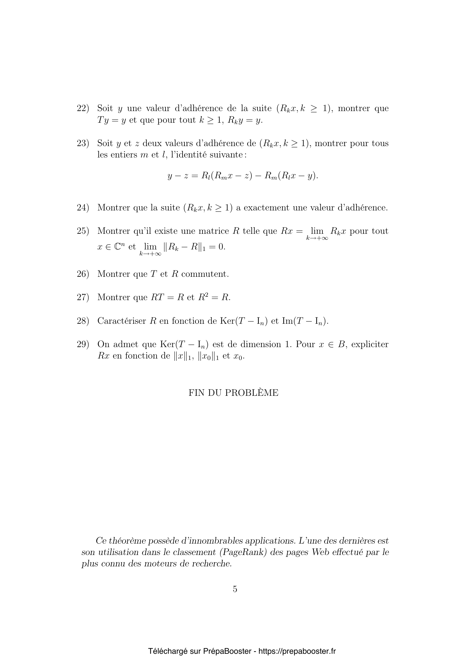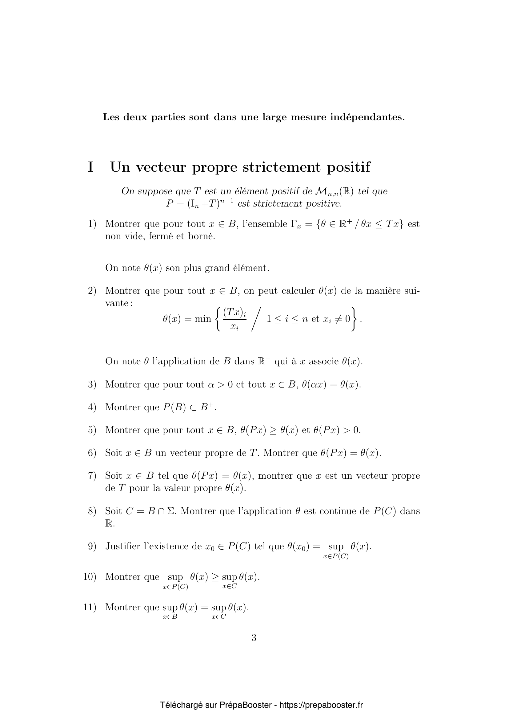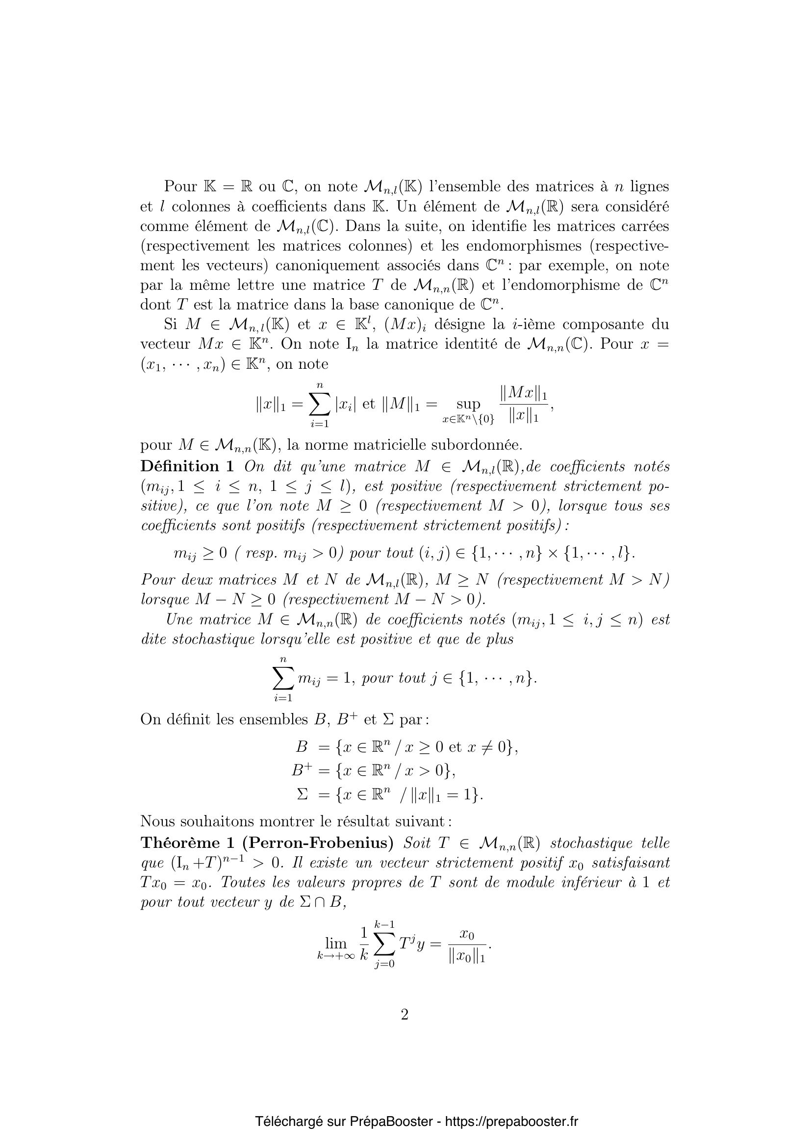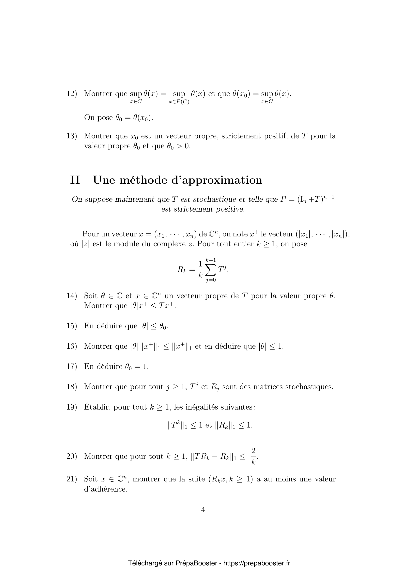 1. Montrer que pour tout $x \in B$, l’ensemble $\Gamma_x = \{\theta \in \mathbb{R}_+ \mid \theta x \leq T x\}$ est non vide, fermé et borné.\\ On note $\theta(x)$ son plus grand élément. 2. Montrer que pour tout $x \in B$, on peut calculer $\theta(x)$ de la manière suivante~:\\ $\theta(x) = \min \left\lbrace \frac{(T x)_i}{x_i} \mid 1 \leq i \leq n \text{ et } x_i \neq 0 \right\rbrace$.\\ On note $\theta$ l’application de $B$ dans $\mathbb{R}_+$ qui à $x$ associe $\theta(x)$. 3. Montrer que pour tout $\alpha > 0$ et tout $x \in B$, $\theta(\alpha x) = \theta(x)$. 4. Montrer que $P(B) \subset B_+$. 5. Montrer que pour tout $x \in B$, $\theta(P x) \geq \theta(x)$ et $\theta(P x) > 0$.} 6. Soit $x \in B$ un vecteur propre de $T$. Montrer que $\theta(P x) = \theta(x)$. 7. Soit $x \in B$ tel que $\theta(P x) = \theta(x)$, montrer que $x$ est un vecteur propre de $T$ pour la valeur propre $\theta(x)$. 8. Soit $C = B \cap \Sigma$. Montrer que l’application $\theta$ est continue de $P(C)$ dans $\mathbb{R}$. 9. Justifier l’existence de $x_0 \in P(C)$ tel que $\theta(x_0) = \sup_{x \in P(C)} \theta(x)$. 10. Montrer que $\sup_{x \in P(C)} \theta(x) \geq \sup_{x \in C} \theta(x)$.} 11. Montrer que $\sup_{x \in B} \theta(x) = \sup_{x \in C} \theta(x)$. 12. Montrer que $\sup_{x \in C} \theta(x) = \sup_{x \in P(C)} \theta(x)$ et que $\theta(x_0) = \sup_{x \in C} \theta(x)$.\\ On pose $\theta_0 = \theta(x_0)$. 13. Montrer que $x_0$ est un vecteur propre, strictement positif, de $T$ pour la valeur propre $\theta_0$ et que $\theta_0 > 0$. 14. Soit $\theta \in \mathbb{C}$ et $x \in \mathbb{C}^n$ un vecteur propre de $T$ pour la valeur propre $\theta$.\\ Montrer que $|\theta| x_+ \leq T x_+$. 15. En déduire que $|\theta| \leq \theta_0$.} 16. Montrer que $|\theta| \|x_+\|_1 \leq \|x_+\|_1$ et en déduire que $|\theta| \leq 1$. 17. En déduire $\theta_0 = 1$. 18. Montrer que pour tout $j \geq 1$, $T^j$ et $R_j$ sont des matrices stochastiques. 19. Établir, pour tout $k \geq 1$, les inégalités suivantes~:\\ $\|T^k\|_1 \leq 1$ et $\|R_k\|_1 \leq 1$. 20. Montrer que pour tout $k \geq 1$, $\|T R_k – R_k\|_1 \leq \frac{2}{k}$.} 21. Soit $x \in \mathbb{C}^n$, montrer que la suite $(R_k x, k \geq 1)$ a au moins une valeur d’adhérence. 22. Soit $y$ une valeur d’adhérence de la suite $(R_k x, k \geq 1)$, montrer que $T y = y$ et que pour tout $k \geq 1$, $R_k y = y$. 23. Soit $y$ et $z$ deux valeurs d’adhérence de $(R_k x, k \geq 1)$, montrer pour tous les entiers $m$ et $l$, l’identité suivante~:\\ $y – z = R_l(R_m x – z) – R_m(R_l x – y)$. 24. Montrer que la suite $(R_k x, k \geq 1)$ a exactement une valeur d’adhérence. 25. Montrer qu’il existe une matrice $R$ telle que $R x = \lim_{k \to +\infty} R_k x$ pour tout $x \in \mathbb{C}^n$ et $\lim_{k \to +\infty} \|R_k – R\|_1 = 0$.} 26. Montrer que $T$ et $R$ commutent. 27. Montrer que $R T = R$ et $R^2 = R$. 28. Caractériser $R$ en fonction de $\mathrm{Ker}(T – I_n)$ et $\mathrm{Im}(T – I_n)$. 29. On admet que $\mathrm{Ker}(T – I_n)$ est de dimension $1$. Pour $x \in B$, expliciter $R x$ en fonction de $\|x\|_1$, $\|x_0\|_1$ et $x_0$.}FAQ
