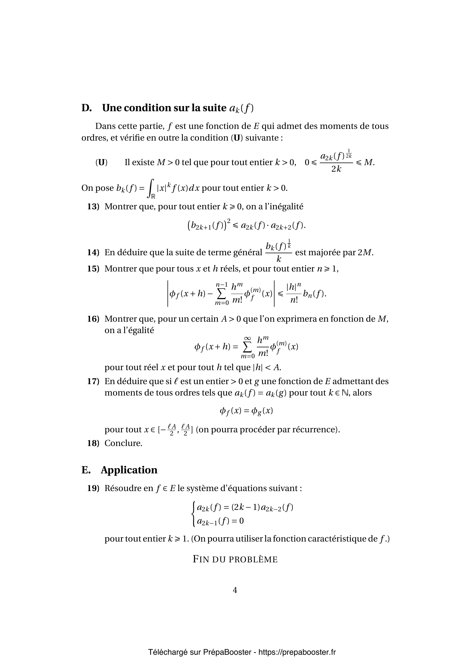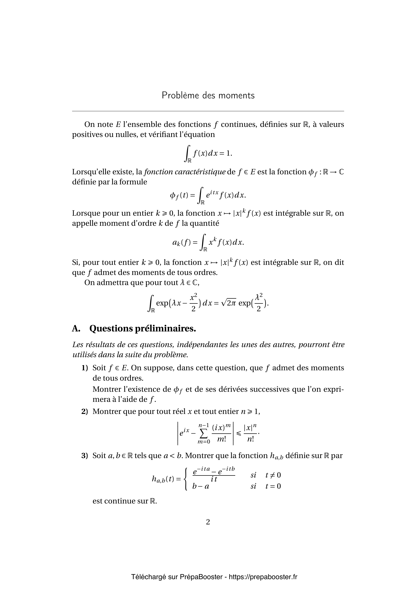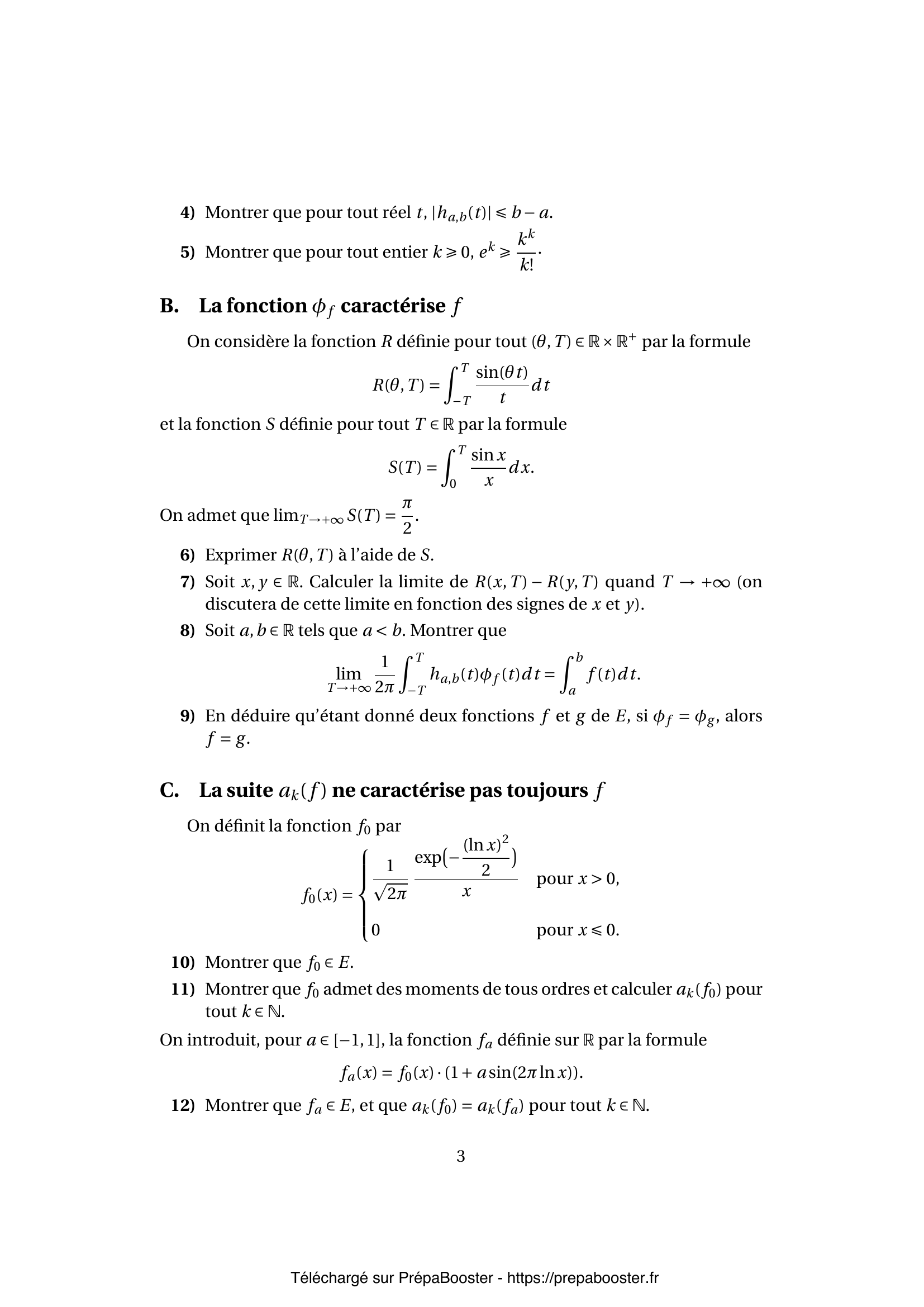 1. Soit $f \in E$. On suppose, dans cette question, que $f$ admet des moments de tous ordres. Montrer l’existence de $\varphi_f$ et de ses dérivées successives que l’on exprimera à l’aide de $f$. 2. Montrer que pour tout réel $x$ et tout entier $n \geq 1$, \[ \left|e^{ix} – \sum_{m=0}^{n-1} \frac{(ix)^m}{m!}\right| \leq \frac{|x|^n}{n!}. \] 3. Soit $a,b \in \mathbb{R}$ tels que $a < b$. Montrer que la fonction $h_{a,b}$ définie sur $\mathbb{R}$ par \[ h_{a,b}(t) = \begin{cases} \dfrac{e^{-i t a} - e^{-i t b}}{i t} & \text{si } t \neq 0 \\ b-a & \text{si } t = 0 \\ \end{cases} \] est continue sur $\mathbb{R}$. 4. Montrer que pour tout réel $t$, $|h_{a,b}(t)| \leq b-a$. 5. Montrer que pour tout entier $k \geq 0$, $e^k \geq \dfrac{k^k}{k!}$.} 6. Exprimer $R(\theta,T)$ à l’aide de $S$. 7. Soit $x, y \in \mathbb{R}$. Calculer la limite de $R(x,T) - R(y,T)$ quand $T \to +\infty$ (on discutera de cette limite en fonction des signes de $x$ et $y$). 8. Soit $a,b \in \mathbb{R}$ tels que $a < b$. Montrer que \[ \lim_{T \to +\infty} \frac{1}{2\pi}\int_{-T}^T h_{a,b}(t)\varphi_f (t)dt = \int_a^b f(t)dt. \] 9. En déduire qu’étant donné deux fonctions $f$ et $g$ de $E$, si $\varphi_f = \varphi_g$, alors $f = g$. 10. Montrer que $f_0 \in E$.} 11. Montrer que $f_0$ admet des moments de tous ordres et calculer $a_k(f_0)$ pour tout $k \in \mathbb{N}$. 12. On introduit, pour $a \in [-1, 1]$, la fonction $f_a$ définie sur $\mathbb{R}$ par la formule \[ f_a(x) = f_0(x) \cdot (1+ a \sin(2\pi\ln x)). \] Montrer que $f_a \in E$, et que $a_k(f_0) = a_k(f_a)$ pour tout $k \in \mathbb{N}$. 13. Montrer que, pour tout entier $k \geq 0$, on a l’inégalité \[ \left(b_{2k+1}(f)\right)^2 \leq a_{2k}(f) \cdot a_{2k+2}(f). \] 14. En déduire que la suite de terme général $b_k(f)^{1/k}$ est majorée par $2M$. 15. Montrer que pour tous $x$ et $h$ réels, et pour tout entier $n \geq 1$, \[ \left|\varphi_f(x + h)-\sum_{m=0}^{n-1} \frac{h^m}{m!} \varphi_f^{(m)}(x)\right| \leq \frac{|h|^n}{n!} b_n(f). \]} 16. Montrer que, pour un certain $A > 0$ que l’on exprimera en fonction de $M$, on a l’égalité \[ \varphi_f(x + h) = \sum_{m=0}^{\infty} \frac{h^m}{m!} \varphi_f^{(m)}(x) \] pour tout réel $x$ et pour tout $h$ tel que $|h| < A$. 17. En déduire que si $\ell$ est un entier $> 0$ et $g$ une fonction de $E$ admettant des moments de tous ordres tels que $a_k(f) = a_k(g)$ pour tout $k \in \mathbb{N}$, alors \[ \varphi_f(x) = \varphi_g(x) \] pour tout $x \in \left[ -\dfrac{\ell A}{2}, \dfrac{\ell A}{2} \right]$ (on pourra procéder par récurrence). 18. Conclure. 19. Résoudre en $f \in E$ le système d’équations suivant : \[ \begin{cases} a_{2k}(f) = (2k-1)a_{2k-2}(f) \\ a_{2k-1}(f) = 0 \end{cases} \quad \text{pour tout entier } k \geq 1. \]}FAQ