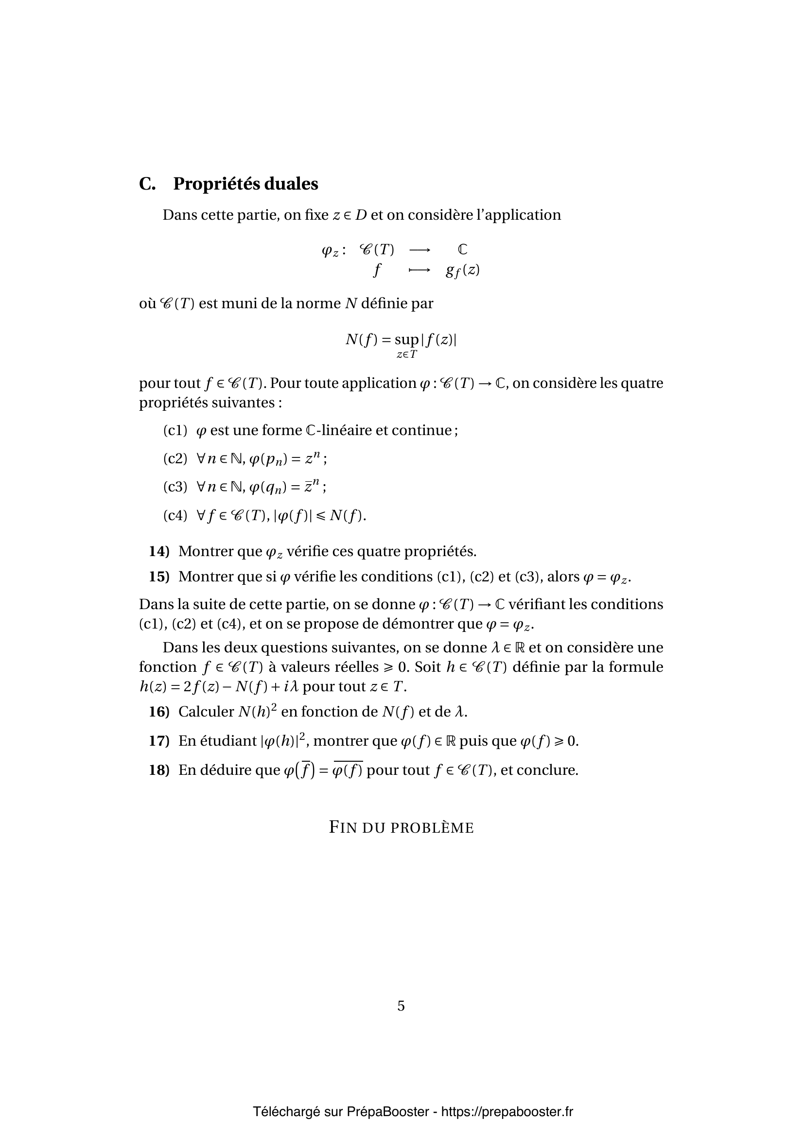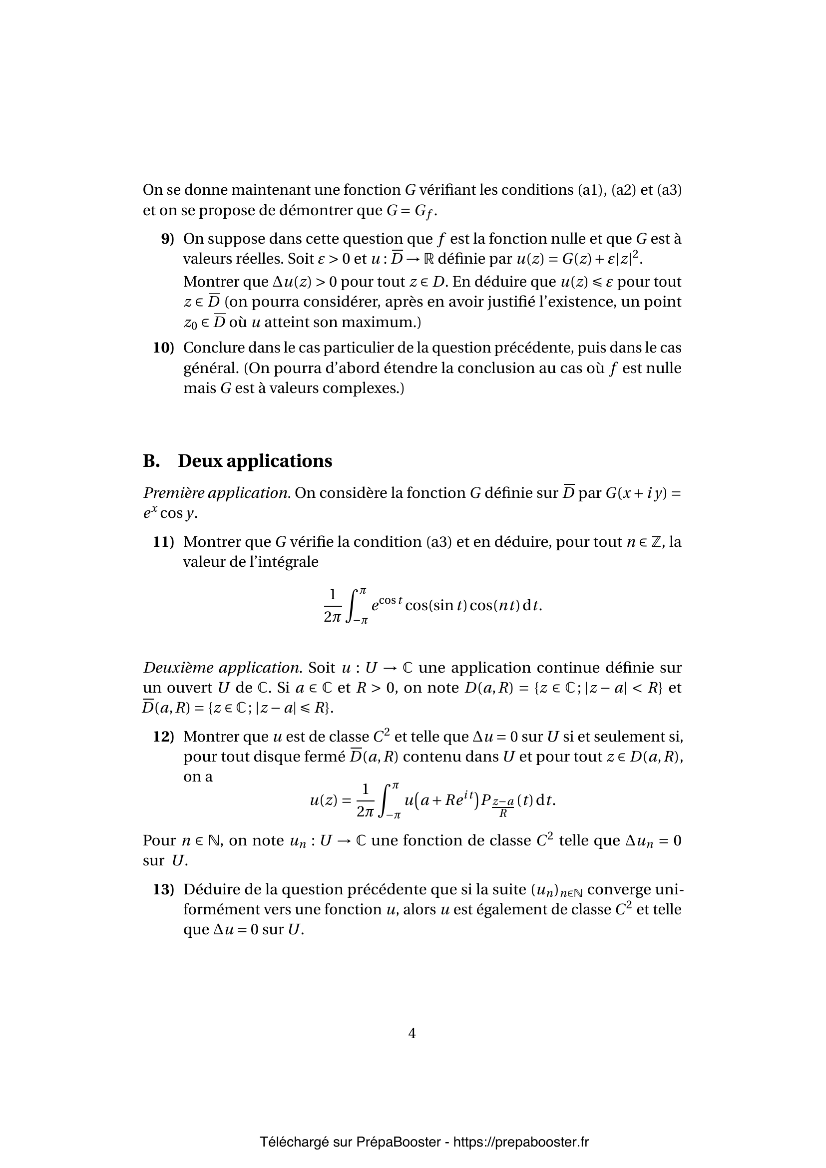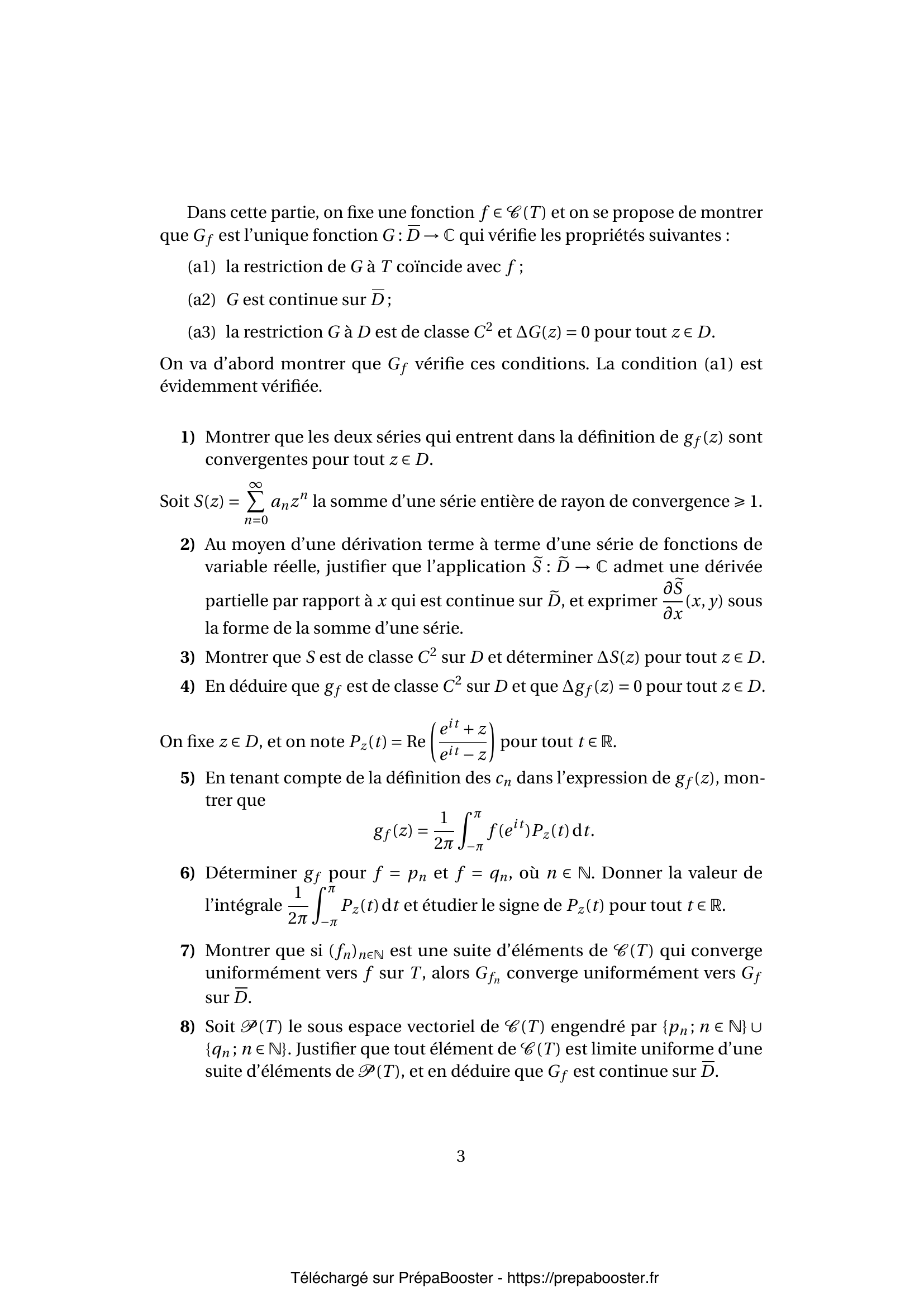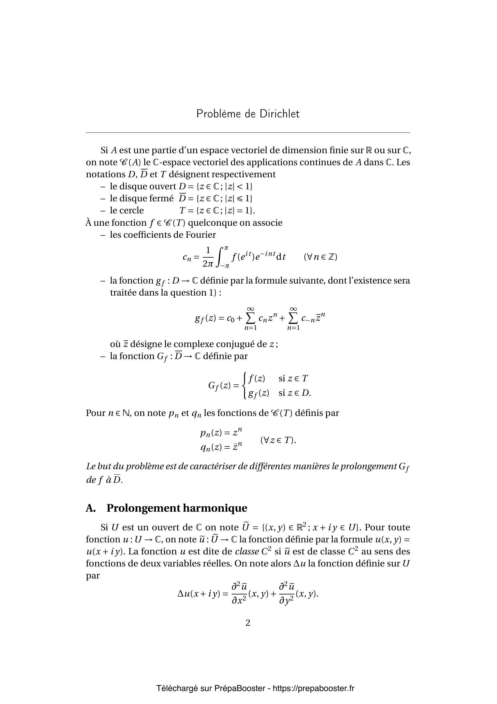 1. 1) Montrer que les deux séries qui entrent dans la définition de g_f(z) sont convergentes pour tout z \in D. \\ Soit S(z) = \sum_{n=0}^{\infty} a_n z^n la somme d’une série entière de rayon de convergence \geq 1.} 2. 2) Au moyen d’une dérivation terme à terme d’une série de fonctions de variable réelle, justifier que l’application S^{\hspace{-1pt}\mathrm{e}} : D^{\hspace{-1pt}\mathrm{e}} \to \mathbb{C} admet une dérivée partielle par rapport à x qui est continue sur D^{\hspace{-1pt}\mathrm{e}}, et exprimer \frac{\partial S^{\hspace{-1pt}\mathrm{e}}}{\partial x} (x, y) sous la forme de la somme d’une série.} 3. 3) Montrer que S est de classe C^2 sur D et déterminer \Delta S(z) pour tout z \in D.} 4. 4) En déduire que g_f est de classe C^2 sur D et que \Delta g_f(z) = 0 pour tout z \in D.} 5. 5) En tenant compte de la définition des c_n dans l’expression de g_f(z), montrer que \\ g_f(z) = \frac{1}{2\pi} \int_{-\pi}^{\pi} f(e^{it})P_z(t) dt.} 6. 6) Déterminer g_f pour f = p_n et f = q_n, où n \in \mathbb{N}. Donner la valeur de l’intégrale \frac{1}{2\pi} \int_{-\pi}^{\pi} P_z(t) dt et étudier le signe de P_z(t) pour tout t \in \mathbb{R}.} 7. 7) Montrer que si (f_n)_{n\in\mathbb{N}} est une suite d’éléments de C(T) qui converge uniformément vers f sur T, alors G_{f_n} converge uniformément vers G_f sur D.} 8. 8) Soit \mathcal{P}(T) le sous-espace vectoriel de C(T) engendré par \{p_n ; n \in \mathbb{N}\} \cup \{q_n ; n \in \mathbb{N}\}. Justifier que tout élément de C(T) est limite uniforme d’une suite d’éléments de \mathcal{P}(T), et en déduire que G_f est continue sur D.} 9. 9) On suppose dans cette question que f est la fonction nulle et que G est à valeurs réelles. Soit \varepsilon > 0 et u : D \to \mathbb{R} définie par u(z) = G(z)+\varepsilon|z|^2. Montrer que \Delta u(z) > 0 pour tout z \in D. En déduire que u(z) \leq \varepsilon pour tout z \in D (on pourra considérer, après en avoir justifié l’existence, un point z_0 \in D où u atteint son maximum.)} 10. 10) Conclure dans le cas particulier de la question précédente, puis dans le cas général. (On pourra d’abord étendre la conclusion au cas où f est nulle mais G est à valeurs complexes.)} 11. 11) Montrer que G vérifie la condition (a3) et en déduire, pour tout n \in \mathbb{Z}, la valeur de l’intégrale \[ \frac{1}{2\pi} \int_{-\pi}^{\pi} e^{\cos t}\cos(\sin t)\cos(nt) dt. \]} 12. 12) Montrer que u est de classe C^2 et telle que \Delta u = 0 sur U si et seulement si, pour tout disque fermé D(a,R) contenu dans U et pour tout z \in D(a,R), on a \[ u(z) = \frac{1}{2\pi}\int_{-\pi}^{\pi} u(a + Re^{it})\;P_{\frac{z – a}{R}}(t)dt. \]} 13. 13) Déduire de la question précédente que si la suite (u_n)_{n \in \mathbb{N}} converge uniformément vers une fonction u, alors u est également de classe C^2 et telle que \Delta u = 0 sur U.} 14. 14) Montrer que \varphi_z vérifie ces quatre propriétés.} 15. 15) Montrer que si \varphi vérifie les conditions (c1), (c2) et (c3), alors \varphi = \varphi_z.} 16. 16) Calculer N(h)^2 en fonction de N(f) et de \lambda.} 17. 17) En étudiant |\varphi(h)|^2, montrer que \varphi(f) \in \mathbb{R} puis que \varphi(f) \geq 0.} 18. 18) En déduire que \varphi(\overline{f}) = \overline{\varphi(f)} pour tout f \in C(T), et conclure.}FAQ