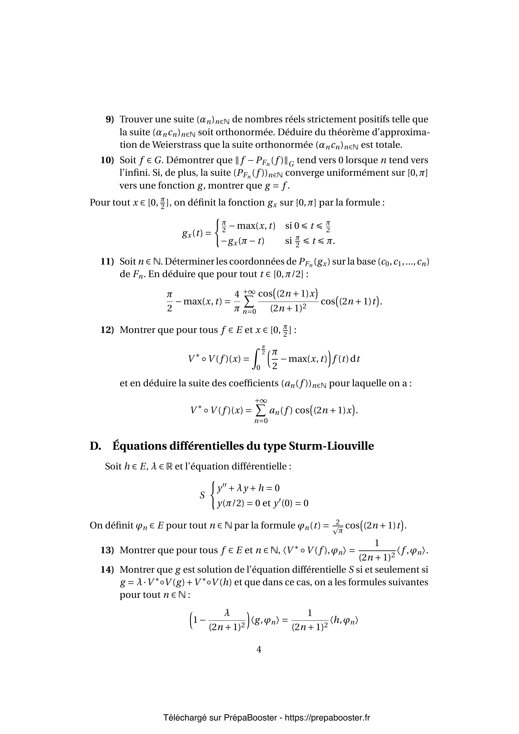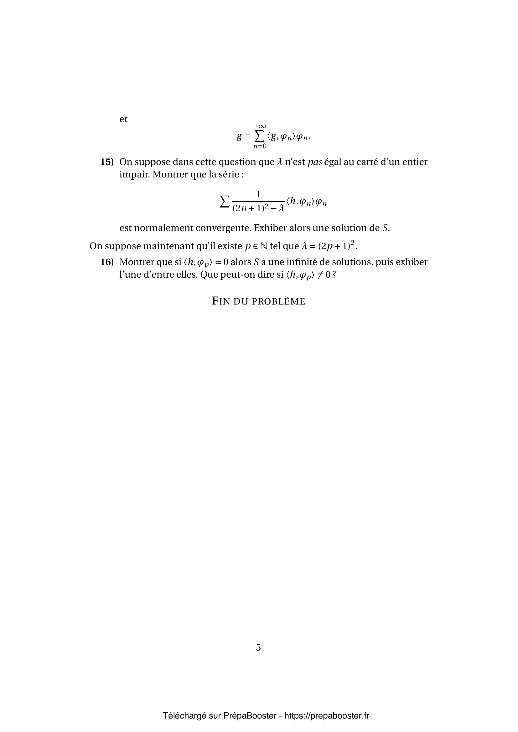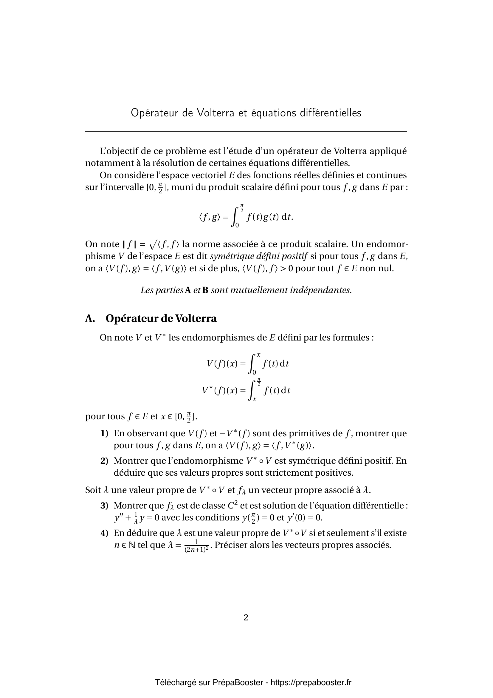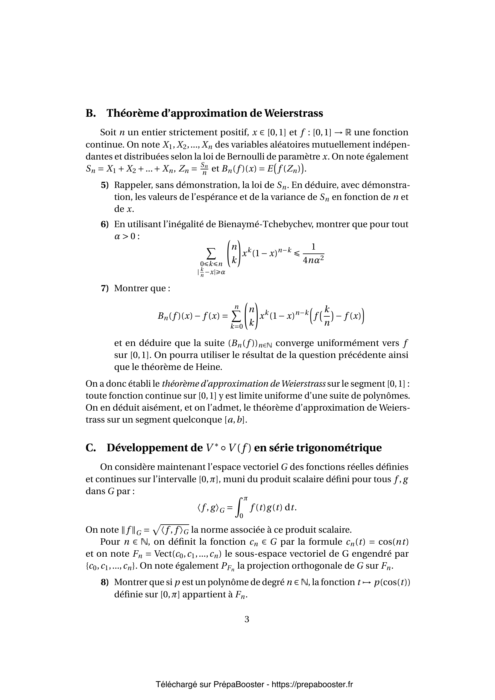 1. En observant que $V(f)$ et $-V^*(f)$ sont des primitives de $f$, montrer que pour tous $f, g$ dans $E$, on a $\langle V(f), g \rangle = \langle f, V^*(g) \rangle$. 2. Montrer que l’endomorphisme $V^* \circ V$ est symétrique défini positif. En déduire que ses valeurs propres sont strictement positives.\\ Soit $\lambda$ une valeur propre de $V^* \circ V$ et $f_\lambda$ un vecteur propre associé à $\lambda$. 3. Montrer que $f_\lambda$ est de classe $C^2$ et est solution de l’équation différentielle :\\ $y” + \dfrac{1}{\lambda} y = 0$ avec les conditions $y\left(\dfrac{\pi}{2}\right) = 0$ et $y'(0) = 0$. 4. En déduire que $\lambda$ est une valeur propre de $V^* \circ V$ si et seulement s’il existe $n \in \mathbb{N}$ tel que $\lambda = \dfrac{1}{(2n+1)^2}$. Préciser alors les vecteurs propres associés. 5. Rappeler, sans démonstration, la loi de $S_n$. En déduire, avec démonstration, les valeurs de l’espérance et de la variance de $S_n$ en fonction de $n$ et de $x$.} 6. En utilisant l’inégalité de Bienaymé-Tchebychev, montrer que pour tout $\alpha > 0$ :\\ \[ \sum_{0 \leq k \leq n} \left|\frac{k}{n} – x\right|^\alpha \binom{n}{k} x^k (1-x)^{n-k} \leq \frac{1}{4n\alpha^2} \] 7. Montrer que :\\ \[ B_n(f)(x) – f(x) = \sum_{k=0}^n \binom{n}{k} x^k (1-x)^{n-k}\left[f\left(\frac{k}{n}\right) – f(x)\right] \] et en déduire que la suite $(B_n(f))_{n\in\mathbb{N}}$ converge uniformément vers $f$ sur $[0,1]$. On pourra utiliser le résultat de la question précédente ainsi que le théorème de Heine. 8. Montrer que si $p$ est un polynôme de degré $n \in \mathbb{N}$, la fonction $t \mapsto p(\cos t)$ définie sur $[0, \pi]$ appartient à $F_n$. 9. Trouver une suite $(\alpha_n)_{n\in\mathbb{N}}$ de nombres réels strictement positifs telle que la suite $(\alpha_n c_n)_{n\in\mathbb{N}}$ soit orthonormée. Déduire du théorème d’approximation de Weierstrass que la suite orthonormée $(\alpha_n c_n)_{n\in\mathbb{N}}$ est totale. 10. Soit $f \in G$. Démontrer que $\|f-P_{F_n}(f)\|_G$ tend vers $0$ lorsque $n$ tend vers l’infini. Si, de plus, la suite $(P_{F_n}(f))_{n\in\mathbb{N}}$ converge uniformément sur $[0,\pi]$ vers une fonction $g$, montrer que $g=f$.} 11. Soit $n \in \mathbb{N}$. Déterminer les coordonnées de $P_{F_n}(g_x)$ sur la base $(c_0,c_1,\ldots,c_n)$ de $F_n$. En déduire que pour tout $t \in [0, \pi/2]$ : \[ \frac{\pi}{2} – \max(x,t) = \frac{4}{\pi}\sum_{n=0}^{+\infty} \frac{\cos((2n+1)x)}{(2n+1)^2}\cos((2n+1)t). \] 12. Montrer que pour tous $f \in E$ et $x \in [0, \frac{\pi}{2}]$ : \[ V^* \circ V (f)(x) = \int_0^{\frac{\pi}{2}} \left(\frac{\pi}{2} – \max(x,t)\right) f(t) dt \] et en déduire la suite des coefficients $(a_n(f))_{n\in\mathbb{N}}$ pour laquelle on a : \[ V^* \circ V(f)(x) = \sum_{n=0}^{+\infty} a_n(f) \cos((2n+1)x). \] 13. Montrer que pour tous $f \in E$ et $n \in \mathbb{N}$, $\left\langle V^* \circ V(f), \varphi_n \right\rangle = \dfrac{1}{(2n+1)^2} \langle f, \varphi_n \rangle$. 14. Montrer que $g$ est solution de l’équation différentielle $S$ si et seulement si $g = \lambda \cdot V^* \circ V (g) + V^* \circ V (h)$ et que dans ce cas, on a les formules suivantes pour tout $n \in \mathbb{N}$ : \[ \left(1 – \frac{\lambda}{(2n+1)^2}\right)\langle g, \varphi_n \rangle = \frac{1}{(2n+1)^2} \langle h, \varphi_n \rangle \] et \[ g = \sum_{n=0}^{+\infty} \langle g, \varphi_n \rangle \varphi_n. \] 15. On suppose dans cette question que $\lambda$ n’est pas égal au carré d’un entier impair. Montrer que la série : \[ \sum \frac{1}{(2n+1)^2 – \lambda} \langle h, \varphi_n \rangle \varphi_n \] est normalement convergente. Exhiber alors une solution de $S$.} 16. On suppose maintenant qu’il existe $p \in \mathbb{N}$ tel que $\lambda = (2p+1)^2$. Montrer que si $\langle h, \varphi_p \rangle = 0$ alors $S$ a une infinité de solutions, puis exhiber l’une d’entre elles. Que peut-on dire si $\langle h, \varphi_p \rangle \neq 0$ ?}FAQ