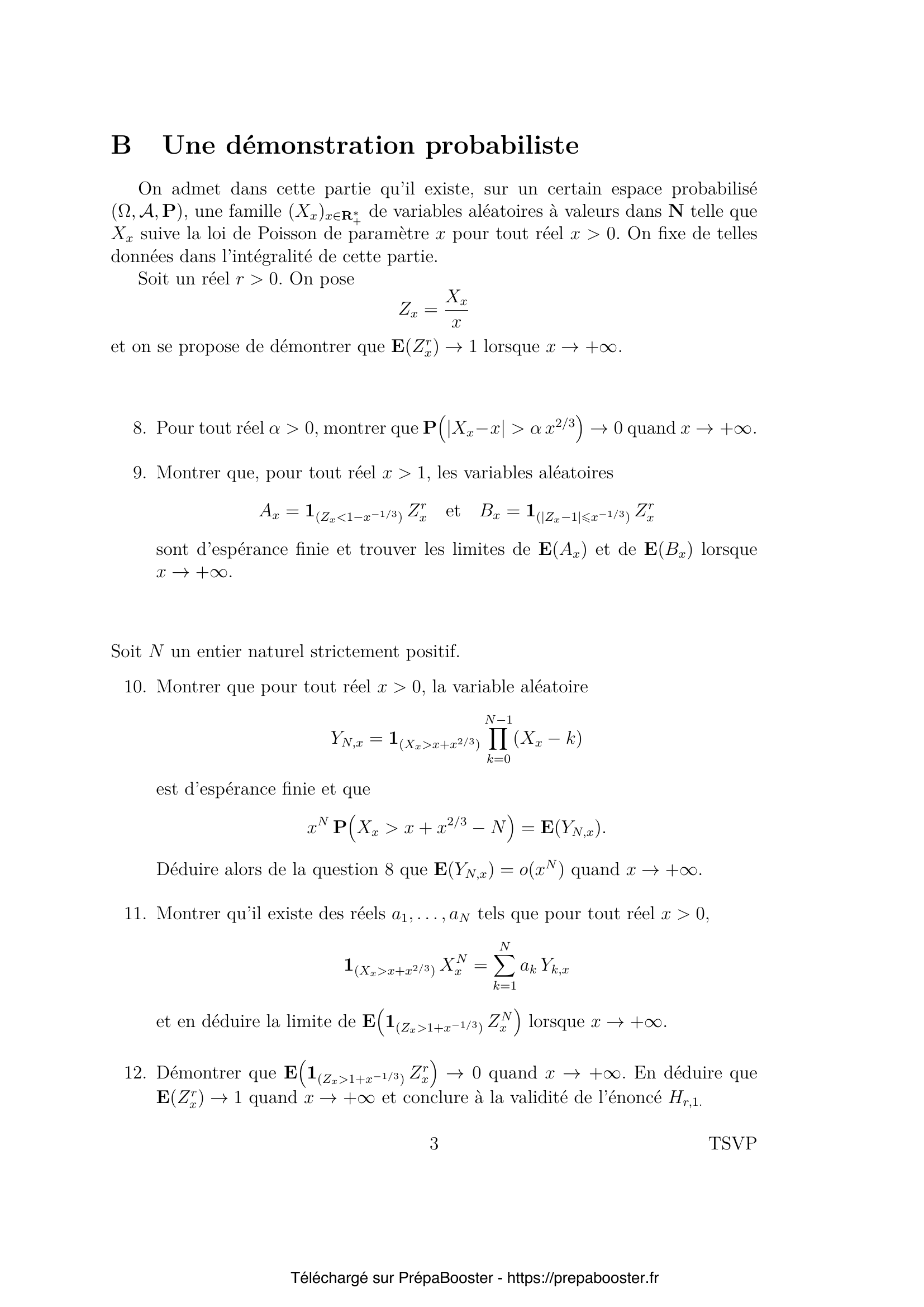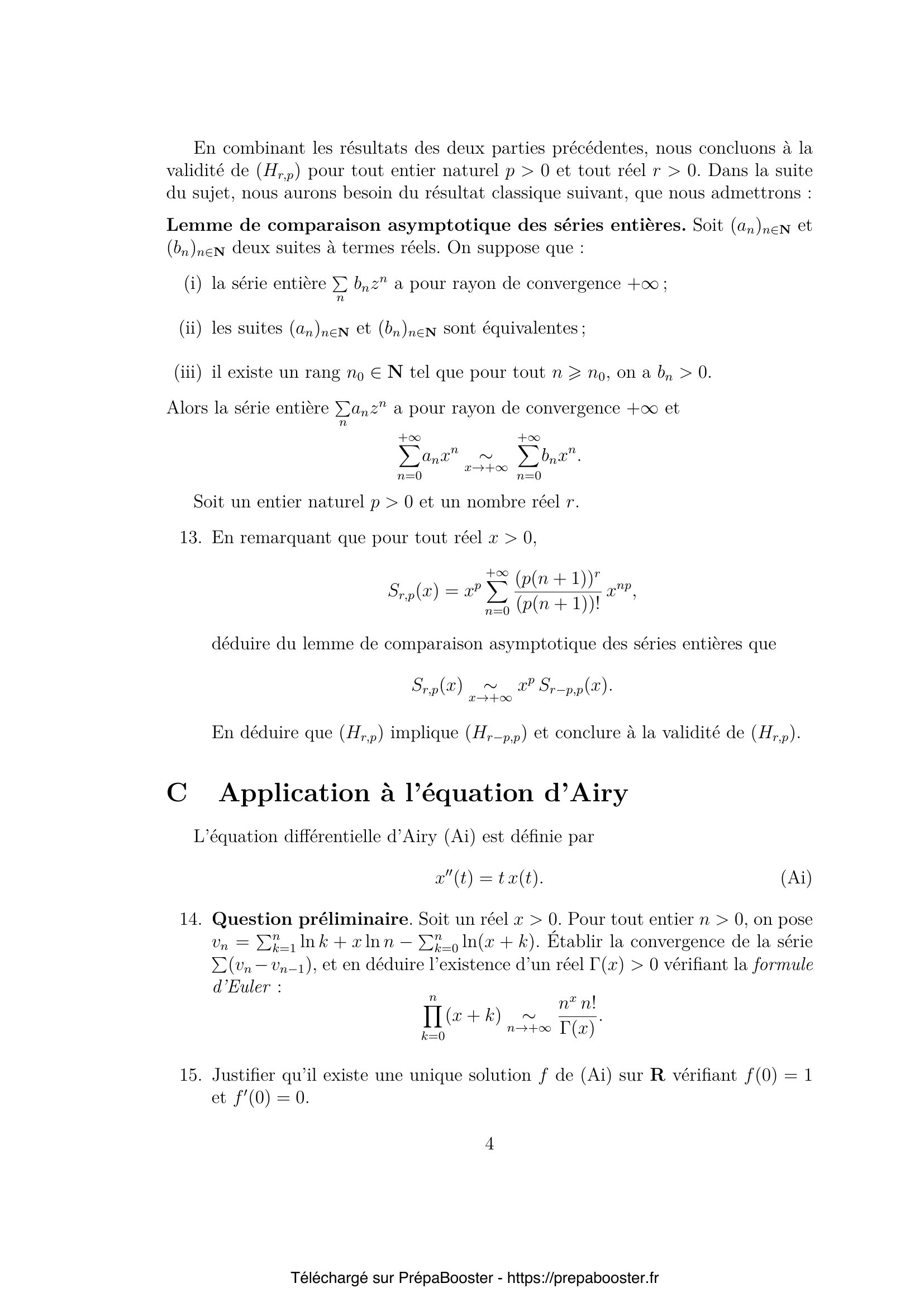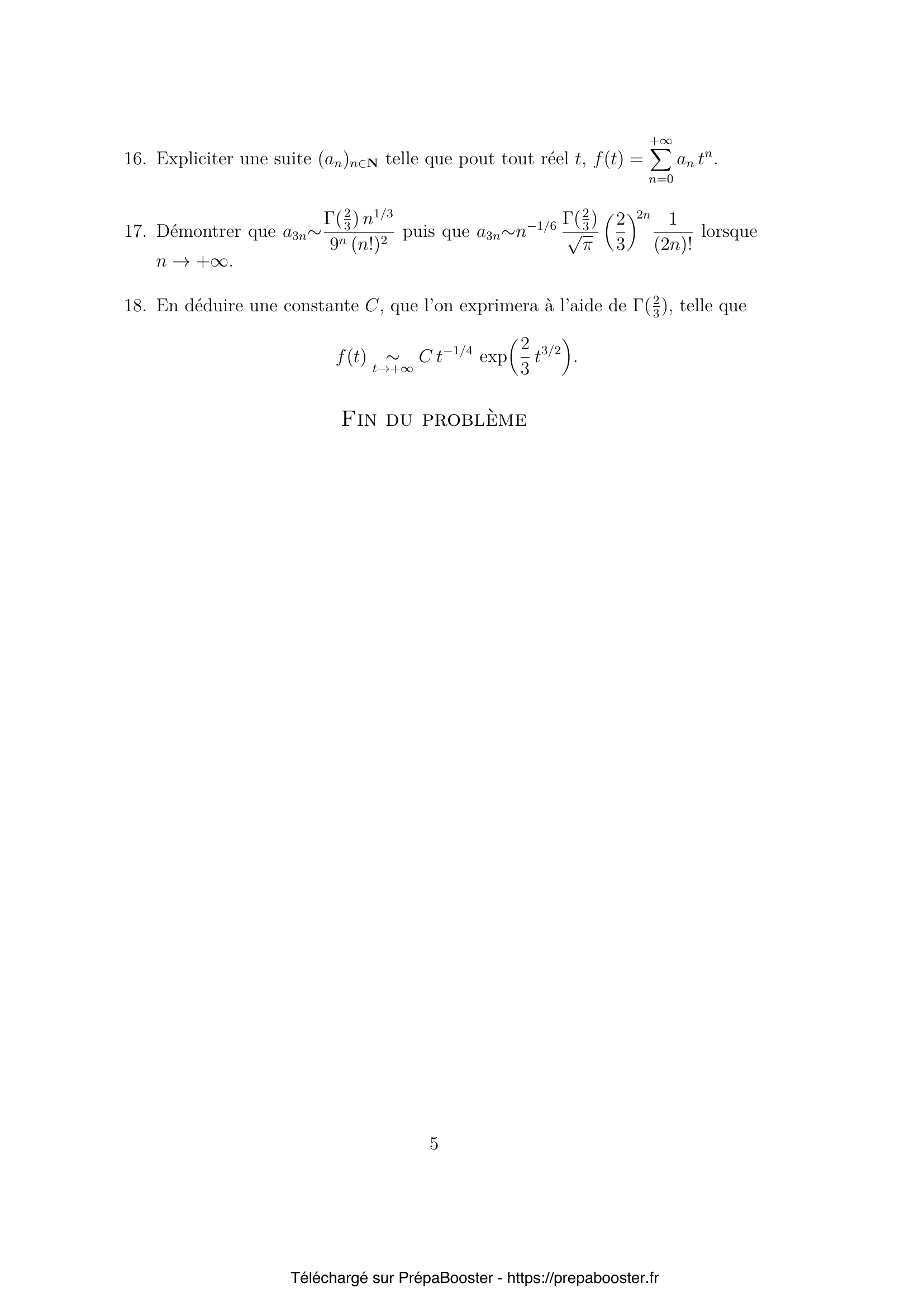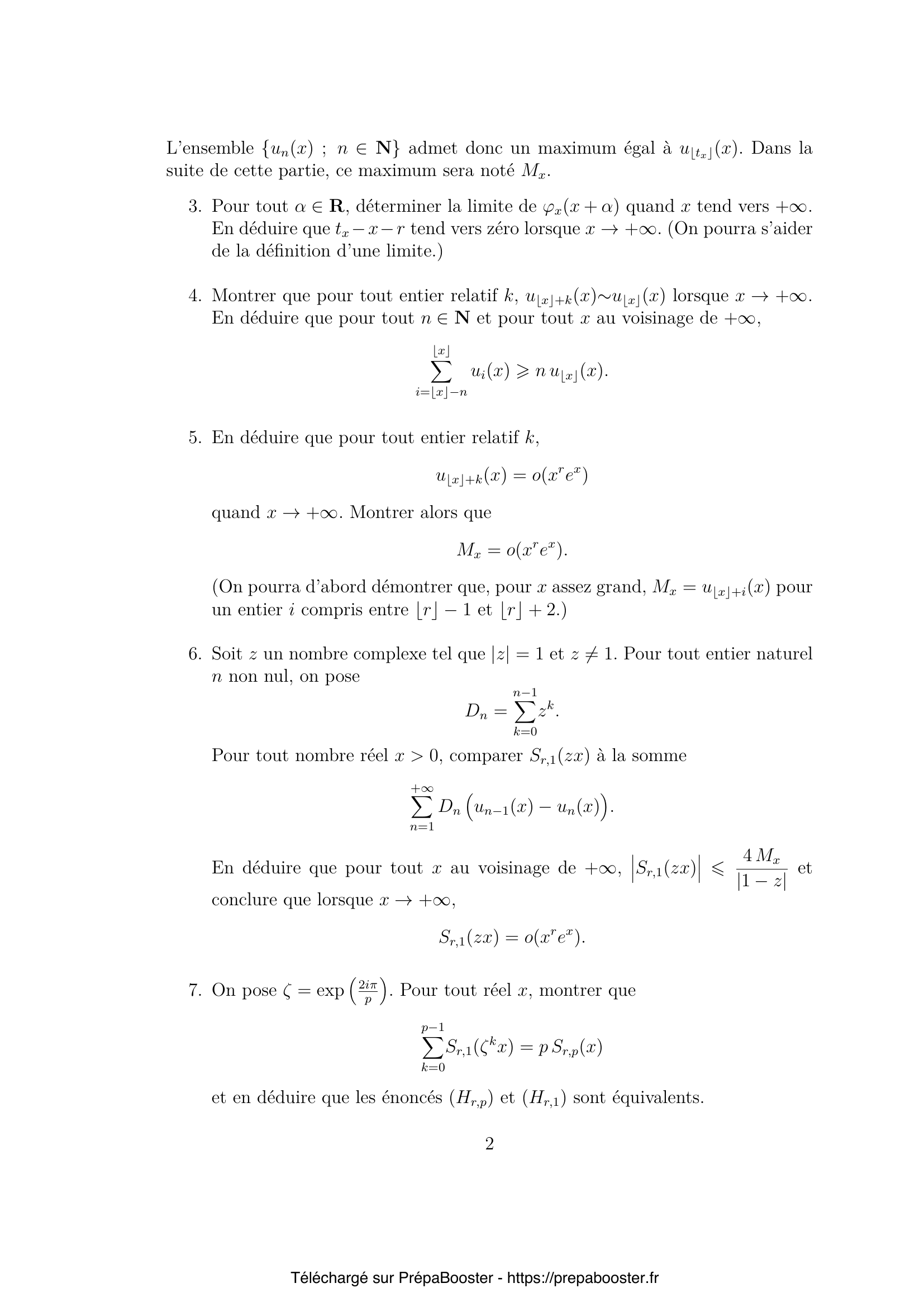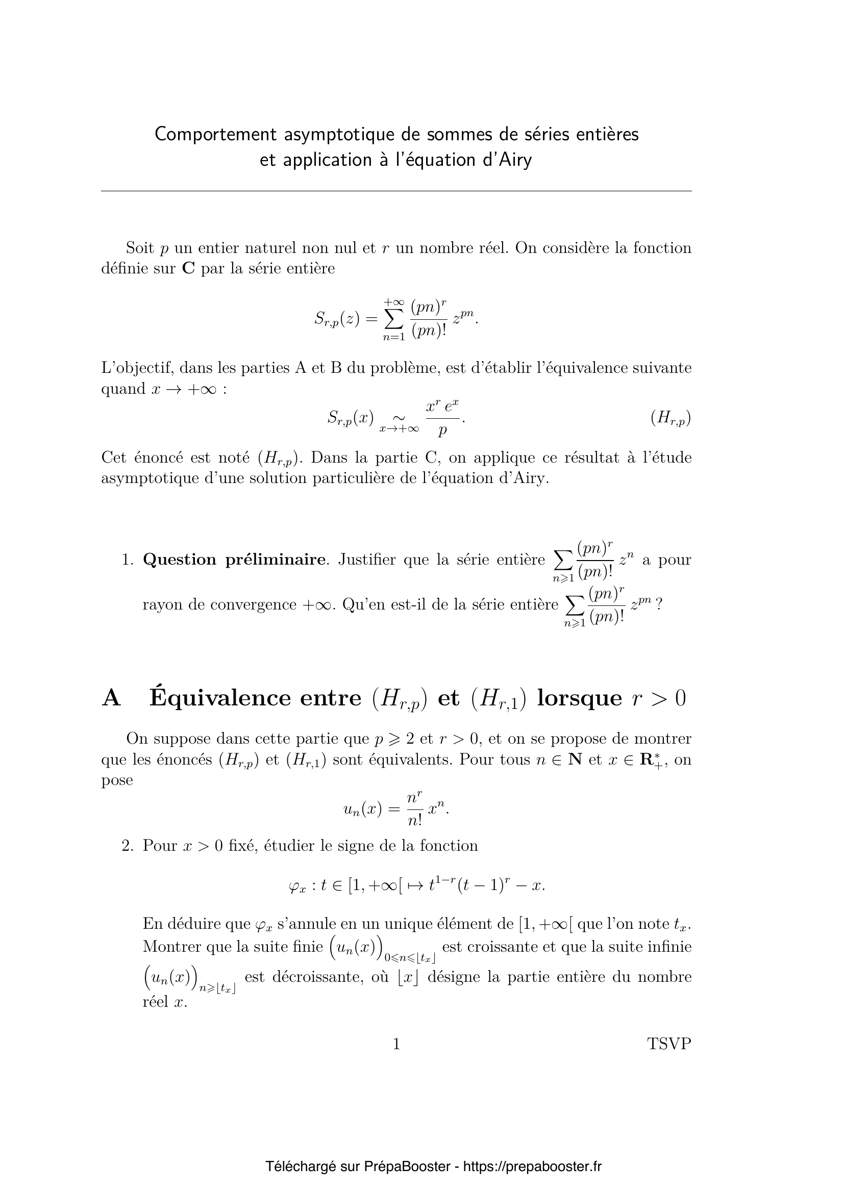 1. Justifier que la série entière $\sum_{n \geq 1} \frac{(pn)^r}{(pn)!} z^n$ a pour rayon de convergence $+\infty$. Qu’en est-il de la série entière $\sum_{n \geq 1} \frac{(pn)^r}{(pn)!} z^{pn}$ ? 2. Pour $x > 0$ fixé, étudier le signe de la fonction \[ \psi_x : t \in [1, +\infty[ \mapsto t^{1-r}(t-1)^r – x. \] En déduire que $\psi_x$ s’annule en un unique élément de $[1, +\infty[$ que l’on note $t_x$. Montrer que la suite finie $(u_n(x))_{0 \leq n \leq \lfloor t_x \rfloor}$ est croissante et que la suite infinie $(u_n(x))_{n > \lfloor t_x \rfloor}$ est décroissante, où $\lfloor x \rfloor$ désigne la partie entière du nombre réel $x$. 3. Pour tout $-\in \mathbb{R}$, déterminer la limite de $\psi_x(x+ -)$ quand $x$ tend vers $+\infty$. En déduire que $t_x – x – r$ tend vers zéro lorsque $x \to +\infty$. (On pourra s’aider de la définition d’une limite.) 4. Montrer que pour tout entier relatif $k$, $u_{\lfloor x \rfloor+k}(x) \sim u_{\lfloor x \rfloor}(x)$ lorsque $x \to +\infty$. En déduire que pour tout $n \in \mathbb{N}$ et pour tout $x$ au voisinage de $+\infty$, \[ \sum_{i = \lfloor x \rfloor – n}^{\lfloor x \rfloor} u_i(x) > n u_{\lfloor x \rfloor}(x). \] 5. En déduire que pour tout entier relatif $k$, \[ u_{\lfloor x \rfloor+k}(x) = o(x^r e^{x}) \] quand $x \to +\infty$. Montrer alors que \[ M_x = o(x^r e^x). \] (On pourra d’abord démontrer que, pour $x$ assez grand, $M_x = u_{\lfloor x \rfloor + i}(x)$ pour un entier $i$ compris entre $\lfloor r \rfloor – 1$ et $\lfloor r \rfloor + 2$.)} 6. Soit $z$ un nombre complexe tel que $|z| = 1$ et $z \neq 1$. Pour tout entier naturel $n$ non nul, on pose \[ D_n = \sum_{k=0}^{n-1} z^k. \] Pour tout nombre réel $x > 0$, comparer $S_{r,1}(z x)$ à la somme \[ \sum_{n=1}^{+\infty} D_n \left( u_{n-1}(x) – u_n(x) \right). \] En déduire que pour tout $x$ au voisinage de $+\infty$, \[ |S_{r,1}(z x)| \leq \frac{4 M_x}{|1 – z|} \] et conclure que lorsque $x \to +\infty$, \[ S_{r,1}(z x) = o(x^r e^x). \] 7. On pose $\xi = \exp\left(\frac{2 i \pi}{p}\right)$. Pour tout réel $x$, montrer que \[ \sum_{k = 0}^{p-1} S_{r,1}(\xi^k x) = p S_{r,p}(x) \] et en déduire que les énoncés $(H_{r,p})$ et $(H_{r,1})$ sont équivalents. 8. Pour tout réel $-\ > 0$, montrer que $\mathbb{P} \left( |X_x – x| > – x^{2/3} \right) \to 0$ quand $x \to +\infty$. 9. Montrer que, pour tout réel $x > 1$, les variables aléatoires \[ A_x = \mathbf{1}_{\{Z_x<1-x^{-1/3}\}} Z_x^r \qquad \text{ et } \qquad B_x = \mathbf{1}_{\{|Z_x-1| \leq x^{-1/3}\}} Z_x^r \] sont d’espérance finie et trouver les limites de $\mathbb{E}(A_x)$ et de $\mathbb{E}(B_x)$ lorsque $x \to +\infty$. 10. Montrer que pour tout réel $x>0$, la variable aléatoire \[ Y_{N,x} = \mathbf{1}_{\{X_x > x + x^{2/3}\}} \prod_{k=0}^{N-1}(X_x-k) \] est d’espérance finie et que \[ x^N \mathbb{P}(X_x > x + x^{2/3} – N) = \mathbb{E}(Y_{N,x}). \] Déduire alors de la question 8 que $\mathbb{E}(Y_{N,x}) = o(x^N)$ quand $x \to +\infty$.} 11. Montrer qu’il existe des réels $a_1, …, a_N$ tels que pour tout réel $x > 0$, \[ \mathbf{1}_{\{X_x > x + x^{2/3}\}} X_x^N = \sum_{k=1}^N a_k Y_{k,x} \] et en déduire la limite de $\mathbb{E}\left[ \mathbf{1}_{\{Z_x > 1 + x^{-1/3}\}} Z_x^N \right]$ lorsque $x \to +\infty$. 12. Démontrer que $\mathbb{E}\left[\mathbf{1}_{\{Z_x > 1 + x^{-1/3}\}} Z_x^r \right] \to 0$ quand $x \to +\infty$. En déduire que $\mathbb{E}(Z_x^r) \to 1$ quand $x \to +\infty$ et conclure à la validité de l’énoncé $H_{r,1}$. 13. En remarquant que pour tout réel $x > 0$, \[ S_{r,p}(x) = x^p \sum_{n=0}^{+\infty} \frac{(p(n+1))^r}{(p(n+1))!} x^{np}, \] déduire du lemme de comparaison asymptotique des séries entières que $S_{r,p}(x) \sim_{x \to +\infty} x^p S_{r-p, p}(x)$. En déduire que $(H_{r, p})$ implique $(H_{r-p, p})$ et conclure à la validité de $(H_{r, p})$. 14. Soit un réel $x > 0$. Pour tout entier $n > 0$, on pose \[ v_n = \sum_{k=1}^n \ln k + x \ln n – \sum_{k=0}^n \ln(x + k). \] Établir la convergence de la série $\sum(v_n – v_{n-1})$, et en déduire l’existence d’un réel $\Gamma(x) > 0$ vérifiant la formule d’Euler : \[ \prod_{k=0}^n (x+k) \sim_{n \to +\infty} n^x \frac{n!}{\Gamma(x)}. \] 15. Justifier qu’il existe une unique solution $f$ de (Ai) sur $\mathbb{R}$ vérifiant $f(0) = 1$ et $f'(0) = 0$.} 16. Expliciter une suite $(a_n)_{n \in \mathbb{N}}$ telle que pour tout réel $t$, $f(t) = \sum_{n=0}^{+\infty} a_n t^n$. 17. Démontrer que $a_{3n} \sim \frac{(2/3)^{n+1/3}}{9^n (n!)^2}$ puis que $a_{3n} \sim n^{-1/6} \left(\frac{2}{3}\right)^{\frac{\sqrt{\pi}}{2}} \frac{3^{2n}}{(2n)!}$ lorsque $n \to +\infty$. 18. En déduire une constante $C$, que l’on exprimera à l’aide de $\left(\frac{2}{3}\right)$, telle que \[ f(t) \sim_{t \to +\infty} C t^{-1/4} \exp\left( \frac{2}{3} t^{3/2} \right). \]}FAQ