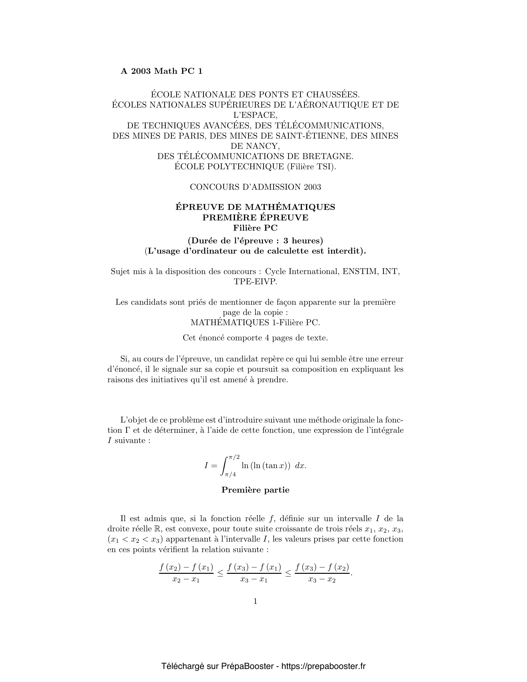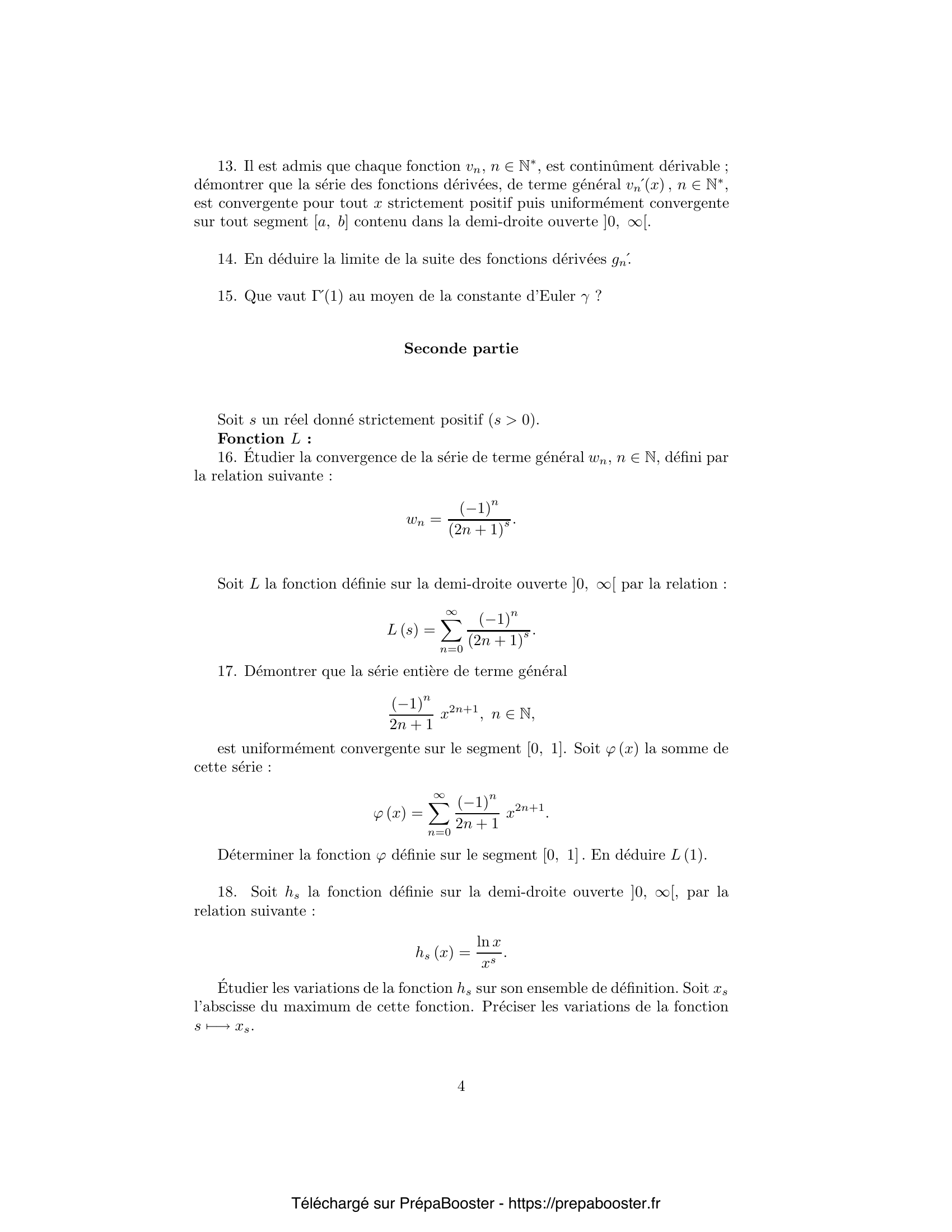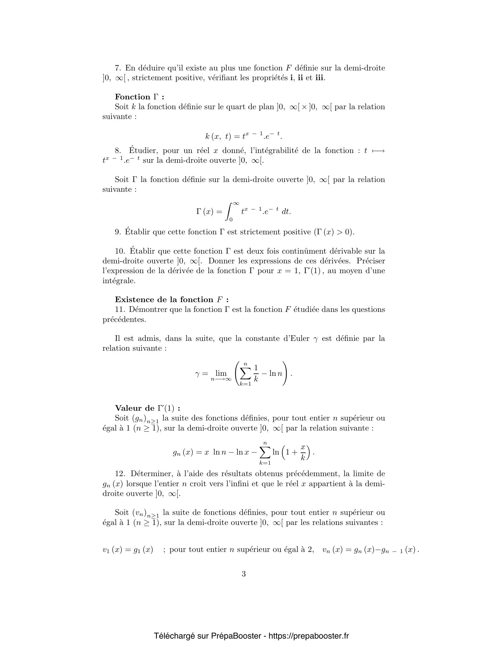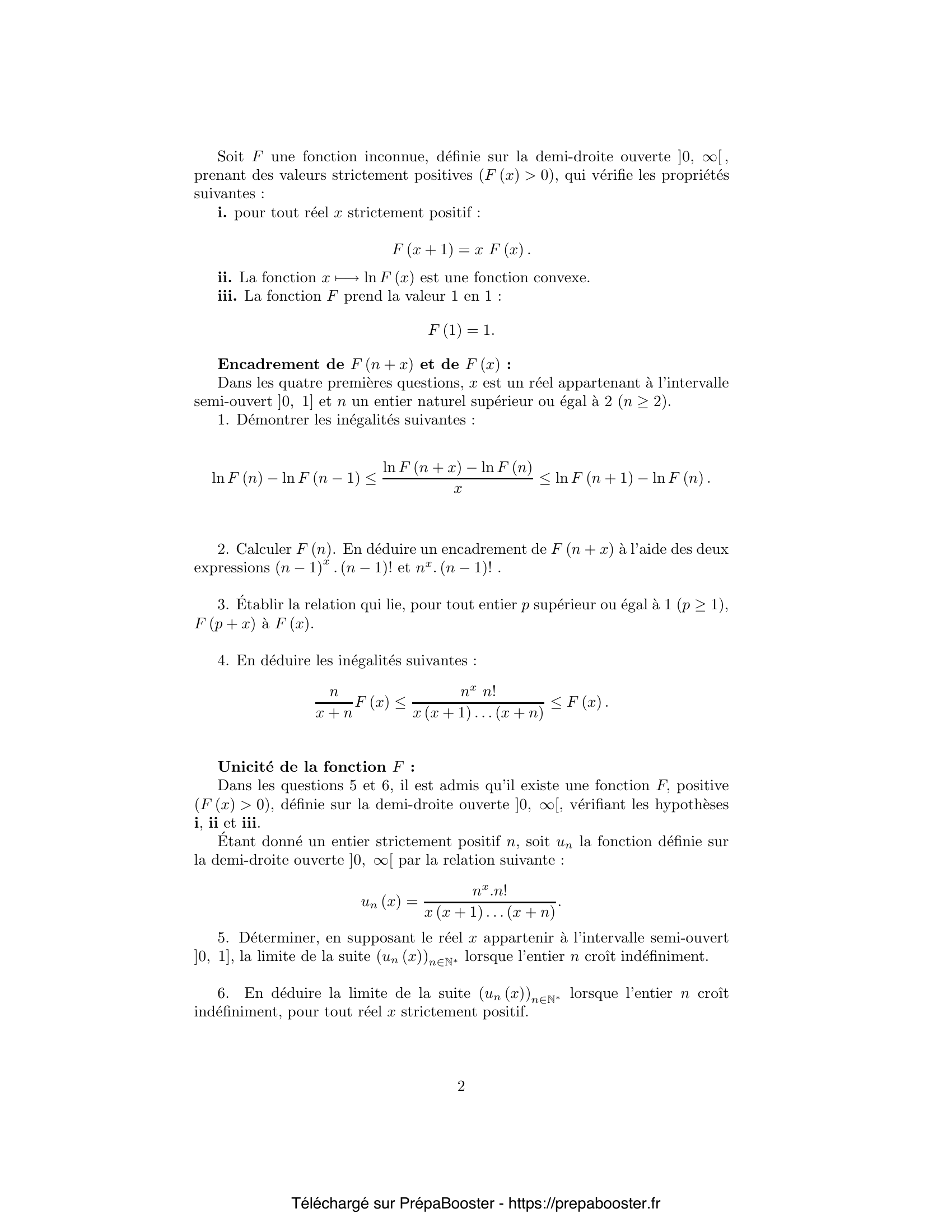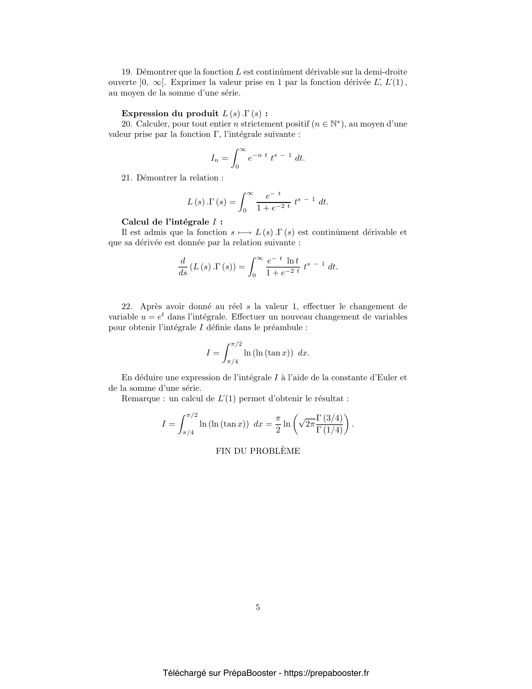 1. Démontrer les inégalités suivantes : \[ \ln F (n) – \ln F (n – 1) \leq \frac{\ln F (n + x) – \ln F (n)}{x} \leq \ln F (n + 1) – \ln F (n). \] 2. Calculer $F(n)$. En déduire un encadrement de $F(n + x)$ à l’aide des deux expressions $(n – 1)^x\,(n – 1)!$ et $n^x (n – 1)!$. 3. Établir la relation qui lie, pour tout entier $p$ supérieur ou égal à $1$ ($p \geq 1$), $F(p + x)$ à $F(x)$. 4. En déduire les inégalités suivantes : \[ \left(\frac{n}{x+n}\right) F(x) \leq \frac{n^x n!}{x (x+1)\ldots(x+n)} \leq F(x). \] 5. Déterminer, en supposant le réel $x$ appartenir à l’intervalle semi-ouvert $]0, 1]$, la limite de la suite $(u_n(x))_{n\in\mathbb{N}^*}$ lorsque l’entier $n$ croît indéfiniment.} 6. En déduire la limite de la suite $(u_n(x))_{n\in\mathbb{N}^*}$ lorsque l’entier $n$ croît indéfiniment, pour tout réel $x$ strictement positif. 7. En déduire qu’il existe au plus une fonction $F$ définie sur la demi-droite $]0, \infty[$, strictement positive, vérifiant les propriétés i, ii et iii. 8. Étudier, pour un réel $x$ donné, l’intégrabilité de la fonction $t \mapsto t^{x – 1} e^{- t}$ sur la demi-droite ouverte $]0, \infty[$. 9. Établir que cette fonction $\Gamma$ est strictement positive ($\Gamma(x) > 0$). 10. Établir que cette fonction $\Gamma$ est deux fois continûment dérivable sur la demi-droite ouverte $]0, \infty[$. Donner les expressions de ces dérivées. Préciser l’expression de la dérivée de la fonction $\Gamma$ pour $x = 1$, $\Gamma'(1)$, au moyen d’une intégrale.} 11. Démontrer que la fonction $\Gamma$ est la fonction $F$ étudiée dans les questions précédentes. 12. Déterminer, à l’aide des résultats obtenus précédemment, la limite de $g_n(x)$ lorsque l’entier $n$ croît vers l’infini et que le réel $x$ appartient à la demi-droite ouverte $]0, \infty[$. 13. Il est admis que chaque fonction $v_n$, $n \in \mathbb{N}^*$, est continûment dérivable ; démontrer que la série des fonctions dérivées, de terme général $v_n'(x)$, $n \in \mathbb{N}^*$, est convergente pour tout $x$ strictement positif puis uniformément convergente sur tout segment $[a, b]$ contenu dans la demi-droite ouverte $]0, \infty[$. 14. En déduire la limite de la suite des fonctions dérivées $g_n’$. 15. Que vaut $\Gamma'(1)$ au moyen de la constante d’Euler $\gamma$ ?} 16. Étudier la convergence de la série de terme général $w_n, n\in\mathbb{N}$, défini par la relation suivante : \[ w_n = \frac{(-1)^n}{(2n + 1)^s}. \] 17. Démontrer que la série entière de terme général \[ \frac{(-1)^n}{2n+1}\,x^{2n+1},\ n\in\mathbb{N}, \] est uniformément convergente sur le segment $[0, 1]$. Soit $\varphi(x)$ la somme de cette série : \[ \varphi(x) = \sum_{n=0}^{\infty} \frac{(-1)^n}{2n+1} x^{2n+1}. \] Déterminer la fonction $\varphi$ définie sur le segment $[0, 1]$. En déduire $L(1)$. 18. Soit $h_s$ la fonction définie sur la demi-droite ouverte $]0, \infty[$, par la relation suivante : \[ h_s(x) = \frac{\ln x}{x^s}. \] Étudier les variations de la fonction $h_s$ sur son ensemble de définition. Soit $x_s$ l’abscisse du maximum de cette fonction. Préciser les variations de la fonction $s \mapsto x_s$. 19. Démontrer que la fonction $L$ est continûment dérivable sur la demi-droite ouverte $]0, \infty[$. Exprimer la valeur prise en $1$ par la fonction dérivée $L’$, $L'(1)$, au moyen de la somme d’une série. 20. Calculer, pour tout entier $n$ strictement positif ($n\in\mathbb{N}^*$), au moyen d’une valeur prise par la fonction $\Gamma$, l’intégrale suivante : \[ I_n = \int_0^{\infty} e^{-nt} t^{s-1} dt. \] } 21. Démontrer la relation : \[ L(s)\,\Gamma(s) = \int_0^{\infty} \frac{e^{-t}}{1 + e^{-2t}} t^{s-1} dt. \] 22. Après avoir donné au réel $s$ la valeur $1$, effectuer le changement de variable $u = e^t$ dans l’intégrale. Effectuer un nouveau changement de variables pour obtenir l’intégrale $I$ définie dans le préambule : \[ I = \int_{\pi/4}^{\pi/2} \ln (\ln (\tan x))\, dx. \] En déduire une expression de l’intégrale $I$ à l’aide de la constante d’Euler et de la somme d’une série.}FAQ