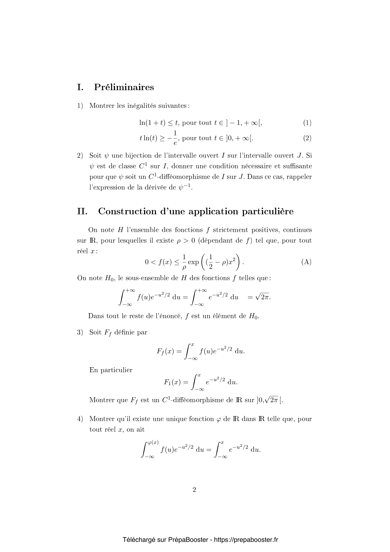 1. Montrer les inégalités suivantes :\\ \[ \ln(1 + t) \leq t, \quad \text{pour tout } t \in ] – 1, + \infty [, \] \[ t\ln(t) \geq -\frac{1}{e}, \quad \text{pour tout } t \in ]0, +\infty[. \] 2. Soit $\psi$ une bijection de l’intervalle ouvert $I$ sur l’intervalle ouvert $J$. Si $\psi$ est de classe $\mathcal{C}^1$ sur $I$, donner une condition nécessaire et suffisante pour que $\psi$ soit un $\mathcal{C}^1$-difféomorphisme de $I$ sur $J$. Dans ce cas, rappeler l’expression de la dérivée de $\psi^{-1}$. 3. Soit $F_f$ définie par \[ F_f(x) = \int_{-\infty}^{x} f(u) e^{-u^2/2} \, du. \] En particulier \[ F_1(x) = \int_{-\infty}^{x} e^{-u^2/2} \, du. \] Montrer que $F_f$ est un $\mathcal{C}^1$-difféomorphisme de $\mathbb{R}$ sur $]0, \sqrt{2\pi}[$. 4. Montrer qu’il existe une unique fonction $\varphi$ de $\mathbb{R}$ dans $\mathbb{R}$ telle que, pour tout réel $x$, on ait \[ \int_{-\infty}^{\varphi(x)} f(u)e^{-u^2/2}\,du = \int_{-\infty}^{x} e^{-u^2/2}\,du. \] 5. Montrer que $\varphi$ est monotone et que $\varphi$ est un $\mathcal{C}^1$-difféomorphisme de $\mathbb{R}$ sur $\mathbb{R}$.} 6. Pour tout réel $x$, calculer \[ \ln(\varphi'(x)) + \ln(f(\varphi(x))) – \frac{1}{2}\varphi(x)^2, \] et \[ \ln((\varphi^{-1})'(x)) – \ln(f(x)) – \frac{1}{2}(\varphi^{-1}(x))^2. \] 7. Soit $h$ une fonction continue par morceaux de $\mathbb{R}$ dans $\mathbb{R}$ telle que la fonction $u \mapsto h(u)f(u) e^{-u^2/2}$ soit intégrable sur $\mathbb{R}$.\\ Montrer l’identité suivante : \[ \int_{-\infty}^{+\infty} h(u)f(u)e^{-u^2/2} du = \int_{-\infty}^{+\infty} h(\varphi(u))e^{-u^2/2} du. \] 8. Montrer qu’il existe un réel $A > 0$ tel que pour tout réel $x \geq A$, on ait : \[ \int_{x}^{x+1} \varphi^2(u) e^{-u^2/2} du \geq \varphi^2(x) e^{-(x+1)^2/2}. \] 9. Montrer qu’il existe un réel $B > 0$ tel que pour tout réel $|u| \geq B$, on ait : \[ |\varphi(u)| \leq e^{(|u|+1)^2/4}. \] 10. Déterminer une primitive de la fonction \[ u \mapsto [u\varphi(u) – u^2 – \varphi'(u) + 1]e^{-u^2/2}. \]} 11. Calculer l’intégrale suivante \[ I = \int_{-\infty}^{+\infty} [u\varphi(u) – u^2 – \varphi'(u) + 1]e^{-u^2/2} du. \] 12. Justifier la convergence de ces deux intégrales : \[ E(f) = \int_{-\infty}^{+\infty} f(u) \ln(f(u))e^{-u^2/2} du,\qquad \Phi(f) = \frac{1}{2} \int_{-\infty}^{+\infty} |u – \varphi(u)|^2 e^{-u^2/2} du. \] 13. Montrer l’identité : \[ E(f) = \int_{-\infty}^{+\infty} \ln(f(\varphi(u)))e^{-u^2/2} du. \] 14. Montrer l’égalité suivante : \[ E(f) – \Phi(f) = \int_{-\infty}^{+\infty} [\varphi'(u) – 1 – \ln(\varphi'(u))]\, e^{-u^2/2} du. \] 15. Quelle est la relation d’ordre entre $\Phi(f)$ et $E(f)$?} 16. Déterminer les fonctions telles que $E(f) = \Phi(f)$.}FAQ