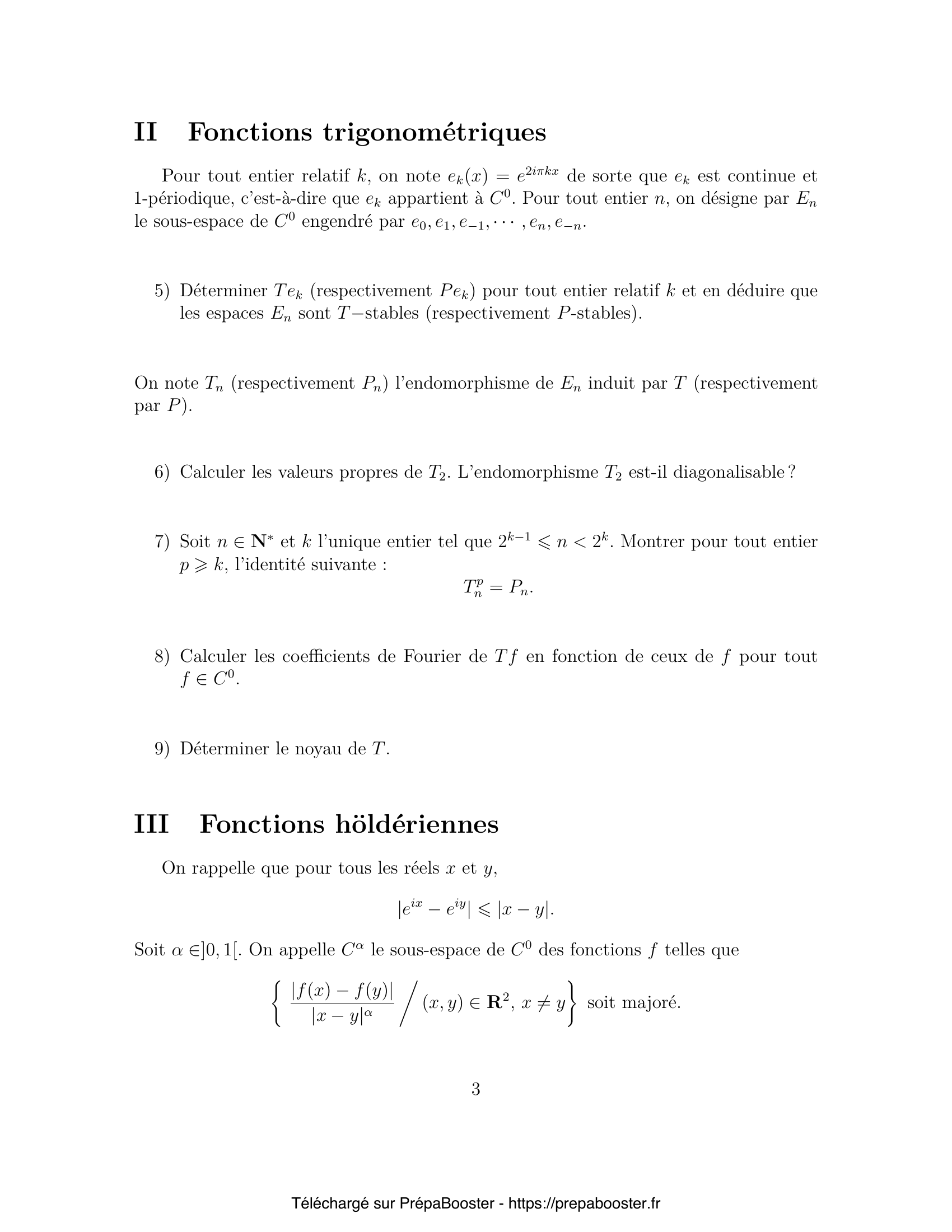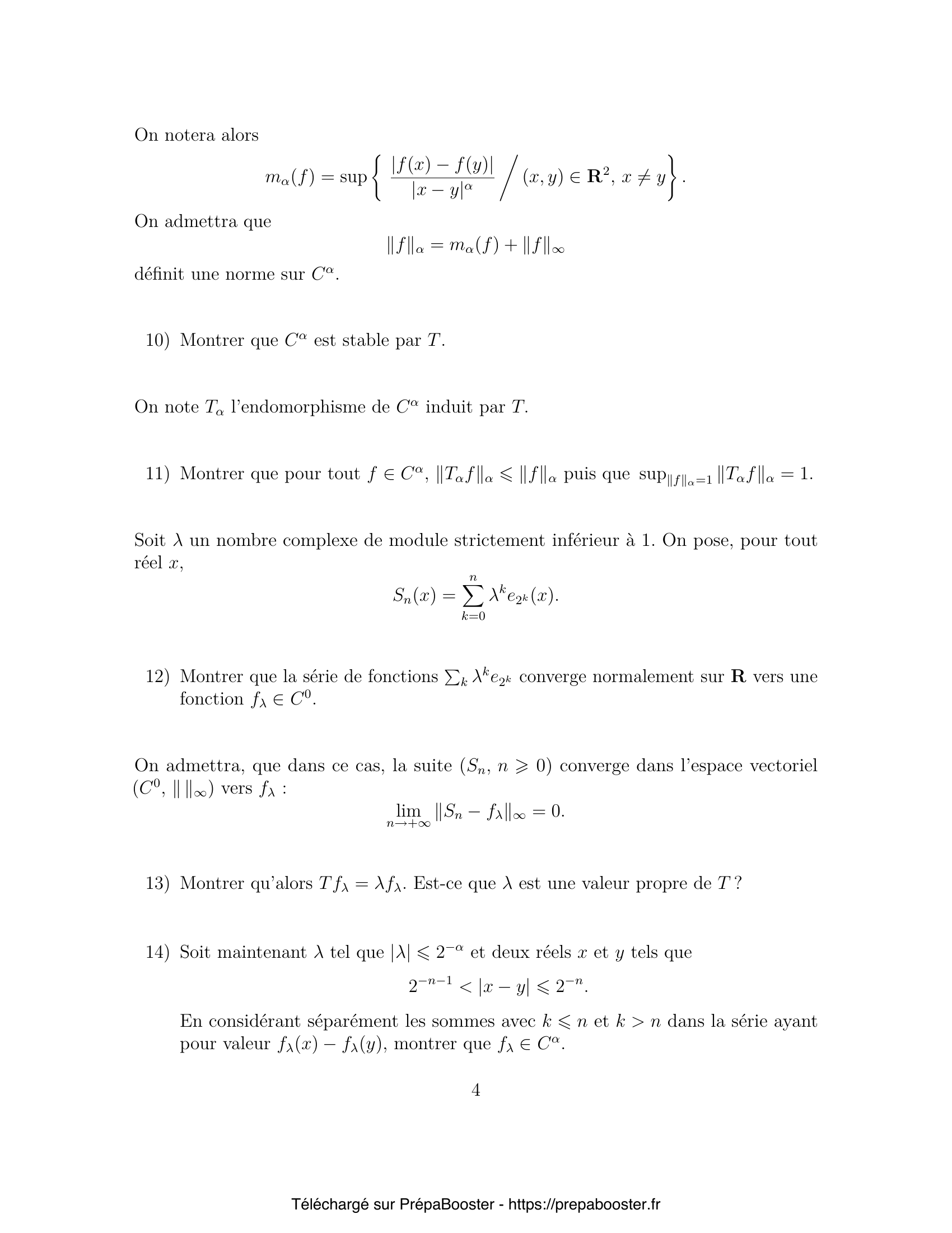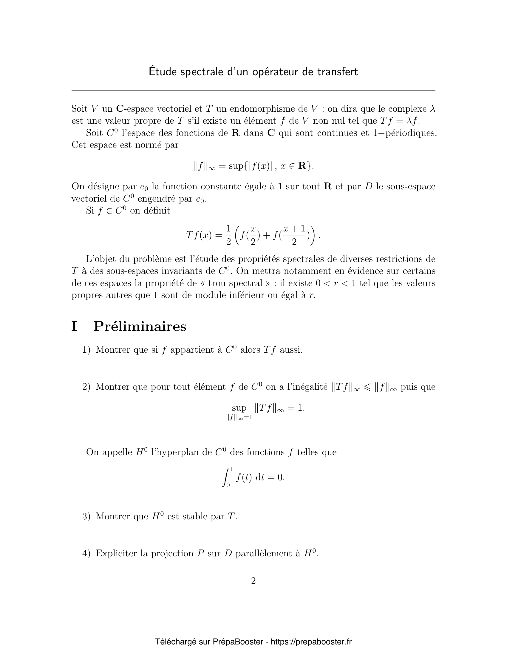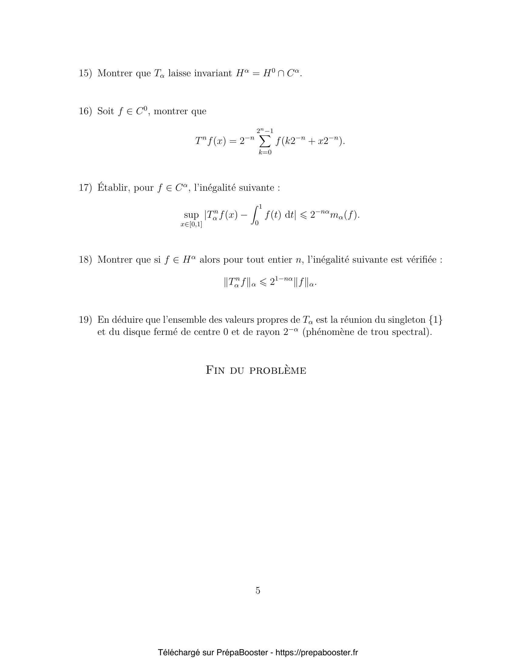 1. Montrer que si $f$ appartient à $C^0$ alors $T f$ aussi. 2. Montrer que pour tout élément $f$ de $C^0$ on a l’inégalité $ \|T f\|_\infty \leq \|f\|_\infty $ puis que $\sup_{\|f\|_\infty=1} \|T f\|_\infty = 1$. 3. Montrer que $H_0$ est stable par $T$. 4. Expliciter la projection $P$ sur $D$ parallèlement à $H_0$. 5. Déterminer $T e_k$ (respectivement $P e_k$) pour tout entier relatif $k$ et en déduire que les espaces $E_n$ sont $T$-stables (respectivement $P$-stables).} 6. Calculer les valeurs propres de $T_2$. L’endomorphisme $T_2$ est-il diagonalisable ? 7. Soit $n \in \mathbb{N}^*$ et $k$ l’unique entier tel que $2^{k-1} \leq n < 2^k$. Montrer pour tout entier $p > k$, l’identité suivante : $T^p_n = P_n$. 8. Calculer les coefficients de Fourier de $T f$ en fonction de ceux de $f$ pour tout $f \in C^0$. 9. Déterminer le noyau de $T$. 10. Montrer que $C^\alpha$ est stable par $T$.} 11. Montrer que pour tout $f \in C^\alpha$, $\|T_\alpha f\|_\alpha \leq \|f\|_\alpha$ puis que $\sup_{\|f\|_\alpha = 1} \|T_\alpha f\|_\alpha = 1$. 12. Soit $\lambda$ un nombre complexe de module strictement inférieur à 1. On pose, pour tout réel $x$, $$ S_n(x) = \sum_{k=0}^n \lambda^k e_{2^k}(x). $$ Montrer que la série de fonctions $\sum_k \lambda^k e_{2^k}$ converge normalement sur $\mathbb{R}$ vers une fonction $f_\lambda \in C^0$. 13. On admettra, que dans ce cas, la suite $(S_n,\, n > 0)$ converge dans l’espace vectoriel $(C^0, \| \cdot \|_\infty)$ vers $f_\lambda$ : $$ \lim_{n \to +\infty} \| S_n – f_\lambda \|_\infty = 0. $$ Montrer qu’alors $T f_\lambda = \lambda f_\lambda$. Est-ce que $\lambda$ est une valeur propre de $T$ ? 14. Soit maintenant $\lambda$ tel que $|\lambda| \leq 2^{-\alpha}$ et deux réels $x$ et $y$ tels que $2^{-n-1} < |x-y| \leq 2^{-n}$. En considérant séparément les sommes avec $k \leq n$ et $k > n$ dans la série ayant pour valeur $f_\lambda(x) – f_\lambda(y)$, montrer que $f_\lambda \in C^\alpha$. 15. Montrer que $T_\alpha$ laisse invariant $H_\alpha = H_0 \cap C^\alpha$.} 16. Soit $f \in C^0$, montrer que $$ T^n f(x) = 2^{-n} \sum_{k=0}^{2^n-1} f\left(k2^{-n} + x2^{-n}\right). $$ 17. Établir, pour $f \in C^\alpha$, l’inégalité suivante : $$ \sup_{x \in [0,1]} \left| T_\alpha^n f(x) – \int_0^1 f(t)\,dt \right| \leq 2^{-n\alpha} m_\alpha(f). $$ 18. Montrer que si $f \in H_\alpha$ alors pour tout entier $n$, l’inégalité suivante est vérifiée : $$ \|T_\alpha^n f\|_\alpha \leq 2^{1-n\alpha} \|f\|_\alpha. $$ 19. En déduire que l’ensemble des valeurs propres de $T_\alpha$ est la réunion du singleton $\{1\}$ et du disque fermé de centre $0$ et de rayon $2^{-\alpha}$ (phénomène de trou spectral).}FAQ