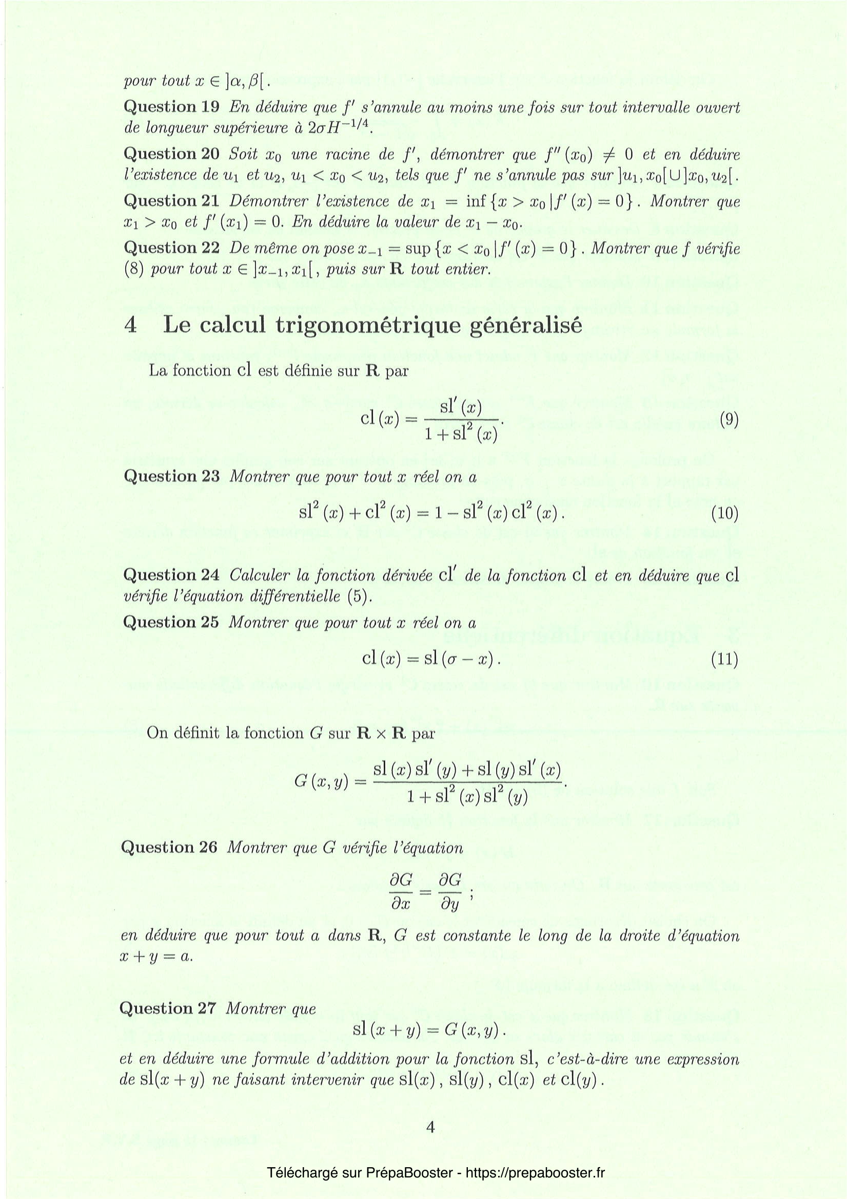 23. De même on pose $x_{-1} = \sup\{x < x_0 \mid f'(x) = 0\}$. Montrer que $f$ vérifie (8) pour tout $x \in ]x_{-1},x_1[$, puis sur $\R$ tout entier. 24. Montrer que pour tout $x$ réel on a \[ \sl^2(x)+\cl^2(x)=1 \] si l’on note $\cl$ la fonction définie par \[ \cl(x) = \frac{\sl'(x)}{1+\sl^2(x)}. \] 25. Montrer que pour tout $x$ réel on a \[ \cl(x) = \sl(\sigma – x) \] } 26. Calculer la fonction dérivée de $\cl$ de la fonction $\cl$ et en déduire que \[ \cl'(x) = -\sl(x)\cl^2(x). \] 27. Montrer que $G$ vérifie l’équation \[ \frac{\partial G}{\partial x} = \frac{\partial G}{\partial y} \] en déduire que pour tout $a$ dans $\mathbb{R}$, $G$ est constante le long de la droite d’équation $x+y=a$. 28. Montrer que \[ \sl(x+y) = G(x,y) \] et en déduire une formule d’addition pour la fonction $\sl$, c’est-à-dire une expression de $\sl(x+y)$ ne faisant intervenir que $\sl(x)$, $\sl(y)$, $\cl(x)$ et $\cl(y)$. 29. Démontrer la formule de Fagnano, valable dans un intervalle $[-\alpha, \alpha]$ que l’on précisera : \[ 2\int_0^z \frac{dr}{\sqrt{1 – r^4}} = \int_0^{\frac{2z}{1+z^2}} \frac{dr}{\sqrt{1 – r^4}}. \] }