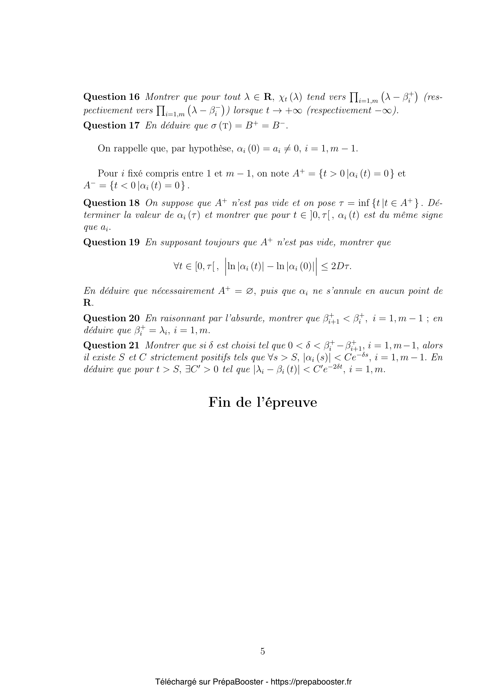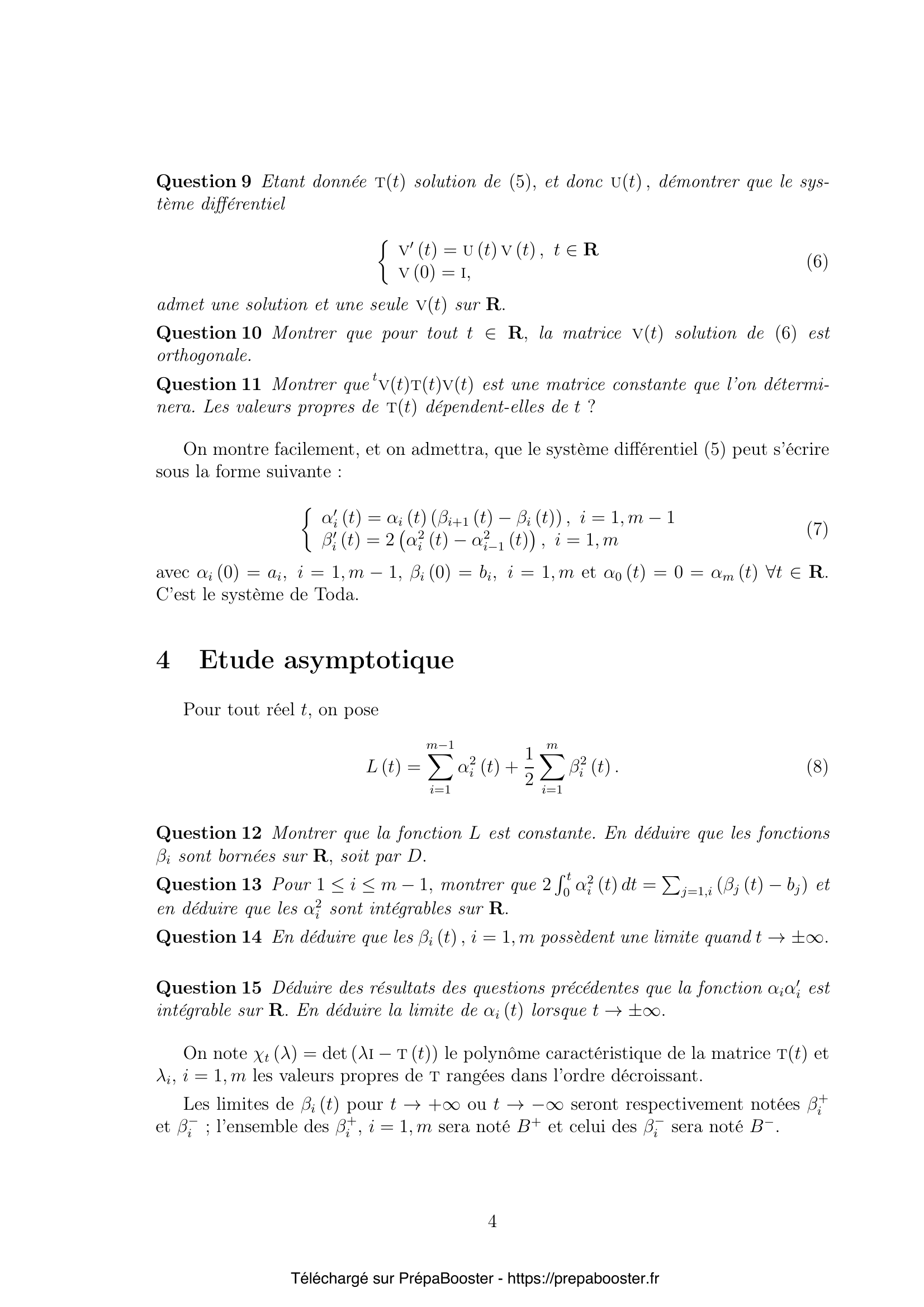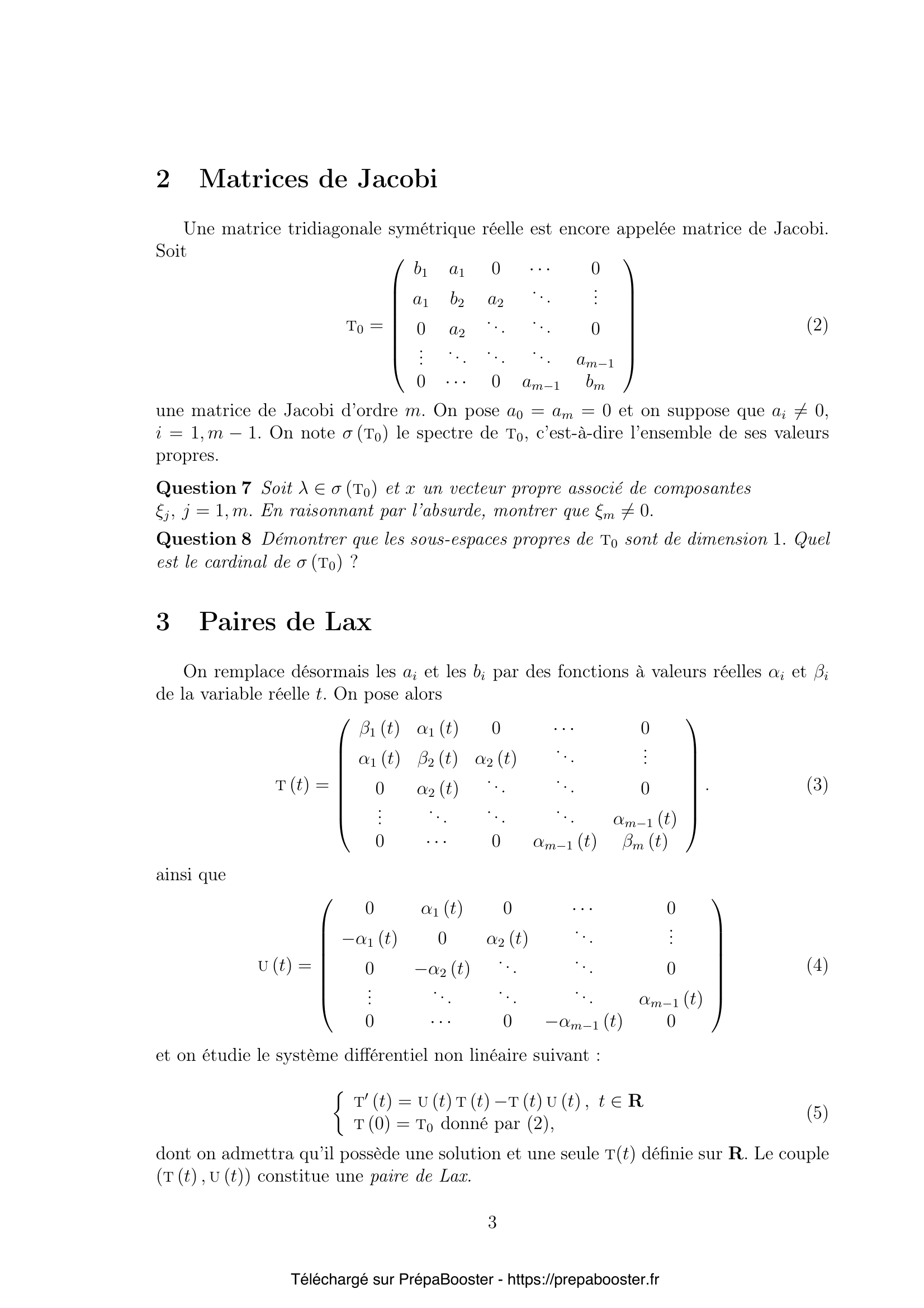 1. Montrer que $h u = -u$ et que $h v = v$ dès que $v$ est orthogonal à $u$. 2. Démontrer que $h$ est symétrique et orthogonale. 3. Soit $g \in \mathbb{R}^m$, de composantes $\gamma_i,\, 1 \leq i \leq m$, un vecteur unitaire non colinéaire à $e_1$. On pose $u = \dfrac{g – e_1}{\sqrt{2(1 – \gamma_1)}}$, montrer que $u$ est unitaire et que $h g = e_1$. 4. En déduire que si $x$ est un vecteur de $\mathbb{R}^m$ non colinéaire à $e_1$, il existe un vecteur unitaire $u$ et une matrice de Householder associée $h$ telle que $h x = \|x\| e_1$. 5. Montrer que $b^s$ est semblable à $q^b$ et qu’on peut choisir $h_1$ de telle sorte que $\sigma^b_{i1} = \sigma^b_{1i} = 0$ pour $i = 3, \ldots, m$.} 6. En déduire un procédé permettant de déterminer une matrice tridiagonale symétrique semblable à $q^b$. 7. Soit $\lambda \in \sigma(t^0)$ et $x$ un vecteur propre associé de composantes $\xi_j$, $j = 1, \ldots, m$. En raisonnant par l’absurde, montrer que $\xi_m \neq 0$. 8. Démontrer que les sous-espaces propres de $t^0$ sont de dimension $1$. Quel est le cardinal de $\sigma(t^0)$ ? 9. Étant donnée $t(t)$ solution de (5), et donc $u(t)$, démontrer que le système différentiel $\left\{\begin{array}{l} v'(t) = u(t) v(t),\ t \in \mathbb{R} \\ v(0) = I \end{array}\right.$ admet une solution et une seule $v(t)$ sur $\mathbb{R}$. 10. Montrer que pour tout $t \in \mathbb{R}$, la matrice $v(t)$ solution de (6) est orthogonale.} 11. Montrer que $^t v(t) t(t) v(t)$ est une matrice constante que l’on déterminera. Les valeurs propres de $t(t)$ dépendent-elles de $t$ ? 12. Montrer que la fonction $L$ est constante. En déduire que les fonctions $\beta_i$ sont bornées sur $\mathbb{R}$, soit par $D$. 13. Pour $1 \leq i \leq m-1$, montrer que $2\int_0^t \alpha_i^2(s)\, ds = \sum_{j=1}^i (\beta_j(t)-b_j)$ et en déduire que les $\alpha_i^2$ sont intégrables sur $\mathbb{R}$. 14. En déduire que les $\beta_i(t)$, $i = 1, \ldots, m$ possèdent une limite quand $t \to \pm \infty$. 15. Déduire des résultats des questions précédentes que la fonction $\alpha_i \alpha_i’$ est intégrable sur $\mathbb{R}$. En déduire la limite de $\alpha_i(t)$ lorsque $t \to \pm \infty$.} 16. Montrer que pour tout $\lambda \in \mathbb{R}$, $\chi_t(\lambda)$ tend vers $\prod_{i=1}^m (\lambda – \beta_i^+)$ (respectivement vers $\prod_{i=1}^m (\lambda – \beta_i^-)$) lorsque $t \to +\infty$ (respectivement $-\infty$). 17. En déduire que $\sigma(t) = B^+ = B^-$. 18. On suppose que $A^+$ n’est pas vide et on pose $\tau = \inf\{t\ |\ t \in A^+\}$. Déterminer la valeur de $\alpha_i(\tau)$ et montrer que pour $t \in\,]0,\tau[$, $\alpha_i(t)$ est du même signe que $a_i$. 19. En supposant toujours que $A^+$ n’est pas vide, montrer que $\forall t \in [0, \tau[$,\[|\ln |\alpha_i(t)| – \ln |\alpha_i(0)|| \leq 2D\tau.\] En déduire que nécessairement $A^+ = \emptyset$, puis que $\alpha_i$ ne s’annule en aucun point de $\mathbb{R}$. 20. En raisonnant par l’absurde, montrer que $\beta_{i+1}^+ < \beta_i^+$, $i = 1, \ldots, m-1$ ; en déduire que $\beta_i^+ = \lambda_i$, $i = 1, \ldots, m$.} 21. Montrer que si $\delta$ est choisi tel que $0 < \delta < \beta_i^+ - \beta_{i+1}^+$, $i = 1, \ldots, m-1$, alors il existe $S$ et $C$ strictement positifs tels que $\forall s > S$, $|\alpha_i(s)| < C e^{-\delta s}$, $i = 1, \ldots, m-1$. En déduire que pour $t > S$, $\exists C’ > 0$ tel que $|\lambda_i – \beta_i(t)| < C' e^{-2\delta t}$, $i = 1, \ldots, m$.}FAQ