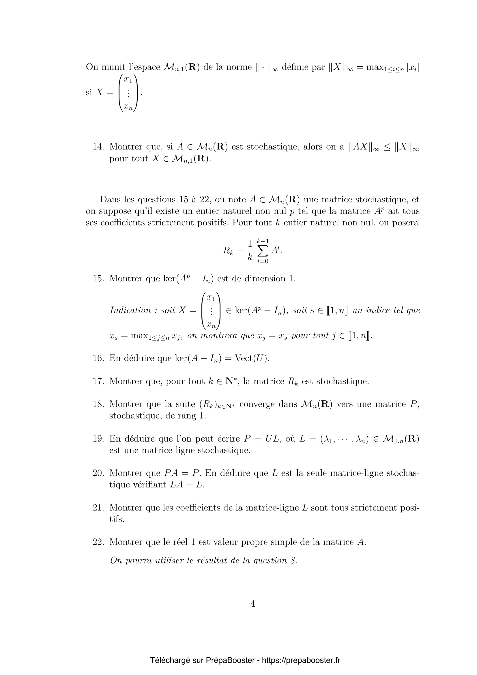 14. Montrer que, si $A \in M_n(\mathbb{R})$ est stochastique, alors on a $\|AX\|_\infty \leq \|X\|_\infty$ pour tout $X \in M_{n,1}(\mathbb{R})$.