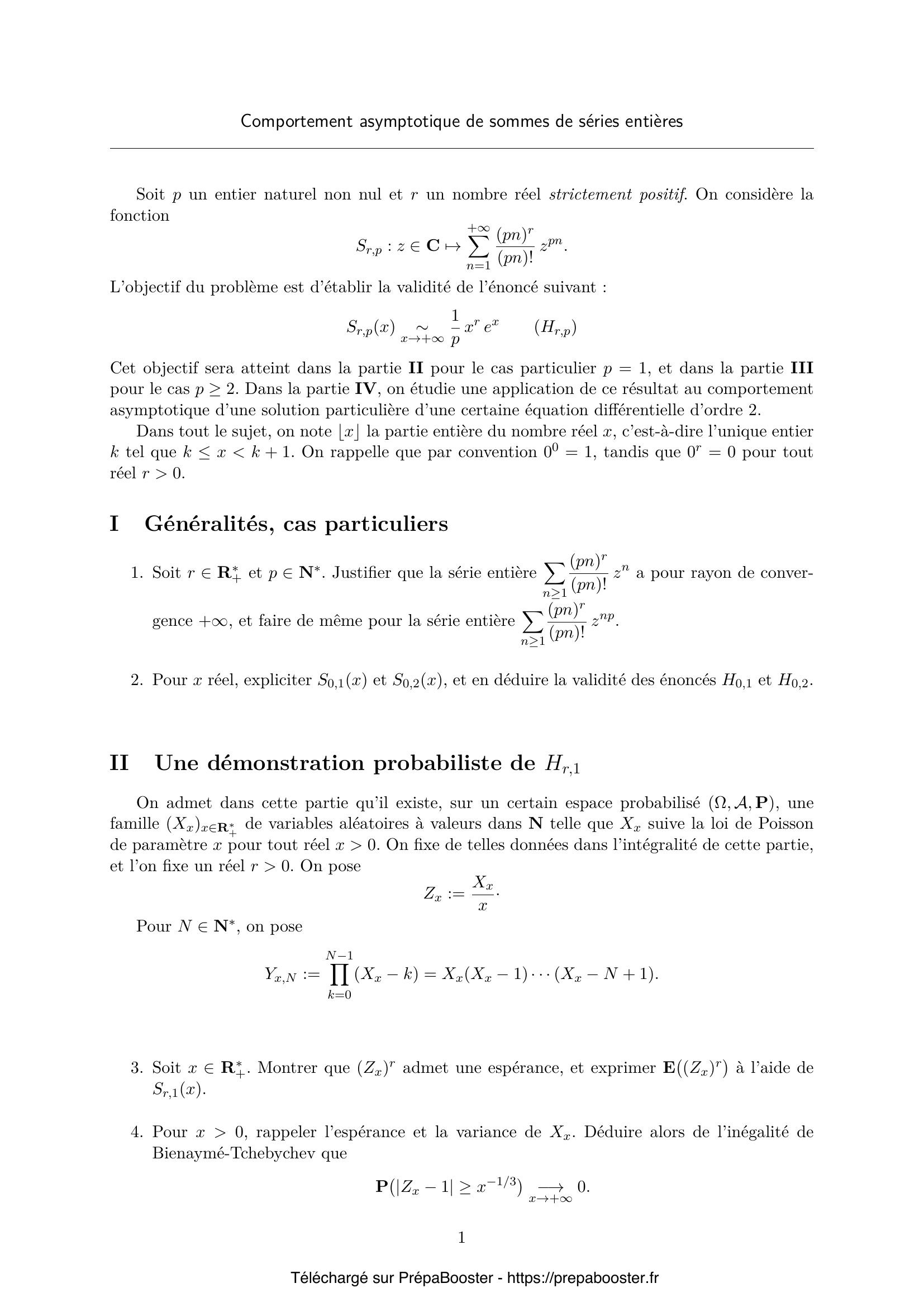 1. Soit $r \in \R^{*}_+$ et $p \in \N^*$. Justifier que la série entière $\sum_{n \geq 1} \frac{(pn)^r}{(pn)!} z^{pn}$ a pour rayon de convergence $+\infty$, et faire de même pour la série entière $\sum_{n\geq 1} \frac{(pn)^r}{(pn)!} z^{np}$.
