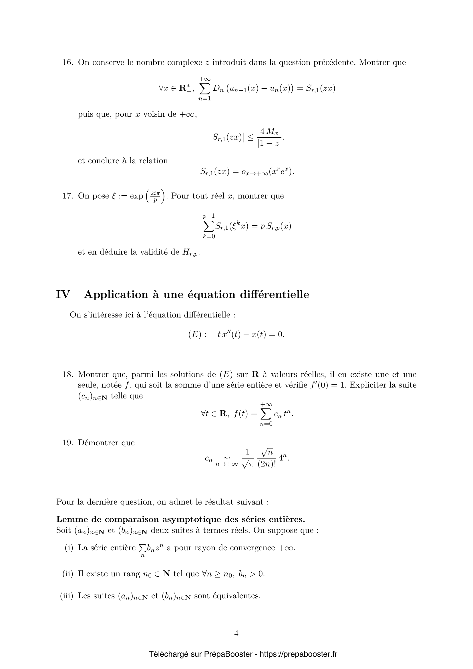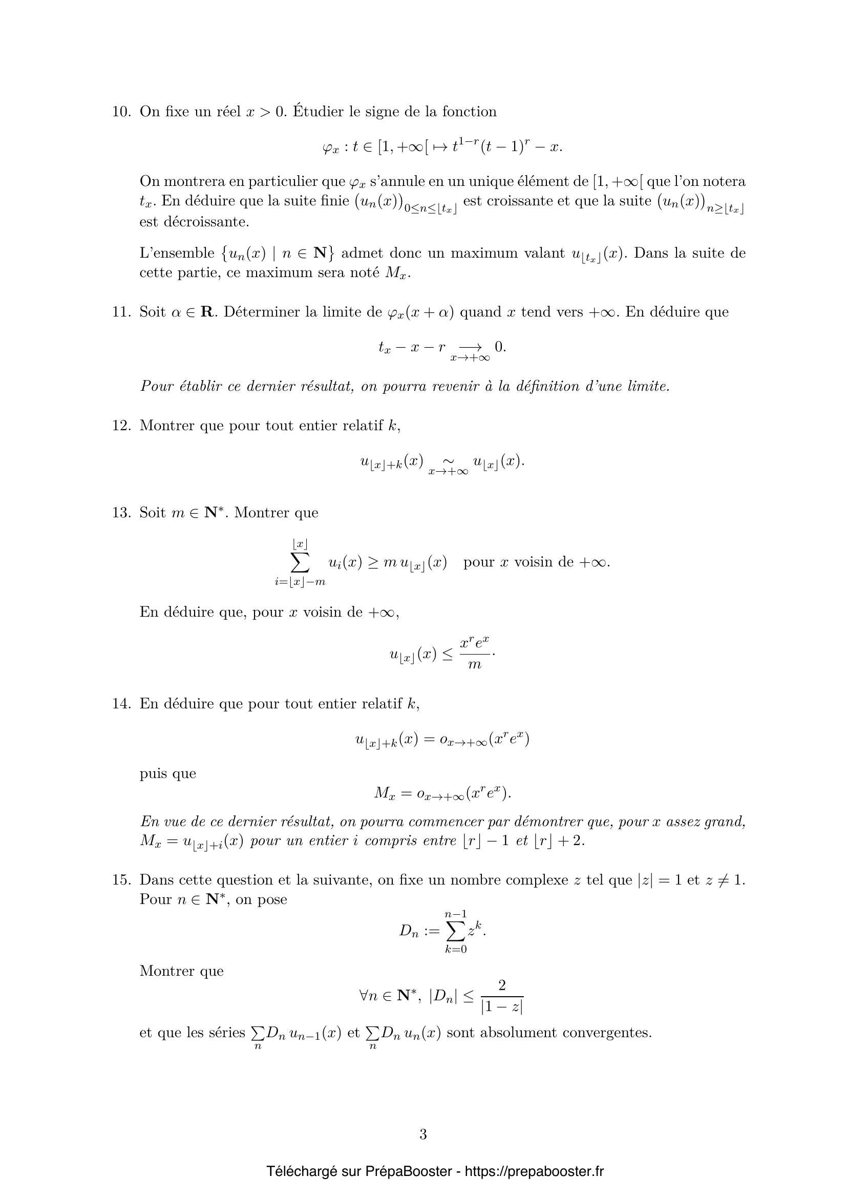 17. On conserve le nombre complexe $z$ introduit dans la question précédente. Montrer que $\forall x\in\R^*_+$, \[ \sum_{n\geq 1} D_n\Big(u_{n-1}(x)-u_n(x)\Big) = S_{r,1}(zx) \] puis que, pour $x$ voisin de $+\infty$, \[ |S_{r,1}(zx)| \leq \frac{4 M_x}{|1-z|}, \] et conclure à la relation $S_{r,1}(zx) = o_{x\to+\infty}(x^re^x)$.
