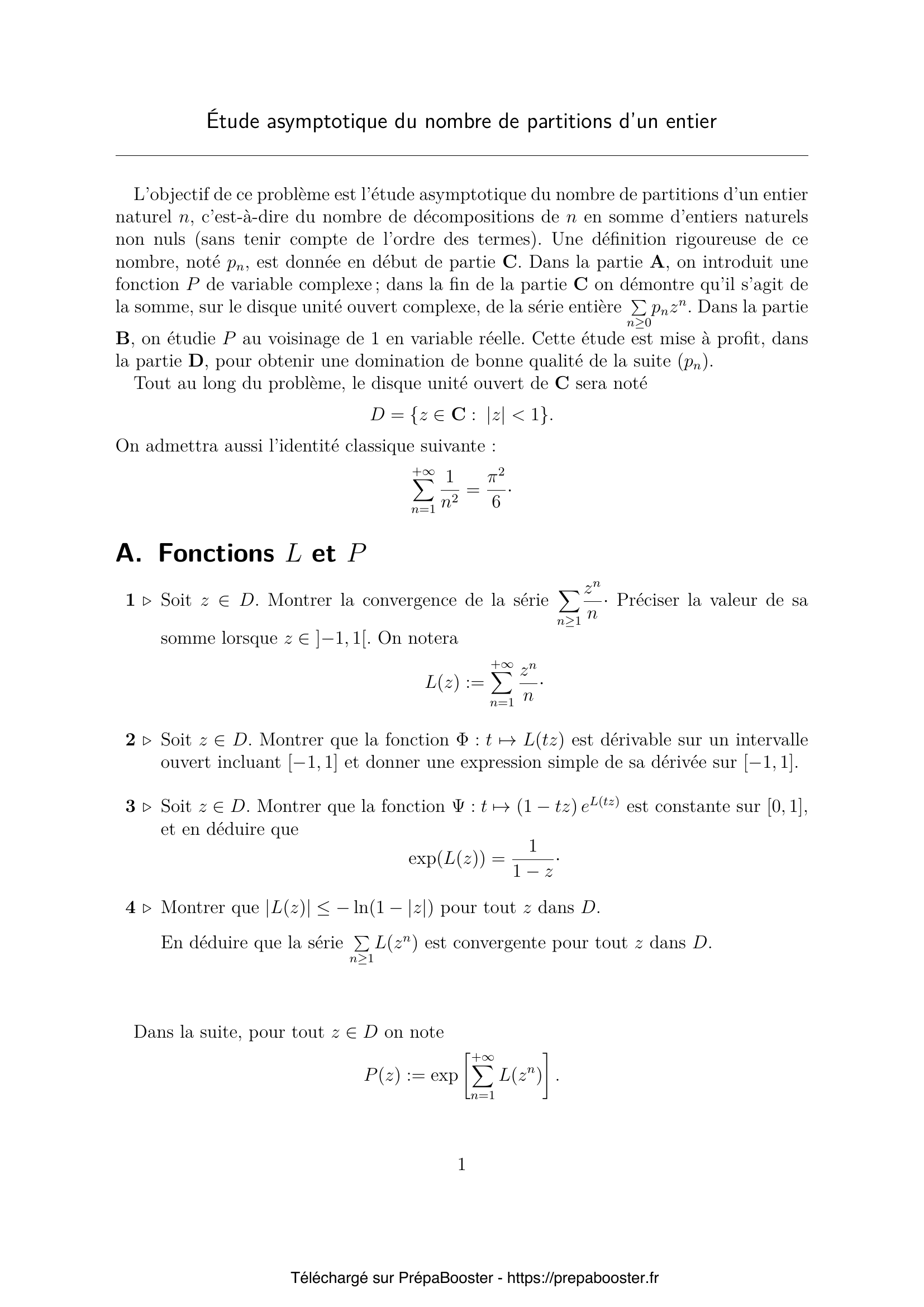 4. Montrer que $|L(z)| \leq -\ln(1 – |z|)$ pour tout $z$ dans $D$. En déduire que la série $\sum\limits_{n \geq 1} L(z^n)$ est convergente pour tout $z$ dans $D$. \\ Dans la suite, pour tout $z \in D$ on note \[ P(z) := \exp\left(\sum_{n=1}^{+\infty} L(z^n)\right). \]