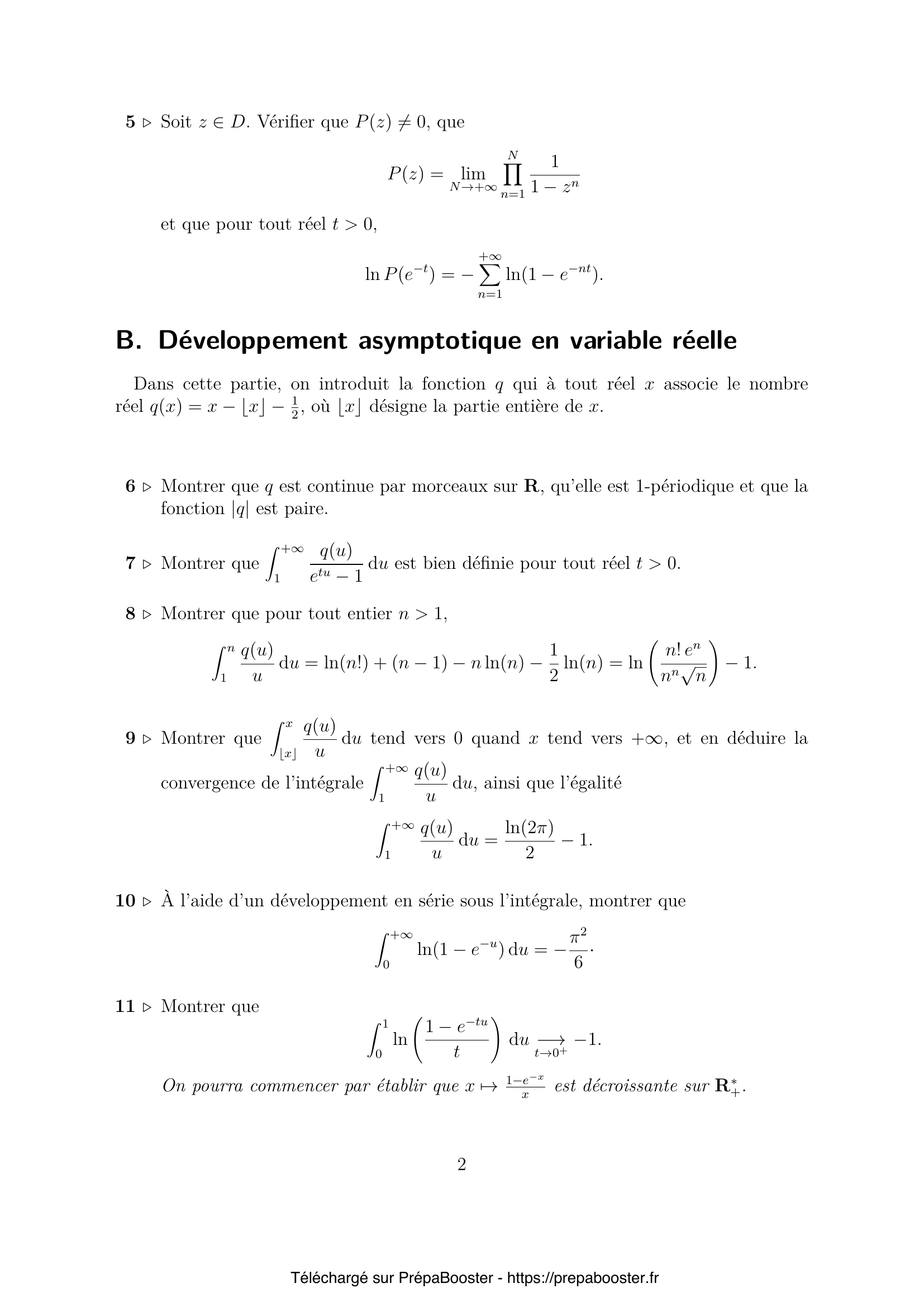 7. Montrer que $\int_{1}^{+\infty} \frac{q(u)}{e^{tu} – 1} du$ est bien définie pour tout réel $t>0$.