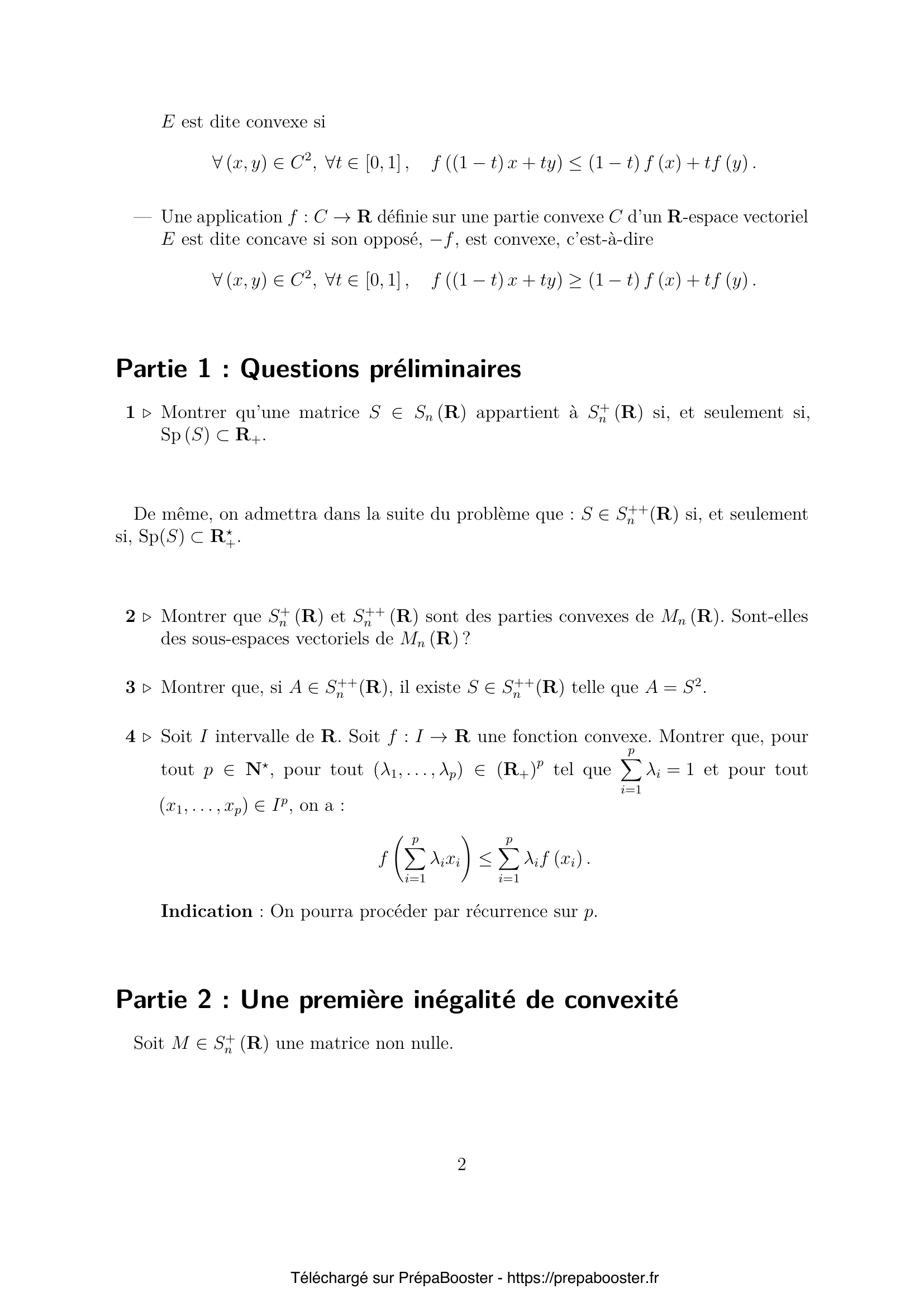 2. Montrer que $\mathcal{S}_n^+(\mathbb{R})$ et $\mathcal{S}_n^{++}(\mathbb{R})$ sont des parties convexes de $\mathcal{M}_n(\mathbb{R})$. Sont-elles des sous-espaces vectoriels de $\mathcal{M}_n(\mathbb{R})$ ?