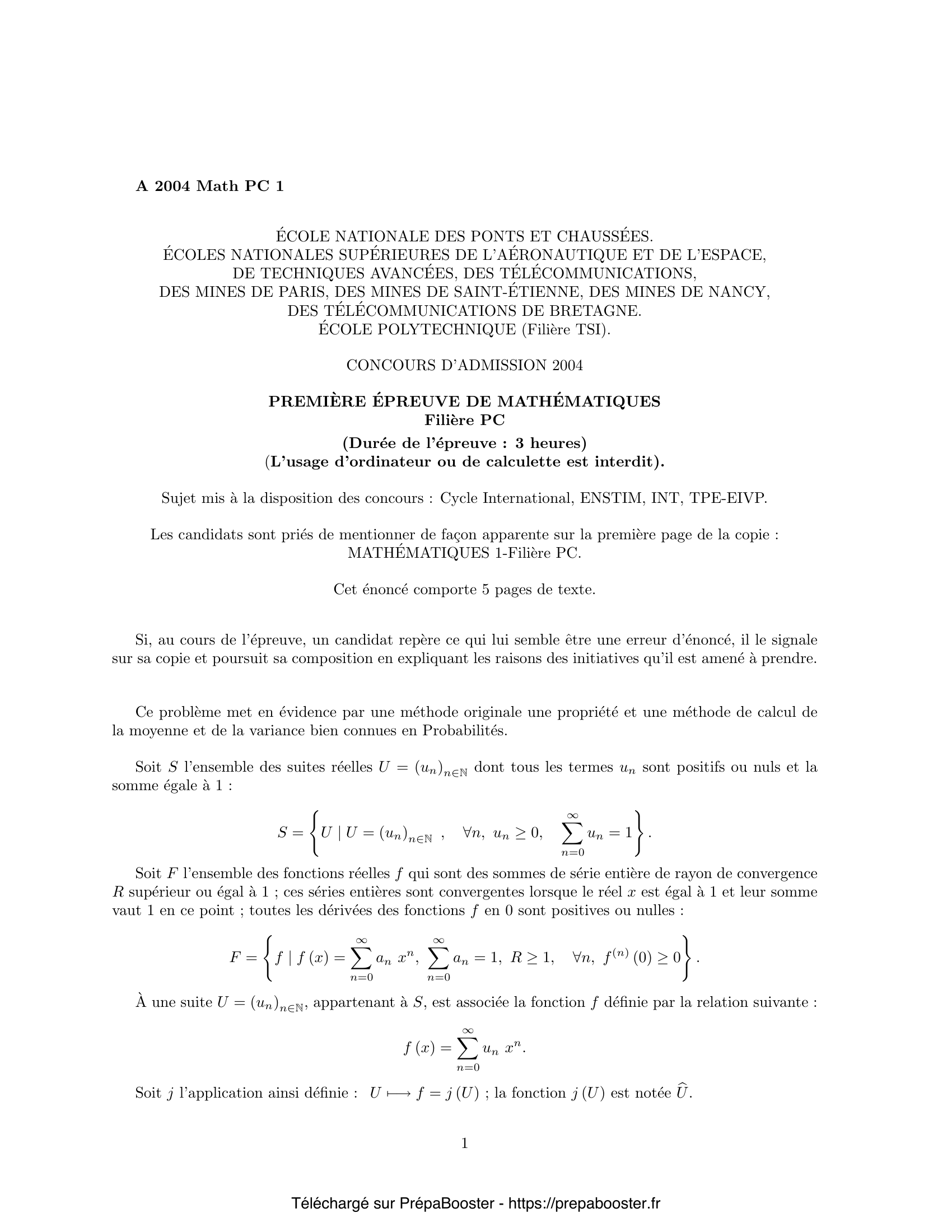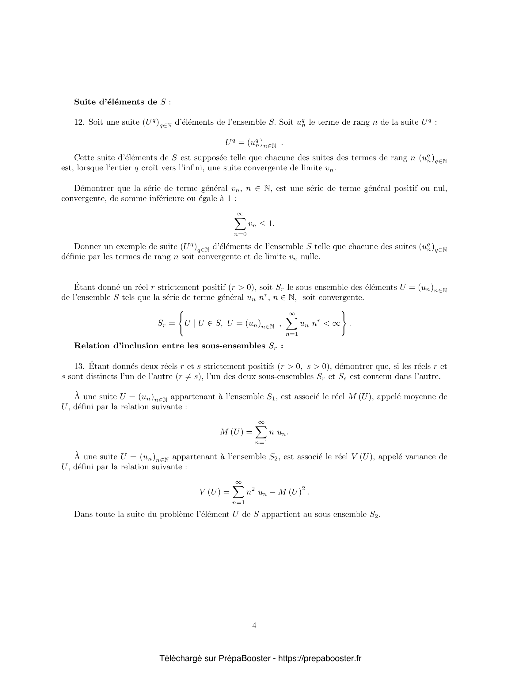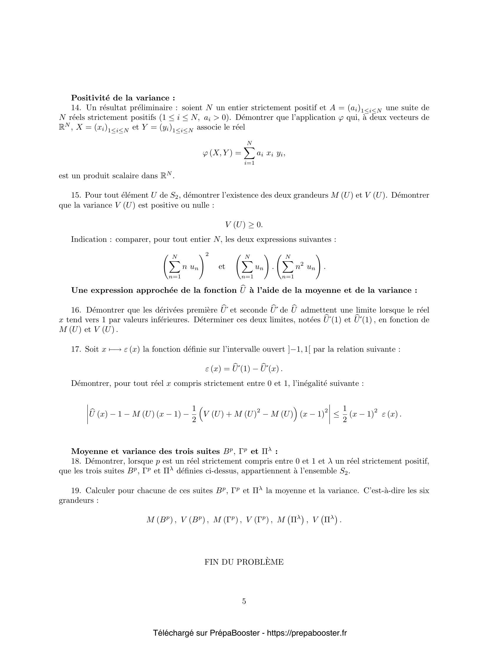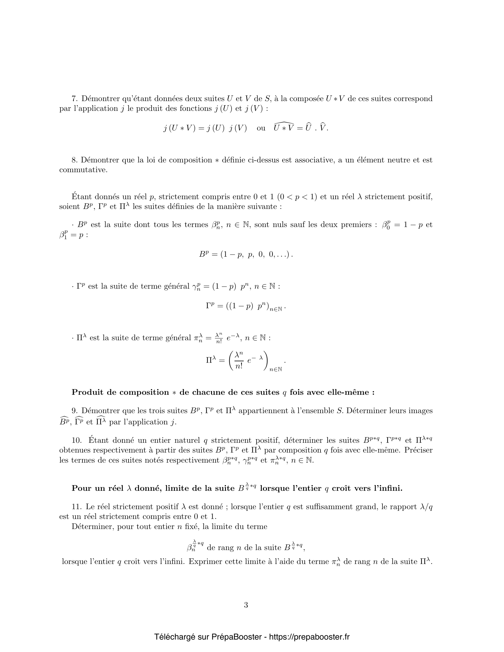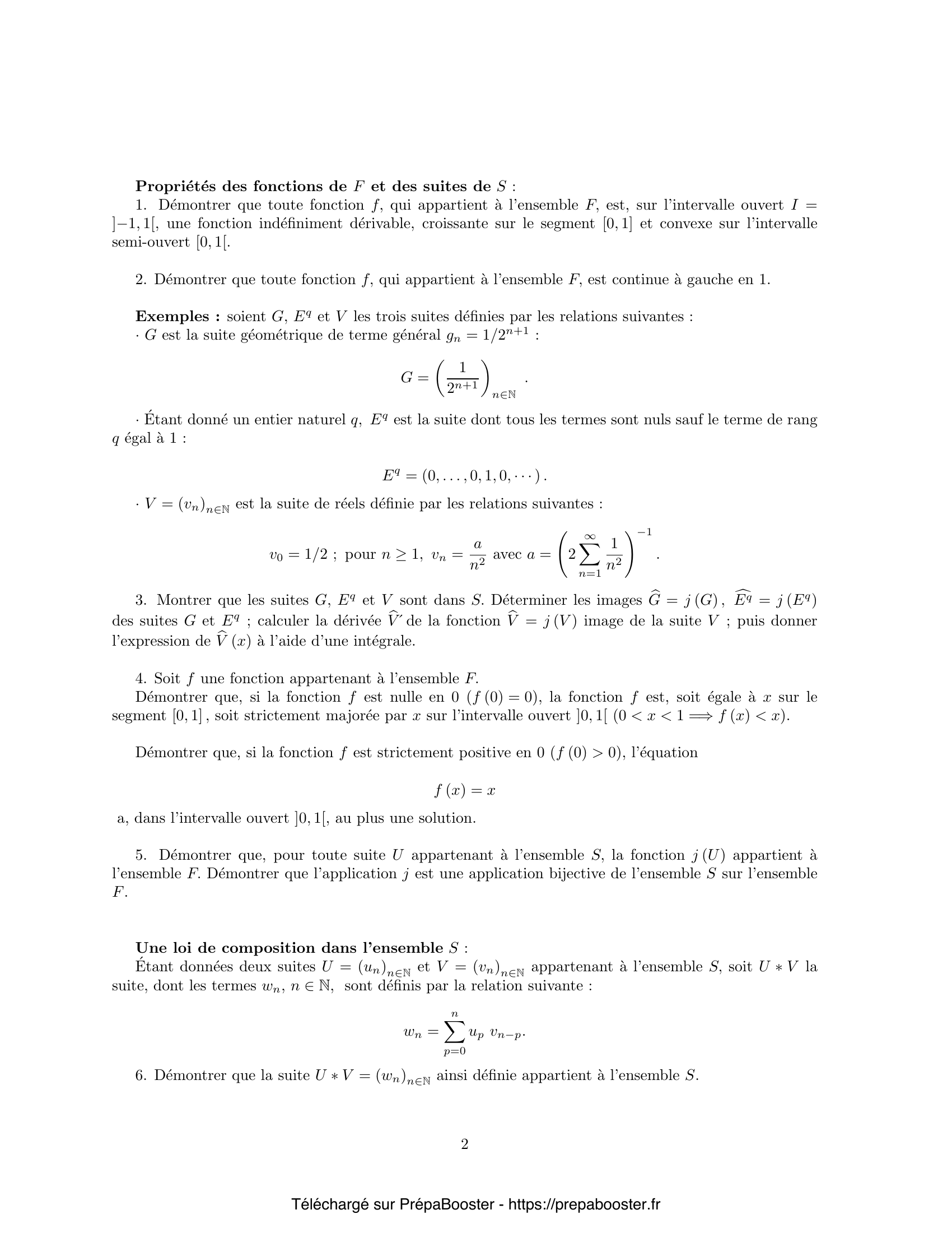 1. Démontrer que toute fonction $f$, qui appartient à l’ensemble $F$, est, sur l’intervalle ouvert $I = ]-1, 1[$, une fonction indéfiniment dérivable, croissante sur le segment $[0, 1]$ et convexe sur l’intervalle semi-ouvert $[0, 1[$. 2. Démontrer que toute fonction $f$, qui appartient à l’ensemble $F$, est continue à gauche en 1. 3. Montrer que les suites $G$, $E_q$ et $V$ sont dans $S$. Déterminer les images $\overline{G} = j(G)$, $\overline{E_q} = j(E_q)$ des suites $G$ et $E_q$ ; calculer la dérivée $\overline{V}’$ de la fonction $\overline{V} = j(V)$ image de la suite $V$ ; puis donner l’expression de $\overline{V}(x)$ à l’aide d’une intégrale. 4. Soit $f$ une fonction appartenant à l’ensemble $F$.\\ Démontrer que, si la fonction $f$ est nulle en 0 ($f(0) = 0$), la fonction $f$ est, soit égale à $x$ sur le segment $[0, 1]$, soit strictement majorée par $x$ sur l’intervalle ouvert $]0, 1[$ ($0 < x < 1 \implies f(x) < x$).\\ Démontrer que, si la fonction $f$ est strictement positive en 0 ($f(0) > 0$), l’équation $f(x) = x$ a, dans l’intervalle ouvert $]0, 1[$, au plus une solution. 5. Démontrer que, pour toute suite $U$ appartenant à l’ensemble $S$, la fonction $j(U)$ appartient à l’ensemble $F$. Démontrer que l’application $j$ est une application bijective de l’ensemble $S$ sur l’ensemble $F$.} 6. Démontrer que la suite $U \ast V = (w_n)_{n \in \mathbb{N}}$ ainsi définie appartient à l’ensemble $S$. 7. Démontrer qu’étant données deux suites $U$ et $V$ de $S$, à la composée $U \ast V$ de ces suites correspond par l’application $j$ le produit des fonctions $j(U)$ et $j(V)$ : $$ j(U \ast V) = j(U) j(V) \qquad \text{ou} \qquad \overline{U \ast V} = \overline{U} \cdot \overline{V} $$ 8. Démontrer que la loi de composition $\ast$ définie ci-dessus est associative, a un élément neutre et est commutative. 9. Démontrer que les trois suites $B_p,\, \Gamma_p$ et $\Pi_\lambda$ appartiennent à l’ensemble $S$. Déterminer leurs images $\overline{B}_p,\, \overline{\Gamma}_p$ et $\overline{\Pi}_\lambda$ par l’application $j$. 10. Étant donné un entier naturel $q$ strictement positif, déterminer les suites $B_p^{\ast q}$, $\Gamma_p^{\ast q}$ et $\Pi_\lambda^{\ast q}$ obtenues respectivement à partir des suites $B_p$, $\Gamma_p$ et $\Pi_\lambda$ par composition $q$ fois avec elle-même. Préciser les termes de ces suites notés respectivement $\beta_{p^{\ast q}, n}$, $\gamma_{p^{\ast q}, n}$ et $\pi_{\lambda^{\ast q}, n}$, $n \in \mathbb{N}$.\\ Pour un réel $\lambda$ donné, limite de la suite $B_{\lambda/q}^{\ast q}$ lorsque l’entier $q$ croît vers l’infini.} 11. Le réel strictement positif $\lambda$ est donné ; lorsque l’entier $q$ est suffisamment grand, le rapport $\lambda/q$ est un réel strictement compris entre $0$ et $1$.\\ Déterminer, pour tout entier $n$ fixé, la limite du terme $\beta_{\lambda/q}^{\ast q, n}$ de rang $n$ de la suite $B_{\lambda/q}^{\ast q}$, lorsque l’entier $q$ croît vers l’infini. Exprimer cette limite à l’aide du terme $\pi_{\lambda, n}$ de rang $n$ de la suite $\Pi_\lambda$. 12. Soit une suite $(U_q)_{q \in \mathbb{N}}$ d’éléments de l’ensemble $S$. Soit $u_{q, n}$ le terme de rang $n$ de la suite $U_q$ : $$ U_q = (u_{q, n})_{n \in \mathbb{N}}. $$ Cette suite d’éléments de $S$ est supposée telle que chacune des suites des termes de rang $n$ $(u_{q, n})_{q \in \mathbb{N}}$ est, lorsque l’entier $q$ croît vers l’infini, une suite convergente de limite $v_n$.\\ Démontrer que la série de terme général $v_n$, $n \in \mathbb{N}$, est une série de terme général positif ou nul, convergente, de somme inférieure ou égale à $1$ : $$ \sum_{n=0}^{\infty} v_n \leq 1. $$ Donner un exemple de suite $(U_q)_{q \in \mathbb{N}}$ d’éléments de l’ensemble $S$ telle que chacune des suites $(u_{q, n})_{q \in \mathbb{N}}$ définie par les termes de rang $n$ soit convergente et de limite $v_n$ nulle. 13. Étant donné un réel $r$ strictement positif $(r > 0)$, soit $S_r$ le sous-ensemble des éléments $U = (u_n)_{n \in \mathbb{N}}$ de l’ensemble $S$ tels que la série de terme général $u_n n^r$, $n \in \mathbb{N}$, soit convergente, $$ S_r = \left\{ U \mid U \in S,\, U = (u_n)_{n \in \mathbb{N}},\, \sum_{n=1}^\infty u_n n^r < \infty \right\}. $$ 14. Étant donnés deux réels $r$ et $s$ strictement positifs $(r > 0,\, s > 0)$, démontrer que, si les réels $r$ et $s$ sont distincts l’un de l’autre $(r \neq s)$, l’un des deux sous-ensembles $S_r$ et $S_s$ est contenu dans l’autre.\\ À une suite $U = (u_n)_{n \in \mathbb{N}}$ appartenant à l’ensemble $S_1$, est associé le réel $M(U)$, appelé moyenne de $U$, défini par la relation suivante : $$ M(U) = \sum_{n=1}^{\infty} n u_n. $$ À une suite $U = (u_n)_{n \in \mathbb{N}}$ appartenant à l’ensemble $S_2$, est associé le réel $V(U)$, appelé variance de $U$, défini par la relation suivante : $$ V(U) = \sum_{n=1}^{\infty} n^2 u_n – M(U)^2. $$ Dans toute la suite du problème l’élément $U$ de $S$ appartient au sous-ensemble $S_2$. 15. Un résultat préliminaire : soient $N$ un entier strictement positif et $A = (a_i)_{1 \leq i \leq N}$ une suite de $N$ réels strictement positifs ($1 \leq i \leq N$, $a_i > 0$). Démontrer que l’application $\varphi$ qui, à deux vecteurs de $\mathbb{R}^N$, $X = (x_i)_{1 \leq i \leq N}$ et $Y = (y_i)_{1 \leq i \leq N}$ associe le réel $$ \varphi(X, Y) = \sum_{i=1}^N a_i x_i y_i, $$ est un produit scalaire dans $\mathbb{R}^N$.} 16. Pour tout élément $U$ de $S_2$, démontrer l’existence des deux grandeurs $M(U)$ et $V(U)$. Démontrer que la variance $V(U)$ est positive ou nulle : $$ V(U) \geq 0. $$ \emph{Indication : comparer, pour tout entier $N$, les deux expressions suivantes : $$ \left(\sum_{n=1}^N n u_n\right)^2 \quad\text{et}\quad \sum_{n=1}^N u_n \cdot \sum_{n=1}^N n^2 u_n. $$} 17. Démontrer que les dérivées première $\overline{U}’$