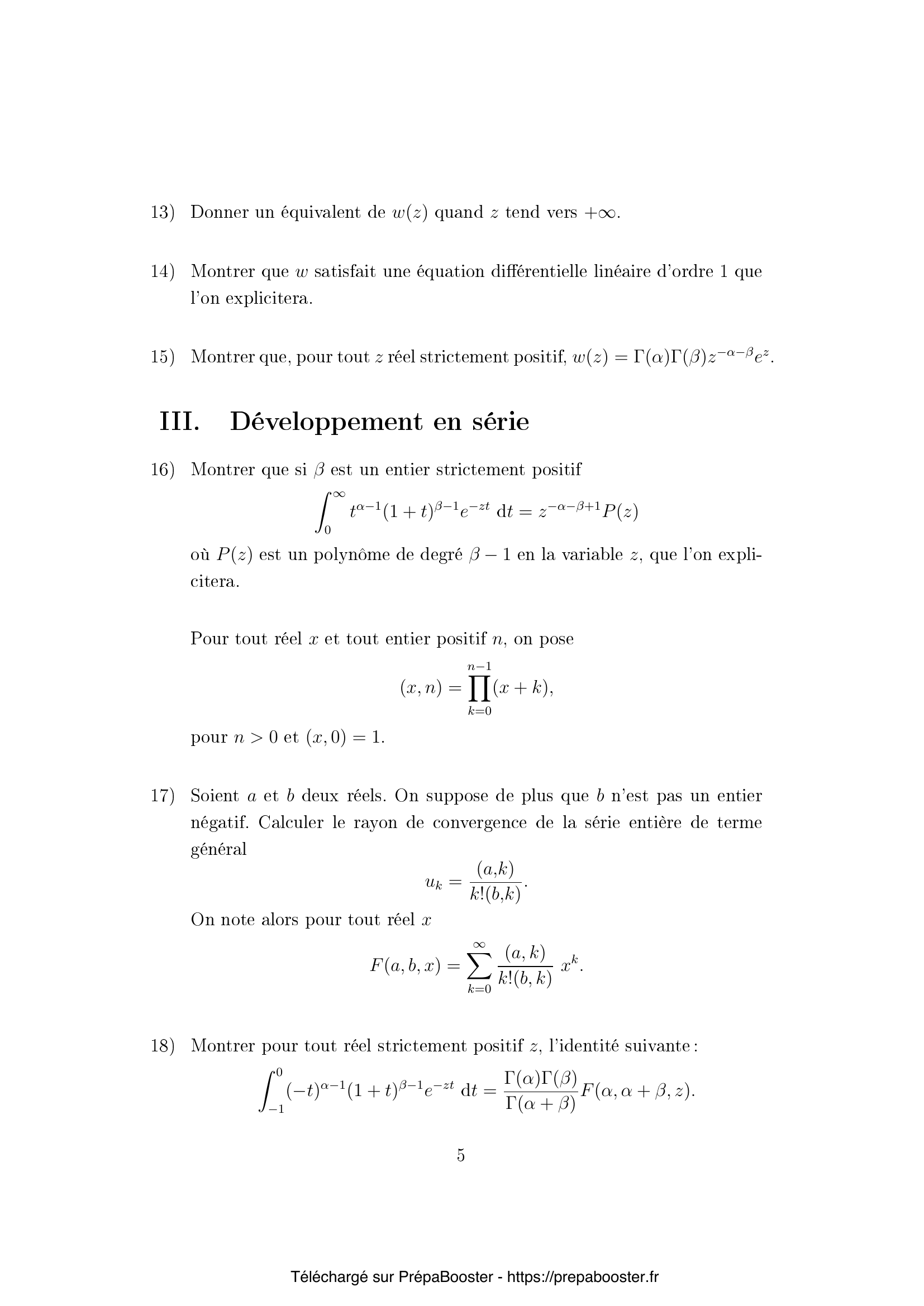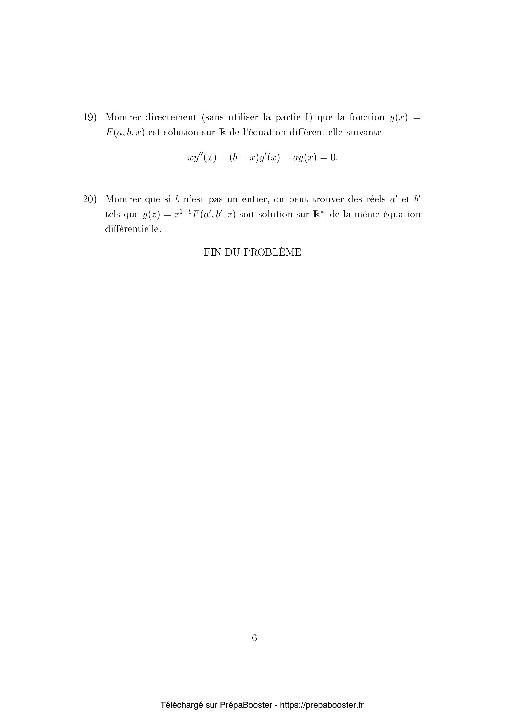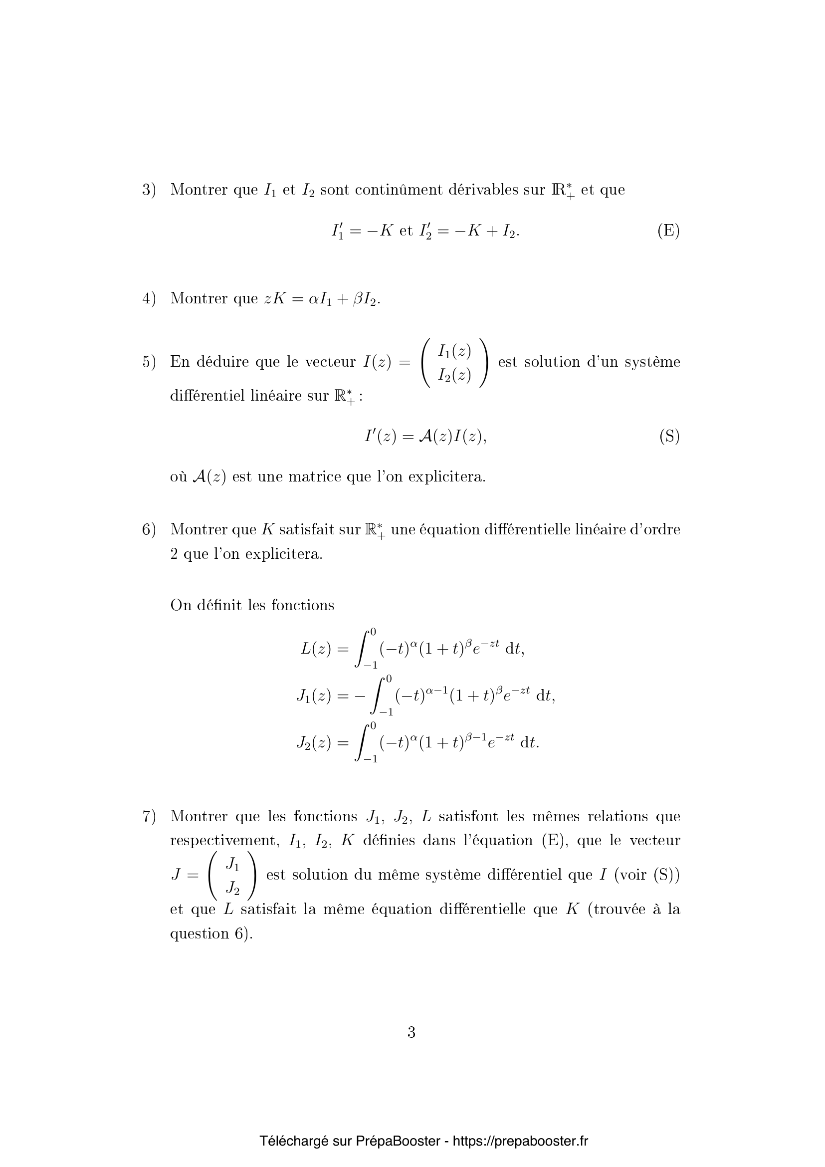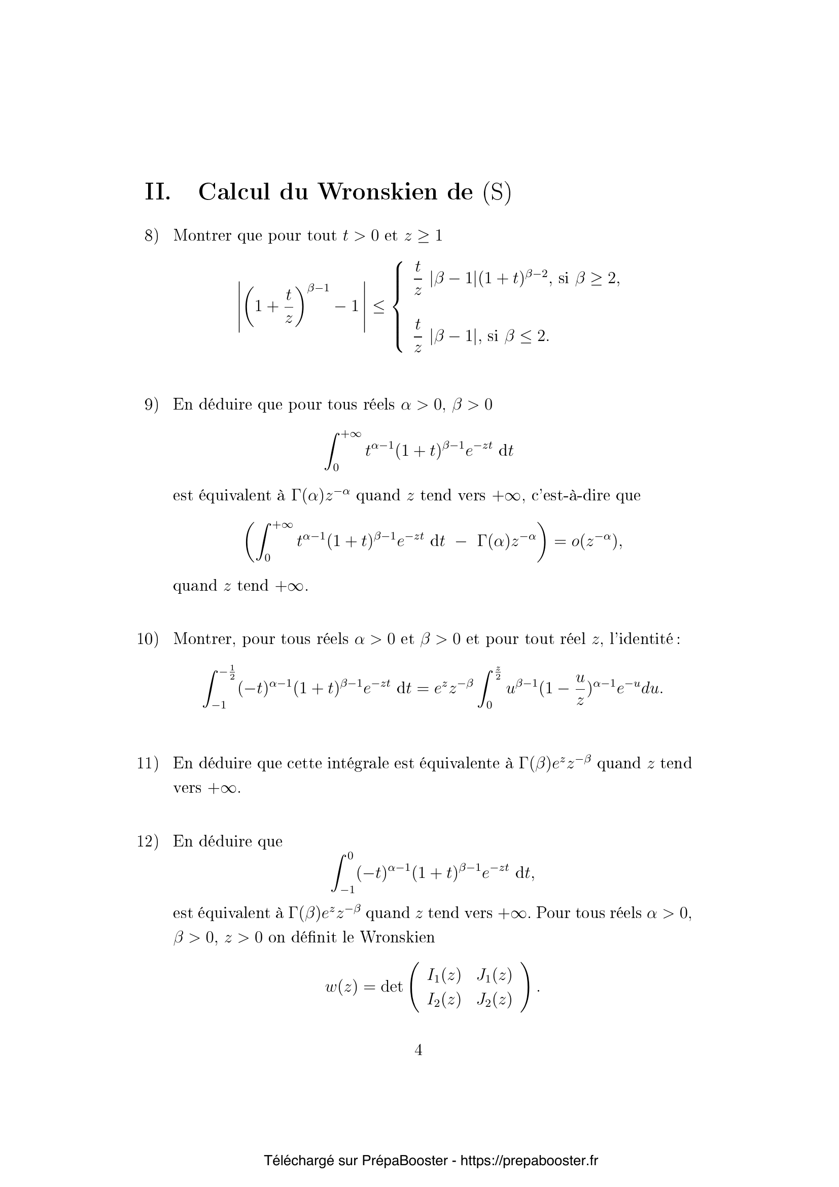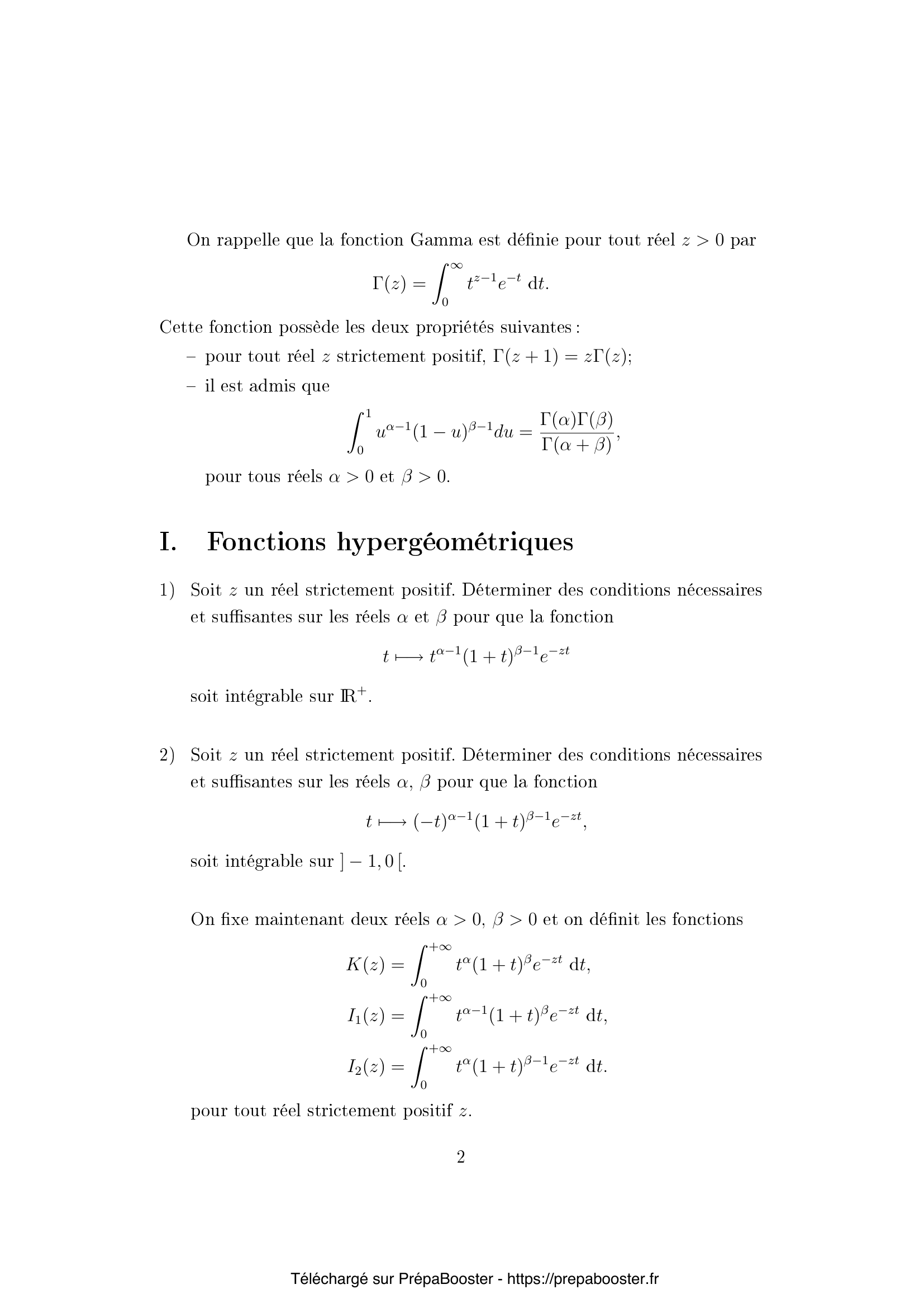 1. Soit $z$ un réel strictement positif. Déterminer des conditions nécessaires et suffisantes sur les réels $\alpha$ et $\beta$ pour que la fonction $$ t \mapsto t^{\alpha-1}(1+t)^{\beta-1}e^{-zt} $$ soit intégrable sur $\mathbb{R}_+$.} 2. Soit $z$ un réel strictement positif. Déterminer des conditions nécessaires et suffisantes sur les réels $\alpha$, $\beta$ pour que la fonction $$ t \mapsto (-t)^{\alpha-1}(1+t)^{\beta-1}e^{-zt}, $$ soit intégrable sur $]-1, 0[$.} 3. Montrer que $I_1$ et $I_2$ sont continûment dérivables sur $\mathbb{R}_+^*$ et que $$ I_1′ = -K \quad \text{et} \quad I_2′ = -K + I_2. \quad \text{(E)} $$} 4. Montrer que $zK = \alpha I_1 + \beta I_2$.} 5. En déduire que le vecteur $I(z) = \begin{pmatrix} I_1(z) \\ I_2(z) \end{pmatrix}$ est solution d’un système différentiel linéaire sur $\mathbb{R}_+^* :$ $$ I'(z) = A(z)I(z),\quad (S) $$ où $A(z)$ est une matrice que l’on explicitera.} 6. Montrer que $K$ satisfait sur $\mathbb{R}_+^*$ une équation différentielle linéaire d’ordre 2 que l’on explicitera.} 7. Montrer que les fonctions $J_1$, $J_2$, $L$ satisfont les mêmes relations que respectivement, $I_1$, $I_2$, $K$ définies dans l’équation (E), que le vecteur $$ J = \begin{pmatrix} J_1 \\ J_2 \end{pmatrix} $$ est solution du même système différentiel que $I$ (voir (S)), et que $L$ satisfait la même équation différentielle que $K$ (trouvée à la question 6).} 8. Montrer que pour tout $t > 0$ et $z \geq 1$ $$ \left| (1+\frac{t}{z})^{\beta-1} – 1 \right| \le \begin{cases} \frac{t}{z} |\beta-1| (1+t)^{\beta-2}, & \text{si } \beta \geq 2, \\ \frac{t}{z} |\beta-1|, & \text{si } \beta \leq 2. \end{cases} $$} 9. En déduire que pour tous réels $\alpha>0$, $\beta>0$ $$ \int_{0}^{+\infty} t^{\alpha-1}(1+t)^{\beta-1} e^{-zt} dt $$ est équivalent à $\Gamma(\alpha)z^{-\alpha}$ quand $z$ tend vers $+\infty$, c’est-à-dire que $$ \left( \int_{0}^{+\infty} t^{\alpha-1}(1+t)^{\beta-1} e^{-zt} dt – \Gamma(\alpha)z^{-\alpha} \right) = o(z^{-\alpha}), $$ quand $z$ tend vers $+\infty$.} 10. Montrer, pour tous réels $\alpha>0$ et $\beta>0$ et pour tout réel $z$, l’identité : $$ \int_{-1}^{-1/2} (-t)^{\alpha-1}(1+t)^{\beta-1}e^{-zt}dt = e^z z^{-\beta} \int_0^{z/2} u^{\beta-1}\left(1-\frac{u}{z}\right)^{\alpha-1}e^{-u}du. $$} 11. En déduire que cette intégrale est équivalente à $\Gamma(\beta) e^z z^{-\beta}$ quand $z$ tend vers $+\infty$.} 12. En déduire que $$ \int_{-1}^{0} (-t)^{\alpha-1}(1+t)^{\beta-1} e^{-zt} dt $$ est équivalent à $\Gamma(\beta) e^z z^{-\beta}$ quand $z$ tend vers $+\infty$. Pour tous réels $\alpha > 0$, $\beta > 0$, $z > 0$ on définit le Wronskien $$ w(z) = \det \begin{pmatrix} I_1(z) & J_1(z) \\ I_2(z) & J_2(z) \end{pmatrix}. $$} 13. Donner un équivalent de $w(z)$ quand $z$ tend vers $+\infty$.} 14. Montrer que $w$ satisfait une équation différentielle linéaire d’ordre 1 que l’on explicitera.} 15. Montrer que, pour tout $z$ réel strictement positif, $w(z) = \Gamma(\alpha)\Gamma(\beta)z^{-\alpha-\beta}e^z$.} 16. Montrer que si $\beta$ est un entier strictement positif $$ \int_0^{+\infty} t^{\alpha-1}(1+t)^{\beta-1} e^{-zt}dt = z^{-\alpha-\beta+1}P(z) $$ où $P(z)$ est un polynôme de degré $\beta-1$ en la variable $z$, que l’on explicitera. Pour tout réel $x$ et tout entier positif $n$, on pose $$ (x, n) = \prod_{k=0}^{n-1}(x+k) $$ pour $n>0$ et $(x, 0) = 1$.} 17. Soient $a$ et $b$ deux réels. On suppose de plus que $b$ n’est pas un entier négatif. Calculer le rayon de convergence de la série entière de terme général $$ u_k = \frac{(a, k)}{k!(b, k)}. $$ On note alors pour tout réel $x$ $$ F(a, b, x) = \sum_{k=0}^{+\infty} \frac{(a, k)}{k!(b, k)} x^k. $$} 18. Montrer pour tout réel strictement positif $z$, l’identité suivante : $$ \int_{-1}^{0} (-t)^{\alpha-1}(1+t)^{\beta-1}e^{-zt}dt = \frac{\Gamma(\alpha)\Gamma(\beta)}{\Gamma(\alpha+\beta)}F(\alpha, \alpha+\beta, z). $$} 19. Montrer directement (sans utiliser la partie I) que la fonction $y(x) = F(a, b, x)$ est solution sur $\mathbb{R}$ de l’équation différentielle suivante $$ xy”(x) + (b-x) y'(x) – a y(x) = 0. $$} 20. Montrer que si $b$ n’est pas un entier, on peut trouver des réels $a_0$ et $b_0$ tels que $y(z) = z^{1-b} F(a_0, b_0, z)$ soit solution sur $\mathbb{R}_+^*$ de la même équation différentielle.}FAQ