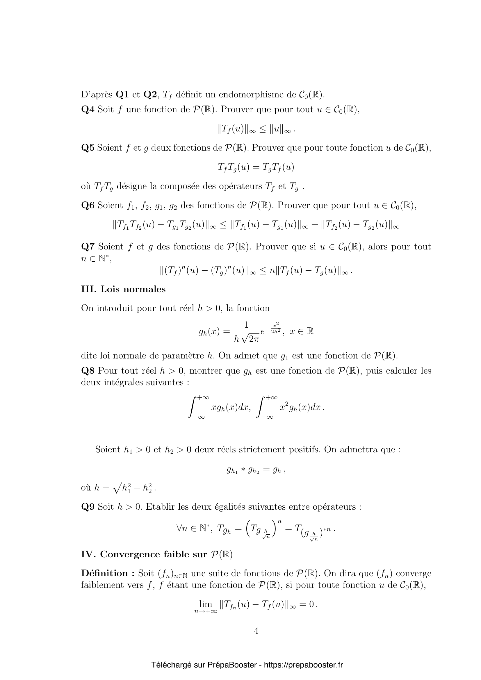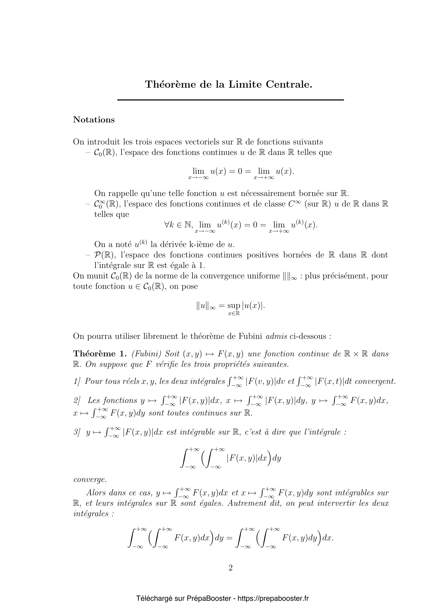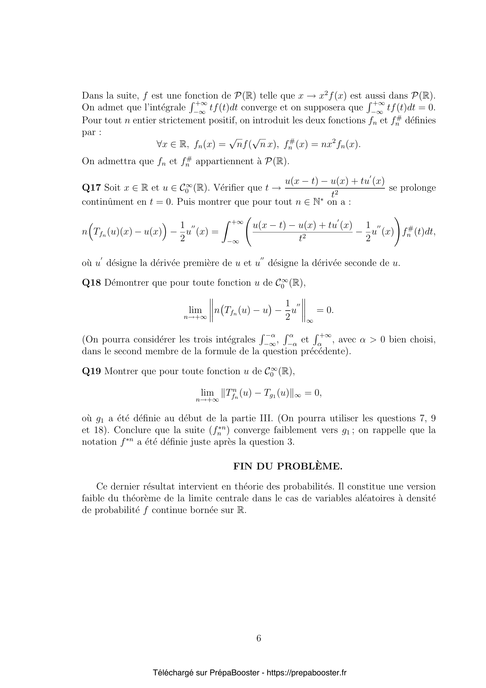 1. Q1 Soient $f \in P(\mathbb{R})$ et $g \in C_0(\mathbb{R})$. Montrer que l’intégrale $\int_{-\infty}^{+\infty} f(t)g(x-t)dt$ converge pour tout réel $x$. Puis montrer que $f * g$ définit une fonction continue sur $\mathbb{R}$. (On pourra utiliser le théorème de continuité sous le signe $\int$ et on vérifiera avec soin que les conditions de validité sont remplies). Vérifier de plus que \[ \forall x \in \mathbb{R},\quad f * g(x) = g * f(x). \]} 2. Q2 Montrer que $\lim_{x \to +\infty} f * g(x) = 0$. (On considérera une suite réelle quelconque $(x_n)_{n \in \mathbb{N}}$ tendant vers $+\infty$. On vérifiera avec soin qu’on peut appliquer le théorème de convergence dominée pour étudier $\lim_{n \to +\infty} f * g(x_n)$). Montrer de même que \[ \lim_{x \to -\infty} f * g(x) = 0. \] } 3. Q3 Soient $f$ et $g$ appartenant à $P(\mathbb{R})$. Montrer alors que $f * g$ définit une fonction de $P(\mathbb{R})$. Plus précisément, montrer que $f * g$ définit une fonction continue sur $\mathbb{R}$, bornée, positive et d’intégrale égale à $1$. (On appliquera le théorème de Fubini à la fonction $(x, y) \mapsto f(y)g(x-y)$ et on pourra se contenter de ne vérifier que les conditions 1] et 3]).} 4. Q4 Soit $f$ une fonction de $P(\mathbb{R})$. Prouver que pour tout $u \in C_0(\mathbb{R})$, \[ \|T_f(u)\|_{\infty} \leq \|u\|_{\infty}. \]} 5. Q5 Soient $f$ et $g$ deux fonctions de $P(\mathbb{R})$. Prouver que pour toute fonction $u$ de $C_0(\mathbb{R})$, \[ T_f T_g(u) = T_g T_f(u) \] où $T_f T_g$ désigne la composée des opérateurs $T_f$ et $T_g$.} 6. Q6 Soient $f_1, f_2, g_1, g_2$ des fonctions de $P(\mathbb{R})$. Prouver que pour tout $u \in C_0(\mathbb{R})$, \[ \|T_{f_1} T_{f_2}(u) – T_{g_1} T_{g_2}(u)\|_{\infty} \leq \|T_{f_1}(u) – T_{g_1}(u)\|_{\infty} + \|T_{f_2}(u) – T_{g_2}(u)\|_{\infty} \] } 7. Q7 Soient $f$ et $g$ des fonctions de $P(\mathbb{R})$. Prouver que si $u \in C_0(\mathbb{R})$, alors pour tout $n \in \mathbb{N}^*$, \[ \|(T_f)^n(u) – (T_g)^n(u)\|_{\infty} \leq n\|T_f(u) – T_g(u)\|_{\infty}. \] } 8. Q8 Pour tout réel $h > 0$, montrer que $g_h$ est une fonction de $P(\mathbb{R})$, puis calculer les deux intégrales suivantes : \[ \int_{-\infty}^{+\infty} x g_h(x)dx,\quad \int_{-\infty}^{+\infty} x^2 g_h(x)dx. \] } 9. Q9 Soit $h>0$. Établir les deux égalités suivantes entre opérateurs : \[ \forall n \in \mathbb{N}^*,\quad T_{g_h} = \left( T_{g_{\sqrt{h/n}}} \right)^{n} = T_{(g_{\sqrt{h/n}})^{*n}}. \] } 10. Q10 Soit $h$ strictement positif fixé et $k \in \mathbb{N}$. Démontrer qu’il existe un polynôme $P_{k,h}$ dont on précisera le degré tel que : \[ \forall x \in \mathbb{R},\ \frac{d^k}{dx^k} g_h(x) = P_{k,h}(x) e^{-\frac{x^2}{2h^2}}. \] } 11. Q11 Soient $h, a \in \mathbb{R}_{+}^*$ et $k$ un entier positif ou nul. Prouver qu’il existe une fonction $\varphi_k : \mathbb{R} \to [0, +\infty[$ continue par morceaux et intégrable sur $\mathbb{R}$ telle que : \[ \forall x \in [-a,a],\ \forall t \in \mathbb{R},\ |P_{k,h}(x-t) e^{-\frac{(x-t)^2}{2h^2}}| \leq \varphi_k(t). \] La fonction $\varphi_k$ ne dépend que de $h, a$ et $k$. (On pourra majorer $|P_{k,h}(x-t) e^{- \frac{(x-t)^2}{4h^2}}|$ indépendamment de $(x-t)$. Ensuite, on pourra majorer convenablement $e^{-\frac{(x-t)^2}{4h^2}}$ pour $|t|\geq2a$ et $x\in[-a,a]$). } 12. Q12 Soient $h$ strictement positif fixé et $u \in C_0(\mathbb{R})$. Démontrer que $T_{g_h}(u)$ est une fonction de classe $C^1$ sur $\mathbb{R}$. Puis montrer que $T_{g_h}(u)$ est de classe $C^{\infty}$ sur $\mathbb{R}$.} 13. Q13 Pour $h$ strictement positif fixé et $u \in C_0(\mathbb{R})$, démontrer que $T_{g_h}(u)$ est une fonction de $C_0^{\infty}(\mathbb{R})$.} 14. Q14 Soit $\alpha$ un réel strictement positif. Déterminer \[ \lim_{h \to 0^+} \int_{-\infty}^{-\alpha} g_h(t)dt\quad \text{et} \quad \lim_{h \to 0^+} \int_{\alpha}^{+\infty} g_h(t)dt. \] } 15. Q15 Soit $u \in C_0(\mathbb{R})$. Prouver que \[ \lim_{h \to 0^+} \|T_{g_h}(u) – u\|_{\infty} = 0. \] Pour cela on utilisera la question précédente ainsi que le résultat admis suivant, valable pour tout $u\in C_0(\mathbb{R})$ : \[ \forall \varepsilon > 0,\ \exists \alpha > 0, \forall x, y \in \mathbb{R},\ |x-y|\leq \alpha \Rightarrow |u(x) – u(y)| \leq \varepsilon. \] } 16. Q16 Soit $(f_n)_{n\in \mathbb{N}}$ une suite de fonctions de $P(\mathbb{R})$ et $f$ une fonction de $P(\mathbb{R})$. On suppose que pour toute fonction $u$ de $C_0^{\infty}(\mathbb{R})$, \[ \lim_{n \to +\infty} \|T_{f_n}(u) – T_f(u)\|_{\infty} = 0. \] Prouver alors que $(f_n)$ converge faiblement vers $f$. (On pourra utiliser les questions 4 et 15). } 17. Q17 Soit $x \in \mathbb{R}$ et $u \in C_0^{\infty}(\mathbb{R})$. Vérifier que $t \mapsto \frac{u(x-t) – u(x) + t u'(x)}{t^2}$ se prolonge continûment en $t = 0$. Puis montrer que pour tout $n \in \mathbb{N}^*$ on a : \[ n\left[ T_{f_n}(u)(x) – u(x) \right] – \frac{1}{2}u”(x) = \int_{-\infty}^{+\infty} \left(\frac{u(x-t) – u(x) + t u'(x)}{t^2} – \frac{1}{2}u”(x)\right) f_n^\#(t)dt, \] où $u’$ désigne la dérivée première de $u$ et $u”$ désigne la dérivée seconde de $u$. } 18. Q18 Démontrer que pour toute fonction $u$ de $C_0^{\infty}(\mathbb{R})$, \[ \lim_{n \to +\infty} \left\| n\left(T_{f_n}(u) – u\right) – \frac{1}{2}u” \right\|_{\infty} = 0. \] (On pourra considérer les trois intégrales $\int_{-\infty}^{-\alpha}$, $\int_{-\alpha}^{\alpha}$ et $\int_{\alpha}^{+\infty}$, avec $\alpha > 0$ bien choisi, dans le second membre de la formule de la question précédente). } 19. Q19 Montrer que pour toute fonction $u$ de $C_0^{\infty}(\mathbb{R})$, \[ \lim_{n\to+\infty} \| T_{f_n}^{n}(u) – T_{g_1}(u)\|_{\infty} = 0, \] où $g_1$ a été définie au début de la partie III. Conclure que la suite $(f_n^{*n})$ converge faiblement vers $g_1$ ; on rappelle que la notation $f^{*n}$ a été définie juste après la question 3. }FAQ