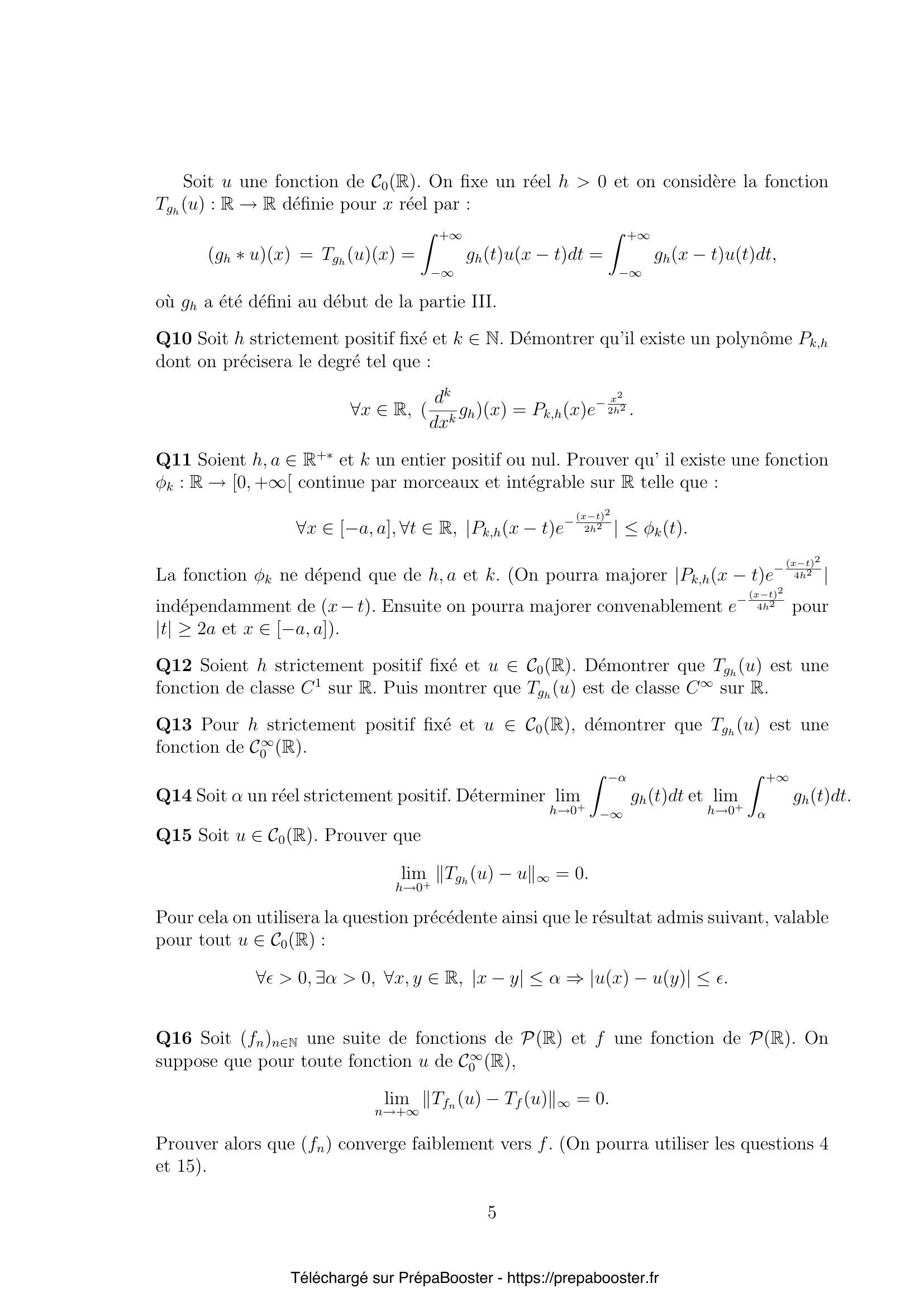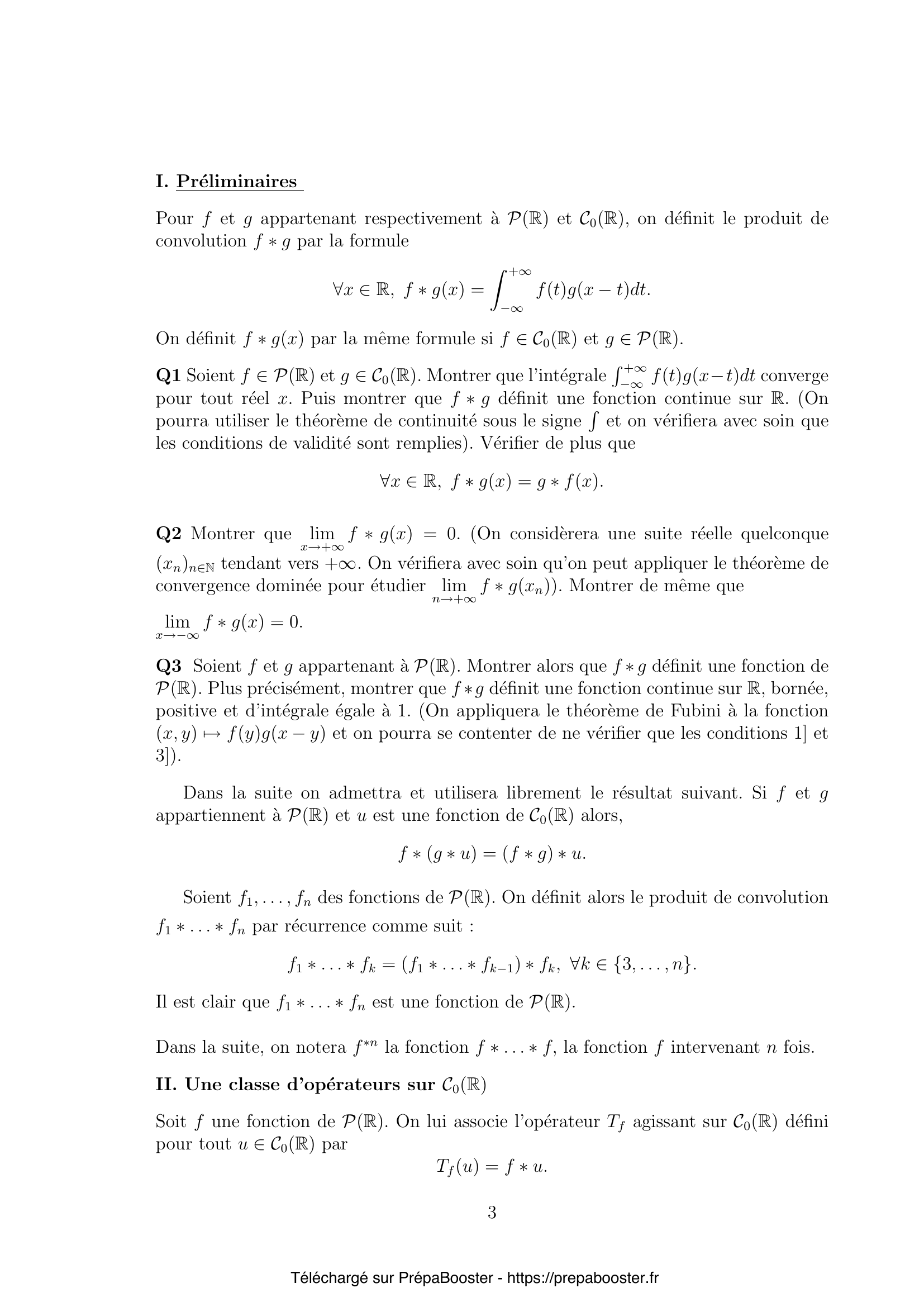 Dans ce sujet, \( P(\mathbb{R}) \) désigne l’ensemble des fonctions dites “probabilités” sur \( \mathbb{R} \), c’est-à-dire toutes les fonctions mesurables, positives, intégrables, et dont l’intégrale sur \( \mathbb{R} \) vaut 1. C’est une classe de fonctions essentielle pour comprendre la convolution, les opérateurs linéaires associés, ou encore l’étude des approximations en analyse. Maîtriser ces notions est stratégique pour réussir ce type de sujet aux écrits du concours Mines-Ponts en PSI.