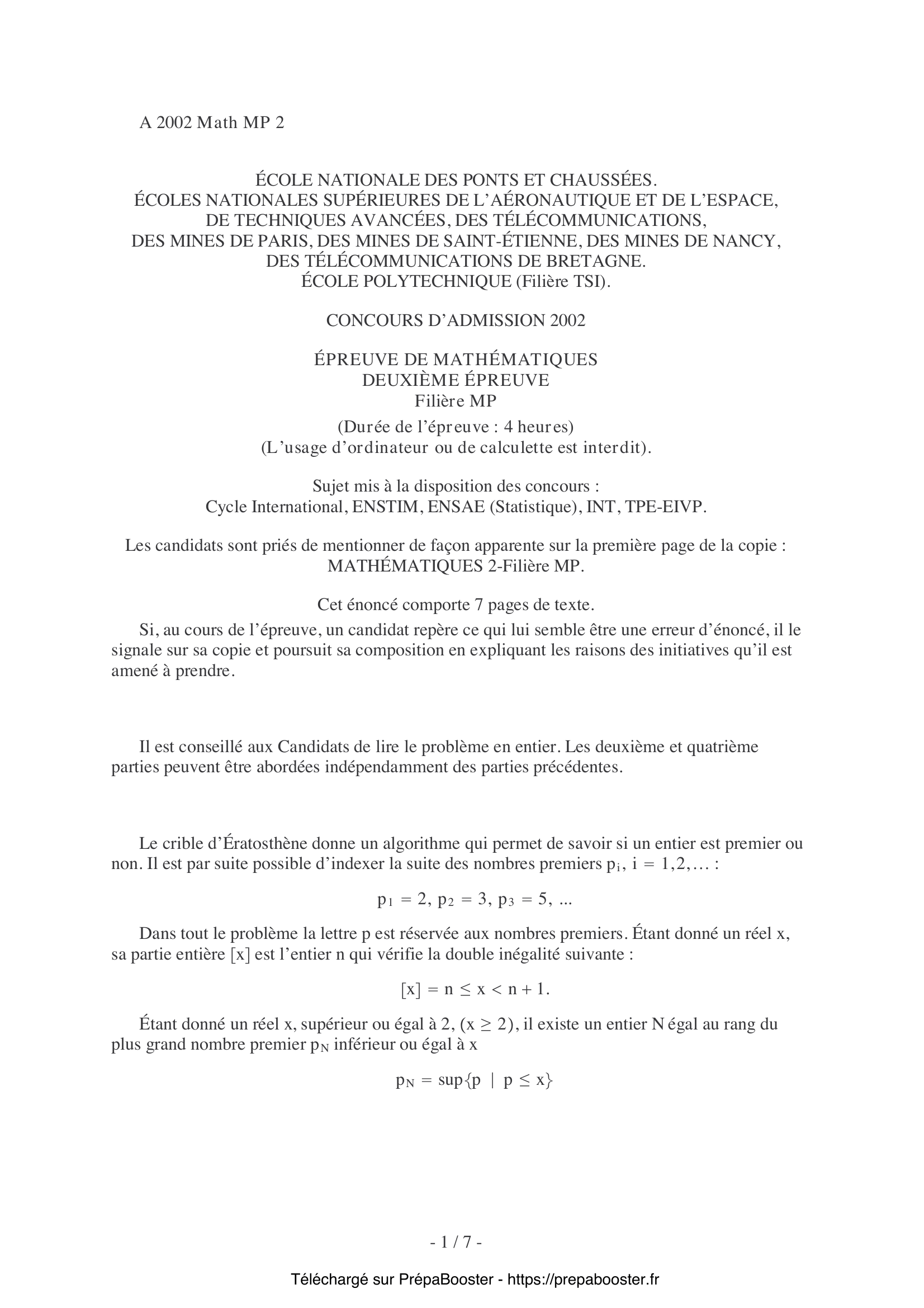 Le sujet Mines-Ponts MP 2002 balaye plusieurs domaines au cœur du programme de CPGE scientifique : arithmétique (notamment les nombres premiers, ppcm, théorème d’Euler), séries et produits infinis (fonction zêta de Riemann), analyse (inégalités, intégrales, convergence de séries) et même une incursion en cryptographie avec le chiffrement type RSA. Cet éventail reflète parfaitement les attendus des concours mines-ponts pour la filière MP.