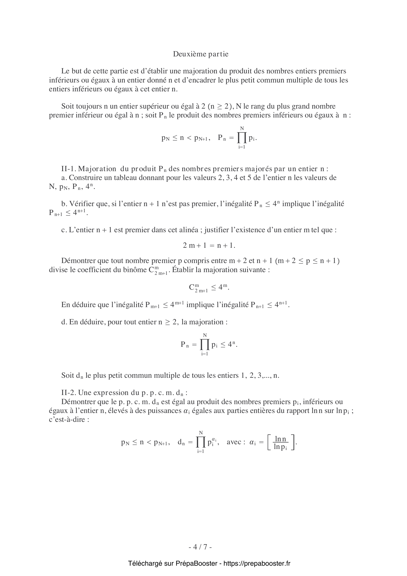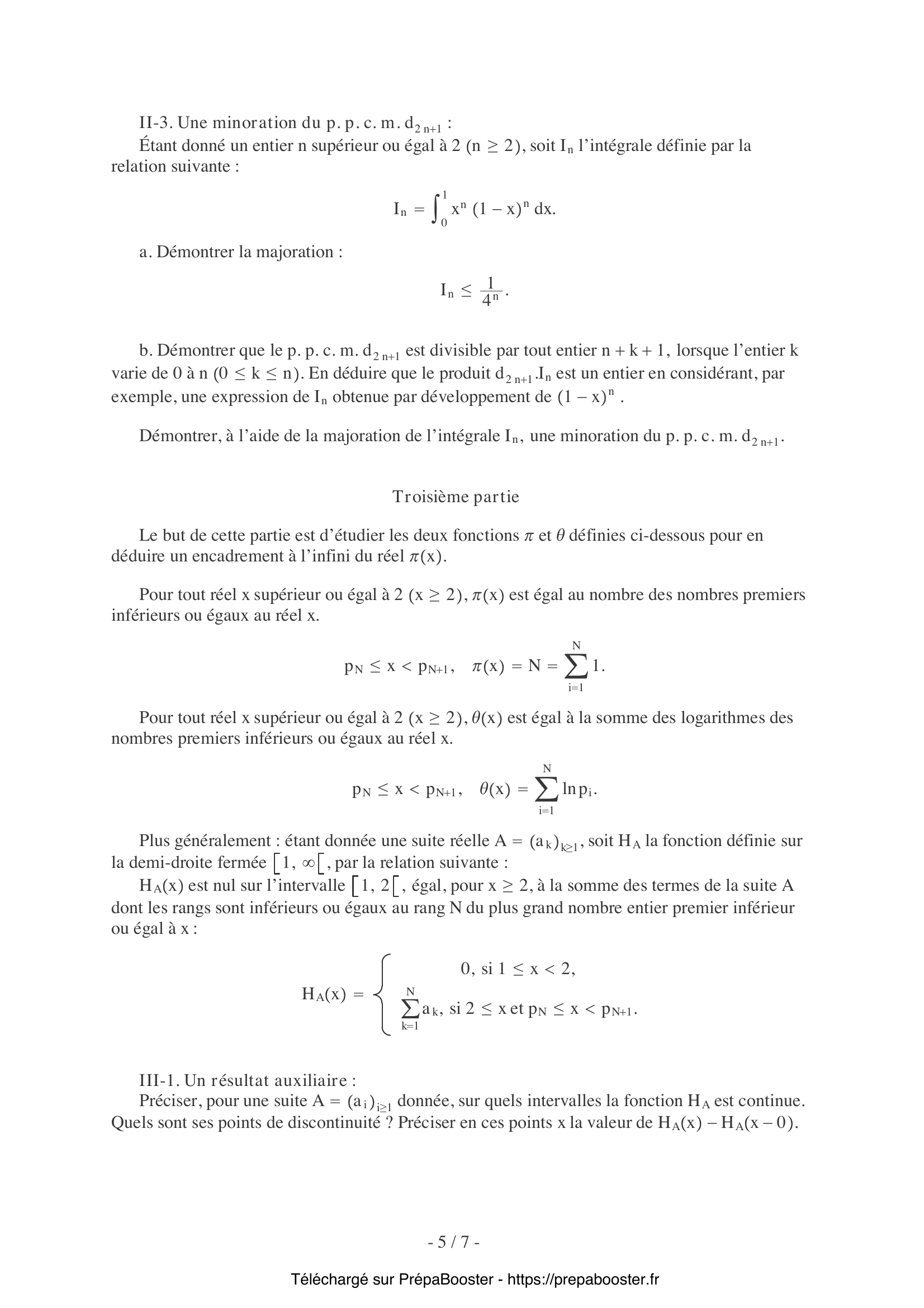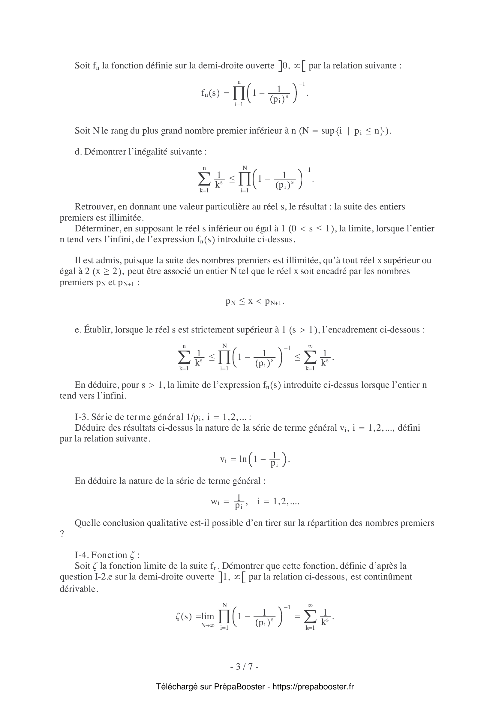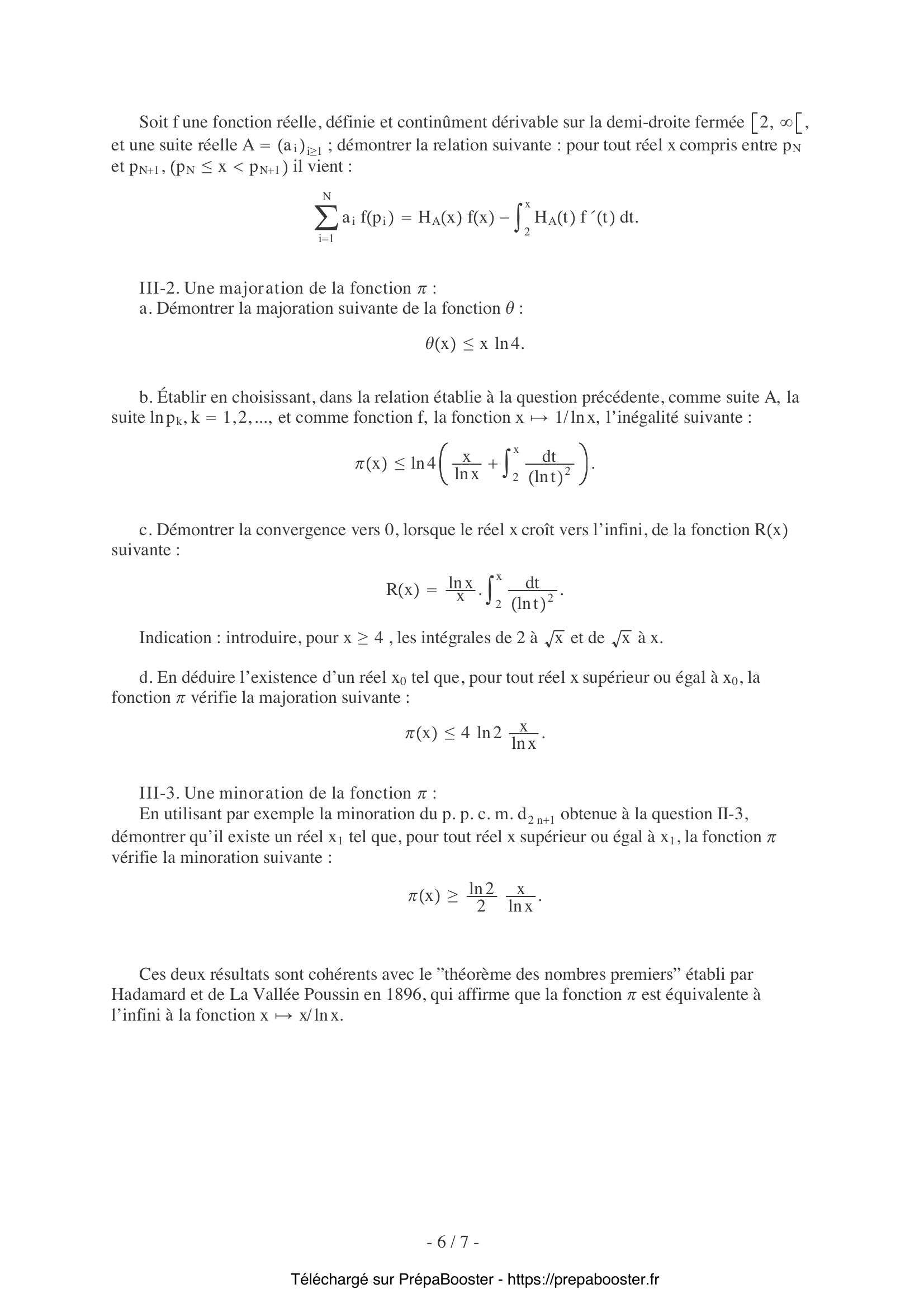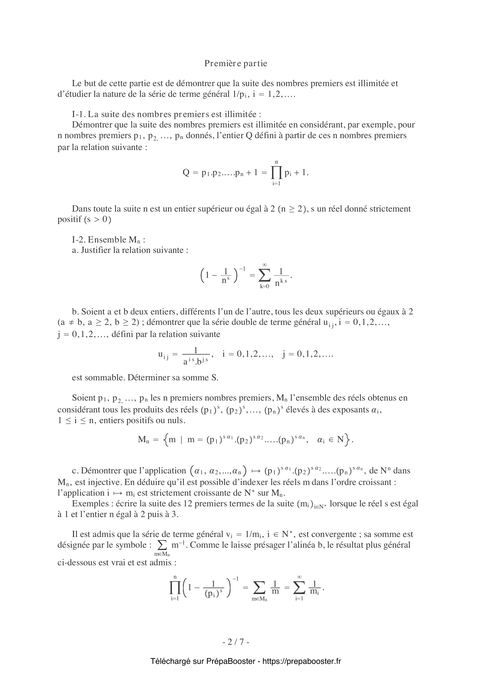 1. I-1. La suite des nombres premiers est illimitée :\\ Démontrer que la suite des nombres premiers est illimitée en considérant, par exemple, pour $n$ nombres premiers $p_1, p_2, \ldots, p_n$ donnés, l’entier $Q$ défini à partir de ces $n$ nombres premiers par la relation suivante :\\ $Q = p_1 p_2 \ldots p_n + 1 = \prod_{i=1}^{n} p_i + 1$. 2. I-2. Ensemble $M_n$ :\\ a. Justifier la relation suivante :\\ $1 \leq \frac{1}{n^s} \leq \sum_{k=0}^{\infty} \frac{1}{n^{k s}}$. 3. b. Soient $a$ et $b$ deux entiers, différents l’un de l’autre, tous les deux supérieurs ou égaux à 2 ($a \neq b$, $a \geq 2, b \geq 2$) ; démontrer que la série double de terme général $u_{i j}$, $i = 0,1,2,\ldots$, $j = 0,1,2,\ldots$ définie par la relation suivante\\ $u_{i j} = \frac{1}{a^{i s} b^{j s}}$, $i = 0,1,2,\ldots, j=0,1,2,\ldots$\\ est sommable. Déterminer sa somme $S$. 4. c. Démontrer que l’application $(\alpha_1, \alpha_2, …, \alpha_n) \mapsto p_1^{s \alpha_1} p_2^{s \alpha_2} \ldots p_n^{s \alpha_n}$, de $\mathbb{N}^n$ dans $M_n$, est injective. En déduire qu’il est possible d’indexer les réels $m$ dans l’ordre croissant : l’application $i \mapsto m_i$ est strictement croissante de $\mathbb{N}$ sur $M_n$.\\ Exemples : écrire la suite des 12 premiers termes de la suite $(m_i)_{i\in\mathbb{N}}$ lorsque le réel $s$ est égal à 1 et l’entier $n$ égal à 2 puis à 3. 5. d. Démontrer l’inégalité suivante :\\ $\sum_{k=1}^{n} \frac{1}{k^s} \leq \prod_{i=1}^{N} \frac{1}{1-1/p_i^s}$\\ Retrouver, en donnant une valeur particulière au réel $s$, le résultat : la suite des entiers premiers est illimitée.\\ Déterminer, en supposant le réel $s$ inférieur ou égal à 1 ($0 < s \leq 1$), la limite, lorsque l’entier $n$ tend vers l’infini, de l’expression $f_n(s)$ introduite ci-dessus.} 6. e. Établir, lorsque le réel $s$ est strictement supérieur à 1 ($s > 1$), l’encadrement ci-dessous :\\ $\sum_{k=1}^{n} \frac{1}{k^s} \leq \prod_{i=1}^{N} \frac{1}{1-1/p_i^s} \leq \sum_{k=1}^{\infty} \frac{1}{k^s}$\\ En déduire, pour $s > 1$, la limite de l’expression $f_n(s)$ introduite ci-dessus lorsque l’entier $n$ tend vers l’infini. 7. I-3. Série de terme général $1/p_i$, $i=1,2,\ldots$ :\\ Déduire des résultats ci-dessus la nature de la série de terme général $v_i$, $i=1,2,\ldots$, défini par la relation suivante :\\ $v_i = \ln \frac{1}{1-1/p_i}$.\\ En déduire la nature de la série de terme général :\\ $w_i = \frac{1}{p_i}$, $i=1,2,\ldots$.\\ Quelle conclusion qualitative est-il possible d’en tirer sur la répartition des nombres premiers ? 8. I-4. Fonction $\zeta$ :\\ Soit $\zeta$ la fonction limite de la suite $f_n$. Démontrer que cette fonction, définie d’après la question I-2.e sur la demi-droite ouverte $(1,+\infty)$ par la relation ci-dessous, est continûment dérivable.\\ $\zeta(s) = \lim_{N\to\infty} \prod_{i=1}^{N} \frac{1}{1-1/p_i^s} = \sum_{k=1}^{\infty} \frac{1}{k^s}$. 9. II-1. Majoration du produit $P_n$ des nombres premiers majorés par un entier $n$ :\\ a. Construire un tableau donnant pour les valeurs 2, 3, 4 et 5 de l’entier $n$ les valeurs de $N$, $p_N$, $P_n$, $4^n$. 10. b. Vérifier que, si l’entier $n+1$ n’est pas premier, l’inégalité $P_n \leq 4^n$ implique l’inégalité $P_{n+1} \leq 4^{n+1}$.} 11. c. L’entier $n+1$ est premier dans cet alinéa ; justifier l’existence d’un entier $m$ tel que :\\ $2m+1 = n+1$.\\ Démontrer que tout nombre premier $p$ compris entre $m+2$ et $n+1$ ($m+2 \leq p \leq n+1$) divise le coefficient du binôme $C_{2m+1}^m$. Établir la majoration suivante :\\ $C_{2m+1}^m \leq 4^m$.\\ En déduire que l’inégalité $P_{m+1} \leq 4^{m+1}$ implique l’inégalité $P_{n+1} \leq 4^{n+1}$. 12. d. En déduire, pour tout entier $n\geq 2$, la majoration :\\ $P_n = \prod_{i=1}^N p_i \leq 4^n$. 13. II-2. Une expression du p. p. c. m. $d_n$ :\\ Démontrer que le p. p. c. m. $d_n$ est égal au produit des nombres premiers $p_i$, inférieurs ou égaux à l’entier $n$, élevés à des puissances $\alpha_i$ égales aux parties entières du rapport $\ln n$ sur $\ln p_i$ ; c’est-à-dire :\\ $p_N \leq n < p_{N+1}, d_n = \prod_{i=1}^N p_i^{\alpha_i},$ avec : $\alpha_i = \left\lfloor \frac{\ln n}{\ln p_i} \right\rfloor$. 14. II-3. Une minoration du p. p. c. m. $d_{2n+1}$ :\\ Étant donné un entier $n\geq 2$, soit $I_n$ l’intégrale définie par la relation suivante :\\ $I_n = \int_0^1 x^n (1-x)^n dx$.\\ a. Démontrer la majoration :\\ $I_n \leq \frac{1}{4^n}$. 15. b. Démontrer que le p. p. c. m. $d_{2n+1}$ est divisible par tout entier $n+k+1$, lorsque l’entier $k$ varie de $0$ à $n$ ($0 \leq k \leq n$). En déduire que le produit $d_{2n+1} I_n$ est un entier en considérant, par exemple, une expression de $I_n$ obtenue par développement de $(1-x)^n$.\\ Démontrer, à l’aide de la majoration de l’intégrale $I_n$, une minoration du p. p. c. m. $d_{2n+1}$.} 16. III-1. Un résultat auxiliaire :\\ Préciser, pour une suite $A = (a_k)_{k\geq 1}$ donnée, sur quels intervalles la fonction $H_A$ est continue.\\ Quels sont ses points de discontinuité ?\\ Préciser en ces points $x$ la valeur de $H_A(x^+)-H_A(x^-)$. 17. Soit $f$ une fonction réelle, définie et continûment dérivable sur la demi-droite fermée $[2, +\infty[$, et une suite réelle $A = (a_i)_{i\geq 1}$ ; démontrer la relation suivante : pour tout réel $x$ compris entre $p_N$ et $p_{N+1}$, $p_N\leq x< p_{N+1}$ il vient :\\ $\sum_{i=1}^{N} a_i f(p_i) = H_A(x)f(x) - \int_2^x H_A(t)f'(t)dt$. 18. III-2. Une majoration de la fonction $\vartheta$ :\\ a. Démontrer la majoration suivante de la fonction $\vartheta$ :\\ $\vartheta(x) \leq x\ln 4$. 19. b. Établir en choisissant, dans la relation établie à la question précédente, comme suite $A$, la suite $\ln p_k, k=1,2,...$, et comme fonction $f$, la fonction $x\mapsto 1/\ln x$, l’inégalité suivante :\\ $\pi(x) \leq \frac{x}{\ln x}\ln 4 - \int_2^x \frac{dt}{\ln t^2}$