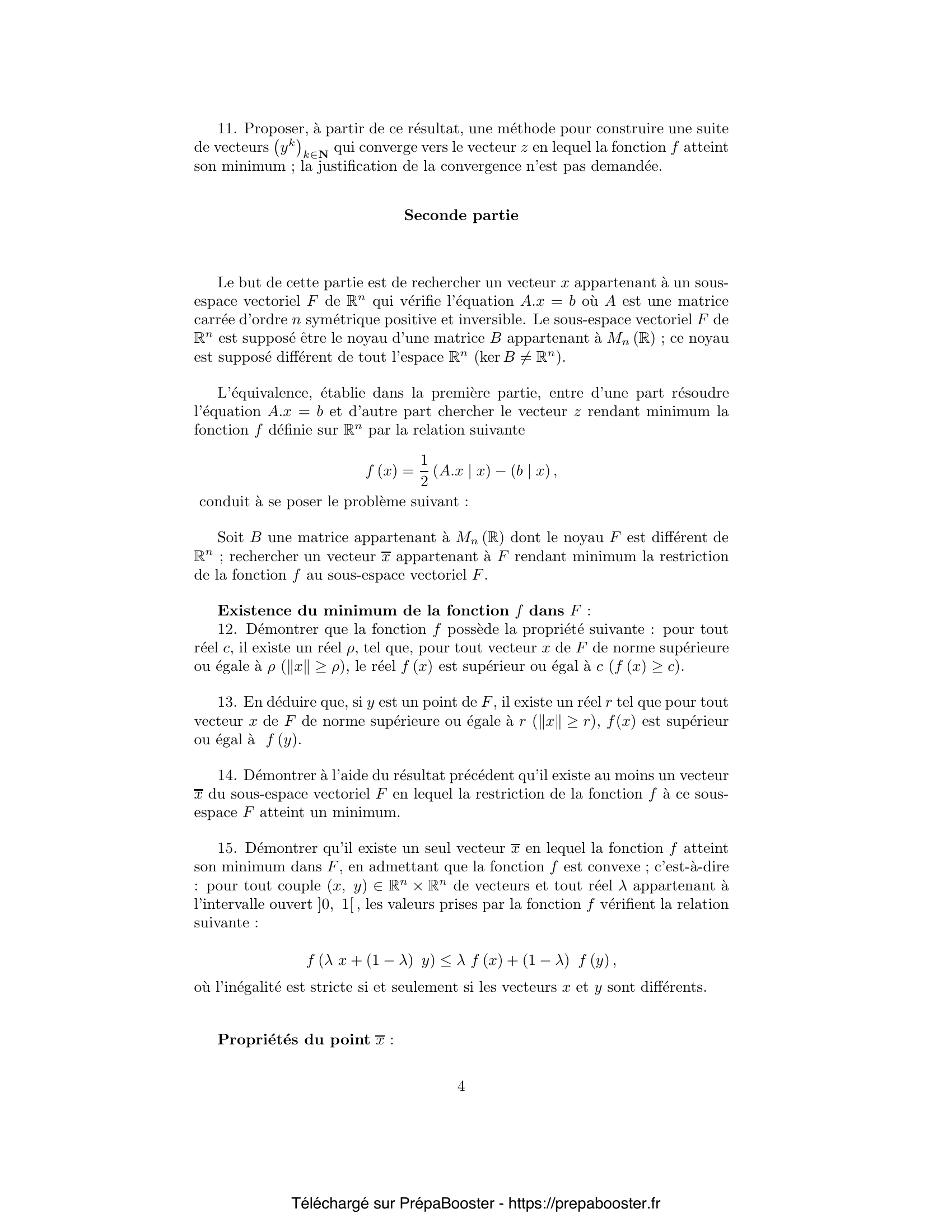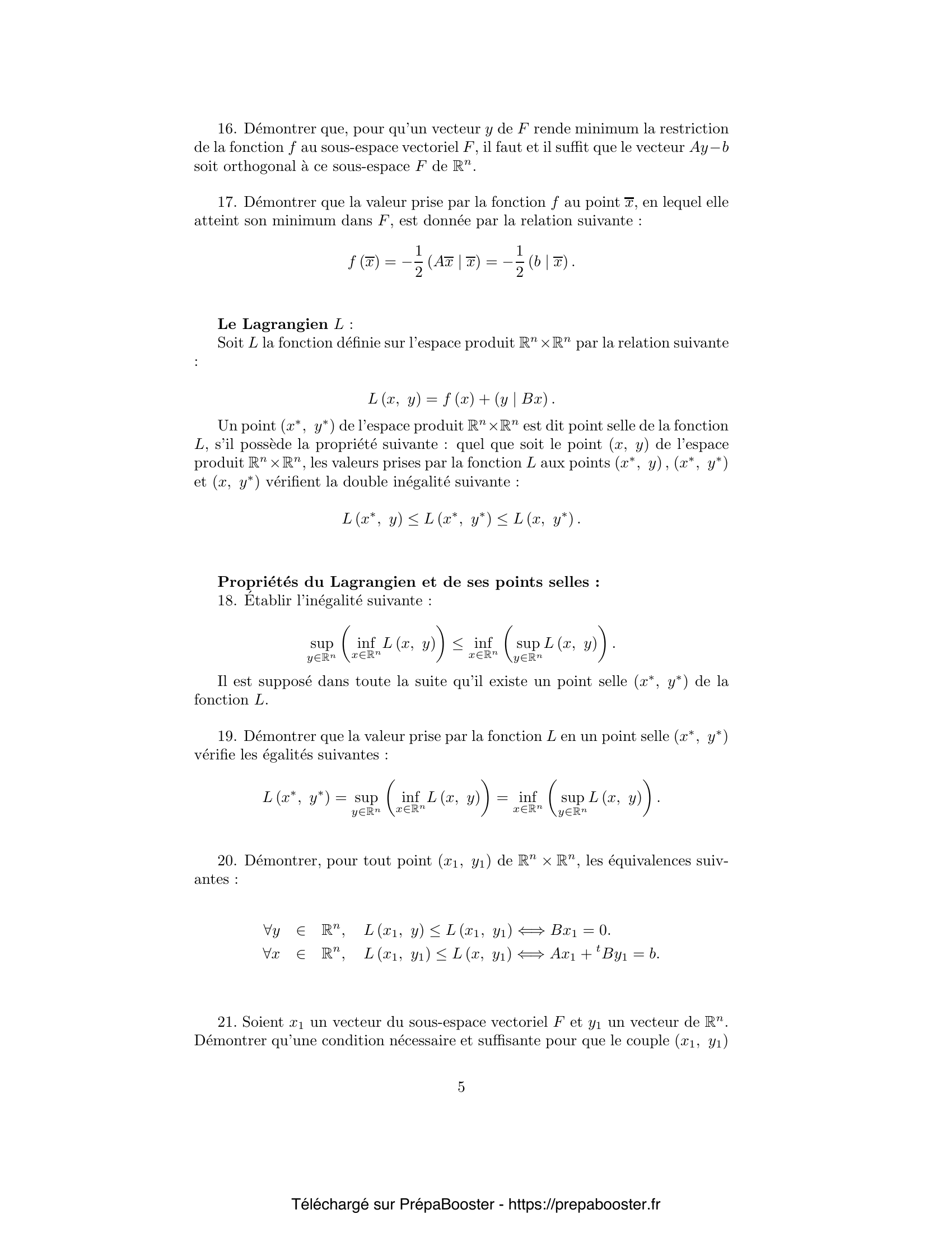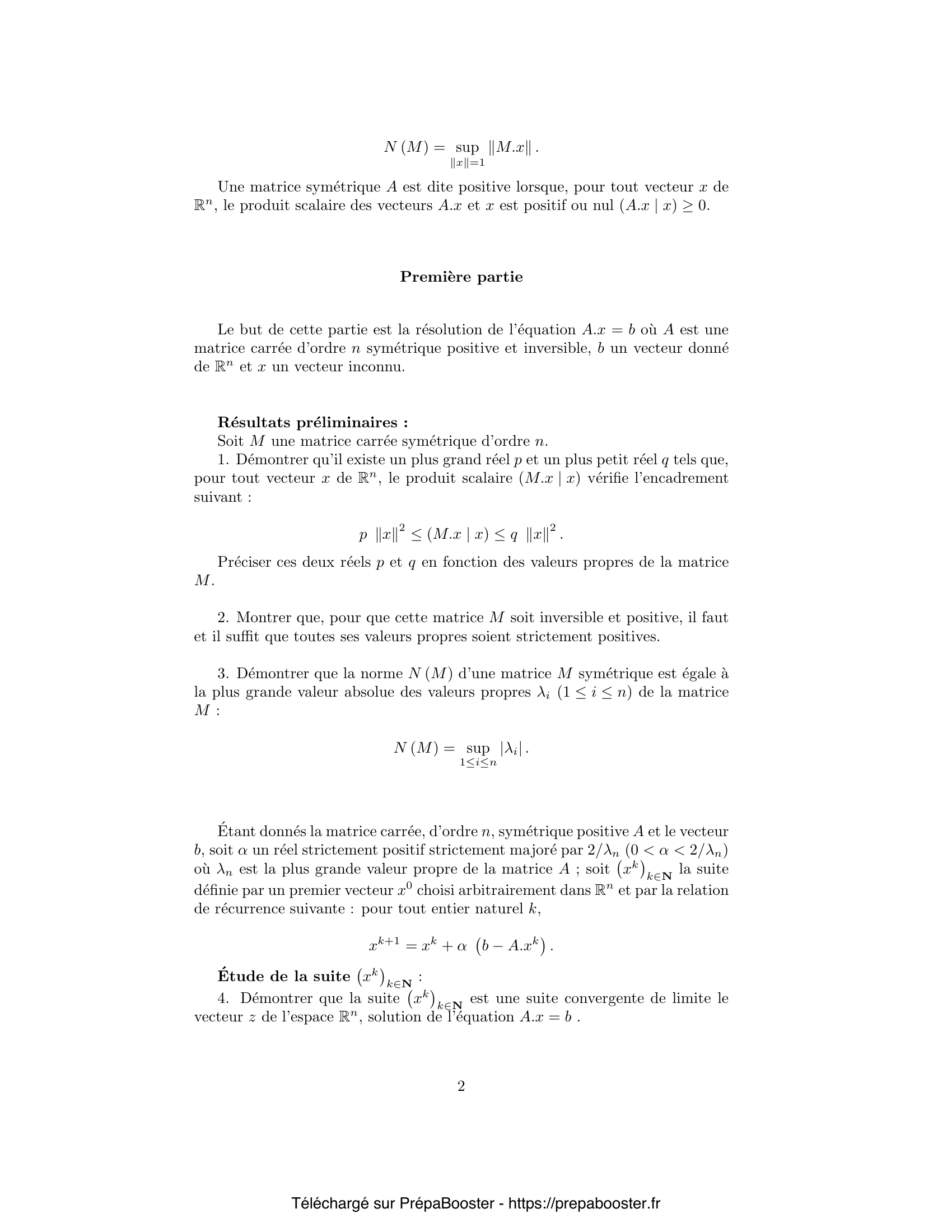 1. D\’emontrer qu’il existe un plus grand r\’eel $p$ et un plus petit r\’eel $q$ tels que, pour tout vecteur $x$ de $\mathbb{R}^n$, le produit scalaire $(M.x \mid x)$ v\’erifie l’encadrement suivant : $$p \|x\|^2 \leq (M.x \mid x) \leq q \|x\|^2.$$ Pr\’eciser ces deux r\’eels $p$ et $q$ en fonction des valeurs propres de la matrice $M$. 2. Montrer que, pour que cette matrice $M$ soit inversible et positive, il faut et il suffit que toutes ses valeurs propres soient strictement positives. 3. D\’emontrer que la norme $N(M)$ d’une matrice $M$ sym\’etrique est \’egale \`a la plus grande valeur absolue des valeurs propres $\lambda_i$ ($1 \leq i \leq n$) de la matrice $M$ : $$N(M) = \sup_{1 \leq i \leq n} |\lambda_i|.$$ 4. D\’emontrer que la suite $(x_k)_{k \in \mathbb{N}}$ est une suite convergente de limite le vecteur $z$ de l’espace $\mathbb{R}^n$, solution de l’\’equation $A.x = b$. 5. Calcul pr\’eparatoire : d\’emontrer que l’expression $f(x+u) – f(x)$ se calcule en fonction des expressions $(A.u \mid u)$, $(A.x \mid u)$ et $(b \mid u)$.} 6. D\’emontrer que la fonction $f : x \mapsto f(x)$ admet des d\’eriv\’ees partielles $$\frac{\partial f}{\partial x_k} \quad (1 \leq k \leq n):$$ $x \mapsto \frac{\partial f}{\partial x_k}(x)$. 7. Exprimer ce vecteur $g(x)$ au moyen de la matrice $A$ et des vecteurs $x$ et $b$. 8. D\’emontrer que, pour tout vecteur $x$ donn\’e, il existe deux constantes positives ou nulles $r$ et $s$ telles que, pour tout vecteur $u$, $I(x,u)$ v\’erifie la relation suivante : $$r \|u\|^2 \leq I(x,u) \leq s \|u\|^2.$$ 9. D\’emontrer que, pour que la fonction $f$ admette en $z$ un minimum, il faut et il suffit que le vecteur $z$ v\’erifie la relation $A.z = b$. 10. Etant donn\’e un vecteur $x$ de $\mathbb{R}^n$, d\’eterminer le signe de l’expression suivante $$f(x – \alpha g(x)) – f(x).$$} 11. Proposer, \`a partir de ce r\’esultat, une m\’ethode pour construire une suite de vecteurs $(y_k)_{k \in \mathbb{N}}$ qui converge vers le vecteur $z$ en lequel la fonction $f$ atteint son minimum ; la justification de la convergence n’est pas demand\’ee. 12. D\’emontrer que la fonction $f$ poss\`ede la propri\’et\’e suivante : pour tout r\’eel $c$, il existe un r\’eel $\rho$, tel que, pour tout vecteur $x$ de $F$ de norme sup\’erieure ou \’egale \`a $\rho$ ($\|x\| \geq \rho$), le r\’eel $f(x)$ est sup\’erieur ou \’egal \`a $c$ ($f(x) \geq c$). 13. En d\’eduire que, si $y$ est un point de $F$, il existe un r\’eel $r$ tel que pour tout vecteur $x$ de $F$ de norme sup\’erieure ou \’egale \`a $r$ ($\|x\| \geq r$), $f(x)$ est sup\’erieur ou \’egal \`a $f(y)$. 14. D\’emontrer \`a l’aide du r\’esultat pr\’ec\’edent qu’il existe au moins un vecteur $x$ du sous-espace vectoriel $F$ en lequel la restriction de la fonction $f$ \`a ce sous-espace $F$ atteint un minimum. 15. D\’emontrer qu’il existe un seul vecteur $x$ en lequel la fonction $f$ atteint son minimum dans $F$, en admettant que la fonction $f$ est convexe ; c’est-\`a-dire : pour tout couple $(x, y) \in \mathbb{R}^n \times \mathbb{R}^n$ de vecteurs et tout r\’eel $\lambda$ appartenant \`a l’intervalle ouvert $]0,1[$ , les valeurs prises par la fonction $f$ v\’erifient la relation suivante : $$f(\lambda x + (1-\lambda) y) \leq \lambda f(x)+(1-\lambda)f(y),$$ o\`u l’in\’egalit\’e est stricte si et seulement si les vecteurs $x$ et $y$ sont diff\’erents.} 16. D\’emontrer que, pour qu’un vecteur $y$ de $F$ rende minimum la restriction de la fonction $f$ au sous-espace vectoriel $F$, il faut et il suffit que le vecteur $Ay-b$ soit orthogonal \`a ce sous-espace $F$ de $\mathbb{R}^n$. 17. D\’emontrer que la valeur prise par la fonction $f$ au point $x$, en lequel elle atteint son minimum dans $F$, est donn\’ee par la relation suivante : $$f(x) = -\frac{1}{2} (Ax \mid x) = -\frac{1}{2} (b \mid x).$$ 18. Etablir l’in\’egalit\’e suivante : $$\sup_{y \in \mathbb{R}^n}\left( \inf_{x \in \mathbb{R}^n} L(x, y) \right) \leq \inf_{x \in \mathbb{R}^n}\left( \sup_{y \in \mathbb{R}^n} L(x, y) \right).$$ 19. D\’emontrer que la valeur prise par la fonction $L$ en un point selle $(x^*, y^*)$ v\’erifie les \’egalit\’es suivantes : $$L(x^*, y^*) = \sup_{y \in \mathbb{R}^n}\left( \inf_{x \in \mathbb{R}^n} L(x, y) \right) = \inf_{x \in \mathbb{R}^n}\left( \sup_{y \in \mathbb{R}^n} L(x, y) \right).$$ 20. D\’emontrer, pour tout point $(x_1, y_1)$ de $\mathbb{R}^n \times \mathbb{R}^n$, les \’equivalences suivantes : \[ \forall y \in \mathbb{R}^n, L(x_1, y) \leq L(x_1, y_1) \iff Bx_1 = 0. \] \[ \forall x \in \mathbb{R}^n, L(x_1, y_1) \leq L(x, y_1) \iff Ax_1 + {^t}B y_1 = b. \]} 21. Soient $x_1$ un vecteur du sous-espace vectoriel $F$ et $y_1$ un vecteur de $\mathbb{R}^n$. D\’emontrer qu’une condition n\’ecessaire et suffisante pour que le couple $(x_1, y_1)$ soit un point selle du Lagrangien $L$ est que le vecteur $x_1$ r\’ealise le minimum de la restriction de la fonction $f$ \`a $F$ et que les vecteurs $x_1$ et $y_1$ v\’erifient la relation suivante : $$Ax_1 + {^t}B y_1 = b.$$ 22. D\’emontrer que les conditions \’enonc\’ees permettent de d\’eterminer tous les termes de ces deux suites $(x_m)_{m \in \mathbb{N}}$ et $(y_m)_{m \in \mathbb{N}}$ et que les vecteurs de ces suites v\’erifient, pour tout entier naturel $m$, les relations suivantes : $$A(x_m – x^*) + {^t}B(y_m – y^*) = 0,$$ $$y_{m+1} – y^* = y_m – y^* + \rho_m B(x_m – x^*),$$ o\`u $x^*$ et $y^*$ sont les deux vecteurs d’un point selle de $L$. 23. En d\’eduire l’\’egalit\’e ci-dessous : $$\|y_{m+1} – y^*\|^2 = \|y_m – y^*\|^2 – 2\rho_m (A(x_m – x^*) \mid (x_m – x^*)) + (\rho_m)^2 \|B(x_m – x^*)\|^2.$$ 24. Un r\’esultat pr\’eliminaire : d\’emontrer l’existence d’une matrice carr\’ee d’ordre $n$ sym\’etrique positive inversible, not\’ee $A^{1/2}$, telle que : $$(A^{1/2})^2 = 