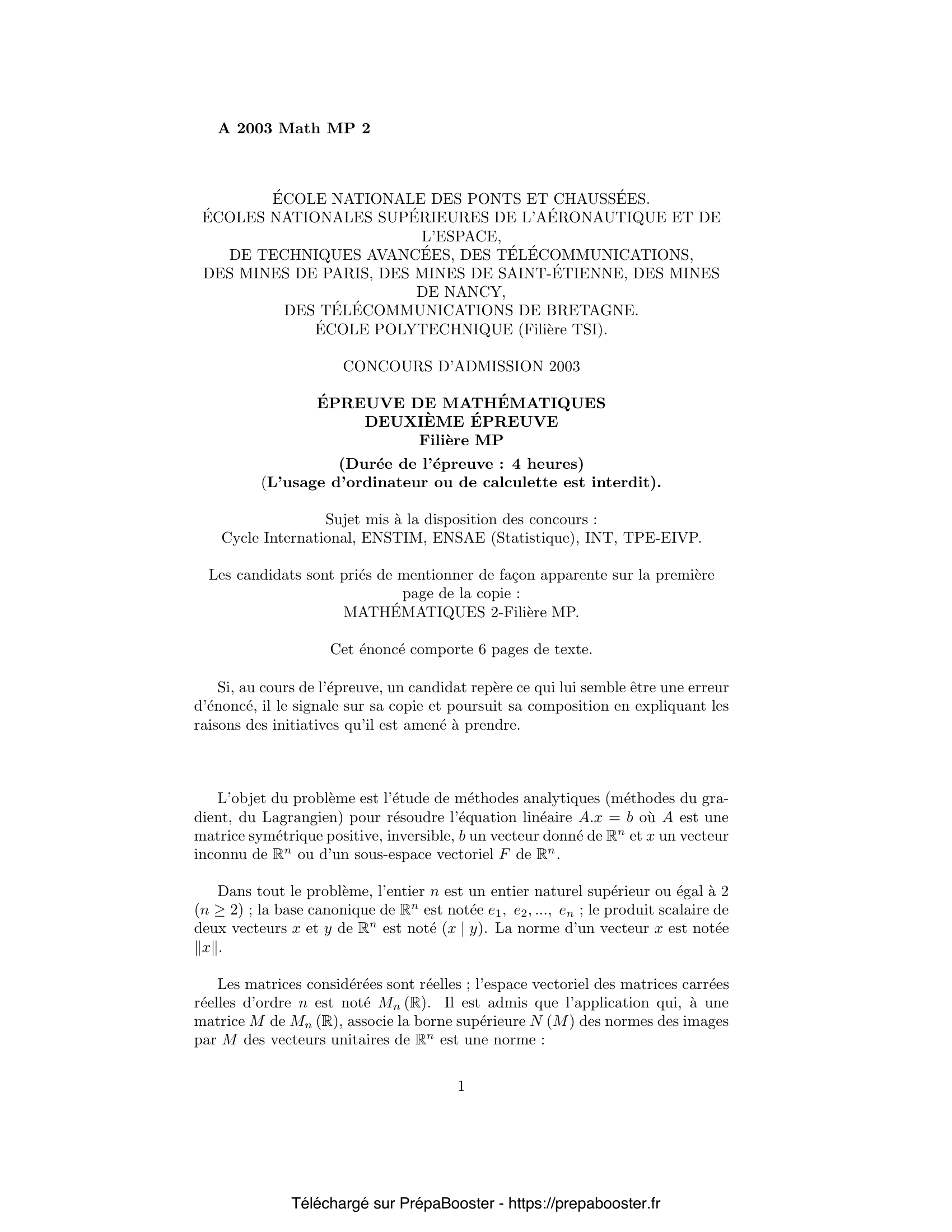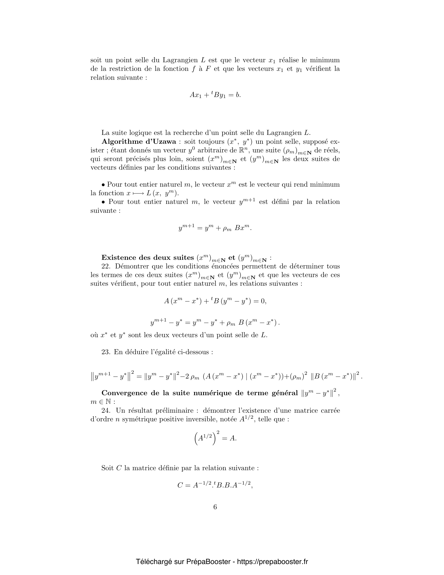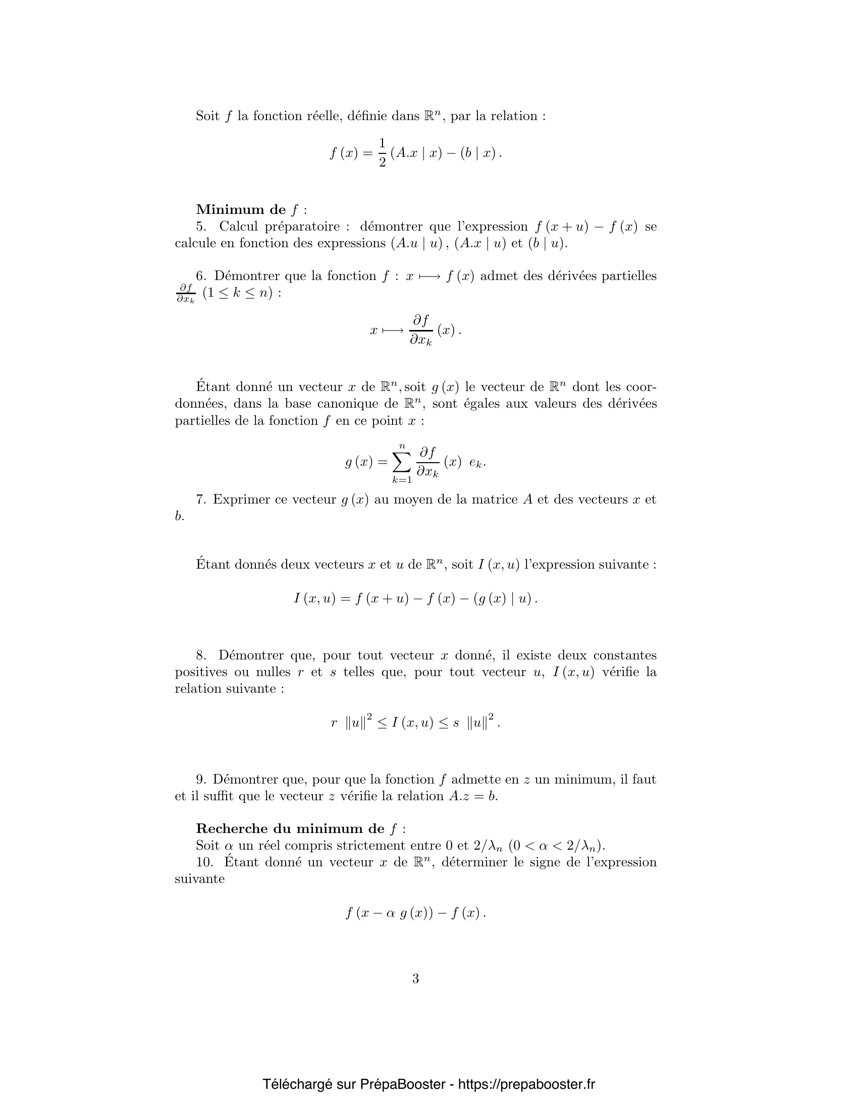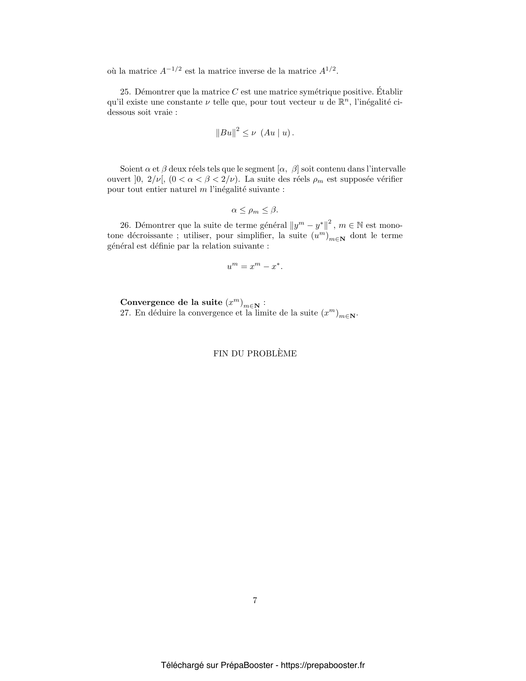 1. D\’emontrer qu’il existe un plus grand r\’eel $p$ et un plus petit r\’eel $q$ tels que, pour tout vecteur $x$ de $\mathbb{R}^n$, le produit scalaire $(M.x \mid x)$ v\’erifie l’encadrement suivant : $$p \|x\|^2 \leq (M.x \mid x) \leq q \|x\|^2.$$ Pr\’eciser ces deux r\’eels $p$ et $q$ en fonction des valeurs propres de la matrice $M$. 2. Montrer que, pour que cette matrice $M$ soit inversible et positive, il faut et il suffit que toutes ses valeurs propres soient strictement positives. 3. D\’emontrer que la norme $N(M)$ d’une matrice $M$ sym\’etrique est \’egale \`a la plus grande valeur absolue des valeurs propres $\lambda_i$ ($1 \leq i \leq n$) de la matrice $M$ : $$N(M) = \sup_{1 \leq i \leq n} |\lambda_i|.$$ 4. D\’emontrer que la suite $(x_k)_{k \in \mathbb{N}}$ est une suite convergente de limite le vecteur $z$ de l’espace $\mathbb{R}^n$, solution de l’\’equation $A.x = b$. 5. Calcul pr\’eparatoire : d\’emontrer que l’expression $f(x+u) – f(x)$ se calcule en fonction des expressions $(A.u \mid u)$, $(A.x \mid u)$ et $(b \mid u)$.} 6. D\’emontrer que la fonction $f : x \mapsto f(x)$ admet des d\’eriv\’ees partielles $$\frac{\partial f}{\partial x_k} \quad (1 \leq k \leq n):$$ $x \mapsto \frac{\partial f}{\partial x_k}(x)$. 7. Exprimer ce vecteur $g(x)$ au moyen de la matrice $A$ et des vecteurs $x$ et $b$. 8. D\’emontrer que, pour tout vecteur $x$ donn\’e, il existe deux constantes positives ou nulles $r$ et $s$ telles que, pour tout vecteur $u$, $I(x,u)$ v\’erifie la relation suivante : $$r \|u\|^2 \leq I(x,u) \leq s \|u\|^2.$$ 9. D\’emontrer que, pour que la fonction $f$ admette en $z$ un minimum, il faut et il suffit que le vecteur $z$ v\’erifie la relation $A.z = b$. 10. Etant donn\’e un vecteur $x$ de $\mathbb{R}^n$, d\’eterminer le signe de l’expression suivante $$f(x – \alpha g(x)) – f(x).$$} 11. Proposer, \`a partir de ce r\’esultat, une m\’ethode pour construire une suite de vecteurs $(y_k)_{k \in \mathbb{N}}$ qui converge vers le vecteur $z$ en lequel la fonction $f$ atteint son minimum ; la justification de la convergence n’est pas demand\’ee. 12. D\’emontrer que la fonction $f$ poss\`ede la propri\’et\’e suivante : pour tout r\’eel $c$, il existe un r\’eel $\rho$, tel que, pour tout vecteur $x$ de $F$ de norme sup\’erieure ou \’egale \`a $\rho$ ($\|x\| \geq \rho$), le r\’eel $f(x)$ est sup\’erieur ou \’egal \`a $c$ ($f(x) \geq c$). 13. En d\’eduire que, si $y$ est un point de $F$, il existe un r\’eel $r$ tel que pour tout vecteur $x$ de $F$ de norme sup\’erieure ou \’egale \`a $r$ ($\|x\| \geq r$), $f(x)$ est sup\’erieur ou \’egal \`a $f(y)$. 14. D\’emontrer \`a l’aide du r\’esultat pr\’ec\’edent qu’il existe au moins un vecteur $x$ du sous-espace vectoriel $F$ en lequel la restriction de la fonction $f$ \`a ce sous-espace $F$ atteint un minimum. 15. D\’emontrer qu’il existe un seul vecteur $x$ en lequel la fonction $f$ atteint son minimum dans $F$, en admettant que la fonction $f$ est convexe ; c’est-\`a-dire : pour tout couple $(x, y) \in \mathbb{R}^n \times \mathbb{R}^n$ de vecteurs et tout r\’eel $\lambda$ appartenant \`a l’intervalle ouvert $]0,1[$ , les valeurs prises par la fonction $f$ v\’erifient la relation suivante : $$f(\lambda x + (1-\lambda) y) \leq \lambda f(x)+(1-\lambda)f(y),$$ o\`u l’in\’egalit\’e est stricte si et seulement si les vecteurs $x$ et $y$ sont diff\’erents.} 16. D\’emontrer que, pour qu’un vecteur $y$ de $F$ rende minimum la restriction de la fonction $f$ au sous-espace vectoriel $F$, il faut et il suffit que le vecteur $Ay-b$ soit orthogonal \`a ce sous-espace $F$ de $\mathbb{R}^n$. 17. D\’emontrer que la valeur prise par la fonction $f$ au point $x$, en lequel elle atteint son minimum dans $F$, est donn\’ee par la relation suivante : $$f(x) = -\frac{1}{2} (Ax \mid x) = -\frac{1}{2} (b \mid x).$$ 18. Etablir l’in\’egalit\’e suivante : $$\sup_{y \in \mathbb{R}^n}\left( \inf_{x \in \mathbb{R}^n} L(x, y) \right) \leq \inf_{x \in \mathbb{R}^n}\left( \sup_{y \in \mathbb{R}^n} L(x, y) \right).$$ 19. D\’emontrer que la valeur prise par la fonction $L$ en un point selle $(x^*, y^*)$ v\’erifie les \’egalit\’es suivantes : $$L(x^*, y^*) = \sup_{y \in \mathbb{R}^n}\left( \inf_{x \in \mathbb{R}^n} L(x, y) \right) = \inf_{x \in \mathbb{R}^n}\left( \sup_{y \in \mathbb{R}^n} L(x, y) \right).$$ 20. D\’emontrer, pour tout point $(x_1, y_1)$ de $\mathbb{R}^n \times \mathbb{R}^n$, les \’equivalences suivantes : \[ \forall y \in \mathbb{R}^n, L(x_1, y) \leq L(x_1, y_1) \iff Bx_1 = 0. \] \[ \forall x \in \mathbb{R}^n, L(x_1, y_1) \leq L(x, y_1) \iff Ax_1 + {^t}B y_1 = b. \]} 21. Soient $x_1$ un vecteur du sous-espace vectoriel $F$ et $y_1$ un vecteur de $\mathbb{R}^n$. D\’emontrer qu’une condition n\’ecessaire et suffisante pour que le couple $(x_1, y_1)$ soit un point selle du Lagrangien $L$ est que le vecteur $x_1$ r\’ealise le minimum de la restriction de la fonction $f$ \`a $F$ et que les vecteurs $x_1$ et $y_1$ v\’erifient la relation suivante : $$Ax_1 + {^t}B y_1 = b.$$ 22. D\’emontrer que les conditions \’enonc\’ees permettent de d\’eterminer tous les termes de ces deux suites $(x_m)_{m \in \mathbb{N}}$ et $(y_m)_{m \in \mathbb{N}}$ et que les vecteurs de ces suites v\’erifient, pour tout entier naturel $m$, les relations suivantes : $$A(x_m – x^*) + {^t}B(y_m – y^*) = 0,$$ $$y_{m+1} – y^* = y_m – y^* + \rho_m B(x_m – x^*),$$ o\`u $x^*$ et $y^*$ sont les deux vecteurs d’un point selle de $L$. 23. En d\’eduire l’\’egalit\’e ci-dessous : $$\|y_{m+1} – y^*\|^2 = \|y_m – y^*\|^2 – 2\rho_m (A(x_m – x^*) \mid (x_m – x^*)) + (\rho_m)^2 \|B(x_m – x^*)\|^2.$$ 24. Un r\’esultat pr\’eliminaire : d\’emontrer l’existence d’une matrice carr\’ee d’ordre $n$ sym\’etrique positive inversible, not\’ee $A^{1/2}$, telle que : $$(A^{1/2})^2 = 