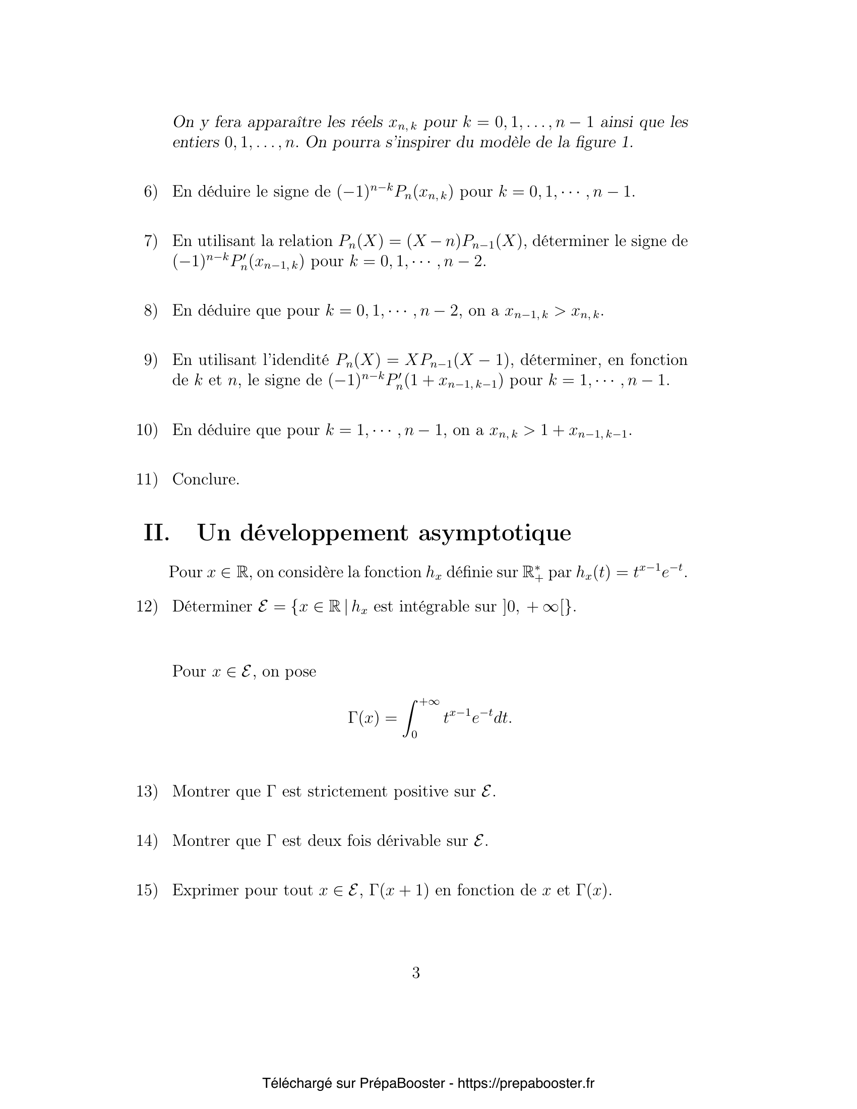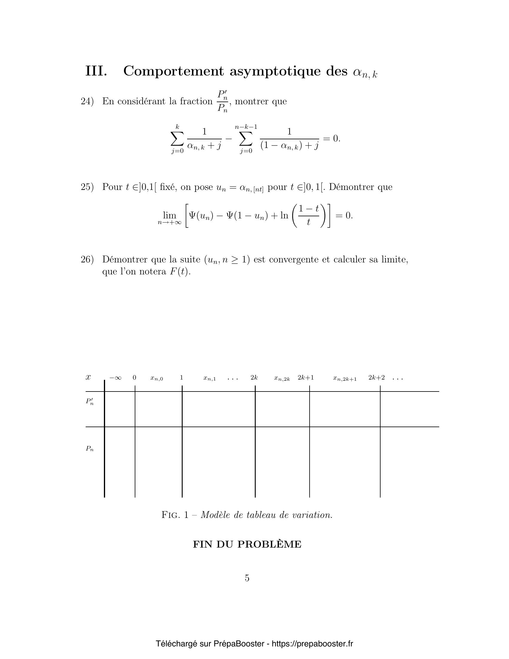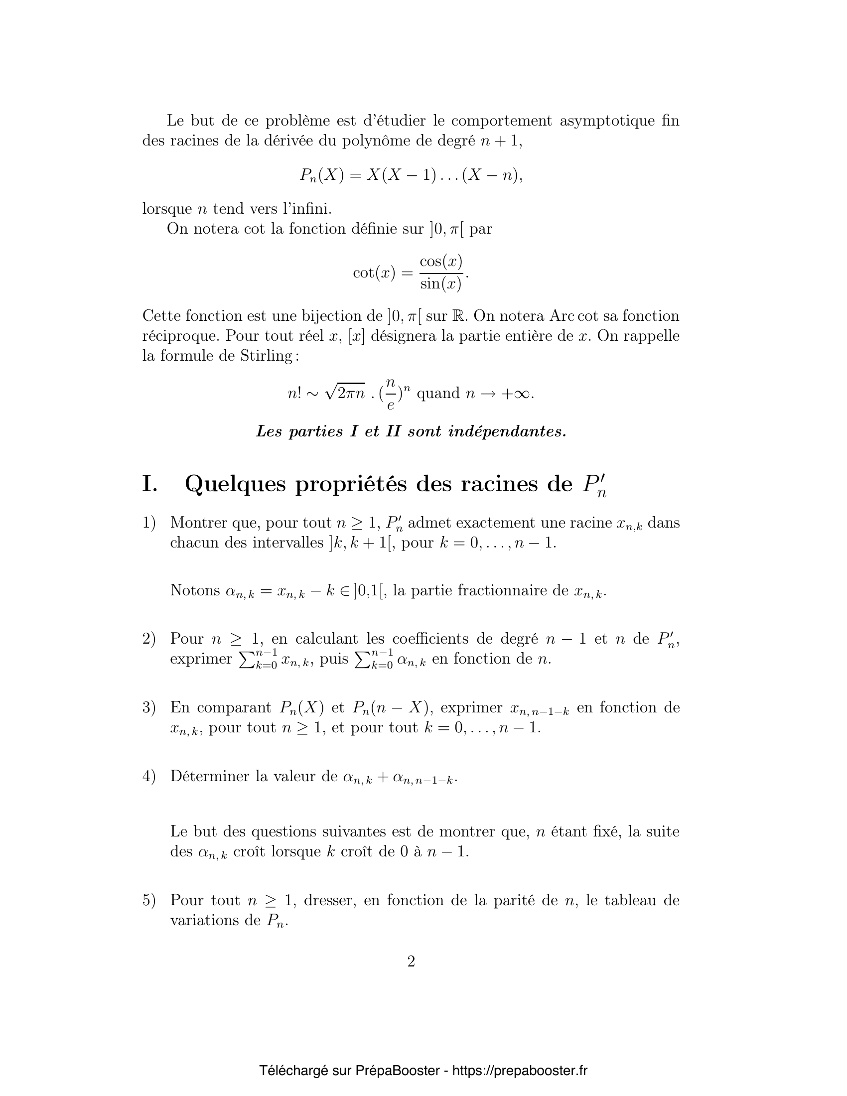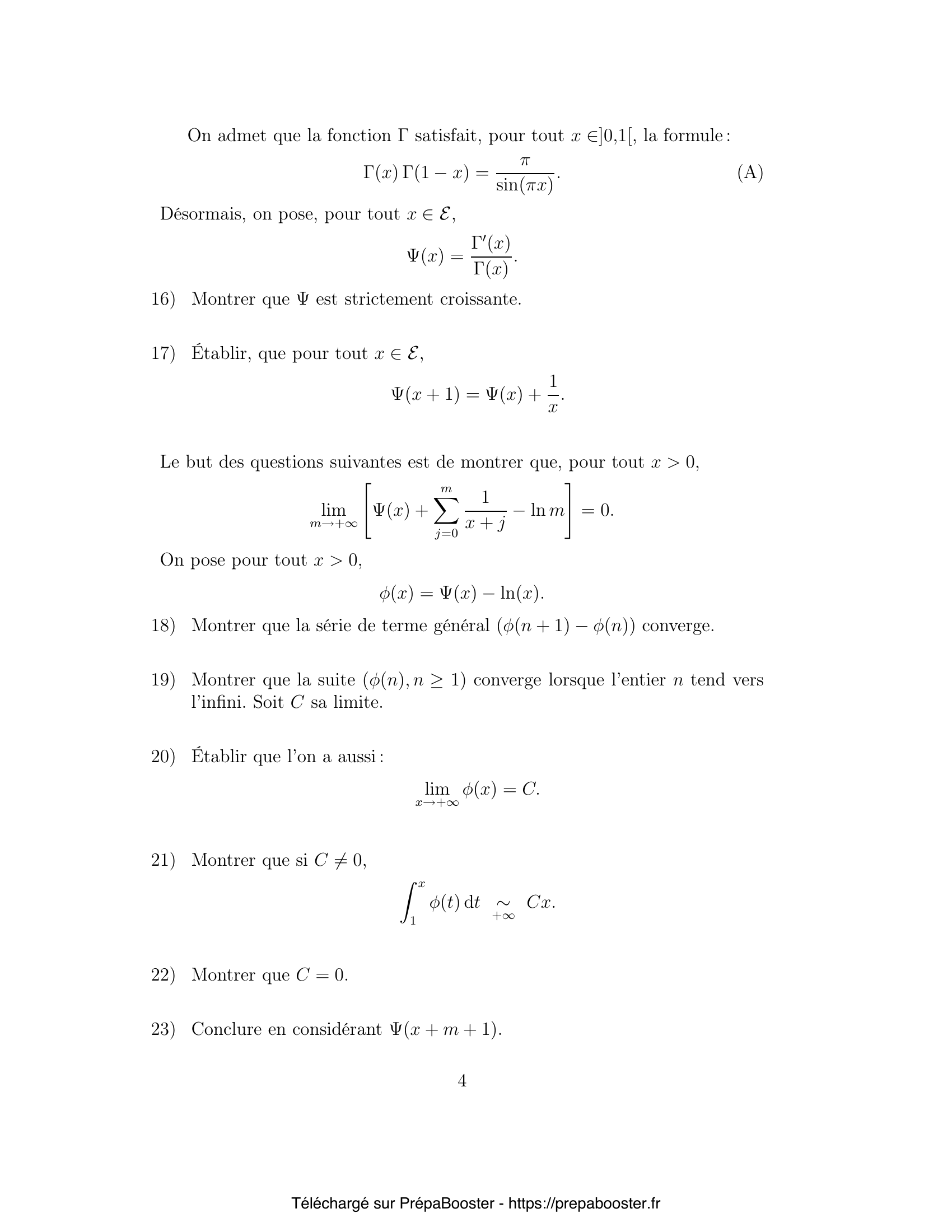 1. Montrer que, pour tout $n \geq 1$, $P’_n$ admet exactement une racine $x_{n, k}$ dans chacun des intervalles $]k, k + 1[$, pour $k = 0, \ldots, n – 1$. Notons $\alpha_{n, k} = x_{n, k} – k \in ]0,1[$, la partie fractionnaire de $x_{n, k}$. 2. Pour $n \geq 1$, en calculant les coefficients de degré $n – 1$ et $n$ de $P’_n$, exprimer $\sum_{k=0}^{n-1} x_{n, k}$, puis $\sum_{k=0}^{n-1} \alpha_{n, k}$ en fonction de $n$. 3. En comparant $P_n(X)$ et $P_n(n – X)$, exprimer $x_{n, n-1-k}$ en fonction de $x_{n, k}$, pour tout $n \geq 1$, et pour tout $k = 0, \ldots, n – 1$. 4. Déterminer la valeur de $\alpha_{n, k} + \alpha_{n, n-1-k}$. 5. Pour tout $n \geq 1$, dresser, en fonction de la parité de $n$, le tableau de variations de $P_n$.} 6. En déduire le signe de $(-1)^{n-k}P_n(x_{n, k})$ pour $k = 0, 1, \cdots, n – 1$. 7. En utilisant la relation $P_n(X) = (X-n)P_{n-1}(X)$, déterminer le signe de $(-1)^{n-k}P’_n(x_{n-1, k})$ pour $k = 0, 1, \cdots, n-2$. 8. En déduire que pour $k = 0, 1, \cdots, n-2$, on a $x_{n-1, k} > x_{n, k}$. 9. En utilisant l’identité $P_n(X) = X P_{n-1}(X-1)$, déterminer, en fonction de $k$ et $n$, le signe de $(-1)^{n-k}P’_n(1 + x_{n-1, k-1})$ pour $k = 1, \cdots, n-1$. 10. En déduire que pour $k = 1, \cdots, n-1$, on a $x_{n, k} > 1 + x_{n-1, k-1}$.} 11. Conclure. 12. Déterminer $E = \{x \in \R \mid h_x ~\text{est intégrable sur}~ ]0, +\infty[\}$, où $h_x(t) = t^{x-1} e^{-t}$. 13. Pour $x \in E$, on pose $\Gamma(x) = \int_0^{+\infty} t^{x-1} e^{-t} \, dt$. Montrer que $\Gamma$ est strictement positive sur $E$. 14. Montrer que $\Gamma$ est deux fois dérivable sur $E$. 15. Exprimer pour tout $x \in E$, $\Gamma(x+1)$ en fonction de $x$ et $\Gamma(x)$.} 16. Montrer que $\Psi$ est strictement croissante, où $\Psi(x) = \frac{\Gamma'(x)}{\Gamma(x)}$. 17. Établir que pour tout $x \in E$, $\Psi(x+1) = \Psi(x) + \frac{1}{x}$. 18. Montrer que, pour tout $x > 0$, $$ \lim_{m \to +\infty}\left[\Psi(x) + \sum_{j=0}^{m} \frac{1}{x+j} – \ln m\right] = 0. $$ 19. On pose pour tout $x > 0$, $\varphi(x) = \Psi(x) – \ln(x)$. Montrer que la série de terme général $\varphi(n+1) – \varphi(n)$ converge. 20. Montrer que la suite $(\varphi(n), n \geq 1)$ converge lorsque l’entier $n$ tend vers l’infini$.~$Soit~$ C~$sa limite.} 21. Établir que l’on a aussi~: $$ \lim_{x \to +\infty} \varphi(x) = C. $$ 22. Montrer que si $C \neq 0$, $$ \int_1^x \varphi(t) dt \sim_{x \to +\infty} Cx. $$ 23. Montrer que $C = 0$. 24. Conclure en considérant $\Psi(x + m + 1)$. 25. En considérant la fraction $\dfrac{P’_n}{P_n}$, montrer que $$ \sum_{j=0}^k\frac{1}{\alpha_{n, k} + j} – \sum_{j=0}^{n-k-1} \frac{1}{(1-\alpha_{n, k}) + j} = 0. $$ } 26. Pour $t \in ]0,1[$ fixé, on pose $u_n = \alpha_{n, [nt]}$ pour $t \in ]0, 1[$. Démontrer que $$ \lim_{n \to +\infty} \left(\Psi(u_n) – \Psi(1-u_n) + \ln \frac{1-t}{t}\right) = 0. $$ 27. Démontrer que la suite $(u_n, n\geq 1)$ est convergente et calculer sa limite, que l’on notera $F(t)$.}FAQ