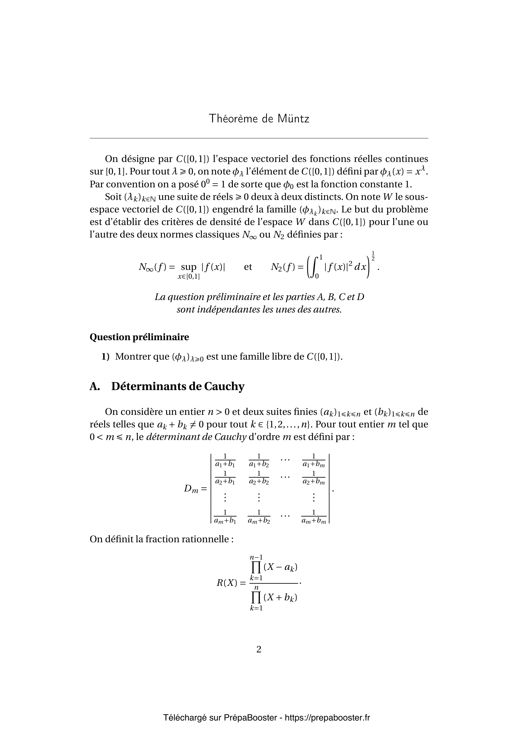Pour t’en sortir sur ce sujet, il faut être à l’aise avec l’analyse fonctionnelle (espaces vectoriels normés, densité, adhérence), les propriétés des espaces de fonctions continues (C([0,1]), normes N₂ et N_∞), les déterminants (Vandermonde et généralisés), la compacité, la projection orthogonale, et le calcul explicit des distances à un sous-espace. Il y a aussi une utilisation fine des polynômes et fractions rationnelles. Te plonger dans ce corrigé te permettra de voir exactement quelle maîtrise méthologique et rédactionnelle est attendue le jour J.