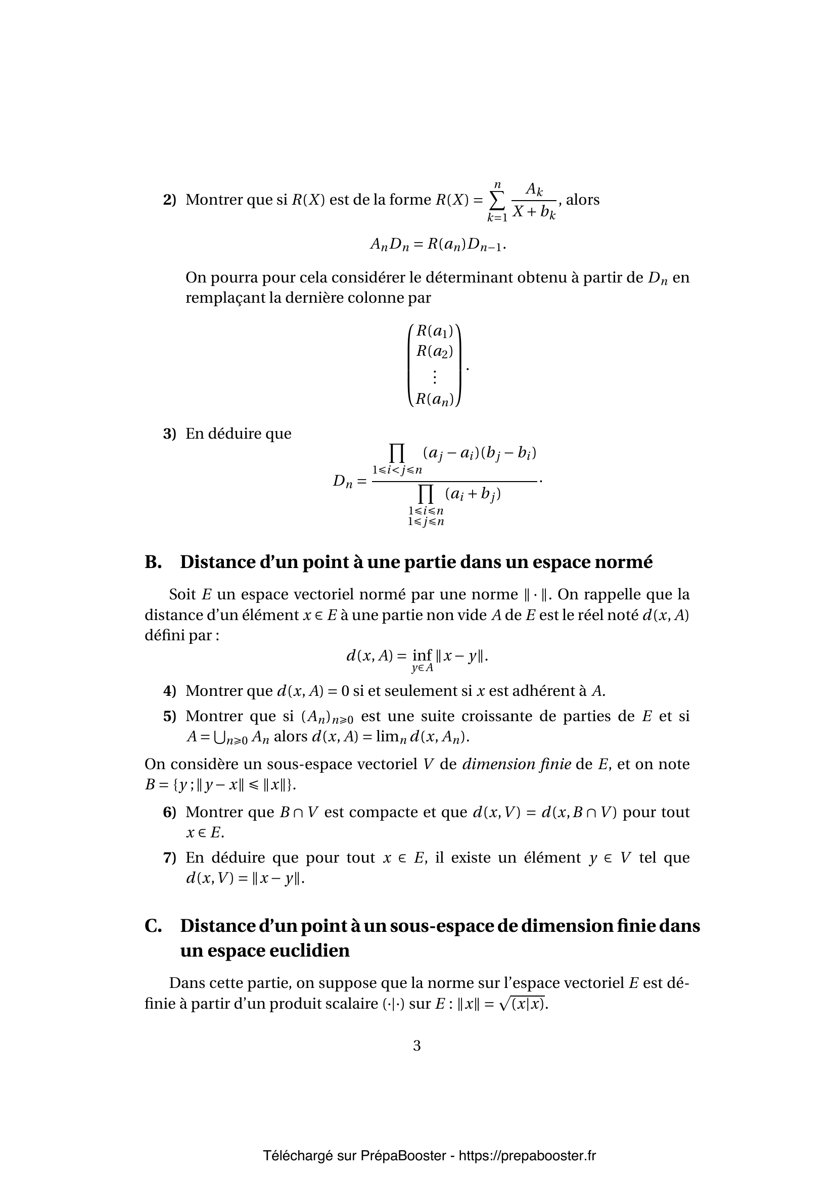 1. Montrer que $(\varphi_\lambda)_{\lambda\geq0}$ est une famille libre de $C([0, 1])$. 2. Montrer que si $R(X)$ est de la forme $R(X) = \sum_{k=1}^n \frac{A_k}{X+b_k}$, alors $A_n D_n = R(a_n) D_{n-1}$.\\ On pourra pour cela considérer le déterminant obtenu à partir de $D_n$ en remplaçant la dernière colonne par \[ \begin{pmatrix} R(a_1) \\ R(a_2) \\ \vdots \\ R(a_n) \end{pmatrix} . \] 3. En déduire que \[ D_n = \frac{\prod_{1\leq iFAQ