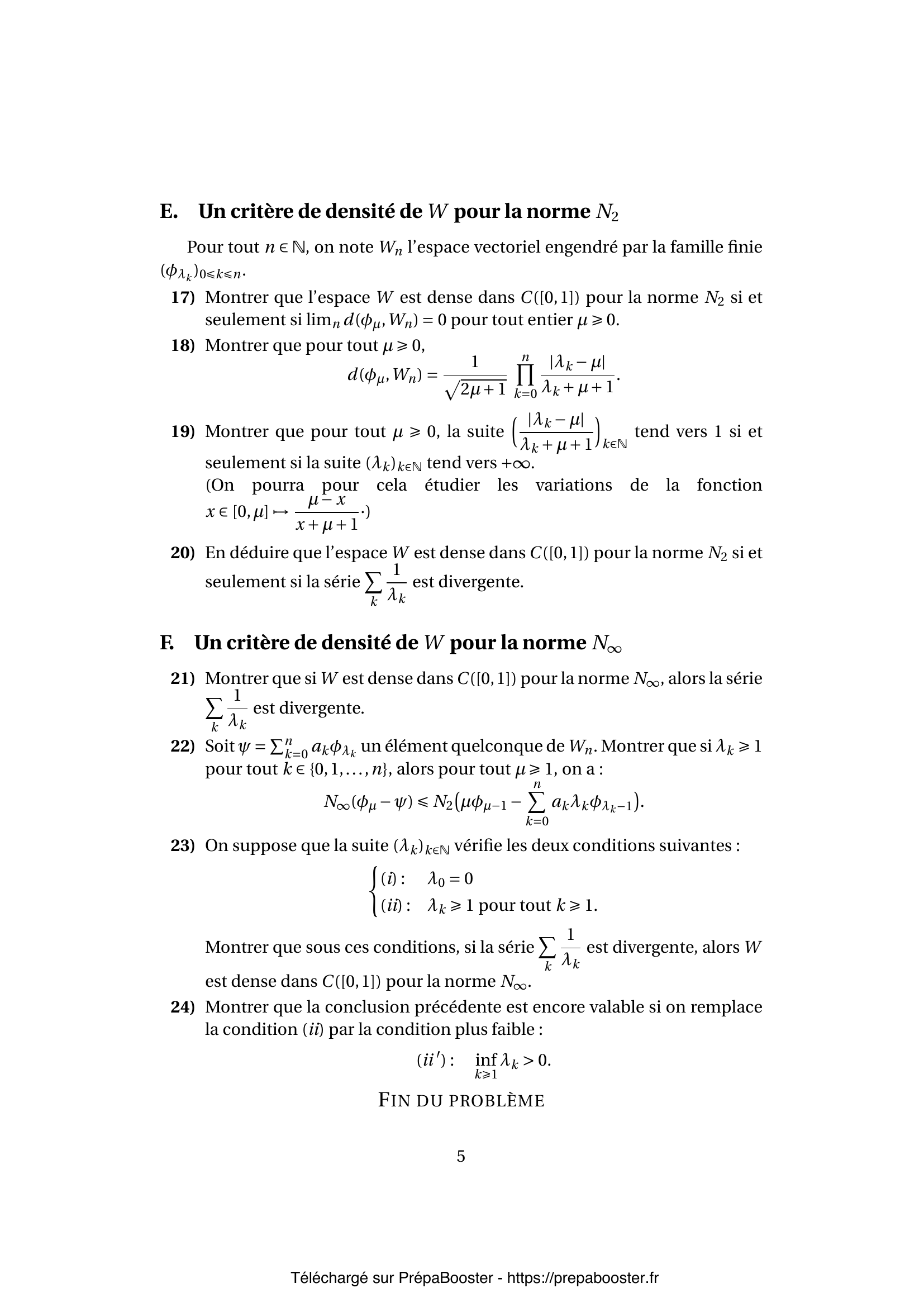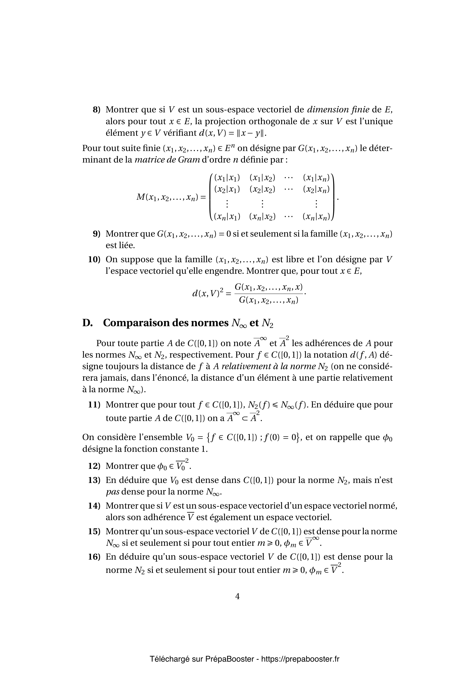 N₂ correspond à la norme euclidienne (celle du carré intégral de la fonction sur [0,1]), tandis que N_∞ est la norme uniforme (le maximum pris sur l’ensemble du segment). Ce sujet te fait travailler sur la comparaison de ces deux normes, leurs conséquences sur la compacité, la densité des sous-espaces, et l’adhérence des familles de fonctions. Les subtilités entre densité pour N₂ ou N_∞ sont centrales pour réussir ce sujet !