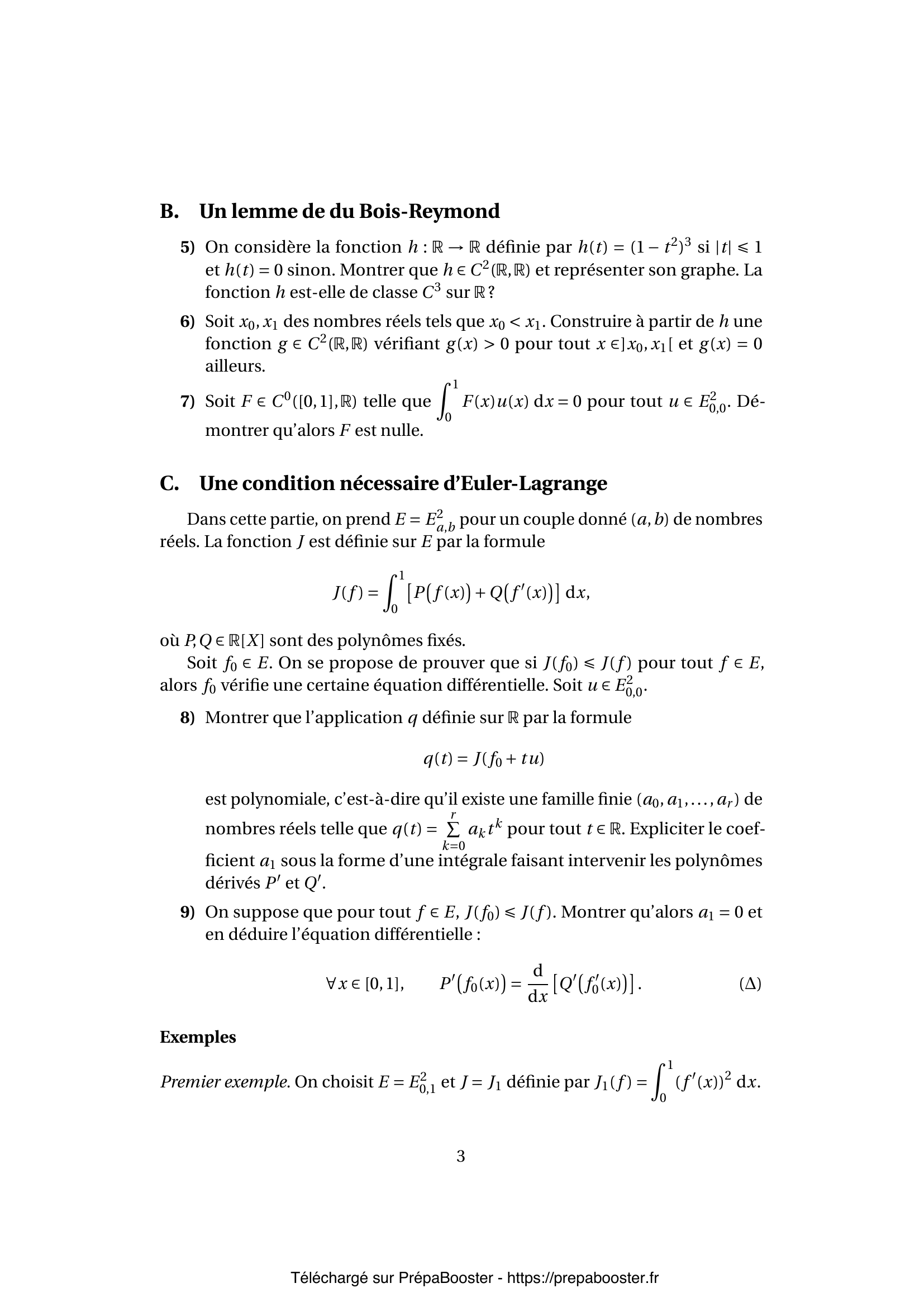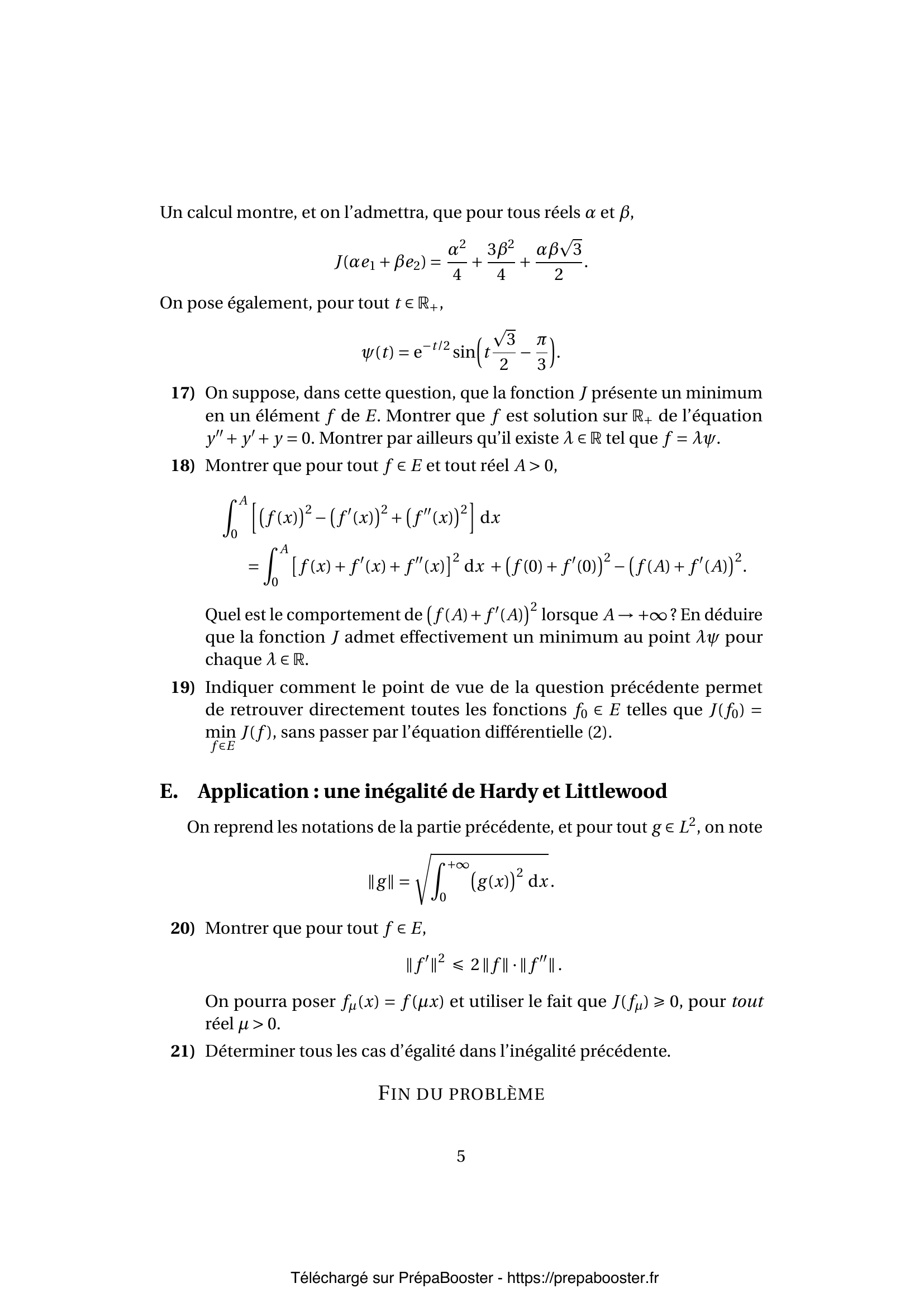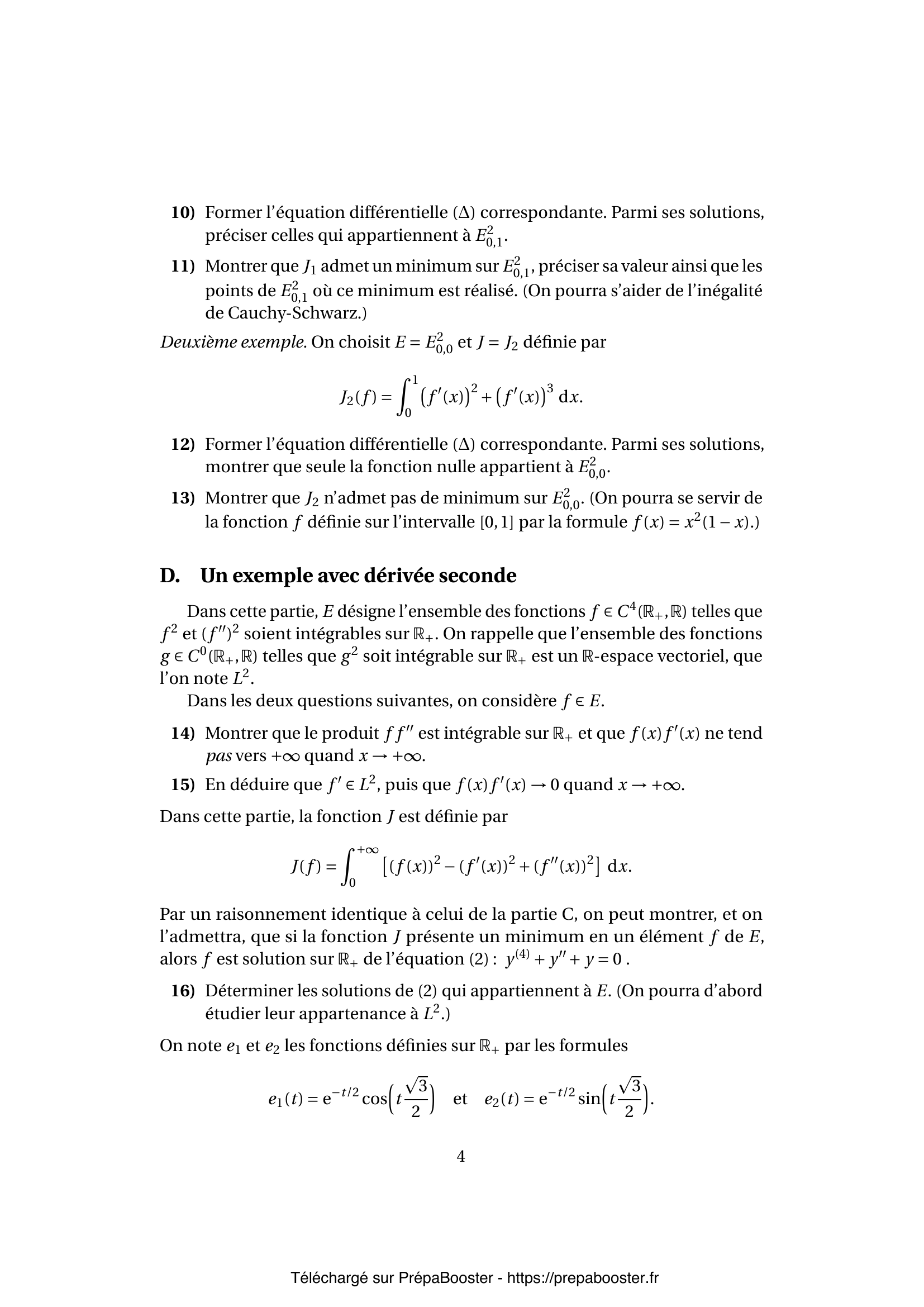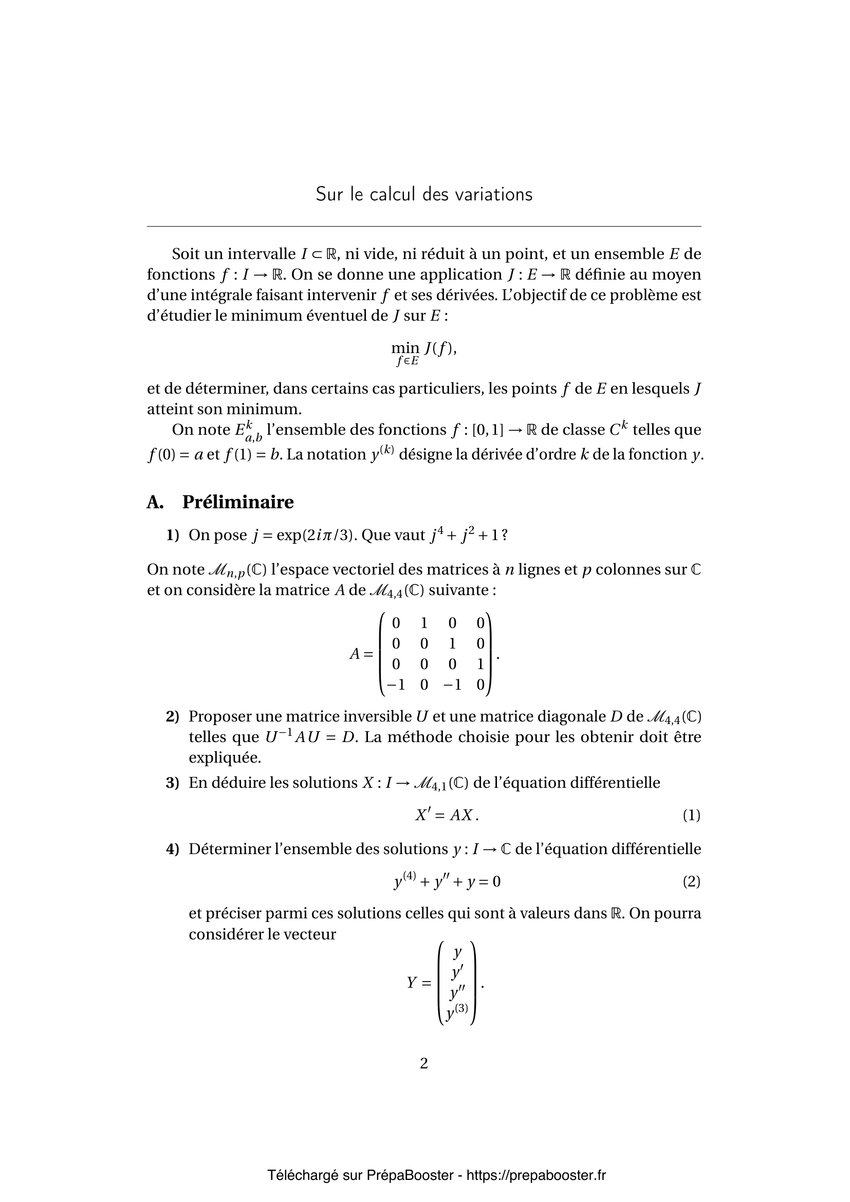 1. 1) On pose $j = \exp(2i\pi/3)$. Que vaut $j^4 + j^2 +1$ ? 2. 2) Proposer une matrice inversible $U$ et une matrice diagonale $D$ de $M_{4,4}(\mathbb{C})$ telles que $U^{-1}AU = D$. La méthode choisie pour les obtenir doit être expliquée. 3. 3) En déduire les solutions $X : I \to M_{4,1}(\mathbb{C})$ de l’équation différentielle $X’ = AX$. 4. 4) Déterminer l’ensemble des solutions $y : I \to \mathbb{C}$ de l’équation différentielle $y^{(4)} + y” + y = 0$ et préciser parmi ces solutions celles qui sont à valeurs dans $\mathbb{R}$. On pourra considérer le vecteur $Y = \begin{pmatrix} y \\ y’ \\ y” \\ y^{(3)} \end{pmatrix}$. 5. 5) On considère la fonction $h : \mathbb{R} \to \mathbb{R}$ définie par $h(t) = (1-t^2)^3$ si $|t| \leq 1$ et $h(t) = 0$ sinon. Montrer que $h \in C^2(\mathbb{R},\mathbb{R})$ et représenter son graphe. La fonction $h$ est-elle de classe $C^3$ sur $\mathbb{R}$?} 6. 6) Soit $x_0, x_1$ des nombres réels tels que $x_0 < x_1$. Construire à partir de $h$ une fonction $g \in C^2(\mathbb{R},\mathbb{R})$ vérifiant $g(x) > 0$ pour tout $x \in ]x_0, x_1[$ et $g(x) = 0$ ailleurs. 7. 7) Soit $F \in C^0([0,1],\mathbb{R})$ telle que $\int_0^1 F(x)u(x)\ \mathrm{d}x = 0$ pour tout $u \in E^2_{0,0}$. Démontrer qu’alors $F$ est nulle. 8. 8) Montrer que l’application $q$ définie sur $\mathbb{R}$ par la formule $q(t) = J(f_0 + tu)$ est polynomiale, c’est-à-dire qu’il existe une famille finie $(a_0, a_1,\dots, a_r)$ de nombres réels telle que $q(t) = \sum_{k=0}^r a_k t^k$ pour tout $t\in\mathbb{R}$. Expliciter le coefficient $a_1$ sous la forme d’une intégrale faisant intervenir les polynômes dérivés $P’$ et $Q’$. 9. 9) On suppose que pour tout $f \in E$, $J(f_0) \leq J(f)$. Montrer qu’alors $a_1 = 0$ et en déduire l’équation différentielle :\\ $\forall x \in [0, 1],\:\: P’\big(f_0(x)\big) = \dfrac{\mathrm{d}}{\mathrm{d}x} \left[ Q’\big(f_0′(x)\big) \right]$. 10. 10) Former l’équation différentielle correspondante dans le premier exemple ($E = E^2_{0,1}$ et $J_1(f) = \int_0^1 (f'(x))^2\, \mathrm{d}x$). Parmi ses solutions, préciser celles qui appartiennent à $E^2_{0,1}$.} 11. 11) Montrer que $J_1$ admet un minimum sur $E^2_{0,1}$, préciser sa valeur ainsi que les points de $E^2_{0,1}$ où ce minimum est réalisé. (On pourra s’aider de l’inégalité de Cauchy-Schwarz.) 12. 12) Former l’équation différentielle correspondante dans le second exemple ($E = E^2_{0,0}$ et $J_2(f) = \int_0^1 (f'(x))^2 + (f'(x))^3\, \mathrm{d}x$). Parmi ses solutions, montrer que seule la fonction nulle appartient à $E^2_{0,0}$. 13. 13) Montrer que $J_2$ n’admet pas de minimum sur $E^2_{0,0}$. (On pourra se servir de la fonction $f$ définie sur l’intervalle $[0, 1]$ par la formule $f(x) = x^2(1-x)$. 14. 14) Montrer que le produit $f f”$ est intégrable sur $\mathbb{R}_+$ et que $f(x)f'(x)$ ne tend pas vers $+\infty$ quand $x \rightarrow +\infty$. 15. 15) En déduire que $f’ \in L^2$, puis que $f(x)f'(x) \to 0$ quand $x \rightarrow +\infty$.} 16. 16) Déterminer les solutions de $(2)$ qui appartiennent à $E$. (On pourra d’abord étudier leur appartenance à $L^2$.) 17. 17) On suppose, dans cette question, que la fonction $J$ présente un minimum en un élément $f$ de $E$. Montrer que $f$ est solution sur $\mathbb{R}_+$ de l’équation $y” + y’ + y = 0$. Montrer par ailleurs qu’il existe $\lambda \in \mathbb{R}$ tel que $f = \lambda\psi$. 18. 18) Montrer que pour tout $f \in E$ et tout réel $A > 0$, $$ \int_0^A \left[ \left(f(x)\right)^2 – \left(f'(x)\right)^2 + \left(f”(x)\right)^2 \right]\, \mathrm{d}x = \int_0^A \left[ f(x)+f'(x)+f”(x)\right]^2\,\mathrm{d}x + \big(f(0)+f'(0)\big)^2 – \big(f(A)+f'(A)\big)^2. $$ Quel est le comportement de $\left( f(A)+f'(A)\right)^2$ lorsque $A \to +\infty$? En déduire que la fonction $J$ admet effectivement un minimum au point $\lambda\psi$ pour chaque $\lambda \in \mathbb{R}$. 19. 19) Indiquer comment le point de vue de la question précédente permet de retrouver directement toutes les fonctions $f_0 \in E$ telles que $J(f_0) = \min_{f \in E} J(f)$, sans passer par l’équation différentielle $(2)$. 20. 20) Montrer que pour tout $f \in E$, $$ \|f’\|^2 \leq 2\|f\|\cdot\|f”\|. $$ On pourra poser $f_\mu(x) = f(\mu x)$ et utiliser le fait que $J(f_\mu) \geq 0$, pour tout réel $\mu > 0$.} 21. 21) Déterminer tous les cas d’égalité dans l’inégalité précédente.}FAQ