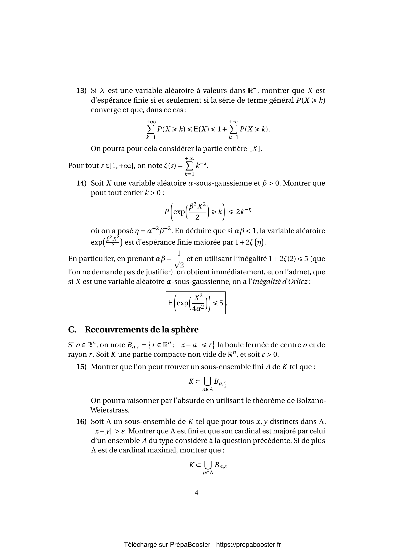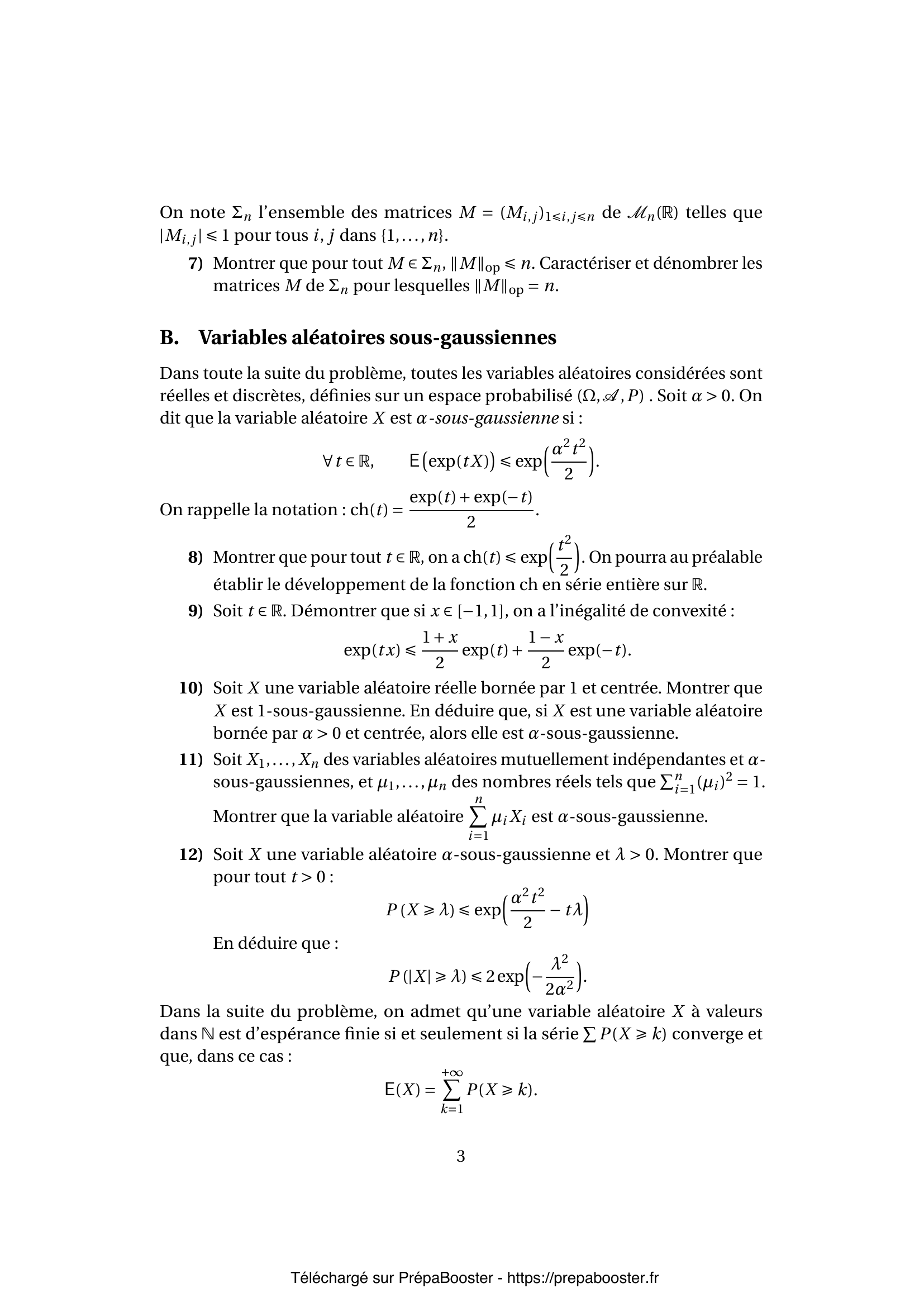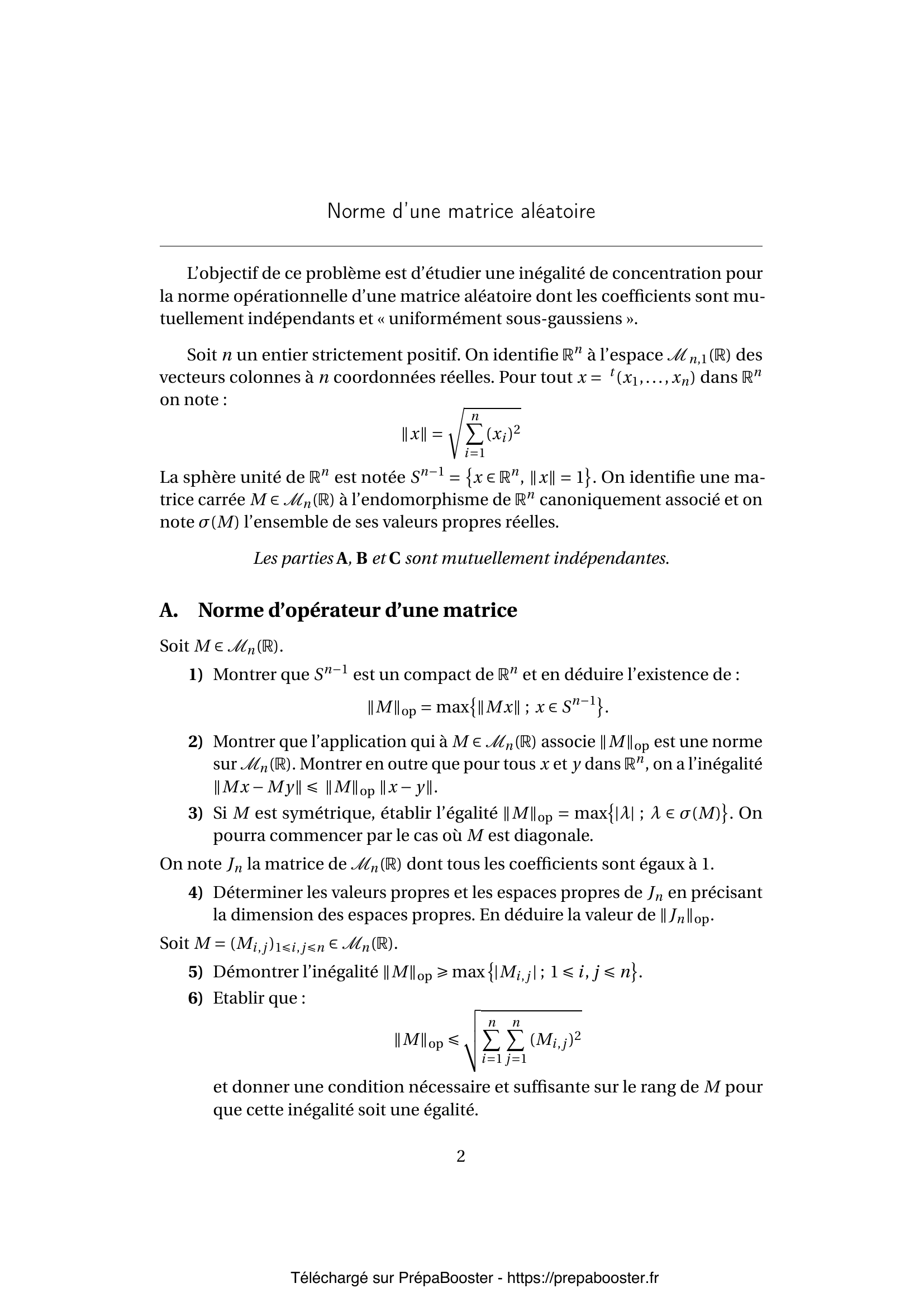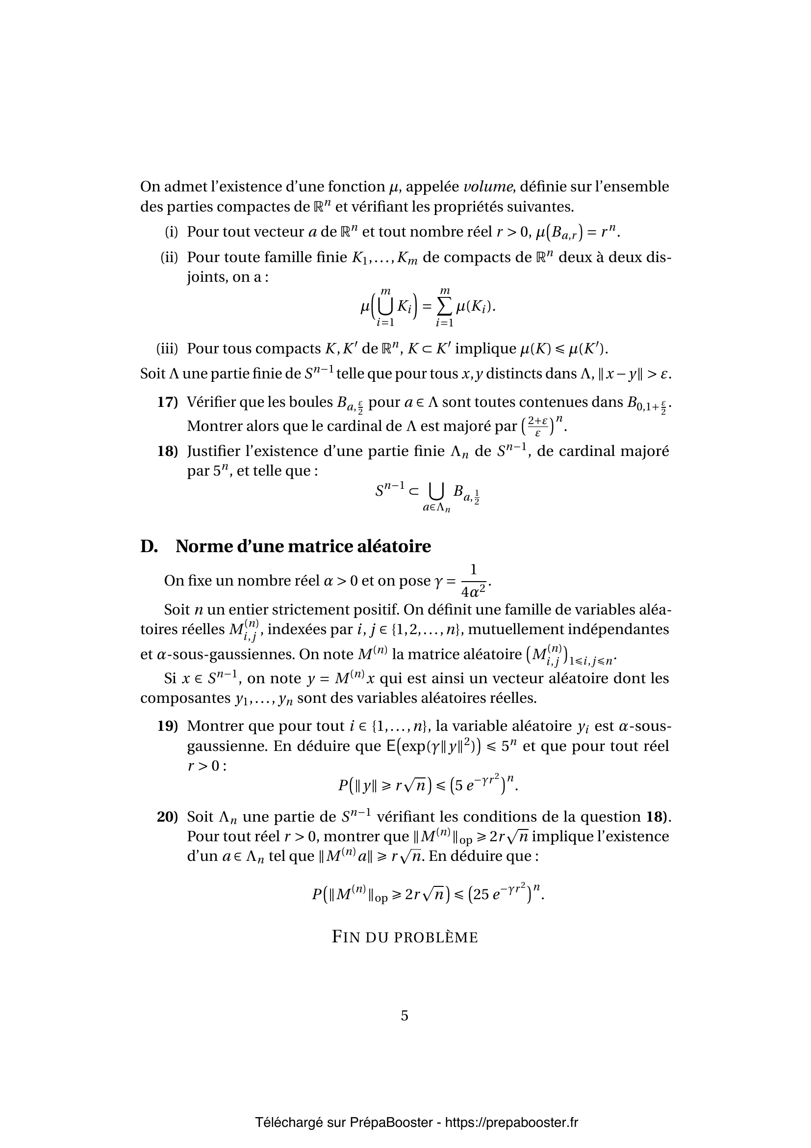 1. Montrer que $S_{n−1}$ est un compact de $\R^n$ et en déduire l’existence de :\\ $\|M\|_{op} = \max \{ \|Mx\| ; x \in S_{n−1} \}$. 2. Montrer que l’application qui à $M \in M_n(\R)$ associe $\|M\|_{op}$ est une norme sur $M_n(\R)$. Montrer en outre que pour tous $x$ et $y$ dans $\R^n$, on a l’inégalité $\|M x − M y\| \leq \|M\|_{op} \|x − y\|$. 3. Si $M$ est symétrique, établir l’égalité $\|M\|_{op} = \max\{|\lambda| ; \lambda \in \sigma(M)\}$. On pourra commencer par le cas où $M$ est diagonale. 4. On note $J_n$ la matrice de $M_n(\R)$ dont tous les coefficients sont égaux à $1$.\\ Déterminer les valeurs propres et les espaces propres de $J_n$ en précisant la dimension des espaces propres. En déduire la valeur de $\|J_n\|_{op}$. 5. Soit $M = (M_{i,j})_{1 \leq i,j \leq n} \in M_n(\R)$.\\ Démontrer l’inégalité $\|M\|_{op} \geq \max\{ |M_{i,j}| ; 1 \leq i, j \leq n \}$.} 6. Établir que :\\ $\|M\|_{op} \leq \sqrt{ \sum_{i=1}^n \sum_{j=1}^n (M_{i,j})^2 }$\\ et donner une condition nécessaire et suffisante sur le rang de $M$ pour que cette inégalité soit une égalité. 7. On note $\Sigma_n$ l’ensemble des matrices $M = (M_{i,j})_{1 \leq i,j \leq n}$ de $M_n(\R)$ telles que $|M_{i,j}| \leq 1$ pour tous $i, j$ dans $\{1,…,n\}$.\\ Montrer que pour tout $M \in \Sigma_n$, $\|M\|_{op} \leq n$. Caractériser et dénombrer les matrices $M$ de $\Sigma_n$ pour lesquelles $\|M\|_{op} = n$. 8. Montrer que pour tout $t \in \R$, on a $\cosh(t) \leq \exp\left( \frac{t^2}{2} \right)$. On pourra au préalable établir le développement de la fonction cosh en série entière sur $\R$. 9. Soit $t \in \R$. Démontrer que si $x \in [-1, 1]$, on a l’inégalité de convexité :\\ $\exp(tx) \leq \frac{1+ x}{2}\exp(t)+\frac{1- x}{2}\exp(−t)$. 10. Soit $X$ une variable aléatoire réelle bornée par $1$ et centrée. Montrer que $X$ est $1$-sous-gaussienne. En déduire que, si $X$ est une variable aléatoire bornée par $\alpha > 0$ et centrée, alors elle est $\alpha$-sous-gaussienne.} 11. Soit $X_1,…,X_n$ des variables aléatoires mutuellement indépendantes et $\alpha$-sous-gaussiennes, et $\mu_1,…,\mu_n$ des nombres réels tels que $\sum_{i=1}^n (\mu_i)^2 = 1$.\\ Montrer que la variable aléatoire $\sum_{i=1}^n \mu_i X_i$ est $\alpha$-sous-gaussienne. 12. Soit $X$ une variable aléatoire $\alpha$-sous-gaussienne et $\lambda > 0$. Montrer que pour tout $t > 0 :$\\ $\mathbb{P}(X \geq \lambda) \leq \exp\left(\frac{\alpha^2 t^2}{2} – t\lambda\right)$\\ En déduire que : $\mathbb{P}(|X| \geq \lambda) \leq 2 \exp\left(-\frac{\lambda^2}{2\alpha^2}\right)$. 13. Dans la suite du problème, on admet qu’une variable aléatoire $X$ à valeurs dans $\mathbb{N}$ est d’espérance finie si et seulement si la série $\sum \mathbb{P}(X \geq k)$ converge et que, dans ce cas :\\ $\mathbb{E}(X) = \sum_{k=1}^{+\infty} \mathbb{P}(X \geq k)$. 14. Si $X$ est une variable aléatoire à valeurs dans $\mathbb{R}_+$, montrer que $X$ est d’espérance finie si et seulement si la série de terme général $\mathbb{P}(X \geq k)$ converge et que, dans ce cas :\\ $\sum_{k=1}^{+\infty} \mathbb{P}(X \geq k) \leq \mathbb{E}(X) \leq 1+\sum_{k=1}^{+\infty} \mathbb{P}(X \geq k)$.\\ On pourra pour cela considérer la partie entière $\lfloor X \rfloor$. 15. Pour tout $s \in ]1,+\infty[$, on note $\zeta(s) = \sum_{k=1}^{+\infty} k^{-s}$.\\ Soit $X$ une variable aléatoire $\alpha$-sous-gaussienne et $\beta > 0$. Montrer que pour tout entier $k > 0$ :\\ $\mathbb{P}\left(\exp\left(\frac{\beta^2 X^2}{2}\right) \geq k\right) \leq 2k^{-\eta}$\\ où on a posé $\eta = \frac{1}{\alpha^2 \beta^2}$. En déduire que si $\alpha\beta < 1$, la variable aléatoire $\exp\left(\frac{\beta^2 X^2}{2}\right)$ est d’espérance finie majorée par $1+2\zeta(\eta)$.\\ En particulier, en prenant $\alpha\beta = 1/\sqrt{2}$ et en utilisant l’inégalité $1+2\zeta(2) \leq 5$ (que l’on ne demande pas de justifier), on obtient immédiatement, et on l’admet, que si $X$ est une variable aléatoire $\alpha$-sous-gaussienne, on a l’inégalité d’Orlicz :\\ $\mathbb{E} \left( \exp\left(\frac{X^2}{4\alpha^2}\right)\right) \leq 5$.} 16. Si $a \in \R^n$, on note $B_{a,r} = \{ x \in \R^n; \|x-a\| \leq r \}$ la boule fermée de centre $a$ et de rayon $r$. Soit $K$ une partie compacte non vide de $\R^n$, et $\varepsilon > 0$.\\ Montrer que l’on peut trouver un sous-ensemble fini $A$ de $K$ tel que :\\ $K \subset \bigcup_{a\in A} B_{a,\frac{\varepsilon}{2}}$\\ On pourra raisonner par l’absurde en utilisant le théorème de Bolzano-Weierstrass. 17. Soit $\Lambda$ un sous-ensemble de $K$ tel que pour tous $x, y$ distincts dans $\Lambda$, $\|x-y\|>\varepsilon$. Montrer que $\Lambda$ est fini et que son cardinal est majoré par celui d’un ensemble $A$ du type considéré à la question précédente. Si de plus $\Lambda$ est de cardinal maximal, montrer que :\\ $K \subset \bigcup_{a\in \Lambda} B_{a,\varepsilon}$. 18. On admet l’existence d’une fonction $\mu$, appelée volume, définie sur l’ensemble des parties compactes de $\R^n$ et vérifiant certaines propriétés.\\ Soit $\Lambda$ une partie finie de $S^{n−1}$ telle que pour tous $x,y$ distincts dans $\Lambda$, $\|x – y\| > \varepsilon$.\\ Vérifier que les boules $B_{a, \varepsilon/2}$ pour $a \in \Lambda$ sont toutes contenues dans $B_{0,1+\varepsilon/2}$. Montrer alors que le cardinal de $\Lambda$ est majoré par $\left(\frac{2+\varepsilon}{\varepsilon}\right)^n$. 19. Justifier l’existence d’une partie finie $\Lambda_n$ de $S^{n−1}$, de cardinal majoré par $5^n$, et telle que :\\ $S^{n-1} \subset \bigcup_{a \in \Lambda_n} B_{a, \frac{1}{2}}$ 20. On fixe un nombre réel $\alpha > 0$ et on pose $\gamma = \frac{1}{4\alpha^2}$.\\ Soit $n$ un entier strictement positif. On définit une famille de variables aléatoires réelles $M_{i,j}^{(n)}$, indexées par $i, j \in \{1,2,…,n\}$, mutuellement indépendantes et $\alpha$-sous-gaussiennes. On note $M^{(n)