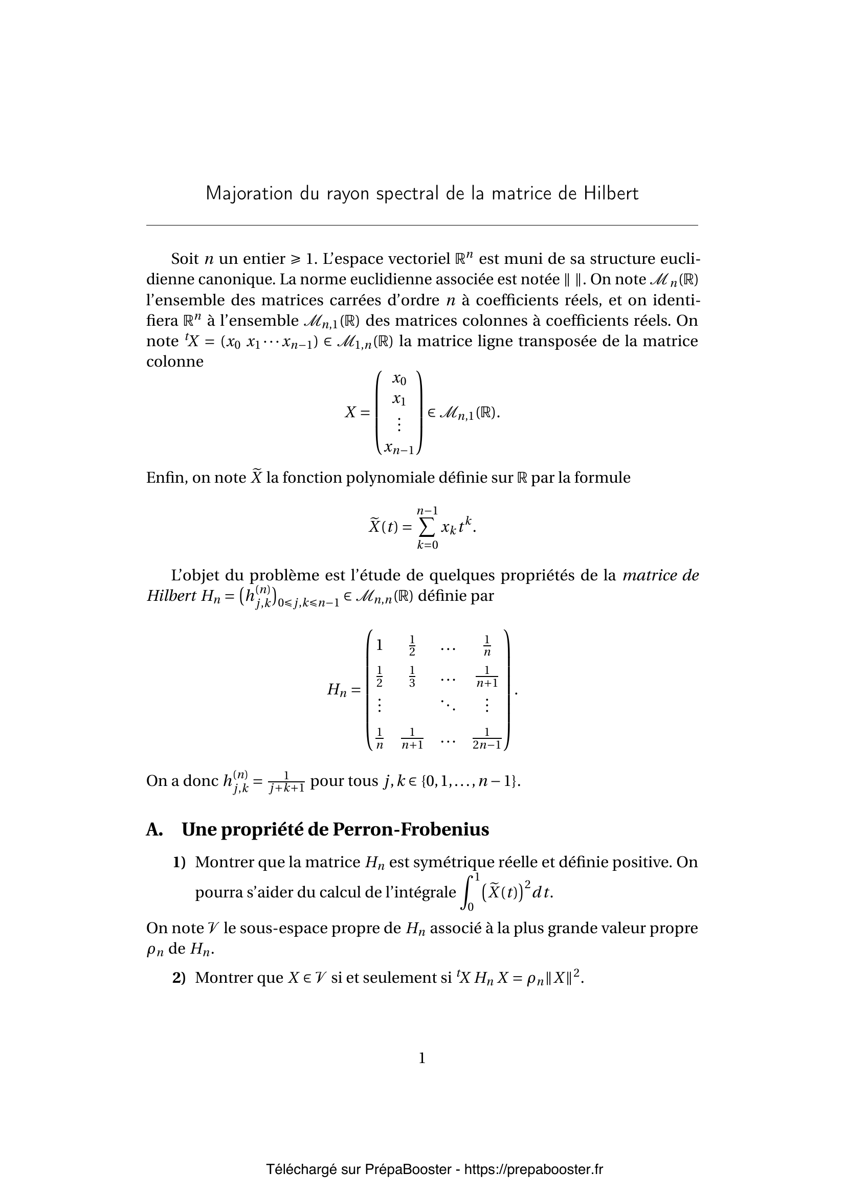 1. Montrer que la matrice $H_n$ est symétrique réelle et définie positive. On pourra s’aider du calcul de l’intégrale $\int_0^1 \left(X_e(t)\right)^2 dt$.