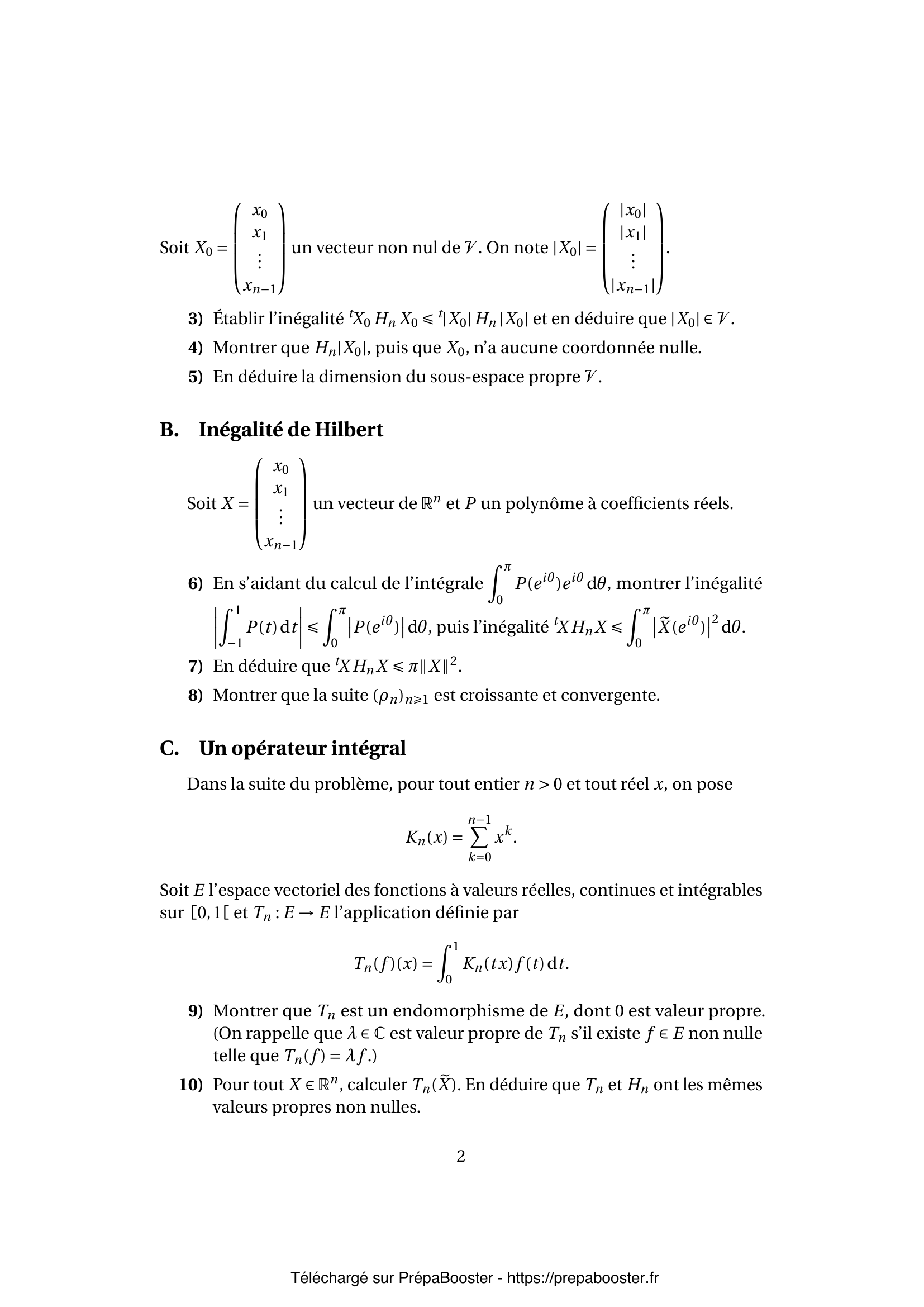 Pour montrer qu’une matrice \( H_n \) est symétrique réelle, tu vérifies que \( H_n = {}^t H_n \). Pour la partie définie positive, tu peux utiliser le calcul d’une intégrale comme \( \int_0^1 (X_e(t))^2 dt \) et montrer que \( {}^t X H_n X > 0 \) pour tout vecteur \( X \) non nul. C’est une technique classique en algèbre linéaire, surtout en CPGE MP.
