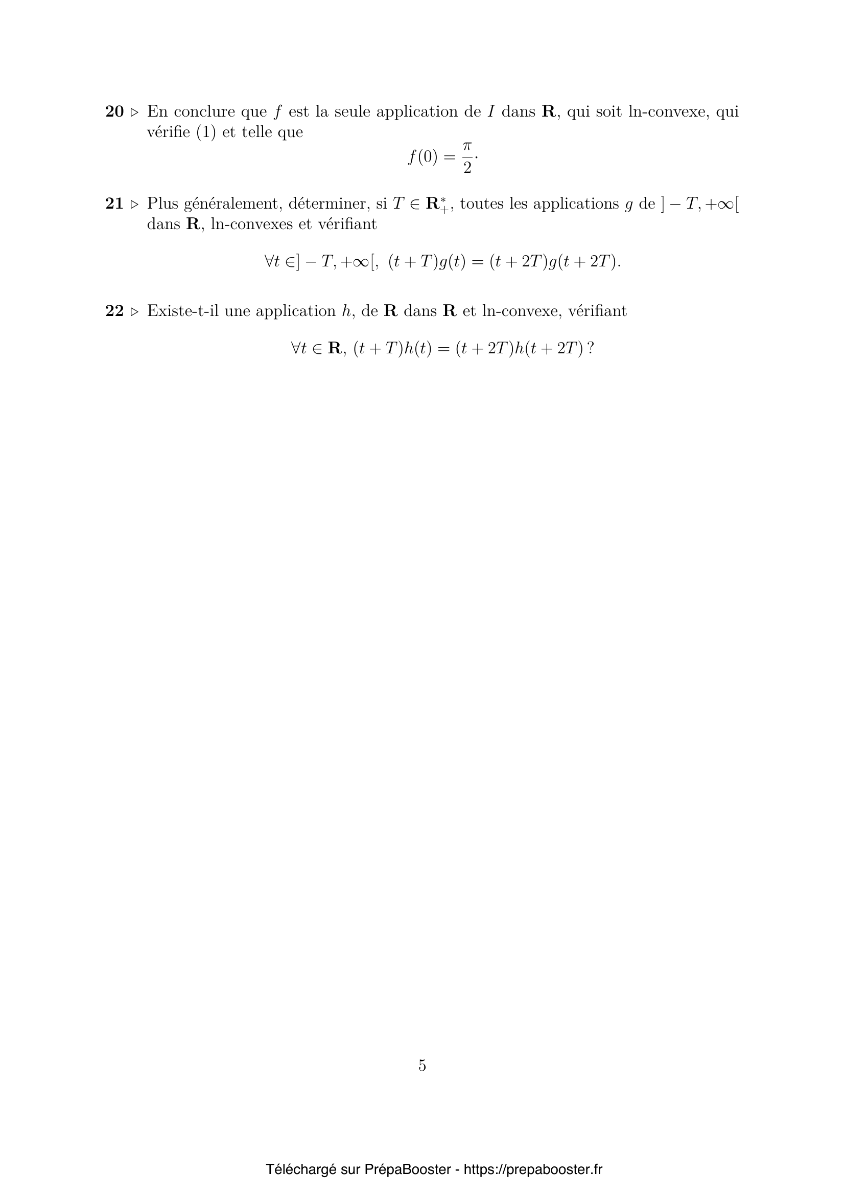 20. En conclure que $f$ est la seule application de $I$ dans $\mathbb{R}$, qui soit ln-convexe, qui vérifie (1) et telle que $f(0) = \frac{\pi}{2}$.}