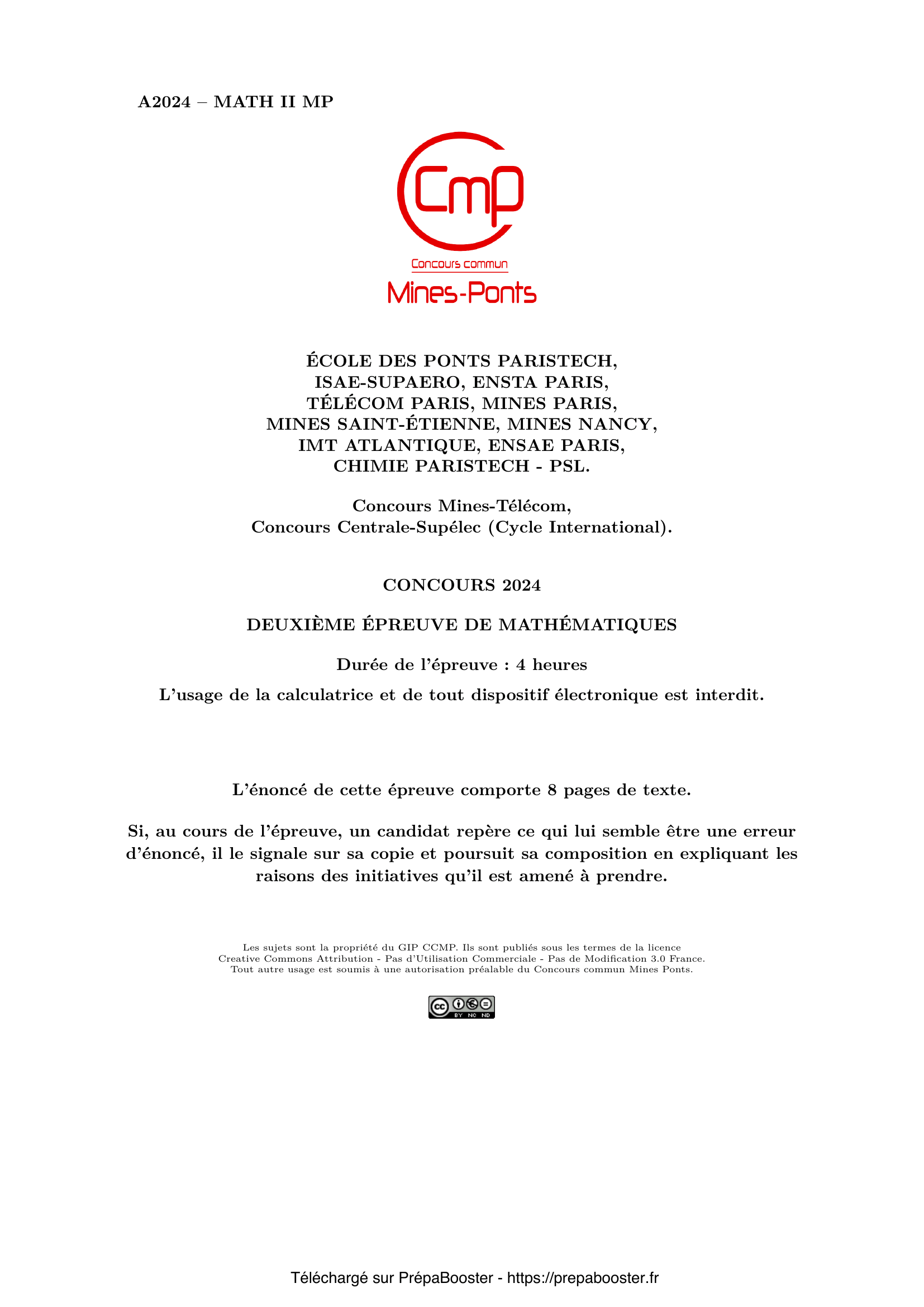Ce sujet de Mathématiques du concours Mines Ponts MPI 2024 correspond aux épreuves disponibles sur le site officiel du concours Mines Ponts. Retrouve sur Prépa Booster toutes les ressources nécessaires pour ta préparation, y compris les corrigés détaillés.