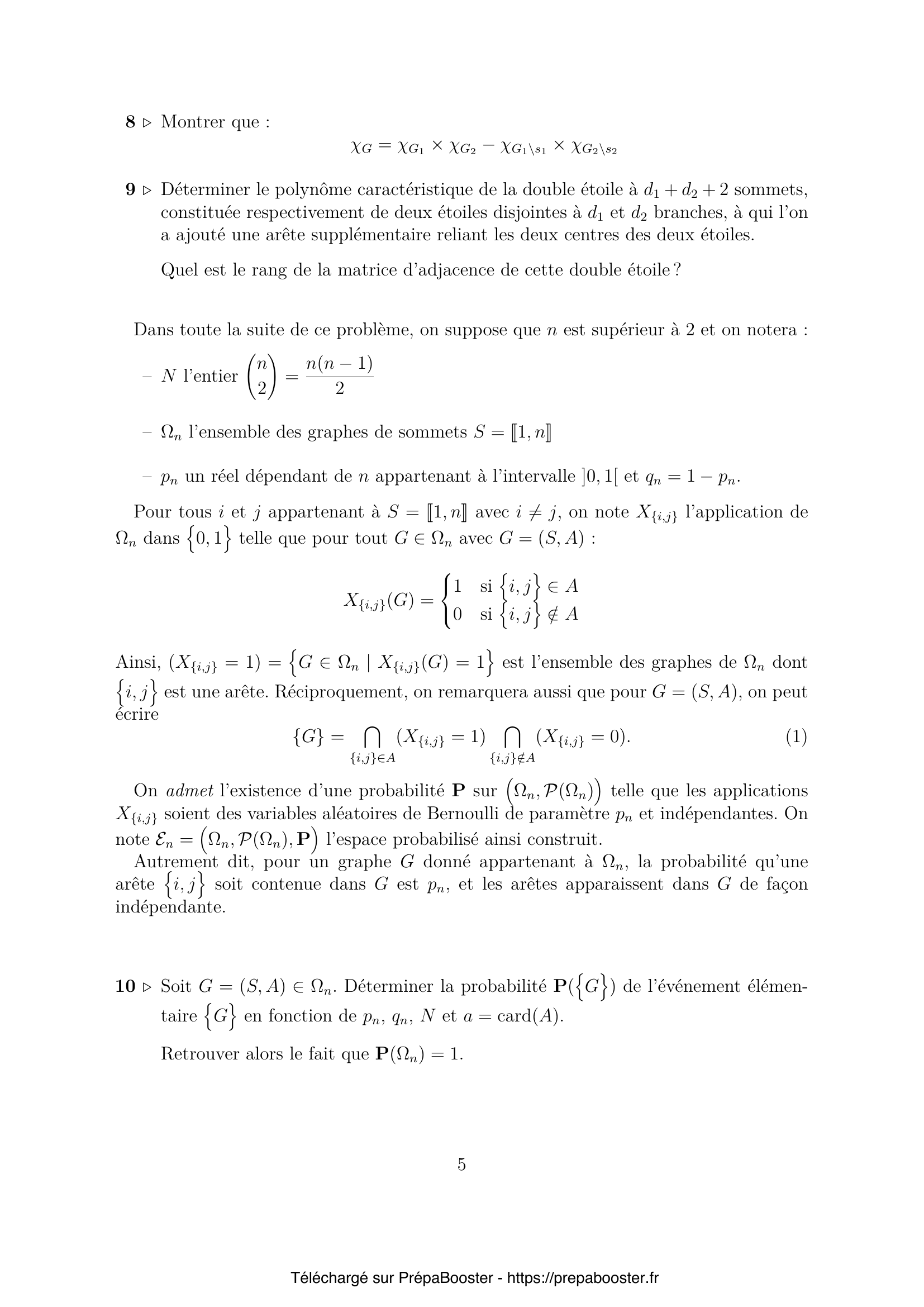 10. 10~Û Soit \( G = (S, A) \in \mathcal{N}_n \). Déterminer la probabilité \( P(\{G\}) \) de l’événement élémentaire \( \{G\} \) en fonction de \( p_n, q_n, N \) et \( a = \operatorname{card}(A) \).\\