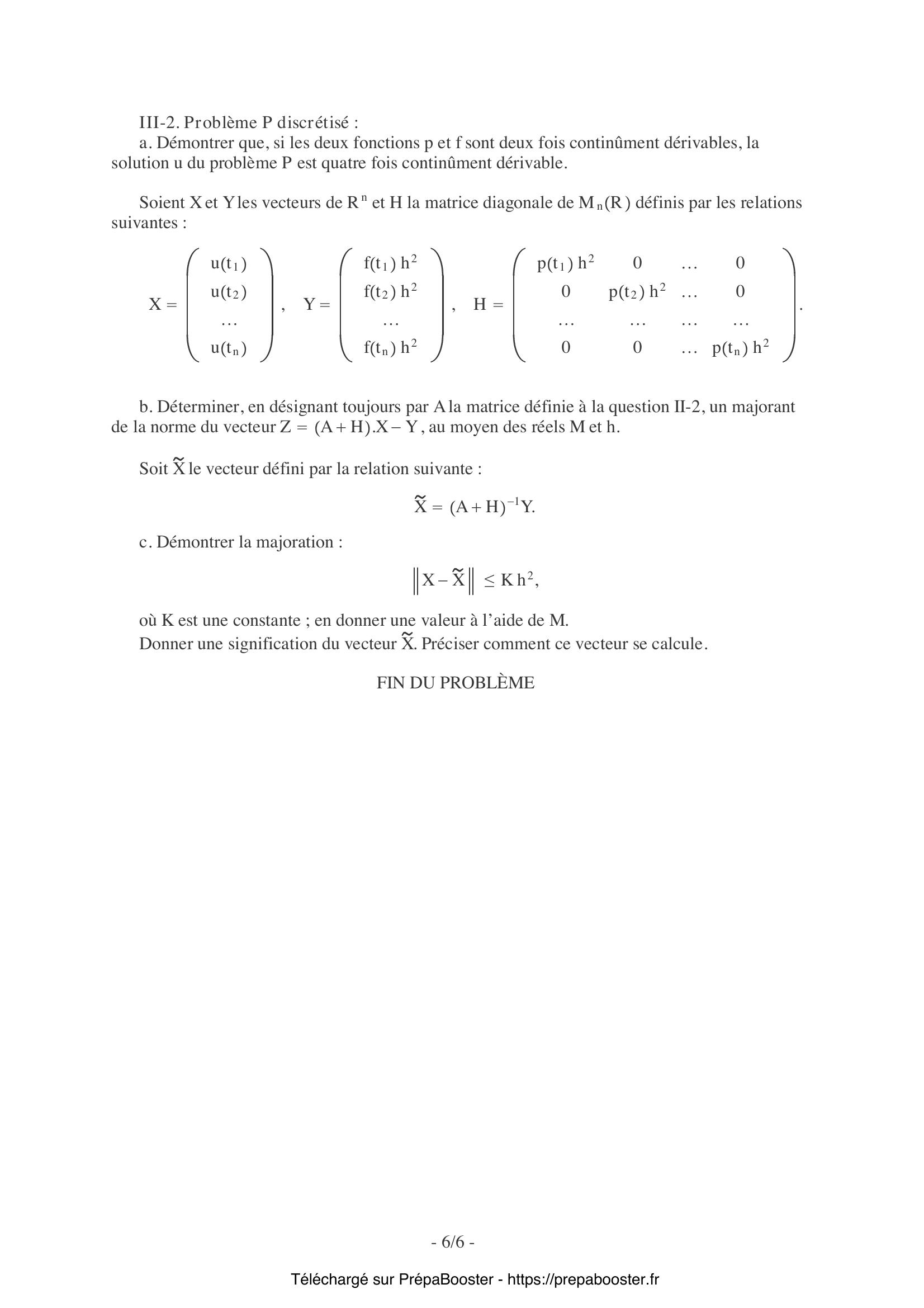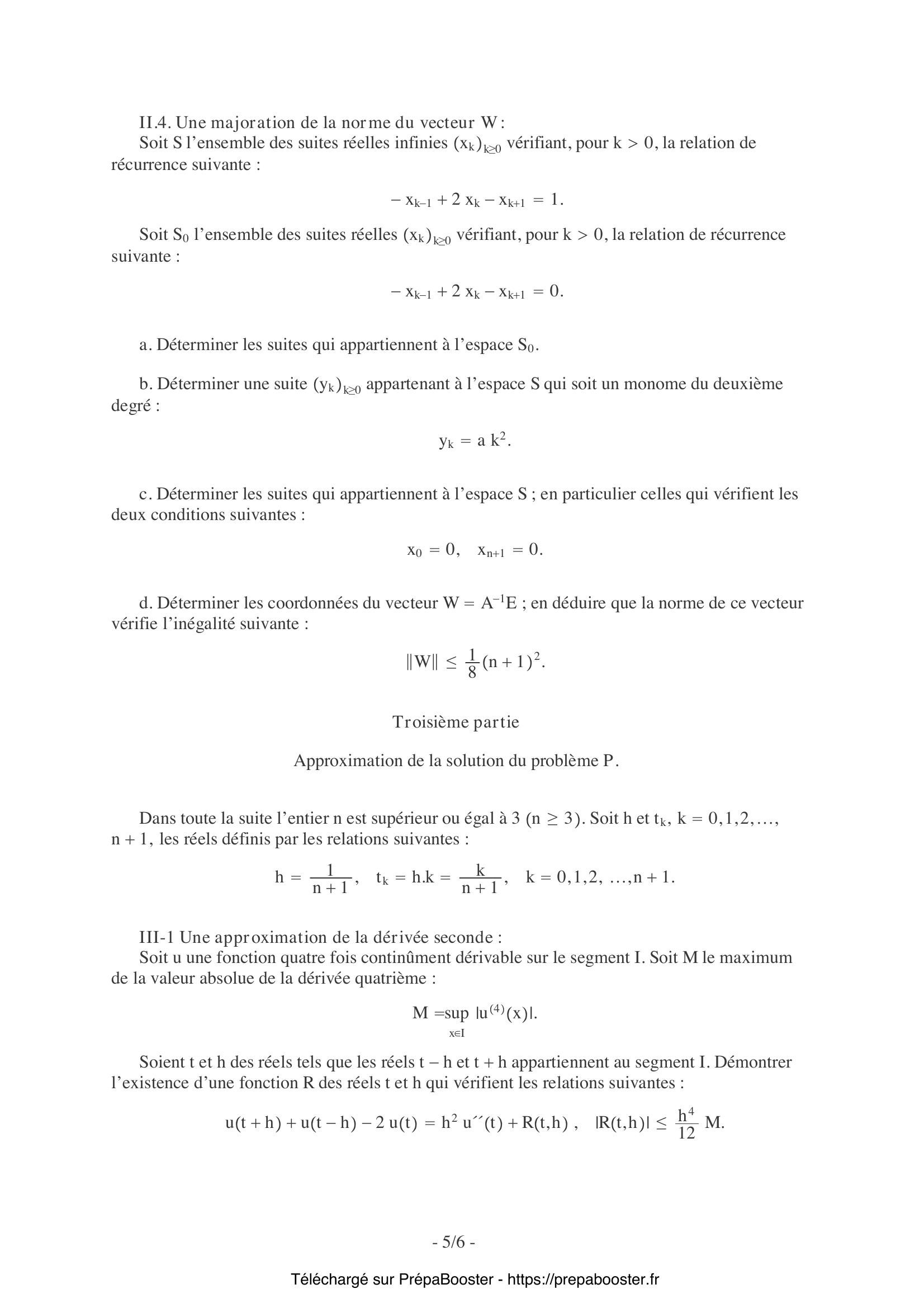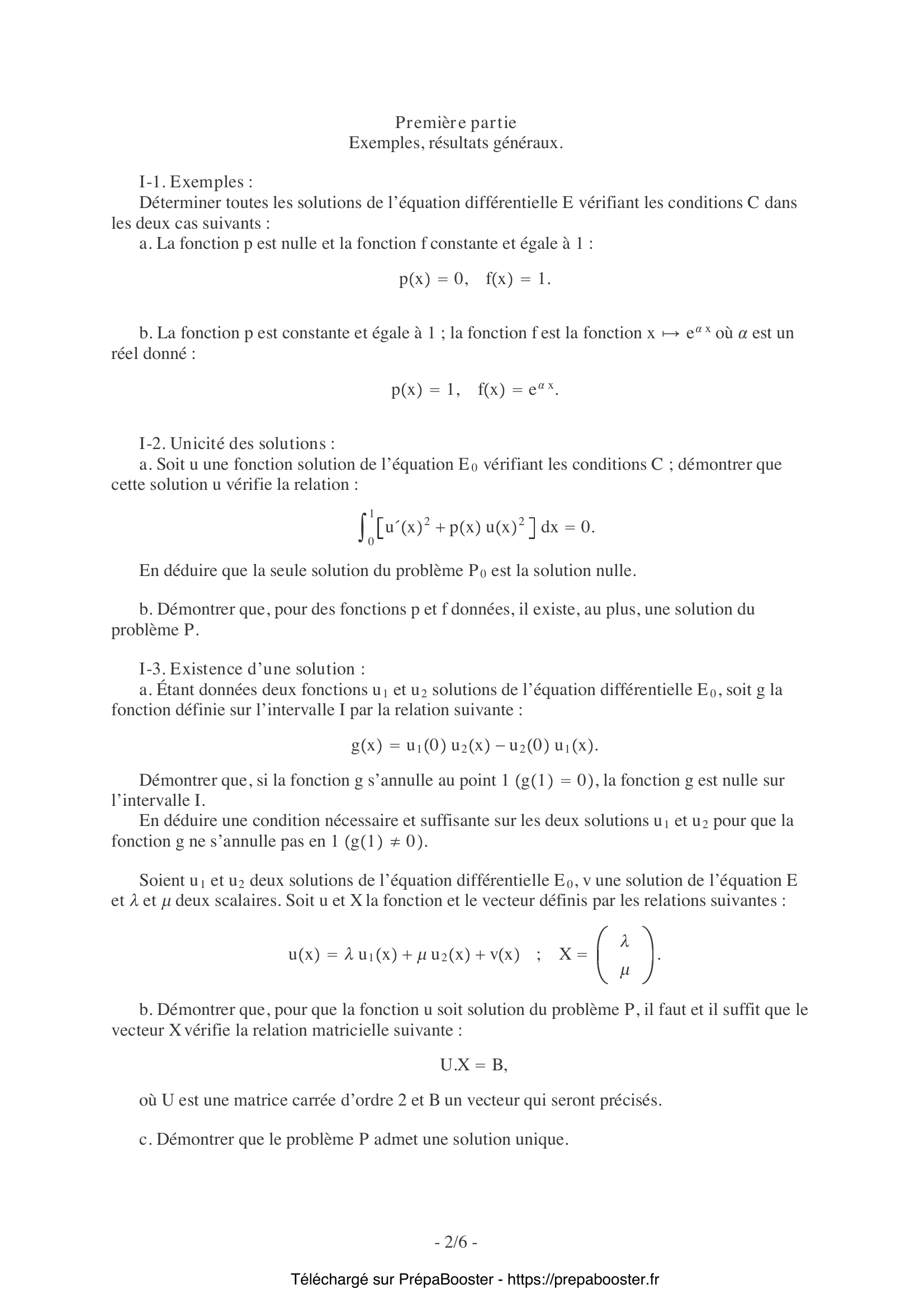 1. I-1. Exemples :\\ Déterminer toutes les solutions de l’équation différentielle E vérifiant les conditions C dans les deux cas suivants :\\ a. La fonction $p$ est nulle et la fonction $f$ constante et égale à 1 :\\ $p(x) = 0$, $f(x) = 1$.\\ b. La fonction $p$ est constante et égale à 1 ; la fonction $f$ est la fonction $x \mapsto e^{\alpha x}$ où $\alpha$ est un réel donné :\\ $p(x) = 1$, $f(x) = e^{\alpha x}$. 2. I-2. Unicité des solutions :\\ a. Soit $u$ une fonction solution de l’équation $E_0$ vérifiant les conditions $C$ ; démontrer que cette solution $u$ vérifie la relation :\\ \[ \int_0^1 u'(x)^2 + p(x) u(x)^2 \, dx = 0. \] En déduire que la seule solution du problème $P_0$ est la solution nulle.\\ b. Démontrer que, pour des fonctions $p$ et $f$ données, il existe, au plus, une solution du problème $P$. 3. I-3. Existence d’une solution :\\ a. Étant données deux fonctions $u_1$ et $u_2$ solutions de l’équation différentielle $E_0$, soit $g$ la fonction définie sur l’intervalle $I$ par la relation suivante :\\ $g(x) = u_1(0) u_2(x) – u_2(0) u_1(x)$.\\ Démontrer que, si la fonction $g$ s’annulle au point 1 ($g(1) = 0$), la fonction $g$ est nulle sur l’intervalle $I$.\\ En déduire une condition nécessaire et suffisante sur les deux solutions $u_1$ et $u_2$ pour que la fonction $g$ ne s’annulle pas en 1 ($g(1) \ne 0$).\\ Soient $u_1$ et $u_2$ deux solutions de l’équation différentielle $E_0$, $v$ une solution de l’équation $E$ et $\alpha$ et $\beta$ deux scalaires. Soit $u$ et $X$ la fonction et le vecteur définis par les relations suivantes :\\ $u(x) = \alpha u_1(x) + \beta u_2(x) + v(x)$ ; $X = (\alpha,\,\beta)^T$. 4. I-3.b. Démontrer que, pour que la fonction $u$ soit solution du problème $P$, il faut et il suffit que le vecteur $X$ vérifie la relation matricielle suivante :\\ $U.X = B,$\\ où $U$ est une matrice carrée d’ordre $2$ et $B$ un vecteur qui seront précisés. 5. I-3.c. Démontrer que le problème $P$ admet une solution unique.} 6. II-1. Quelques propriétés matricielles :\\ Soit $A = (a_{ij})_{1 \leq i \leq n,\, 1 \leq j \leq n}$ une matrice carrée de $\mathcal{M}_n(\mathbb{R})$ :\\ a. Démontrer que, pour que cette matrice $A$ soit positive, il faut et il suffit que le vecteur image de tout vecteur de la base canonique de $\mathbb{R}^n$ soit positif.\\ b. Établir la propriété : pour tout vecteur $X$ de $\mathbb{R}^n$,\\ \[ |A.X| \leq N(A)\,|X|. \] 7. II-1.c. Démontrer, pour une matrice $A$ positive, la relation :\\ \[ N(A) = \max_{1 \leq i \leq n}\, \sum_{j=1}^n a_{ij}. \] Comparer les deux expressions $N(A)$ et $A \cdot E$ ; en déduire la norme de la matrice $A$. 8. II-1.d. Soit $A$ une matrice de $\mathcal{M}_n(\mathbb{R})$ possédant la propriété suivante : chaque fois qu’un vecteur $X$ de $\mathbb{R}^n$ a une image positive ($A.X \geq 0$), le vecteur $X$ est positif ($X \geq 0$). Démontrer que la matrice $A$ est injective puis qu’elle est inversible et que son inverse $A^{-1}$ est une matrice positive. 9. II-2. Un exemple :\\ Soient $A$ et $H$ les deux matrices carrées d’ordre $n$ suivantes :\\ Les termes de la matrice $A$ situés sur la diagonale principale sont égaux à $2$, ceux situés juste au-dessus et juste au-dessous à $1$, les autres sont nuls.\\ La matrice $H$ est diagonale et positive ; les termes $h_i$, $1 \leq i \leq n$, de la diagonale principale sont positifs ou nuls $h_i \geq 0$ : \[ A = \begin{pmatrix} 2 & 1 & 0 & \cdots & 0 \\ 1 & 2 & 1 & \cdots & 0 \\ 0 & 1 & 2 & \cdots & 0 \\ \vdots & \vdots & \vdots & \ddots & \vdots \\ 0 & 0 & 0 & \cdots & 2 \\ \end{pmatrix} \quad H = \begin{pmatrix} h_1 & 0 & \cdots & 0 \\ 0 & h_2 & \cdots & 0 \\ 0 & 0 & \cdots & 0 \\ 0 & 0 & \cdots & h_n \\ \end{pmatrix} \] a. Soit $X$ un vecteur de $\mathbb{R}^n$ de coordonnées $x_i$, $i=1,2,\ldots,n$, tel que le vecteur $(A + H).X$ soit positif.\\ Démontrer que le vecteur $X$ est positif à l’aide d’un raisonnement par l’absurde, par exemple, en complétant la suite $x_i\, (1 \leq i \leq n)$ par des termes $x_0$ et $x_{n+1}$ nuls ($x_0 = x_{n+1} = 0)$, et en considérant l’entier $k$ pour lequel le réel $x_k$ est égal au plus petit des réels $x_i$, $0 \leq i \leq n + 1$ :\\ $x_k = \min_{0 \leq i \leq n+1} x_i$. 10. II-2.b. Déduire du résultat précédent que les deux matrices $A + H$ et $A$ sont inversibles.} 11. II-3. Norme de la matrice $(A + H)^{-1}$ :\\ Soient $V$ et $W$ les deux vecteurs définis par les relations suivantes :\\ $V = (A + H)^{-1} E$, $W = A^{-1} E$.\\ a. Démontrer que ces vecteurs sont positifs ainsi que le vecteur $AW – V$.\\ b. Comparer les normes des deux vecteurs $V$ et $W$ ; en déduire : pour tout vecteur $X$ de $\mathbb{R}^n$,\\ \[ |(A + H)^{-1} X| \leq ||W||\, |X|. \] 12. II-4. Une majoration de la norme du vecteur $W$ :\\ Soit $\mathcal{S}$ l’ensemble des suites réelles infinies $(x_k)_{k \geq 0}$ vérifiant, pour $k \geq 0$, la relation de récurrence suivante : \[ x_{k+1} – 2\,x_k + x_{k-1} = 1. \] Soit $\mathcal{S}_0$ l’ensemble des suites réelles $(x_k)_{k \geq 0}$ vérifiant, pour $k \geq 0$, la relation de récurrence suivante : \[ x_{k+1} – 2\,x_k + x_{k-1} = 0. \] a. Déterminer les suites qui appartiennent à l’espace $\mathcal{S}_0$.\\ b. Déterminer une suite $y_k$ appartenant à l’espace $\mathcal{S}$ qui soit un monome du deuxième degré : $y_k = a k^2$.\\ c. Déterminer les suites qui appartiennent à l’espace $\mathcal{S}$ ; en particulier celles qui vérifient les deux conditions suivantes : $x_0 = 0,\, x_{n+1} = 0$.\\ d. Déterminer les coordonnées du vecteur $W = A^{-1}E$ ; en déduire que la norme de ce vecteur vérifie l’inégalité suivante : \[ ||W|| \leq \frac{1}{8} (n+1)^2. \]} 13. III-1. Une approximation de la dérivée seconde :\\ Soit $u$ une fonction quatre fois continûment dérivable sur le segment $I$. Soit $M$ le maximum de la valeur absolue de la dérivée quatrième : \[ M = \sup_{x \in I} |
