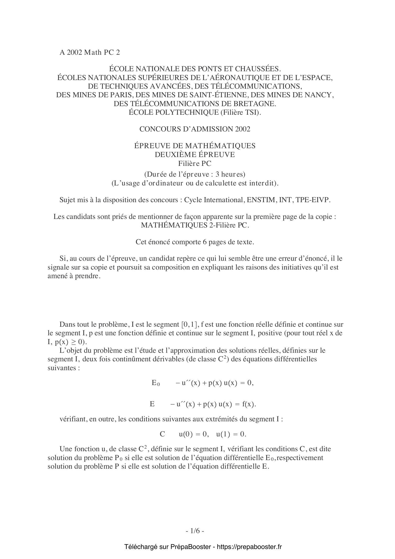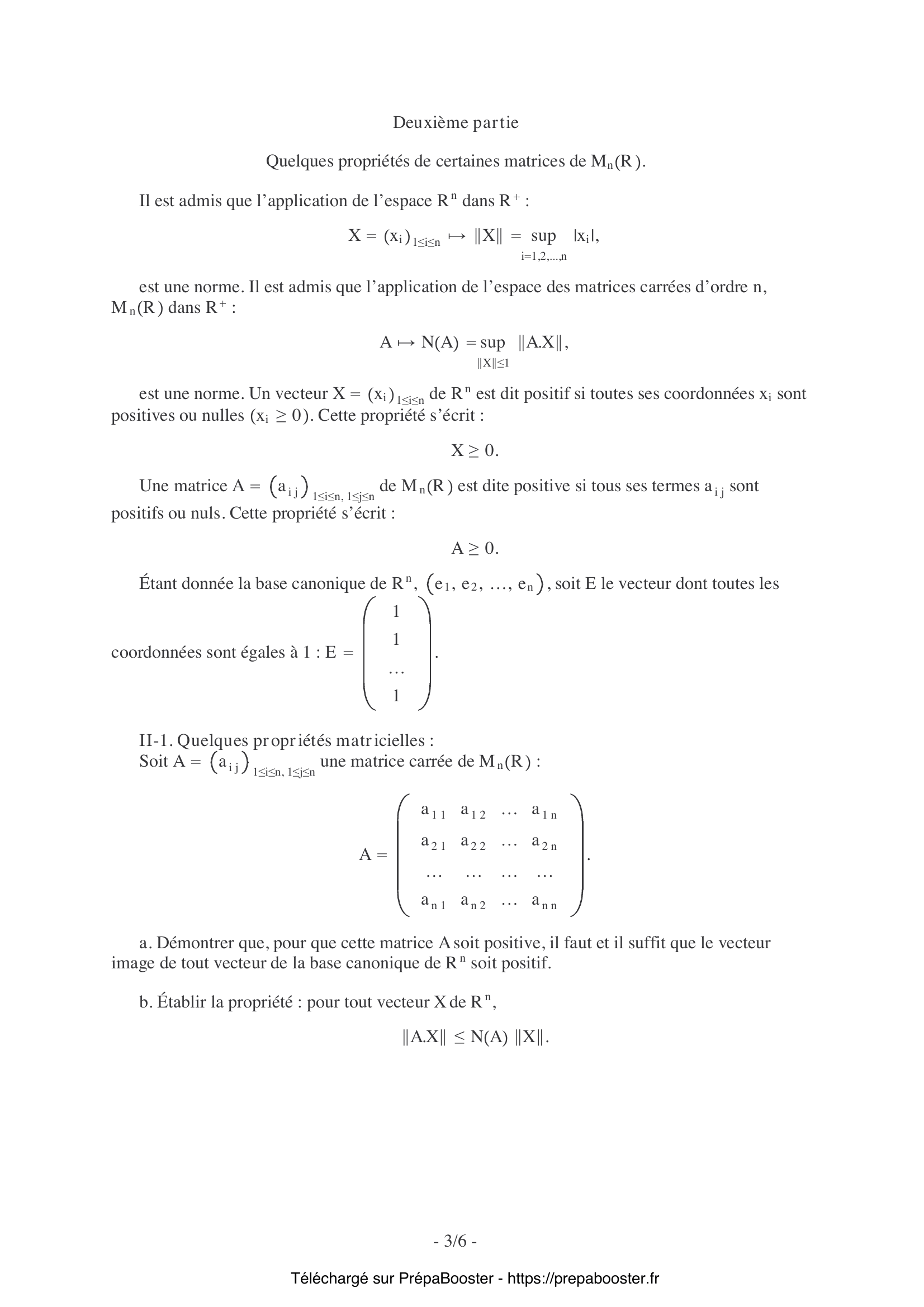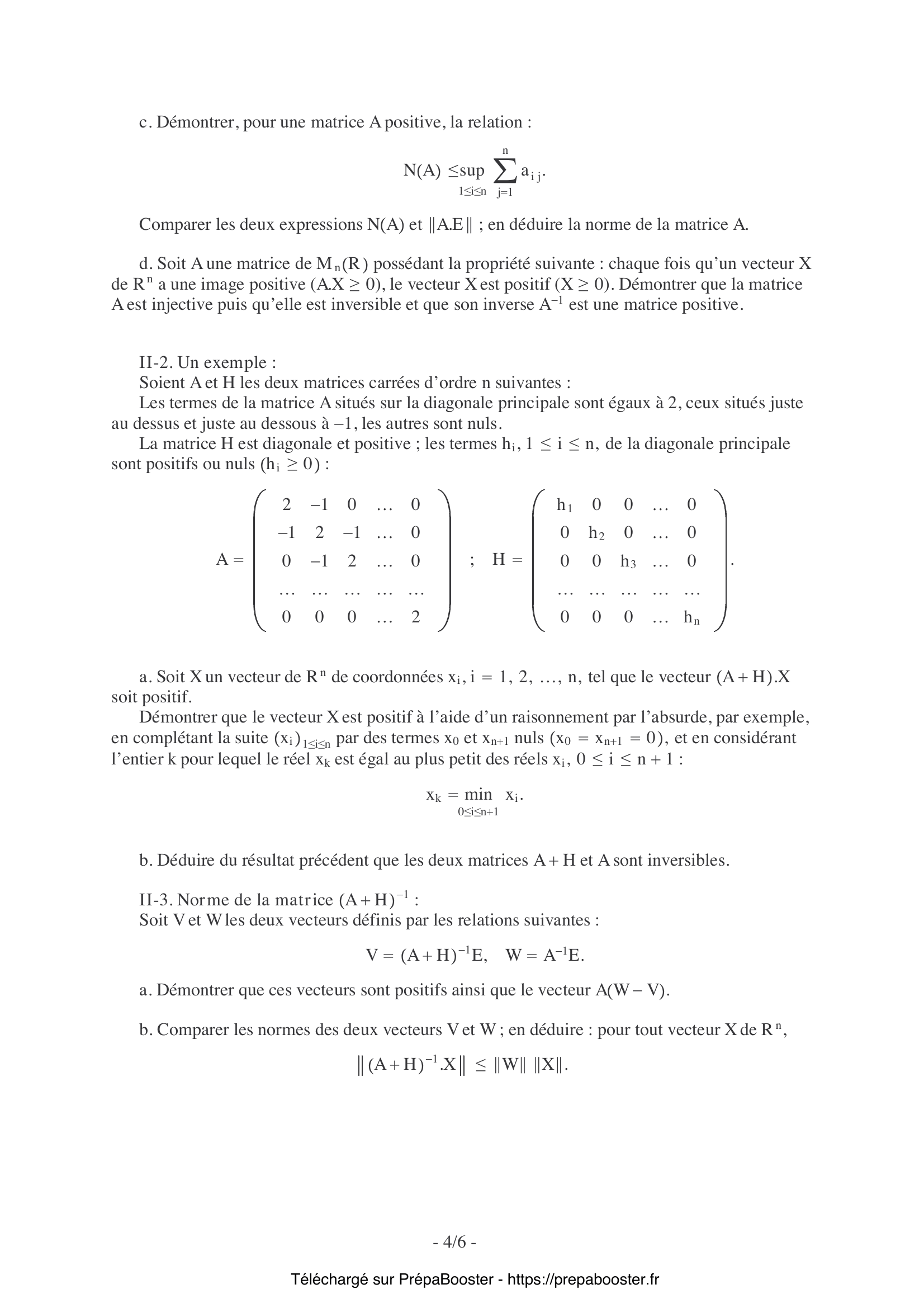 1. I-1. Exemples :\\ Déterminer toutes les solutions de l’équation différentielle E vérifiant les conditions C dans les deux cas suivants :\\ a. La fonction $p$ est nulle et la fonction $f$ constante et égale à 1 :\\ $p(x) = 0$, $f(x) = 1$.\\ b. La fonction $p$ est constante et égale à 1 ; la fonction $f$ est la fonction $x \mapsto e^{\alpha x}$ où $\alpha$ est un réel donné :\\ $p(x) = 1$, $f(x) = e^{\alpha x}$. 2. I-2. Unicité des solutions :\\ a. Soit $u$ une fonction solution de l’équation $E_0$ vérifiant les conditions $C$ ; démontrer que cette solution $u$ vérifie la relation :\\ \[ \int_0^1 u'(x)^2 + p(x) u(x)^2 \, dx = 0. \] En déduire que la seule solution du problème $P_0$ est la solution nulle.\\ b. Démontrer que, pour des fonctions $p$ et $f$ données, il existe, au plus, une solution du problème $P$. 3. I-3. Existence d’une solution :\\ a. Étant données deux fonctions $u_1$ et $u_2$ solutions de l’équation différentielle $E_0$, soit $g$ la fonction définie sur l’intervalle $I$ par la relation suivante :\\ $g(x) = u_1(0) u_2(x) – u_2(0) u_1(x)$.\\ Démontrer que, si la fonction $g$ s’annulle au point 1 ($g(1) = 0$), la fonction $g$ est nulle sur l’intervalle $I$.\\ En déduire une condition nécessaire et suffisante sur les deux solutions $u_1$ et $u_2$ pour que la fonction $g$ ne s’annulle pas en 1 ($g(1) \ne 0$).\\ Soient $u_1$ et $u_2$ deux solutions de l’équation différentielle $E_0$, $v$ une solution de l’équation $E$ et $\alpha$ et $\beta$ deux scalaires. Soit $u$ et $X$ la fonction et le vecteur définis par les relations suivantes :\\ $u(x) = \alpha u_1(x) + \beta u_2(x) + v(x)$ ; $X = (\alpha,\,\beta)^T$. 4. I-3.b. Démontrer que, pour que la fonction $u$ soit solution du problème $P$, il faut et il suffit que le vecteur $X$ vérifie la relation matricielle suivante :\\ $U.X = B,$\\ où $U$ est une matrice carrée d’ordre $2$ et $B$ un vecteur qui seront précisés. 5. I-3.c. Démontrer que le problème $P$ admet une solution unique.} 6. II-1. Quelques propriétés matricielles :\\ Soit $A = (a_{ij})_{1 \leq i \leq n,\, 1 \leq j \leq n}$ une matrice carrée de $\mathcal{M}_n(\mathbb{R})$ :\\ a. Démontrer que, pour que cette matrice $A$ soit positive, il faut et il suffit que le vecteur image de tout vecteur de la base canonique de $\mathbb{R}^n$ soit positif.\\ b. Établir la propriété : pour tout vecteur $X$ de $\mathbb{R}^n$,\\ \[ |A.X| \leq N(A)\,|X|. \] 7. II-1.c. Démontrer, pour une matrice $A$ positive, la relation :\\ \[ N(A) = \max_{1 \leq i \leq n}\, \sum_{j=1}^n a_{ij}. \] Comparer les deux expressions $N(A)$ et $A \cdot E$ ; en déduire la norme de la matrice $A$. 8. II-1.d. Soit $A$ une matrice de $\mathcal{M}_n(\mathbb{R})$ possédant la propriété suivante : chaque fois qu’un vecteur $X$ de $\mathbb{R}^n$ a une image positive ($A.X \geq 0$), le vecteur $X$ est positif ($X \geq 0$). Démontrer que la matrice $A$ est injective puis qu’elle est inversible et que son inverse $A^{-1}$ est une matrice positive. 9. II-2. Un exemple :\\ Soient $A$ et $H$ les deux matrices carrées d’ordre $n$ suivantes :\\ Les termes de la matrice $A$ situés sur la diagonale principale sont égaux à $2$, ceux situés juste au-dessus et juste au-dessous à $1$, les autres sont nuls.\\ La matrice $H$ est diagonale et positive ; les termes $h_i$, $1 \leq i \leq n$, de la diagonale principale sont positifs ou nuls $h_i \geq 0$ : \[ A = \begin{pmatrix} 2 & 1 & 0 & \cdots & 0 \\ 1 & 2 & 1 & \cdots & 0 \\ 0 & 1 & 2 & \cdots & 0 \\ \vdots & \vdots & \vdots & \ddots & \vdots \\ 0 & 0 & 0 & \cdots & 2 \\ \end{pmatrix} \quad H = \begin{pmatrix} h_1 & 0 & \cdots & 0 \\ 0 & h_2 & \cdots & 0 \\ 0 & 0 & \cdots & 0 \\ 0 & 0 & \cdots & h_n \\ \end{pmatrix} \] a. Soit $X$ un vecteur de $\mathbb{R}^n$ de coordonnées $x_i$, $i=1,2,\ldots,n$, tel que le vecteur $(A + H).X$ soit positif.\\ Démontrer que le vecteur $X$ est positif à l’aide d’un raisonnement par l’absurde, par exemple, en complétant la suite $x_i\, (1 \leq i \leq n)$ par des termes $x_0$ et $x_{n+1}$ nuls ($x_0 = x_{n+1} = 0)$, et en considérant l’entier $k$ pour lequel le réel $x_k$ est égal au plus petit des réels $x_i$, $0 \leq i \leq n + 1$ :\\ $x_k = \min_{0 \leq i \leq n+1} x_i$. 10. II-2.b. Déduire du résultat précédent que les deux matrices $A + H$ et $A$ sont inversibles.} 11. II-3. Norme de la matrice $(A + H)^{-1}$ :\\ Soient $V$ et $W$ les deux vecteurs définis par les relations suivantes :\\ $V = (A + H)^{-1} E$, $W = A^{-1} E$.\\ a. Démontrer que ces vecteurs sont positifs ainsi que le vecteur $AW – V$.\\ b. Comparer les normes des deux vecteurs $V$ et $W$ ; en déduire : pour tout vecteur $X$ de $\mathbb{R}^n$,\\ \[ |(A + H)^{-1} X| \leq ||W||\, |X|. \] 12. II-4. Une majoration de la norme du vecteur $W$ :\\ Soit $\mathcal{S}$ l’ensemble des suites réelles infinies $(x_k)_{k \geq 0}$ vérifiant, pour $k \geq 0$, la relation de récurrence suivante : \[ x_{k+1} – 2\,x_k + x_{k-1} = 1. \] Soit $\mathcal{S}_0$ l’ensemble des suites réelles $(x_k)_{k \geq 0}$ vérifiant, pour $k \geq 0$, la relation de récurrence suivante : \[ x_{k+1} – 2\,x_k + x_{k-1} = 0. \] a. Déterminer les suites qui appartiennent à l’espace $\mathcal{S}_0$.\\ b. Déterminer une suite $y_k$ appartenant à l’espace $\mathcal{S}$ qui soit un monome du deuxième degré : $y_k = a k^2$.\\ c. Déterminer les suites qui appartiennent à l’espace $\mathcal{S}$ ; en particulier celles qui vérifient les deux conditions suivantes : $x_0 = 0,\, x_{n+1} = 0$.\\ d. Déterminer les coordonnées du vecteur $W = A^{-1}E$ ; en déduire que la norme de ce vecteur vérifie l’inégalité suivante : \[ ||W|| \leq \frac{1}{8} (n+1)^2. \]} 13. III-1. Une approximation de la dérivée seconde :\\ Soit $u$ une fonction quatre fois continûment dérivable sur le segment $I$. Soit $M$ le maximum de la valeur absolue de la dérivée quatrième : \[ M = \sup_{x \in I} |