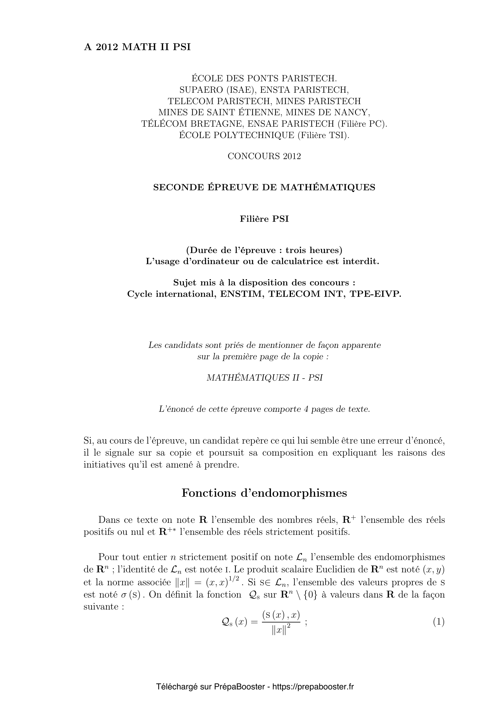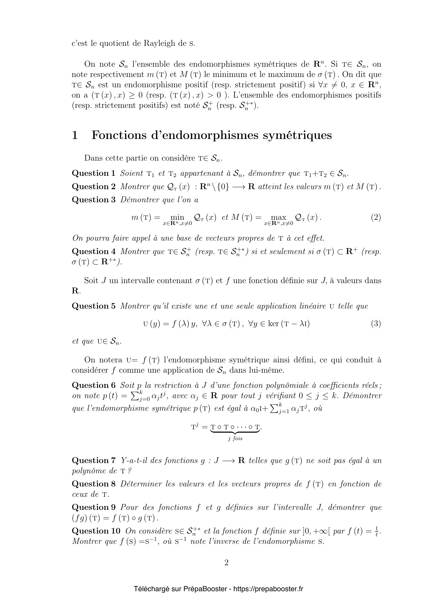 1. Soient $t_1$ et $t_2$ appartenant à $\mathcal{S}_n$, démontrer que $t_1+t_2 \in \mathcal{S}_n$. 2. Montrer que $t(\cdot): \mathbb{R}^n \setminus\{0\} \rightarrow \mathbb{R}$ atteint les valeurs $\min(t)$ et $\max(t)$. 3. Démontrer que l’on a $\min(t) = \min_{x\in \mathbb{R}^n, x\neq 0} t(x)$ et $\max(t) = \max_{x\in \mathbb{R}^n, x\neq 0} t(x)$.\\ (On pourra faire appel à une base de vecteurs propres de $t$ à cet effet.) 4. Montrer que $t\in \mathcal{S}_n^+$ (resp. $t\in \mathcal{S}_n^{+*}$) si et seulement si $\sigma(t) \subset \mathbb{R}^+$ (resp. $\sigma(t) \subset \mathbb{R}^{+*}$). 5. Montrer qu’il existe une et une seule application linéaire $u$ telle que \[ u(x) = f(\lambda)x, \ \forall \lambda\in \sigma(t),\ \forall x \in \ker (t – \lambda i) \] et que $u\in \mathcal{S}_n$.\\ On notera $u=f(t)$ l’endomorphisme symétrique ainsi défini, ce qui conduit à considérer $f$ comme une application de $\mathcal{S}_n$ dans lui-même.} 6. Soit $f$ la restriction à $I$ d’une fonction polynômiale à coefficients réels ; on note $f(x) = \sum_{k=0}^d a_k x^k$, avec $a_k\in \mathbb{R}$ pour tout $k$ vérifiant $0 \leq k \leq d$. Démontrer que l’endomorphisme symétrique $f(t)$ est égal à $a_0 i + \sum_{k=1}^d a_k t^k$, où $t^k = \underbrace{t \circ t \circ \cdots \circ t}_{k\text{ fois}}$. 7. Y-a-t-il des fonctions $f:I\to\mathbb{R}$ telles que $f(t)$ ne soit pas égal à un polynôme de $t$ ? 8. Déterminer les valeurs et les vecteurs propres de $f(t)$ en fonction de ceux de $t$. 9. Pour des fonctions $f$ et $g$ définies sur l’intervalle $I$, démontrer que $f\circ g (t) = f(t) \circ g(t)$. 10. On considère $s\in \mathcal{S}_n^{+*}$ et la fonction $f$ définie sur $]0, +\infty[$ par $f(x) = \dfrac{1}{x}$. Montrer que $f(s) = s^{-1}$, où $s^{-1}$ note l’inverse de l’endomorphisme $s$.} 11. On considère $s\in \mathcal{S}_n^+$. Lorsque $f(x) = \sqrt{x}$ on note $\sqrt{s}$ l’endomorphisme $f(s)$. Montrer que l’endomorphisme $\sqrt{s}$ est bien défini et que $(\sqrt{s})^2 = s$. En admettant que toutes les valeurs propres de $s$ sont simples, combien y-a-t-il de solutions $c$ dans $\mathcal{S}_n^+$, puis dans $\mathcal{S}_n$, à l’équation $c^2 = s$ ? 12. Démontrer que la relation $\geq$ définit une relation d’ordre dans $\mathcal{S}_n$ ; est-elle totale ? 13. Soit $u\in \mathcal{S}_n$, démontrer que si $t_2 \geq t_1$, alors $u\circ t_2\circ u \geq u\circ t_1\circ u$. 14. Soit $f$ un intervalle de $\mathbb{R}$, on dit que la fonction $f : I \to \mathbb{R}$ définit un opérateur croissant si pour tout $t_1$ et tout $t_2$, endomorphismes symétriques vérifiant $\sigma(t_1) \subset I$, $\sigma(t_2) \subset I$, alors \[ t_2 \geq t_1 \implies f(t_2) \geq f(t_1). \] Démontrer que l’application $f: \mathbb{R}^+\to \mathbb{R}$ donnée par $f(x) = x^2$ ne définit pas un opérateur croissant.\\ (On pourra considérer à cet effet les endomorphismes $t_1$ et $t_2$ de matrices respectives $m_1 = \begin{pmatrix} 1 & 1\\ 1 & 1 \end{pmatrix}$ et $m_2 = \begin{pmatrix} 2 & 1\\ 1 & 1 \end{pmatrix}$ dans la base canonique.) 15. Soient $t_1$ et $t_2 \in \mathcal{S}_n^{+*}$ tels que $t_2 \geq t_1$ ; en s’aidant de la question 13 avec $u = t_2^{-1/2}$, montrer que les valeurs propres de $u \circ t_1 \circ u$ sont inférieures ou égales à $1$. En déduire que $u^{-1} \circ t_1^{-1} \circ u^{-1} \geq i$, puis que l’application $f: \mathbb{R}^{+*} \to \mathbb{R}$ donnée par $f(x) = x^{-1}$ définit un opérateur croissant.} 16. Soient $t_1$ et $t_2\in \mathcal{S}_n^+$, tels que $t_2\geq t_1$. Démontrer que les valeurs propres de $t_2^{1/2} – t_1^{1/2}$ sont positives. En déduire que l’application $f: \mathbb{R}^+ \to \mathbb{R}$ donnée par $f(x) = \sqrt{x}$ définit un opérateur croissant. 17. On va montrer que pour tout $r\in\,]0,1[$, la fonction $f: \mathbb{R}^+ \to \mathbb{R}$ définie par $f(x) = x^r$ définit un opérateur croissant. Pour $x\in \mathbb{R}^+$, on note $g_r: \mathbb{R}^{+*} \to \mathbb{R}$ la fonction donnée par $g_r(x) = \frac{1}{x^r + x^{1-r}}$.\\ Démontrer que $g_r$ définit un opérateur croissant. (On pourra à cet effet s’aider de la question 15.) 18. Soient $\varphi$ une application $]0, +\infty[ \to \mathcal{L}_n$ et $\mathcal{B}$ une base de $\mathbb{R}^n$. On note $\Phi(\lambda)$ la matrice de l’endomorphisme $\varphi(\lambda)$ dans la base $\mathcal{B}$ et $(\Phi(\lambda))_{1\leq i,j \leq n}$ les applications coordonnées de $\Phi(\lambda)$.\\ On dira que $\varphi$ est continue et intégrable sur $]0, +\infty[$ si les fonctions coordonnées $\lambda \mapsto \Phi(\lambda)_{i,j}$ le sont. Par définition on notera $\int_0^{+\infty} \varphi(\lambda)\mathrm{d}\lambda$ l’endomorphisme dont la matrice dans la base $\mathcal{B}$ a pour coefficients les $\int_0^{+\infty} \Phi(\lambda)_{i,j}\mathrm{d}\lambda$.\\ Cette matrice sera notée $\int_0^{+\infty} \Phi(\lambda)\mathrm{d}\lambda$.\\ Montrer que cette définition est indépendante du choix de la base $\mathcal{B}$. 19. On considère $s\in \mathcal{S}_n^{+*}$ et $r\in\,]0,1[$.\\ Montrer que la fonction $\varphi$ à valeurs dans $\mathcal{L}_n$ définie par $\varphi(\lambda) = (s+\lambda i)^{-1}$ est continue et intégrable sur $]0, +\infty[$. (On pourra trouver utile de faire appel à une base orthonormée adaptée à $s$.) 20. On admet que \[ x^r = \frac{\sin r\pi}{\pi} \int_0^{+\infty} \lambda^{r-1} (x+\lambda)^{-1}\,d\lambda. \] Montrer que \[ s^r = \frac{\sin r\pi}{\pi} \int_0^{+\infty} \lambda^{r-1} (s+\lambda i)^{-1}\,d\lambda. \] } 21. En déduire que la fonction $f(x)=x^r$ définit un opérateur croissant.}FAQ