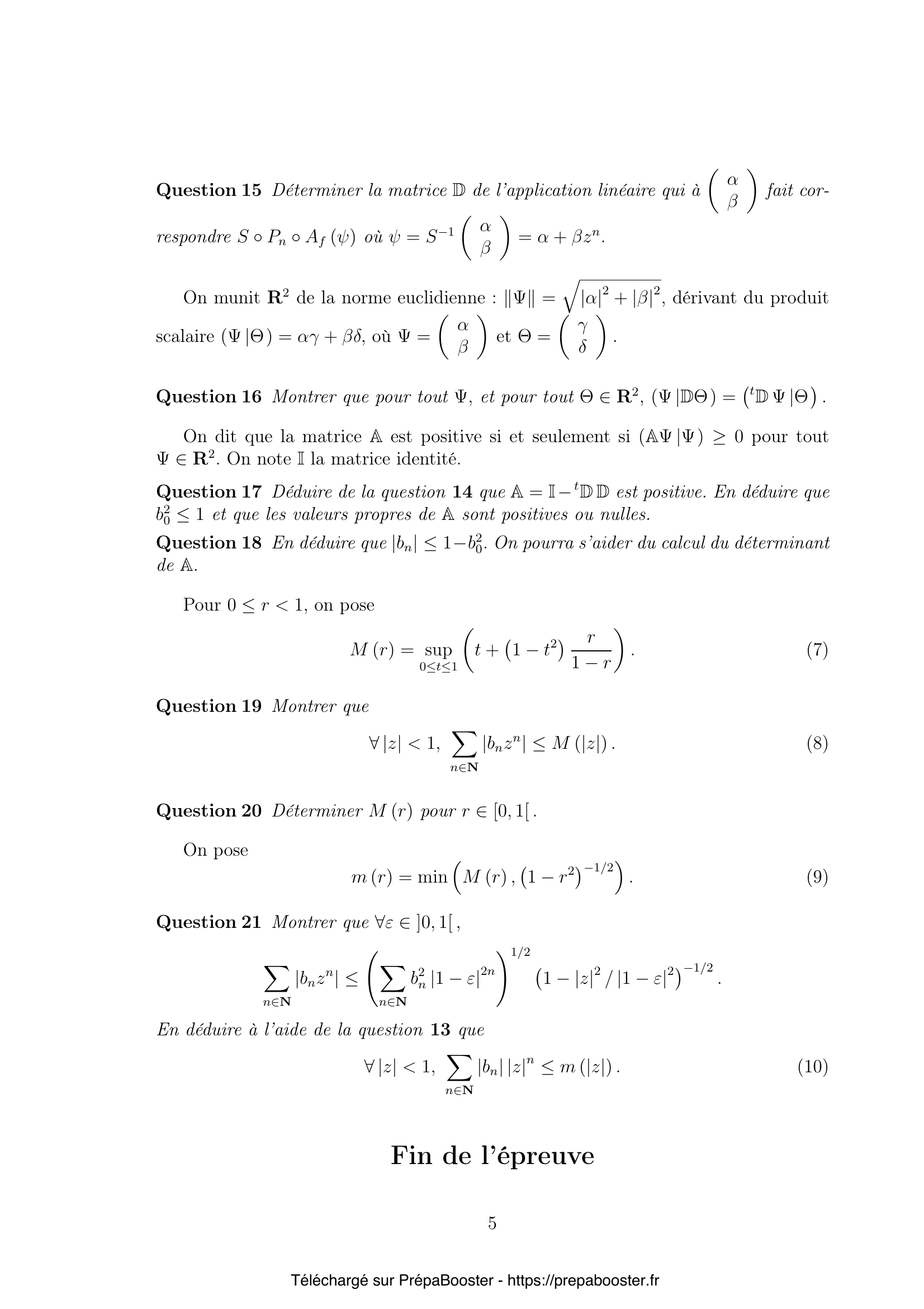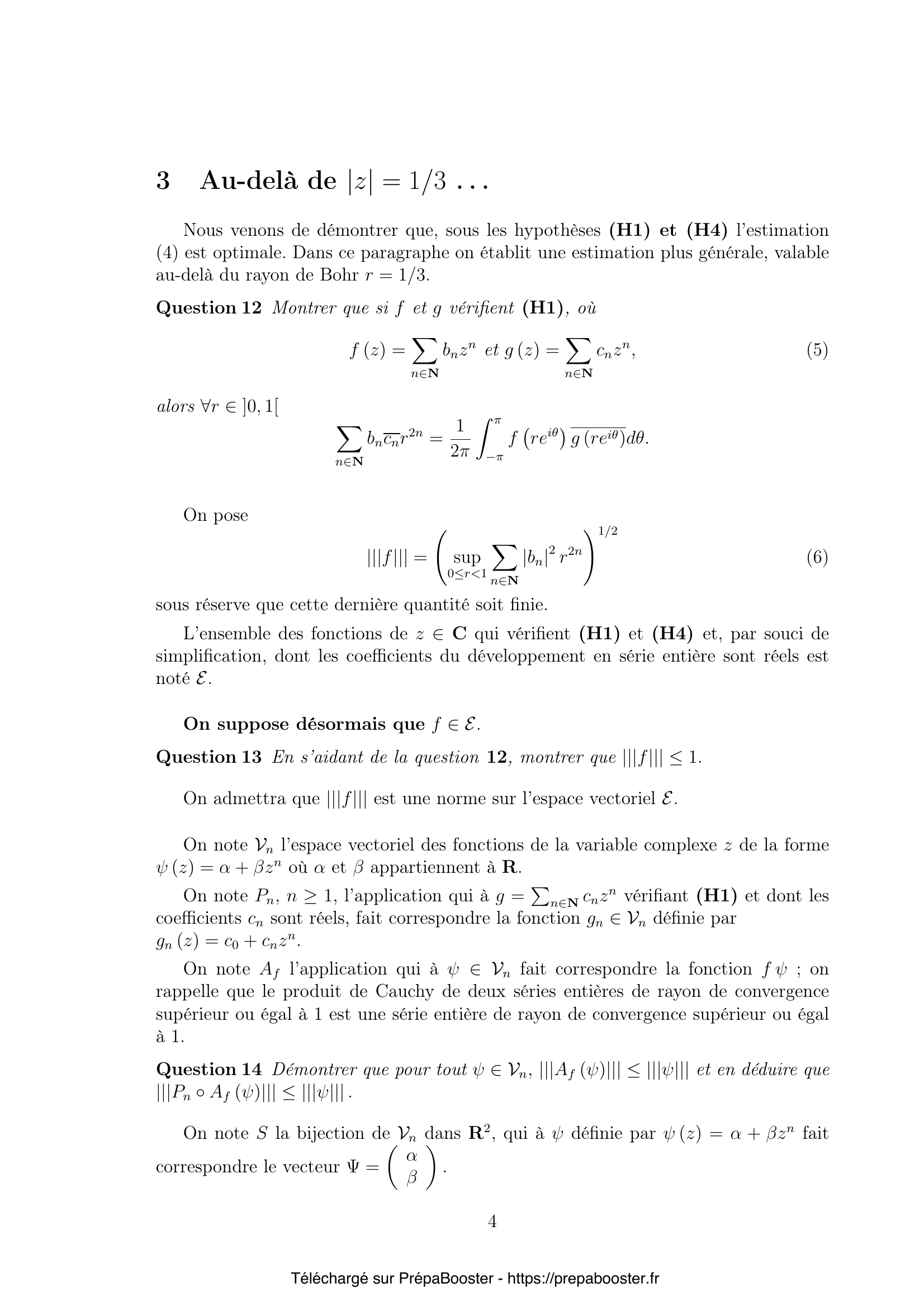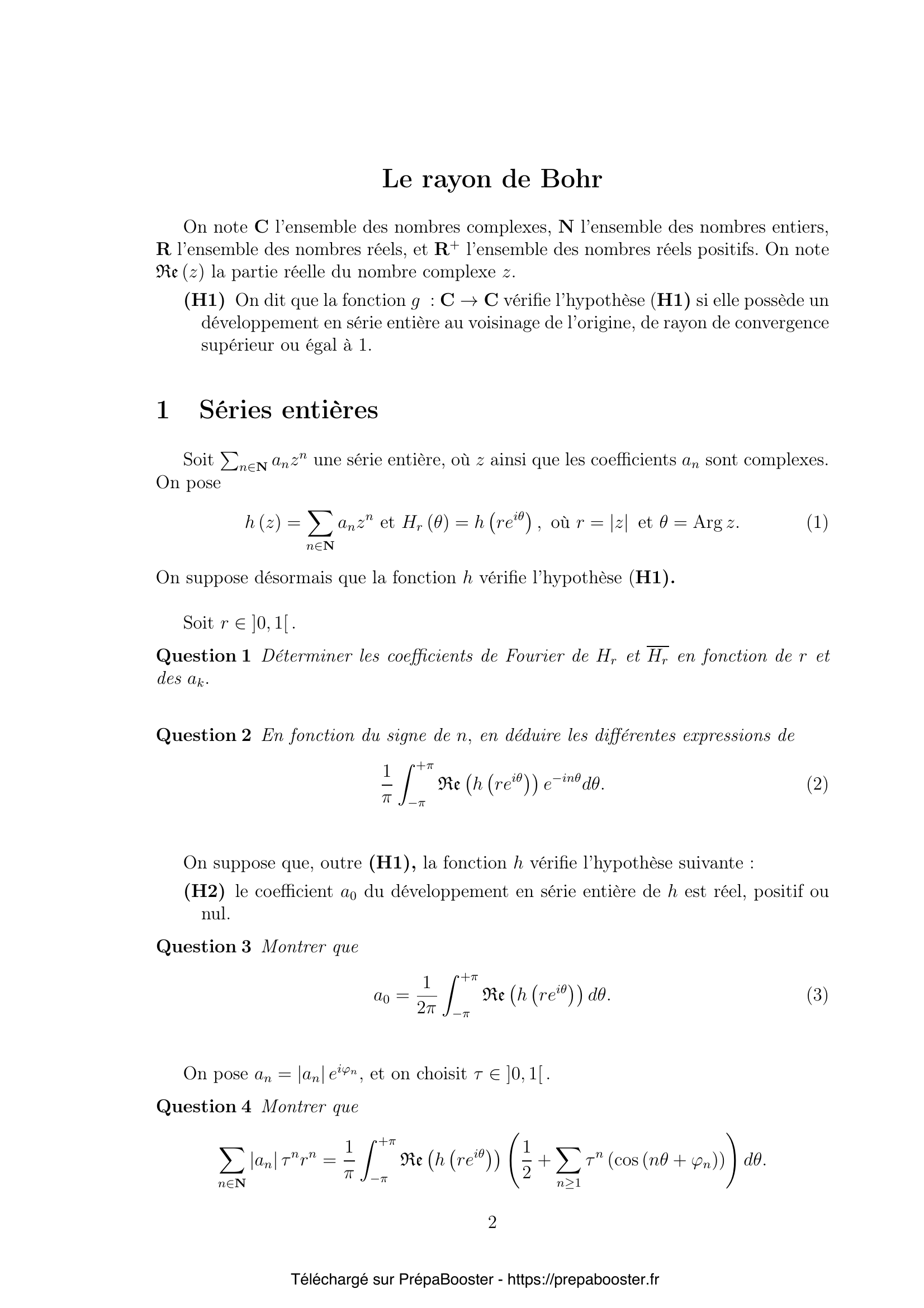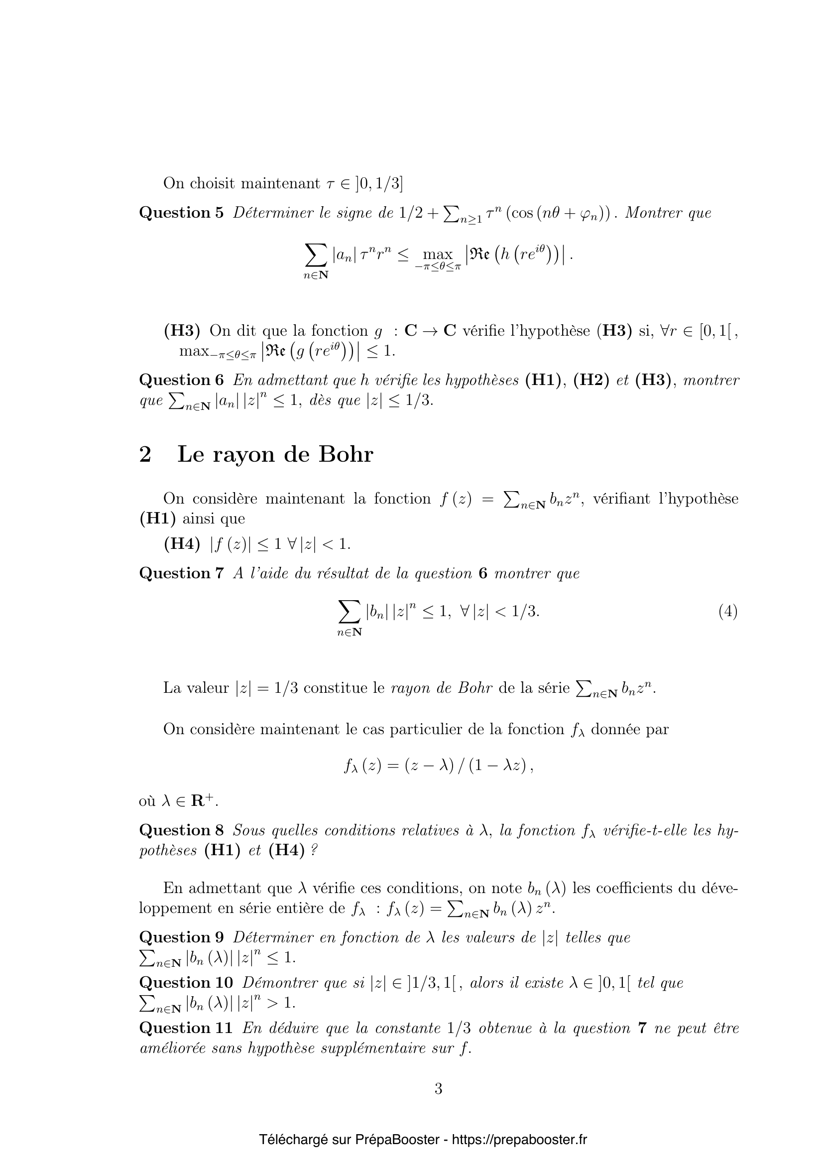 1. Déterminer les coefficients de Fourier de $H_r$ et $H_r$ en fonction de $r$ et des $a_k$.} 2. En fonction du signe de $n$, en déduire les différentes expressions de \[ \frac{1}{\pi} \int_{-\pi}^{+\pi} \Re h\left( r e^{i\theta} \right) e^{-in\theta} d\theta. \]} 3. Montrer que \[ a_0 = \frac{1}{2\pi} \int_{-\pi}^{+\pi} \Re h\left( r e^{i\theta} \right) d\theta. \]} 4. On pose $a_n = |a_n| e^{i\varphi_n}$, et on choisit $\tau \in\, ]0, 1[$. Montrer que \[ \sum_{n\in\mathbb{N}} |a_n| \tau^n r^n = \frac{1}{\pi} \int_{-\pi}^{+\pi} \Re h\left( r e^{i\theta} \right) \left( \frac{1}{2} + \sum_{n \geq 1} \tau^n \cos(n\theta + \varphi_n) \right) d\theta. \]} 5. On choisit maintenant $\tau \in\, ]0, 1/3]$. Déterminer le signe de $\frac{1}{2} + \sum_{n\geq 1} \tau^n \cos(n\theta + \varphi_n)$. Montrer que \[ \sum_{n \in \mathbb{N}} |a_n| \tau^n r^n \leq \max_{-\pi \leq \theta \leq \pi} \left| \Re\left( h\left( r e^{i\theta} \right)\right) \right|. \]} 6. En admettant que $h$ vérifie les hypothèses (H1), (H2) et (H3), montrer que \[ \sum_{n \in \mathbb{N}} |a_n|\,|z|^n \leq 1, \] dès que $|z| \leq 1/3$. } 7. À l’aide du résultat de la question 6 montrer que \[ \sum_{n\in\mathbb{N}} |b_n|\,|z|^n \leq 1, \quad \forall |z| < 1/3. \] La valeur $|z| = 1/3$ constitue le rayon de Bohr de la série $\sum_{n\in\mathbb{N}} b_n z^n$. } 8. On considère maintenant le cas particulier de la fonction $f_\lambda$ donnée par \[ f_\lambda(z) = \frac{z-\lambda}{1 - \lambda z}, \] où $\lambda \in \mathbb{R}_+$. Sous quelles conditions relatives à $\lambda$, la fonction $f_\lambda$ vérifie-t-elle les hypothèses (H1) et (H4) ? } 9. En admettant que $\lambda$ vérifie ces conditions, on note $b_n(\lambda)$ les coefficients du développement en série entière de $f_\lambda : f_\lambda(z) = \sum_{n\in\mathbb{N}} b_n(\lambda) z^n$. Déterminer en fonction de $\lambda$ les valeurs de $|z|$ telles que \[ \sum_{n\in\mathbb{N}} |b_n(\lambda)|\,|z|^n \leq 1. \] } 10. Démontrer que si $|z| \in ]1/3, 1[$, alors il existe $\lambda \in\, ]0, 1[$ tel que \[ \sum_{n\in\mathbb{N}} |b_n(\lambda)|\,|z|^n > 1. \] } 11. En déduire que la constante $1/3$ obtenue à la question 7 ne peut être améliorée sans hypothèse supplémentaire sur $f$. } 12. Montrer que si $f$ et $g$ vérifient (H1), où \[ f(z) = \sum_{n\in\mathbb{N}} b_n z^n \quad \text{et} \quad g(z) = \sum_{n\in\mathbb{N}} c_n z^n, \] alors $\forall r \in\, ]0, 1[$, \[ \sum_{n\in\mathbb{N}} b_n c_n r^{2n} = \frac{1}{2\pi} \int_{-\pi}^{\pi} f\left( r e^{i\theta} \right) g\left( r e^{i\theta} \right) d\theta. \] } 13. On pose \[ |||f||| = \left( \sup_{0 \leq r < 1} \sum_{n\in\mathbb{N}} |b_n|^2 r^{2n} \right)^{1/2} \] (sous réserve que cette dernière quantité soit finie). En s’aidant de la question 12, montrer que $|||f||| \leq 1$. } 14. On note $V_n$ l’espace vectoriel des fonctions de la variable complexe $z$ de la forme \[ \psi(z) = \alpha + \beta z^n \] où $\alpha$ et $\beta$ appartiennent à $\mathbb{R}$. On note $P_n,\ n \geq 1$, l’application qui à $g = \sum_{n\in\mathbb{N}} c_n z^n$ vérifiant (H1) et dont les coefficients $c_n$ sont réels, fait correspondre la fonction $g_n \in V_n$ définie par \[ g_n(z) = c_0 + c_n z^n. \] On note $A_f$ l’application qui à $\psi \in V_n$ fait correspondre la fonction $f\psi$ ; on rappelle que le produit de Cauchy de deux séries entières de rayon de convergence supérieur ou égal à $1$ est une série entière de rayon de convergence supérieur ou égal à $1$. Démontrer que pour tout $\psi \in V_n$, $|||A_f(\psi)||| \leq |||\psi|||$ et en déduire que $|||P_n \circ A_f(\psi)||| \leq |||\psi|||$. } 15. On note $S$ la bijection de $V_n$ dans $\mathbb{R}^2$, qui à $\psi$ définie par $\psi(z) = \alpha + \beta z^n$ fait correspondre le vecteur $\Psi = \begin{pmatrix}\alpha \\ \beta\end{pmatrix}$. Déterminer la matrice $D$ de l’application linéaire qui à $\begin{pmatrix}\alpha\\\beta\end{pmatrix}$ fait correspondre $S \circ P_n \circ A_f(\psi)$ où $\psi = S^{-1} \begin{pmatrix}\alpha \\ \beta\end{pmatrix} = \alpha + \beta z^n$. } 16. On munit $\mathbb{R}^2$ de la norme euclidienne : $\|\Psi\| = \sqrt{|\alpha|^2 + |\beta|^2}$, dérivant du produit scalaire $(\Psi \mid \Theta ) = \alpha\gamma + \beta\delta$, où $\Psi = \begin{pmatrix}\alpha \\ \beta\end{pmatrix}$ et $\Theta = \begin{pmatrix}\gamma \\ \delta\end{pmatrix}$. Montrer que pour tout $\Psi$, et pour tout $\Theta \in \mathbb{R}^2$, $(\Psi \mid D \Theta ) = ( ^t D \Psi \mid \Theta )$. } 17. On dit que la matrice $A$ est positive si et seulement si $(A\Psi |\Psi) \geq 0$ pour tout $\Psi \in \mathbb{R}^2$. On note $I$ la matrice identité. Déduire de la question 14 que $A = I - {}^t D D$ est positive. En déduire que $b_0^2 \leq 1$ et que les valeurs propres de $A$ sont positives ou nulles. } 18. En déduire que $|b_n| \leq 1-b_0^2$. On pourra s’aider du calcul du déterminant de $A$. } 19. Pour $0 \leq r < 1$, on pose \[ M(r) = \sup_{0 \leq t \leq 1} \left( t + \frac{1-t}{2} \frac{r}{1-r} \right). \] Montrer que \[ \forall |z| < 1, \quad \sum_{n\in\mathbb{N}} |b_n z^n| \leq M(|z|). \] } 20. Déterminer $M(r)$ pour $r \in [0, 1[$. } 21. On pose \[ m(r) = \min \left[\, M(r), \left( \frac{1-r}{2} \right)^{-1/2} \right]. \] Montrer que $\forall \epsilon \in\, ]0, 1[$, \[ \sum_{n\in\mathbb{N}} |b_n z^n| \leq \left( \sum_{n\in\mathbb{N}} b_n^2 |1-\epsilon|^{2n} \right)^{1/2} \left( \frac{1 - |z|}{2} / |1-\epsilon|^2 \right)^{-1/2}. \] En déduire à l’aide de la question 13 que \[ \forall |z| < 1, \quad \sum_{n\in\mathbb{N}} |b_n|\,|z|^n \leq m(|z|). \] }FAQ