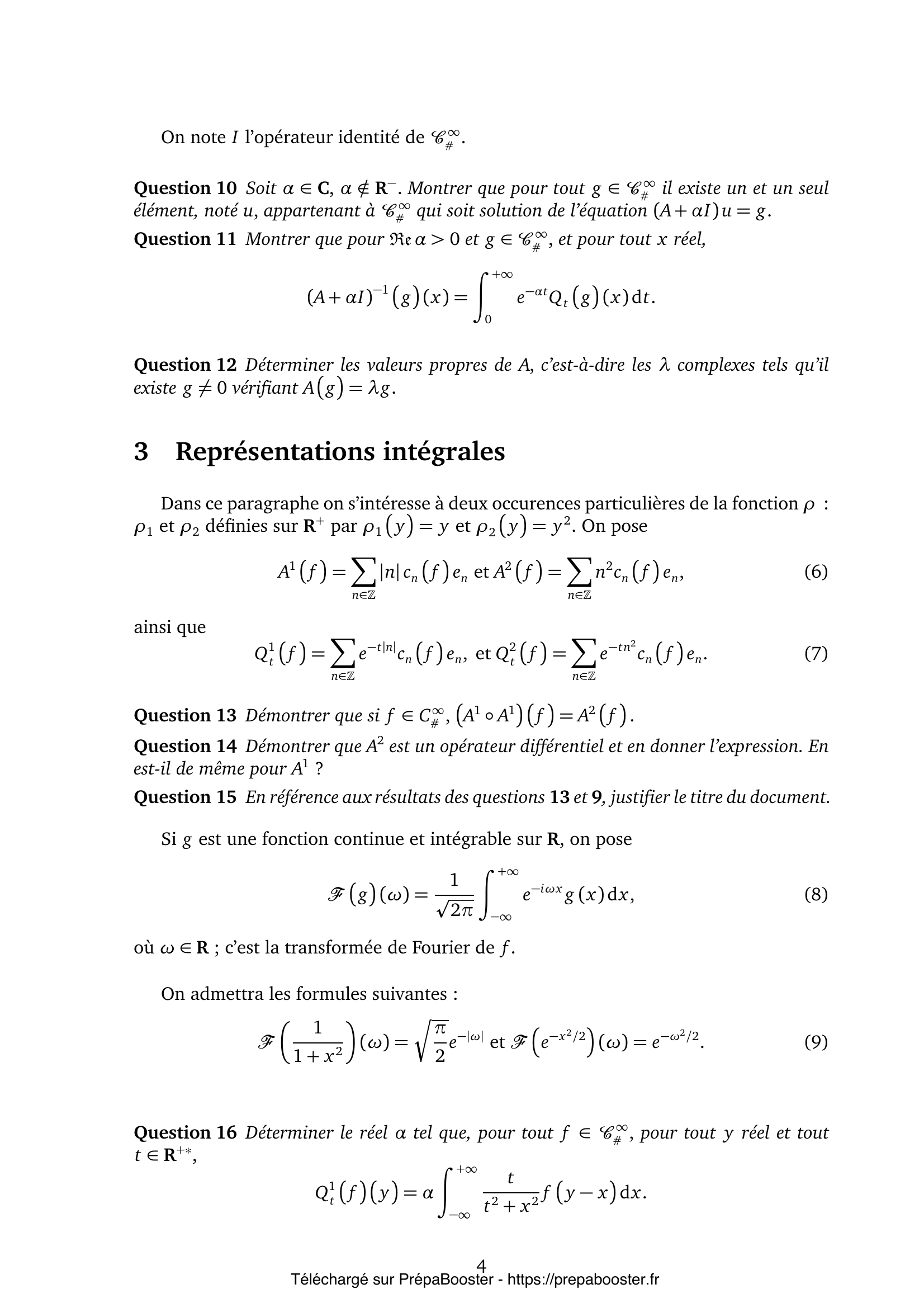 1. Soit $f \in C^0_\#,$ démontrer que la suite des $c_n(f)$ où $n \in \mathbb{Z},$ est bornée. 2. Soit $f \in C^\infty_\#,$ donner l’expression de $c_n(f^{(k)})$ en fonction de $c_n(f)$. En déduire que pour tout $k \in \mathbb{N}$, il existe $C_k>0$ tel que, pour tout entier relatif non nul $n$, $|c_n(f)|\leq \dfrac{C_k}{|n|^k}$. 3. Soit $(d_n)_{n\in\mathbb{Z}}$, une suite d’éléments de $\mathbb{C}$, telle que la série $\sum_{n\in\mathbb{Z}} d_n$ converge absolument. Montrer que pour tout $x$ réel la série $\sum_{n\in\mathbb{Z}} d_n e_n(x)$ converge et que sa somme $h(x)$ appartient à $C^0_\#$. Justifier que, pour tout $n \in \mathbb{Z}$, $d_n = c_n(h)$. 4. Réciproquement, on suppose pour cette question que quel que soit l’entier $k$, il existe $C_k>0$ et $N_k\geq 1$ tels que $|d_n| \leq \dfrac{C_k}{|n|^k}$ pour tout $|n| \geq N_k$. Démontrer que pour tout $\ell$ entier, la série $\sum_{n\in\mathbb{Z}} d_n e_n^{(\ell)}$ converge normalement ; en déduire que $h(x) = \sum_{n\in\mathbb{Z}} d_n e_n(x)$ appartient à $C^\infty_\#$. 5. Un opérateur différentiel sur $C^\infty_\#$ est une application linéaire $B$ de $C^\infty_\#$ dans lui-même de la forme suivante : \[ B f = \sum_{k=0}^{+\infty} b_k f^{(k)}, \] où les réels $b_k$ sont tous nuls sauf un nombre fini. On appelle ordre de $B$ l’entier $K$ défini par $K = \max\{ k \in \mathbb{N}\ |\ b_k\neq 0 \}$. Démontrer qu’une application linéaire $B$ de $C^\infty_\#$ dans lui-même est un opérateur différentiel d’ordre $K$ si et seulement si il existe un polynôme $P_K$ d’ordre $K$ tel que, pour tout entier relatif $n$, et pour tout $f \in C^\infty_\#$, $c_n(Bf) = P_K(n)c_n(f)$.} 6. Soit $\rho$ une fonction $\mathbb{R}_+ \to \mathbb{R}_+$, strictement croissante, telle qu’il existe $\ell \in \mathbb{N}_+$ avec $\forall y \geq 1,\, y \leq \rho(y) \leq y^\ell$.\\ Soit $f \in C^\infty_\#$, démontrer que la série $\sum_{n\in\mathbb{Z}} \rho (|n|) c_n(f) e_n$ converge normalement et que sa somme appartient à $C^\infty_\#$. 7. Soit $f \in C^0_\#$, démontrer que pour tout $t>0$, la série $\sum_{n\in\mathbb{Z}} e^{-t\rho(|n|)} c_n(f) e_n$ converge normalement et que sa somme appartient à $C^\infty_\#$. 8. On définit l’opérateur $A : C^\infty_\# \to C^\infty_\#$ par la formule \[ A(f) = \sum_{n\in\mathbb{Z}} \rho(|n|) c_n(f) e_n. \] On suppose désormais que $t \in \mathbb{R}_+^*$, et on définit l’opérateur $Q_t$ sur $C^0_\#$ par la formule suivante : \[ Q_t(f) = \sum_{n\in\mathbb{Z}} e^{-t\rho(|n|)} c_n(f) e_n. \] Montrer que pour $x$ réel fixé et $f \in C^0_\#$, la fonction $t \mapsto Q_t(f)(x)$ est de classe $C^\infty$ sur $\mathbb{R}_+^*$. 9. Démontrer que, pour $f \in C^0_\#$ et $t>0$, $\dfrac{\partial}{\partial t} Q_t(f)(x) = -A(Q_t(f))(x)\ \forall x$. 10. On note $I$ l’opérateur identité de $C^\infty_\#$. Soit $\alpha \in \mathbb{C}$, $\alpha \notin \mathbb{R}_-$. Montrer que pour tout $g \in C^\infty_\#$ il existe un et un seul élément, noté $u$, appartenant à $C^\infty_\#$ qui soit solution de l’équation $(A+\alpha I)u = g$.} 11. Montrer que pour $\Re\alpha>0$ et $g\in C^\infty_\#$, et pour tout $x$ réel, \[ (A+\alpha I)^{-1}g(x) = \int_0^{+\infty} e^{-\alpha t} Q_t(g)(x)dt. \] 12. Déterminer les valeurs propres de $A$, c’est-à-dire les $\lambda$ complexes tels qu’il existe $g\neq 0$ vérifiant $Ag = \lambda g$. 13. Dans ce paragraphe on s’intéresse à deux occurences particulières de la fonction $\rho$ :\\ $\rho_1(y) = y$ et $\rho_2(y)=y^2$.\\ On pose \[ A_1(f) = \sum_{n\in\mathbb{Z}} |n| c_n(f) e_n \quad \text{et}\quad A_2(f) = \sum_{n\in\mathbb{Z}} n^2 c_n(f) e_n, \] ainsi que \[ Q^1_t(f) = \sum_{n\in\mathbb{Z}} e^{-t|n|} c_n(f) e_n,\quad Q^2_t(f) = \sum_{n\in\mathbb{Z}} e^{-t n^2} c_n(f) e_n. \] \\ Démontrer que si $f\in C^\infty_\#$, $(A_1\circ A_1)f= A_2(f)$. 14. Démontrer que $A_2$ est un opérateur différentiel et en donner l’expression. En est-il de même pour $A_1$ ? 15. En référence aux résultats des questions 13 et 9, justifier le titre du document.} 16. Si $g$ est une fonction continue et intégrable sur $\mathbb{R}$, on pose \[ \mathcal{F}(g)(\omega) = \frac{1}{\sqrt{2\pi}} \int_{-\infty}^{+\infty} e^{-i\omega x} g(x)\ dx, \] où $\omega\in\mathbb{R}$ ; c’est la transformée de Fourier de $f$.\\ On admet les formules suivantes : \[ \mathcal{F}\left(\frac{1}{1+x^2}\right)(\omega) = \sqrt{\pi/2} e^{-|\omega|},\quad \mathcal{F}(e^{-x^2/2})(\omega) = e^{-\omega^2/2}. \] Déterminer le réel $\alpha$ tel que, pour tout $f\in C^\infty_\#$, pour tout $y$ réel et tout $t\in\mathbb{R}_+^*$, \[ Q^1_t(f)(y) = \alpha \int_{-\infty}^{+\infty} \frac{t}{t^2 + x^2} f(y – x) dx. \] 17. On suppose dans ce paragraphe que $f \in C^0_\#$, et on se limite à l’étude de $Q^1_t(f)$.\\ On rappelle le théorème de Weierstrass trigonométrique : pour toute fonction $f$ continue $T$-périodique et tout $\epsilon>0$, il existe un polynôme trigonométrique $p$, soit $p(t)= \sum_{n\in Z_N} c_n e^{2i\pi n t/T}$ où $c_n\in\mathbb{C}$, $Z_N=\{n\in\mathbb{Z}\ |\ -N\leq n\leq N\}$, tel que $\Vert f-p\Vert \leq \epsilon$.\\ En s’aidant du théorème ci-dessus, montrer que pour tout $y$ réel et tout $t>0$ \[ Q^1_t(f)(y) = \frac{1}{\pi}\int_{-\infty}^{+\infty} \frac{t}{t^2 + x^2} f(y-x) dx. \] 18. En utilisant l’expression de $Q^1_t(f)$ sous forme de série, montrer que \[ \lim_{t\to 0^+} \int_0^{2\pi} |f(y) – Q^1_t(f)(y)| dy = 0. \] 19. En utilisant l’expression intégrale de $Q^1_t$ obtenue à la question 17, montrer que pour tout $y$ réel, \[ f(y) = \lim_{t\to 0^+} Q^1_t(f)(y). \] 20. Pour $f \in C^0_\#$, on pose $Q^1_0(f) = f$ et \[ E(t) = \frac{1}{2}\int_0^{2\pi} |Q^1_t(f)(x)|^2 dx,\ t\geq 0. \] Montrer que $E$ est une fonction décroissante de $t$ et déterminer sa limite en $t=+\infty$.}FAQ