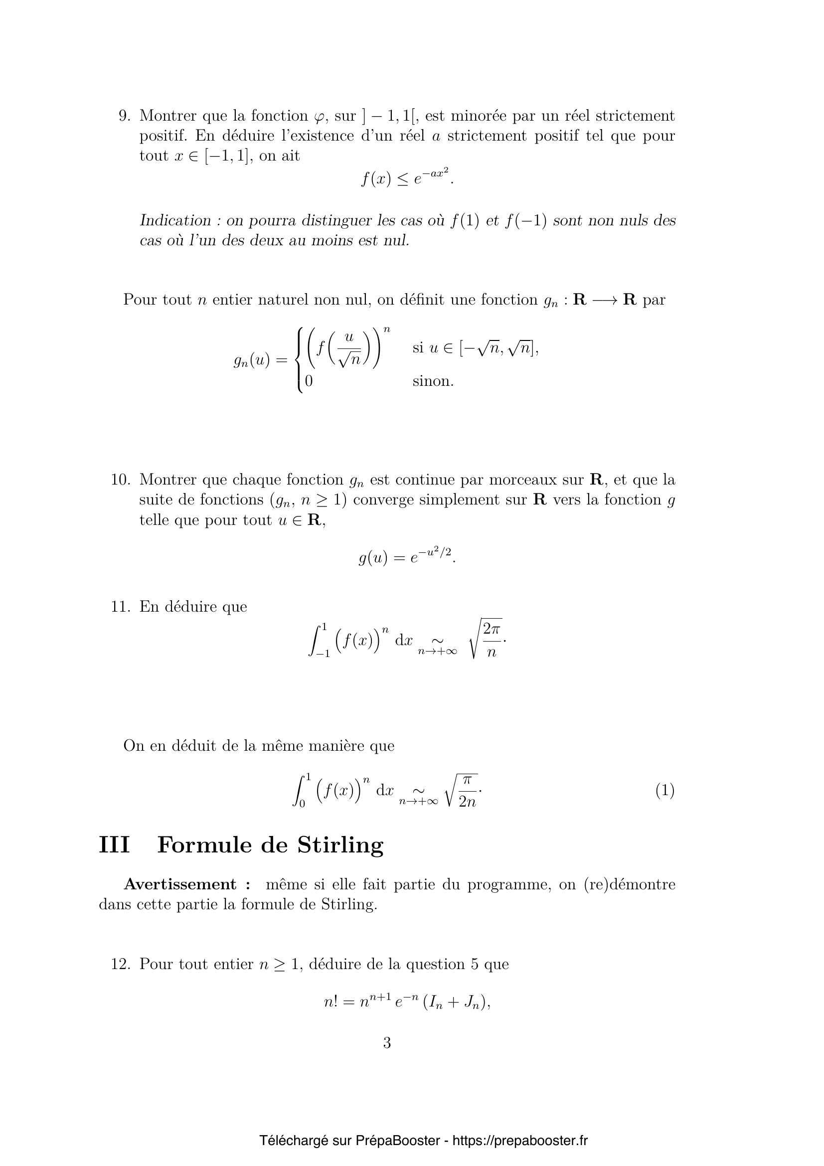 La formule de Stirling s’obtient en combinant les résultats des questions précédentes, notamment en utilisant la méthode de Laplace sur \( I_n \) et en négligeant \( J_n \) devant \( I_n \). C’est un résultat majeur en analyse asymptotique, très utile pour les équivalents de suites. Pour une démonstration complète, consulte le corrigé !