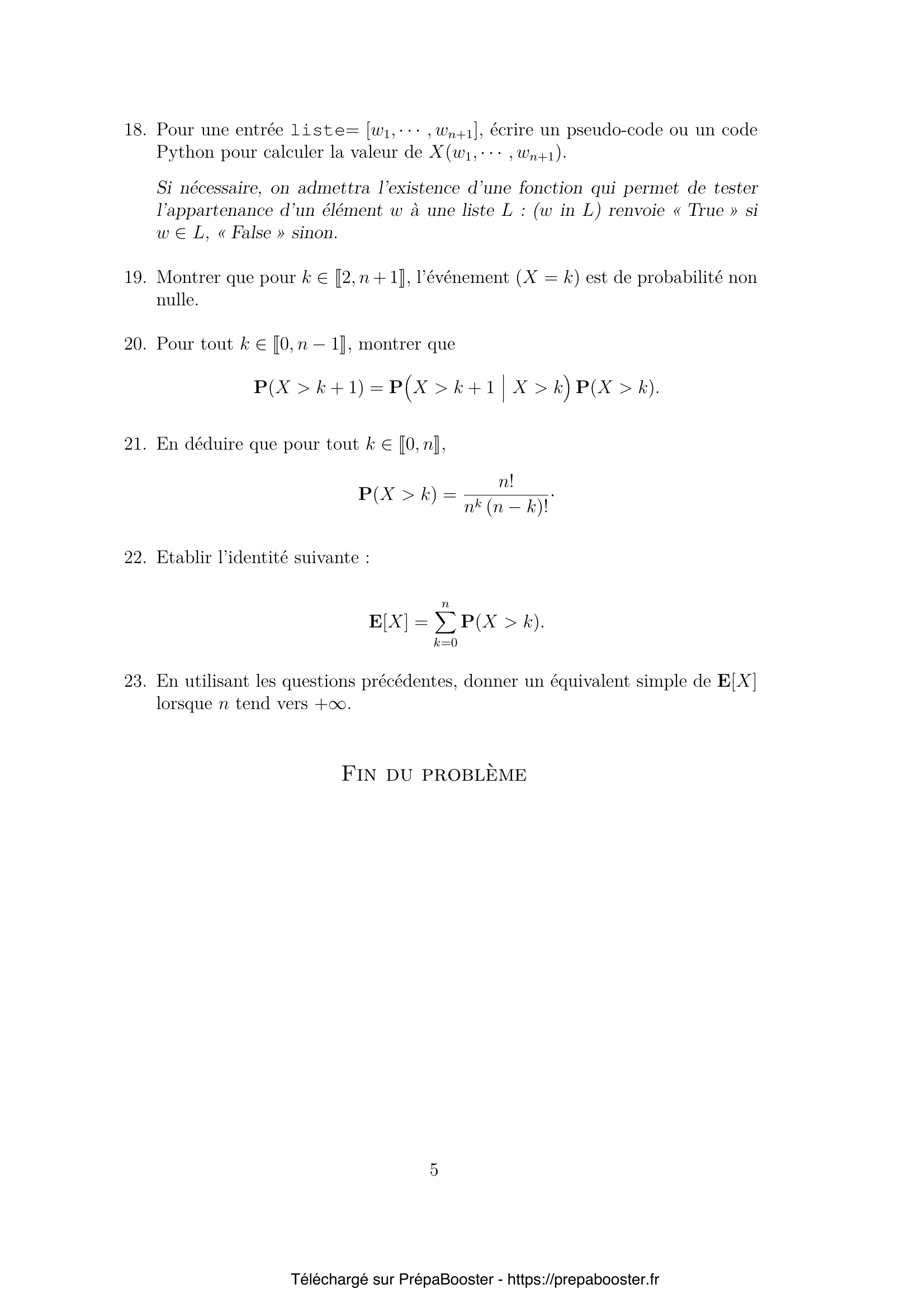 Les questions de probabilités portent sur des événements et des espérances, avec des calculs combinatoires et des raisonnements par récurrence. Par exemple, pour \( \mathbb{P}(X > k) \), on utilise des propriétés de dénombrement et des relations de récurrence. C’est un bon entraînement pour les épreuves de modélisation. Pour voir les détails, regarde le corrigé !