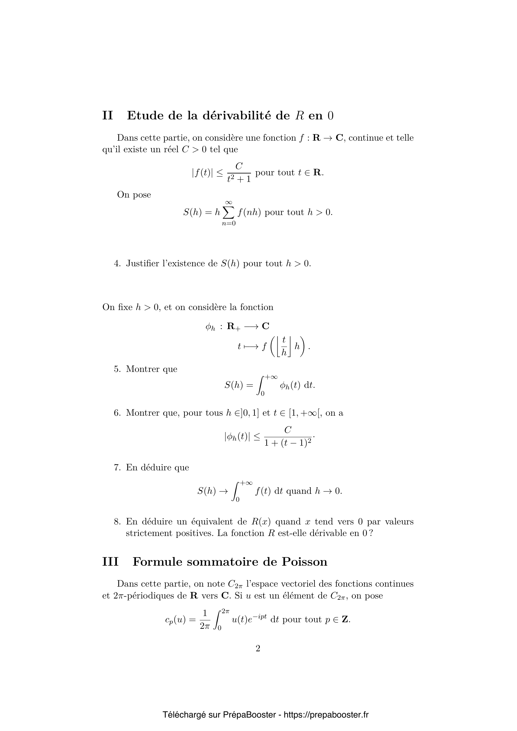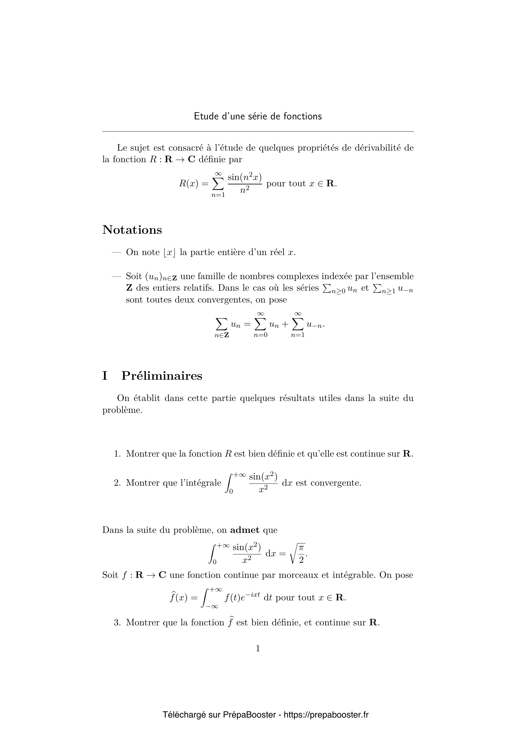 1. Montrer que la fonction \( R \) est bien définie et qu’elle est continue sur \( \mathbb{R} \).
