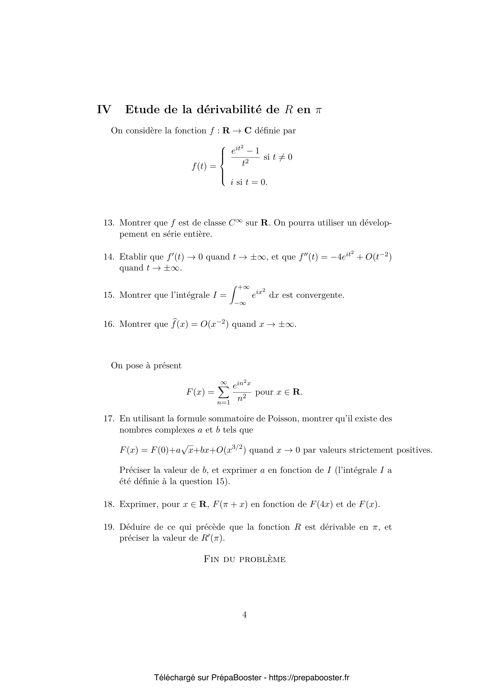 19. Déduire de ce qui précède que la fonction \( R \) est dérivable en \( \pi \), et préciser la valeur de \( R'(\pi) \).}