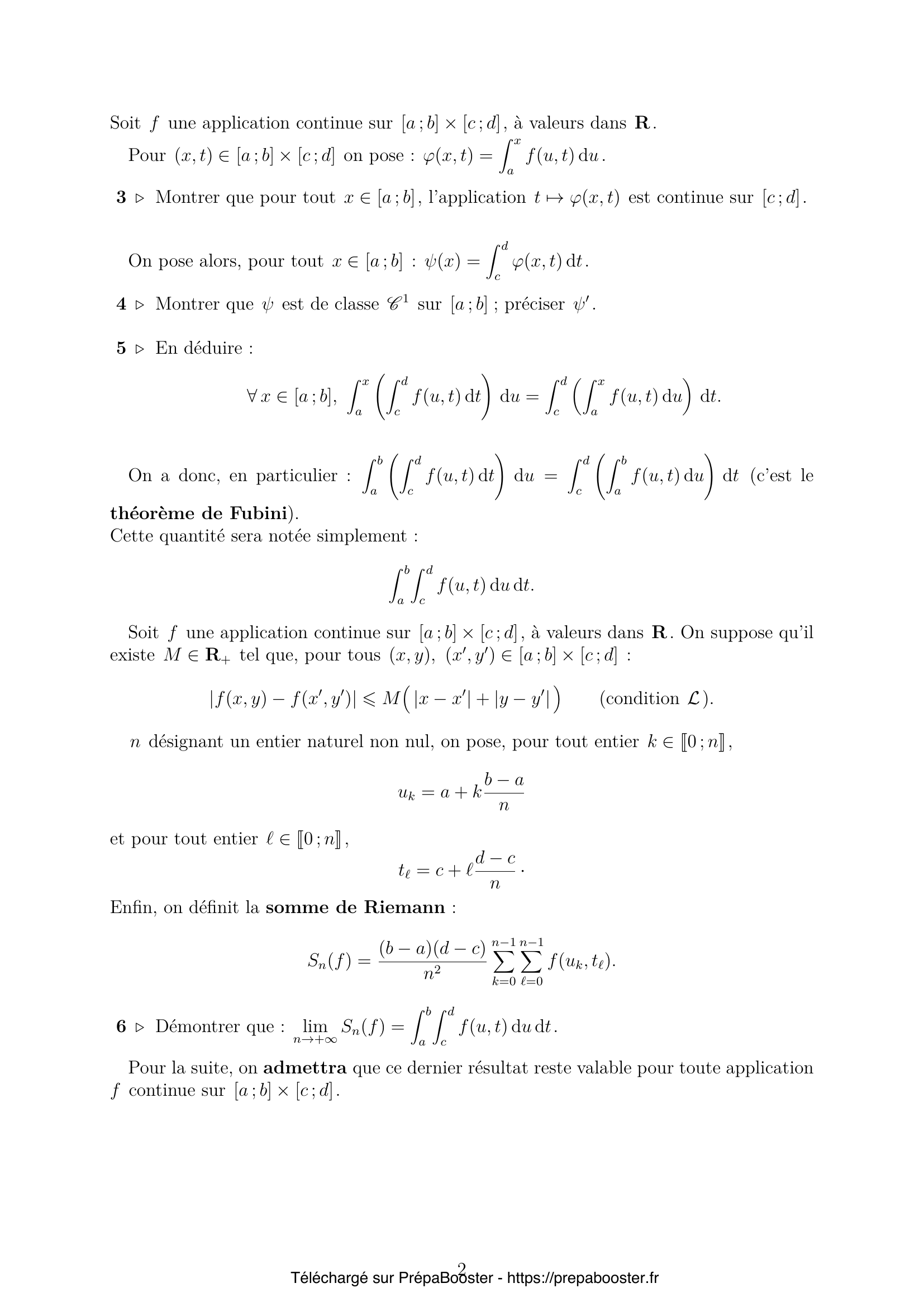 5. En déduire : $\forall x\in[a;b], \int_a^x \left(\int_c^d f(u,t)dt\right) du = \int_c^d\left(\int_a^x f(u,t) du\right) dt$. On a donc, en particulier : $\int_a^b \left(\int_c^d f(u,t)dt\right) du = \int_c^d \left( \int_a^b f(u,t) du\right) dt$ (c’est le théorème de Fubini). Cette quantité sera notée simplement : $\int_a^b\int_c^d f(u,t)du\,dt$.}