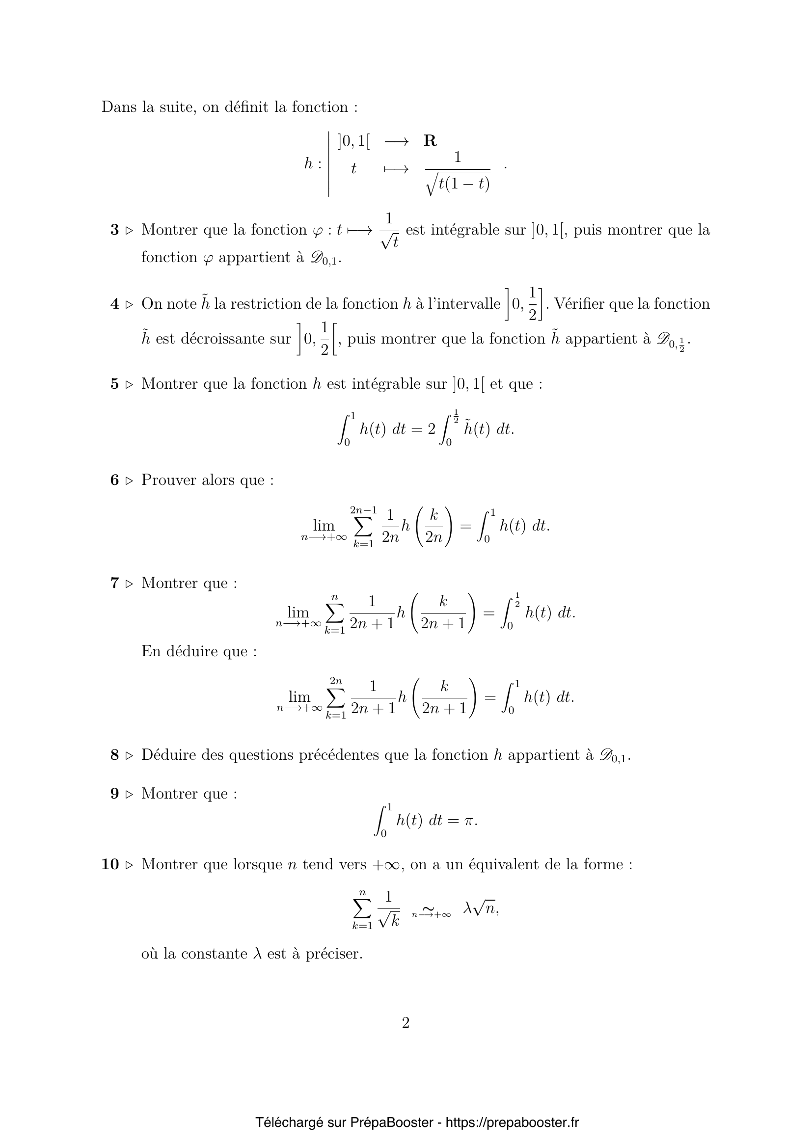 5. Montrer que la fonction $h$ est intégrable sur $]0, 1[$ et que : \[