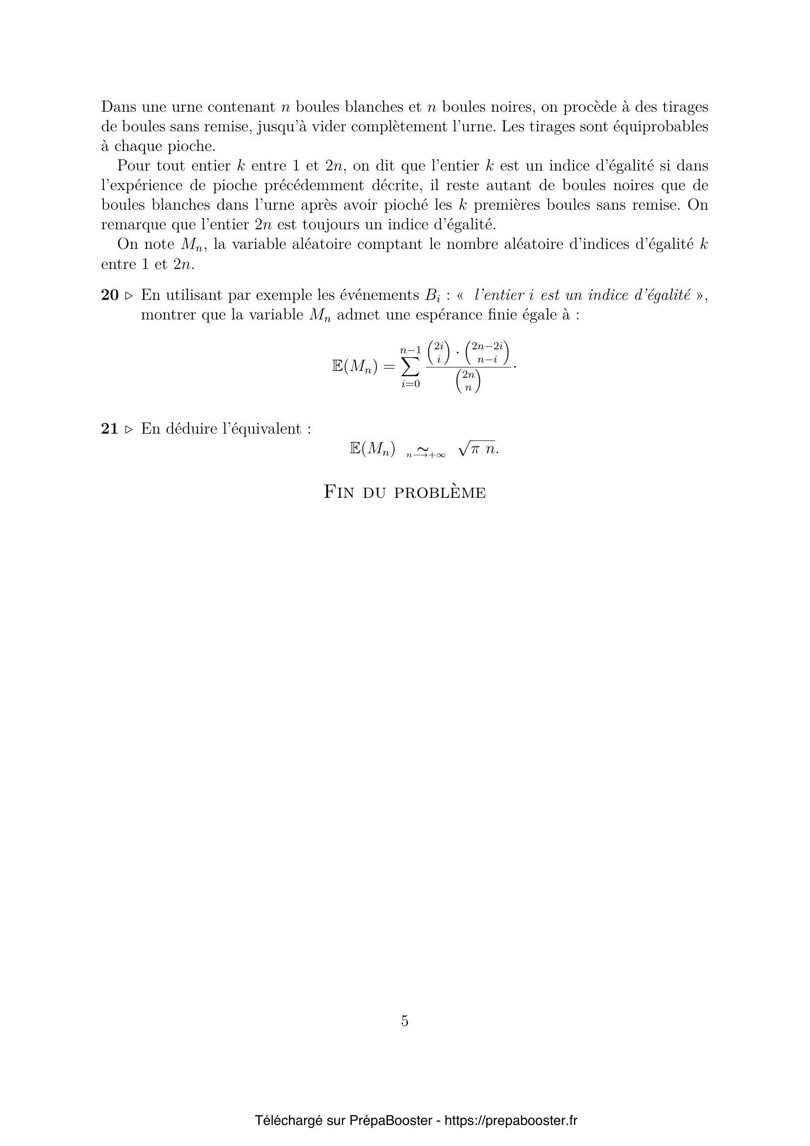 20. Dans une urne contenant $n$ boules blanches et $n$ boules noires, on procède à des tirages de boules sans remise, jusqu’à vider complètement l’urne. Les tirages sont équiprobables à chaque pioche.\\