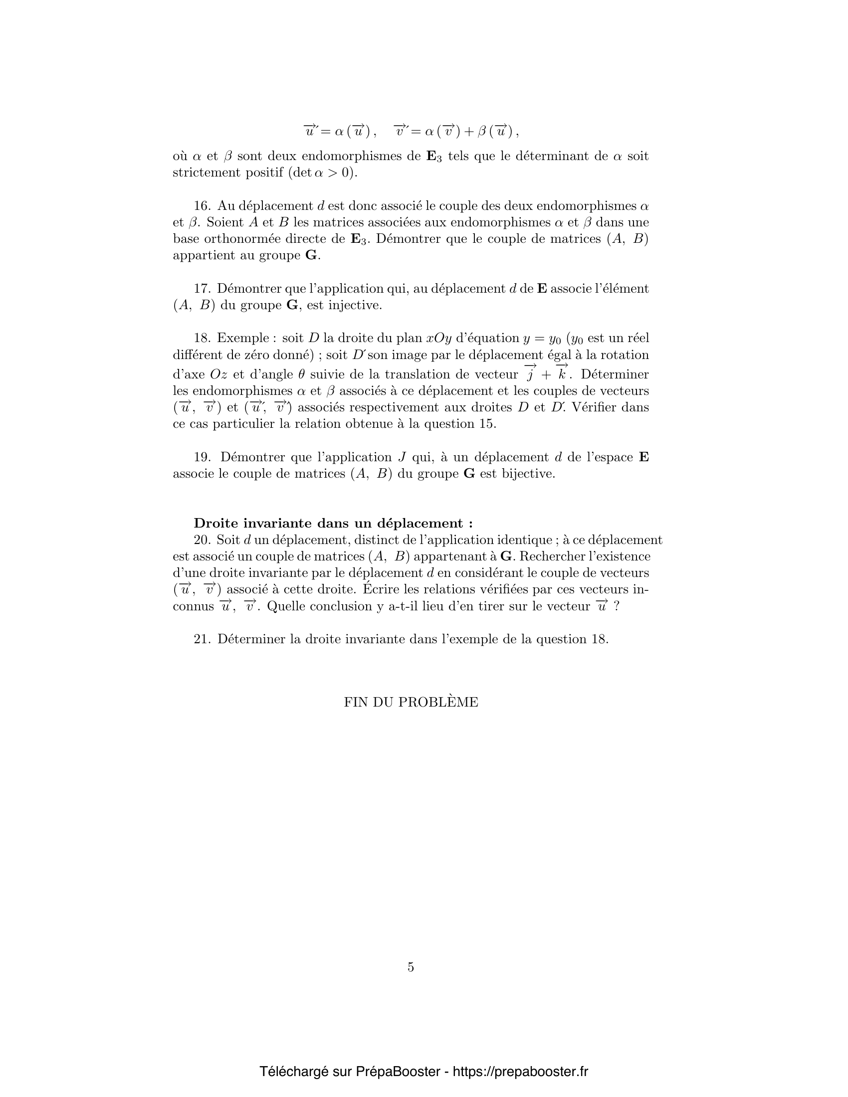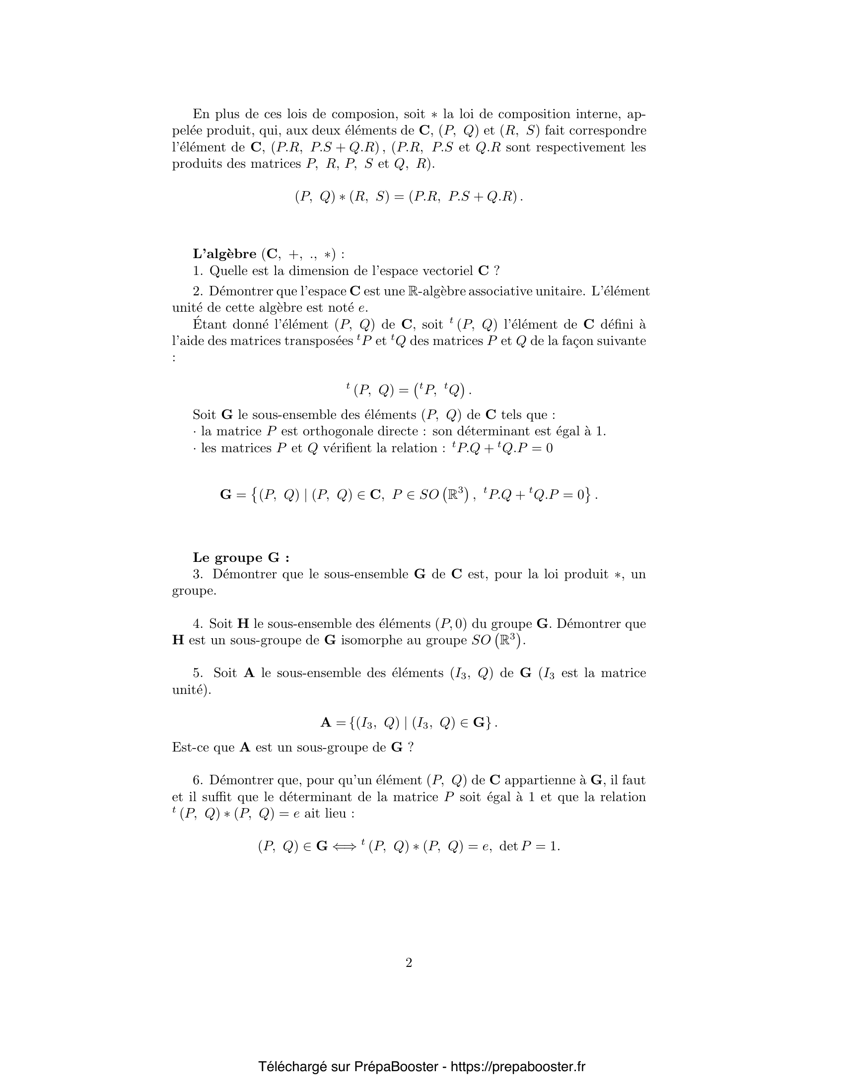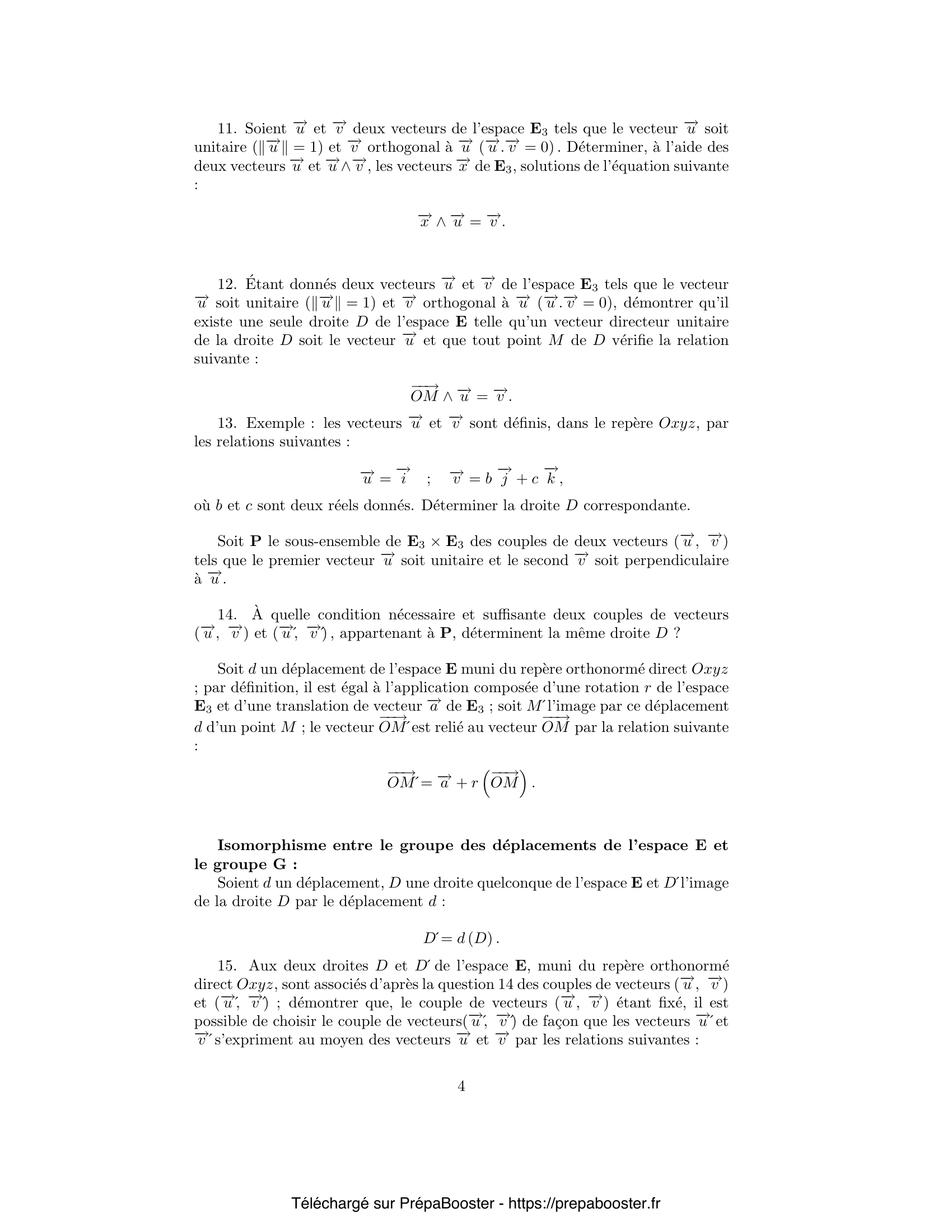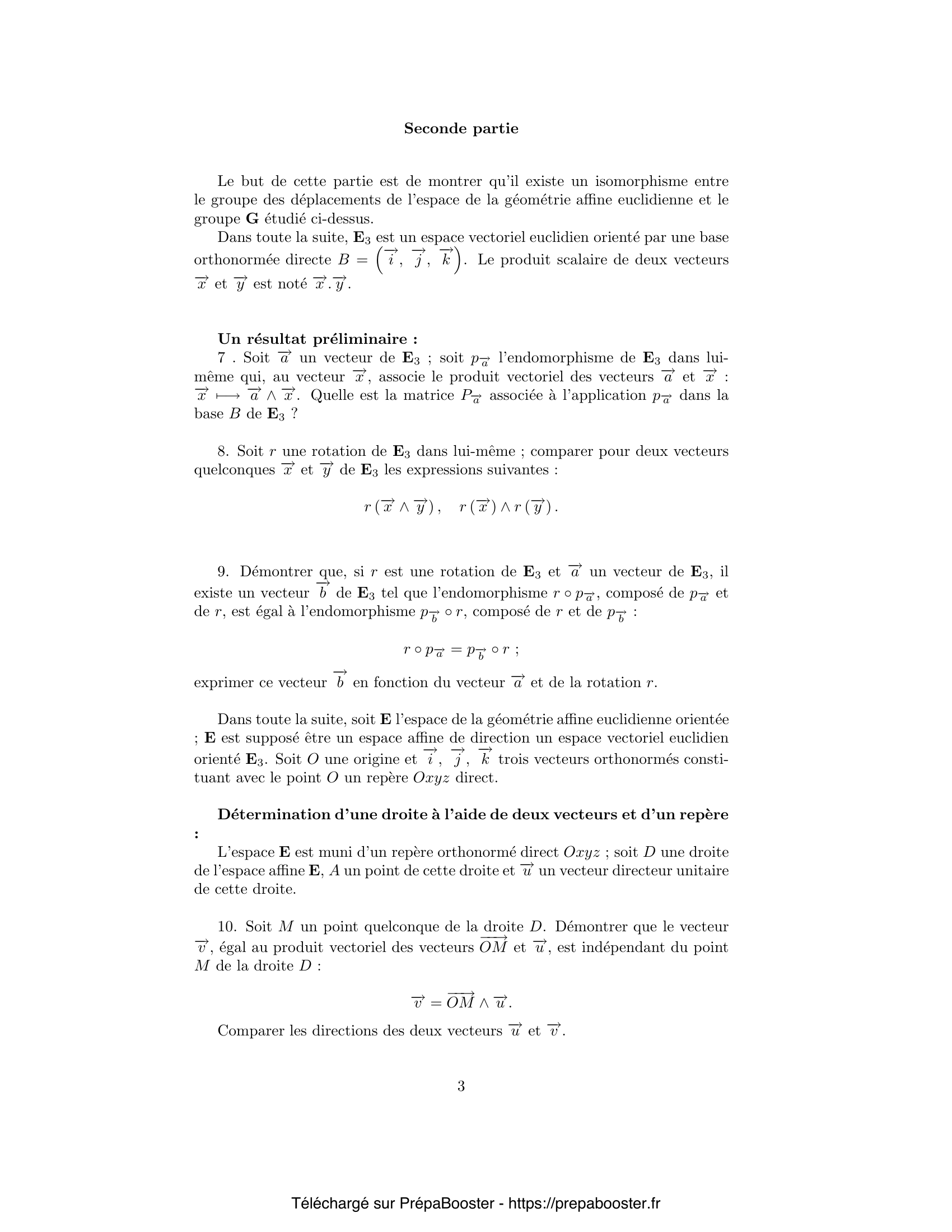 1. Quelle est la dimension de l’espace vectoriel $C$ ? 2. Démontrer que l’espace $C$ est une $\mathbb{R}$-algèbre associative unitaire. L’élément unité de cette algèbre est noté $e$. 3. Démontrer que le sous-ensemble $G$ de $C$ est, pour la loi produit $*$, un groupe. 4. Soit $H$ le sous-ensemble des éléments $(P, 0)$ du groupe $G$. Démontrer que $H$ est un sous-groupe de $G$ isomorphe au groupe $SO(\mathbb{R}^3)$. 5. Soit $A$ le sous-ensemble des éléments $(I_3, Q)$ de $G$ ($I_3$ est la matrice unité). \\ $A = \{(I_3, Q) \mid (I_3, Q) \in G \}$. \\ Est-ce que $A$ est un sous-groupe de $G$ ?} 6. Démontrer que, pour qu’un élément $(P, Q)$ de $C$ appartienne à $G$, il faut et il suffit que le déterminant de la matrice $P$ soit égal à $1$ et que la relation $t(P, Q) * (P, Q) = e$ ait lieu :\\ $(P, Q) \in G \iff t(P, Q) * (P, Q) = e, \det P = 1$. 7. Soit $\vec{a}$ un vecteur de $E^3$ ; soit $p_{\vec{a}}$ l’endomorphisme de $E^3$ dans lui-même qui, au vecteur $\vec{x}$, associe le produit vectoriel des vecteurs $\vec{a}$ et $\vec{x}$ : $\vec{x} \mapsto \vec{a} \wedge \vec{x}$. Quelle est la matrice $P_{\vec{a}}$ associée à l’application $p_{\vec{a}}$ dans la base $\mathcal{B}$ de $E^3$ ? 8. Soit $r$ une rotation de $E^3$ dans lui-même ; comparer pour deux vecteurs quelconques $\vec{x}$ et $\vec{y}$ de $E^3$ les expressions suivantes : \\ $r(\vec{x} \wedge \vec{y}),\ r(\vec{x}) \wedge r(\vec{y})$. 9. Démontrer que, si $r$ est une rotation de $E^3$ et $\vec{a}$ un vecteur de $E^3$, il existe un vecteur $\vec{b}$ de $E^3$ tel que l’endomorphisme $r \circ p_{\vec{a}}$, composé de $p_{\vec{a}}$ et de $r$, est égal à l’endomorphisme $p_{\vec{b}} \circ r$, composé de $r$ et de $p_{\vec{b}}$ : \\ $r \circ p_{\vec{a}} = p_{\vec{b}} \circ r$ ; \\ exprimer ce vecteur $\vec{b}$ en fonction du vecteur $\vec{a}$ et de la rotation $r$. 10. Soit $M$ un point quelconque de la droite $D$. Démontrer que le vecteur $\vec{v}$, égal au produit vectoriel des vecteurs $\overrightarrow{OM}$ et $\vec{u}$, est indépendant du point $M$ de la droite $D$ :\\ $\vec{v} = \overrightarrow{OM} \wedge \vec{u}$.\\ Comparer les directions des deux vecteurs $\vec{u}$ et $\vec{v}$.} 11. Soient $\vec{u}$ et $\vec{v}$ deux vecteurs de l’espace $E^3$ tels que le vecteur $\vec{u}$ soit unitaire $(\|\vec{u}\| = 1)$ et $\vec{v}$ orthogonal à $\vec{u}$ $(\vec{u} \cdot \vec{v} = 0)$. Déterminer, à l’aide des deux vecteurs $\vec{u}$ et $\vec{u} \wedge \vec{v}$, les vecteurs $\vec{x}$ de $E^3$, solutions de l’équation suivante :\\ $\vec{x} \wedge \vec{u} = \vec{v}$. 12. Étant donnés deux vecteurs $\vec{u}$ et $\vec{v}$ de l’espace $E^3$ tels que le vecteur $\vec{u}$ soit unitaire $(\|\vec{u}\| = 1)$ et $\vec{v}$ orthogonal à $\vec{u}$ $(\vec{u}\cdot \vec{v} = 0)$, démontrer qu’il existe une seule droite $D$ de l’espace $E$ telle qu’un vecteur directeur unitaire de la droite $D$ soit le vecteur $\vec{u}$ et que tout point $M$ de $D$ vérifie la relation suivante :\\ $\overrightarrow{OM} \wedge \vec{u} = \vec{v}$. 13. Exemple : les vecteurs $\vec{u}$ et $\vec{v}$ sont définis, dans le repère $Oxyz$, par les relations suivantes :\\ $\vec{u} = \vec{i} ; \vec{v} = b\vec{j} + c\vec{k}$,\\ où $b$ et $c$ sont deux réels donnés. Déterminer la droite $D$ correspondante. 14. À quelle condition nécessaire et suffisante deux couples de vecteurs $(\vec{u}, \vec{v})$ et $(\vec{u}’, \vec{v}’)$, appartenant à $P$, déterminent la même droite $D$ ? 15. Aux deux droites $D$ et $D’$ de l’espace $E$, muni du repère orthonormé direct $Oxyz$, sont associés d’après la question 14 des couples de vecteurs $(\vec{u}, \vec{v})$ et $(\vec{u}’, \vec{v}’)$ ; démontrer que, le couple de vecteurs $(\vec{u}, \vec{v})$ étant fixé, il est possible de choisir le couple de vecteurs $(\vec{u}’, \vec{v}’)$ de façon que les vecteurs $\vec{u}’$ et $\vec{v}’$ s’expriment au moyen des vecteurs $\vec{u}$ et $\vec{v}$ par les relations suivantes :\\ $\vec{u}’ = \alpha(\vec{u}),\ \vec{v}’ = \alpha(\vec{v}) + \beta(\vec{u})$,\\ où $\alpha$ et $\beta$ sont deux endomorphismes de $E^3$ tels que le déterminant de $\alpha$ soit strictement positif $(\det \alpha > 0)$.} 16. Au déplacement $d$ est donc associé le couple des deux endomorphismes $\alpha$ et $\beta$. Soient $A$ et $B$ les matrices associées aux endomorphismes $\alpha$ et $\beta$ dans une base orthonormée directe de $E^3$. Démontrer que le couple de matrices $(A, B)$ appartient au groupe $G$. 17. Démontrer que l’application qui, au déplacement $d$ de $E$ associe l’élément $(A, B)$ du groupe $G$, est injective. 18. Exemple : soit $D$ la droite du plan $xOy$ d’équation $y = y_0$ ($y_0$ est un réel différent de zéro donné) ; soit $D’$ son image par le déplacement égal à la rotation d’axe $Oz$ et d’angle $\theta$ suivie de la translation de vecteur $\vec{j} + \vec{k}$. Déterminer les endomorphismes $\alpha$ et $\beta$ associés à ce déplacement et les couples de vecteurs $(\vec{u}, \vec{v})$ et $(\vec{u}’, \vec{v}’)$ associés respectivement aux droites $D$ et $D’$. Vérifier dans ce cas particulier la relation obtenue à la question 15. 19. Démontrer que l’application $J$ qui, à un déplacement $d$ de l’espace $E$ associe le couple de matrices $(A, B)$ du groupe $G$ est bijective. 20. Soit $d$ un déplacement, distinct de l’application identique ; à ce déplacement est associé un couple de matrices $(A, B)$ appartenant à $G$. Rechercher l’existence d’une droite invariante par le déplacement $d$ en considérant le couple de vecteurs $(\vec{u}, \vec{v})$ associé à cette droite. Écrire les relations vérifiées par ces vecteurs inconnus $\vec{u}, \vec{v}$. Quelle conclusion y a-t-il lieu d’en tirer sur le vecteur $\vec{u}$ ?} 21. Déterminer la droite invariante dans l’exemple de la question 18.}FAQ