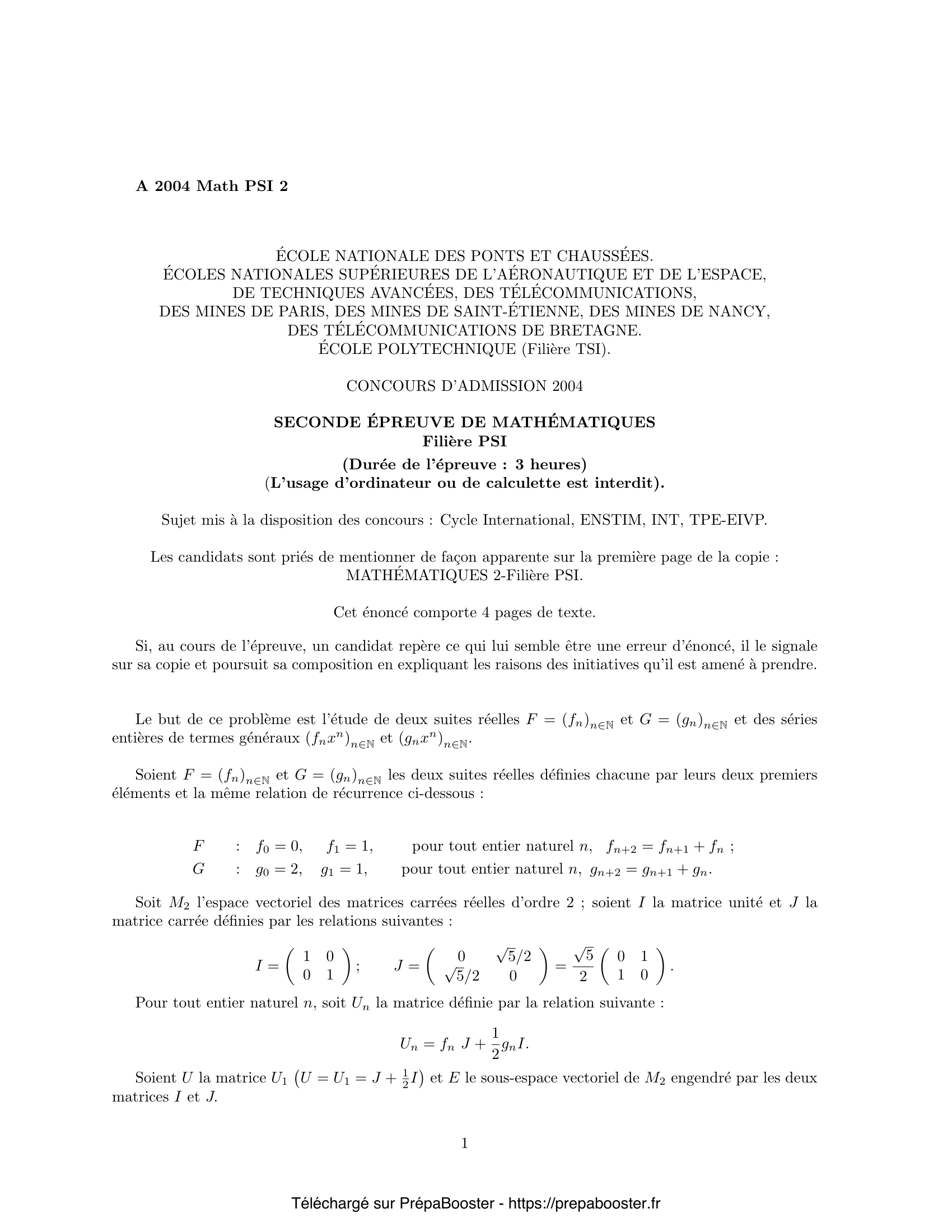 Le sujet de mathématiques PSI Mines-Ponts 2004 aborde principalement des notions d’algèbre linéaire, comme les suites de matrices, l’étude des espaces vectoriels de matrices, les polynômes caractéristiques, et la diagonalisation. Tu y retrouveras également de la récurrence, des relations de récurrence de type Fibonacci, la divisibilité polynomiale, et des techniques classiques comme le calcul de déterminant ou l’inversibilité. L’étude des suites récurrentes, de leurs liens avec les puissances de matrices, et les applications à des séries entières sont aussi mises en avant.