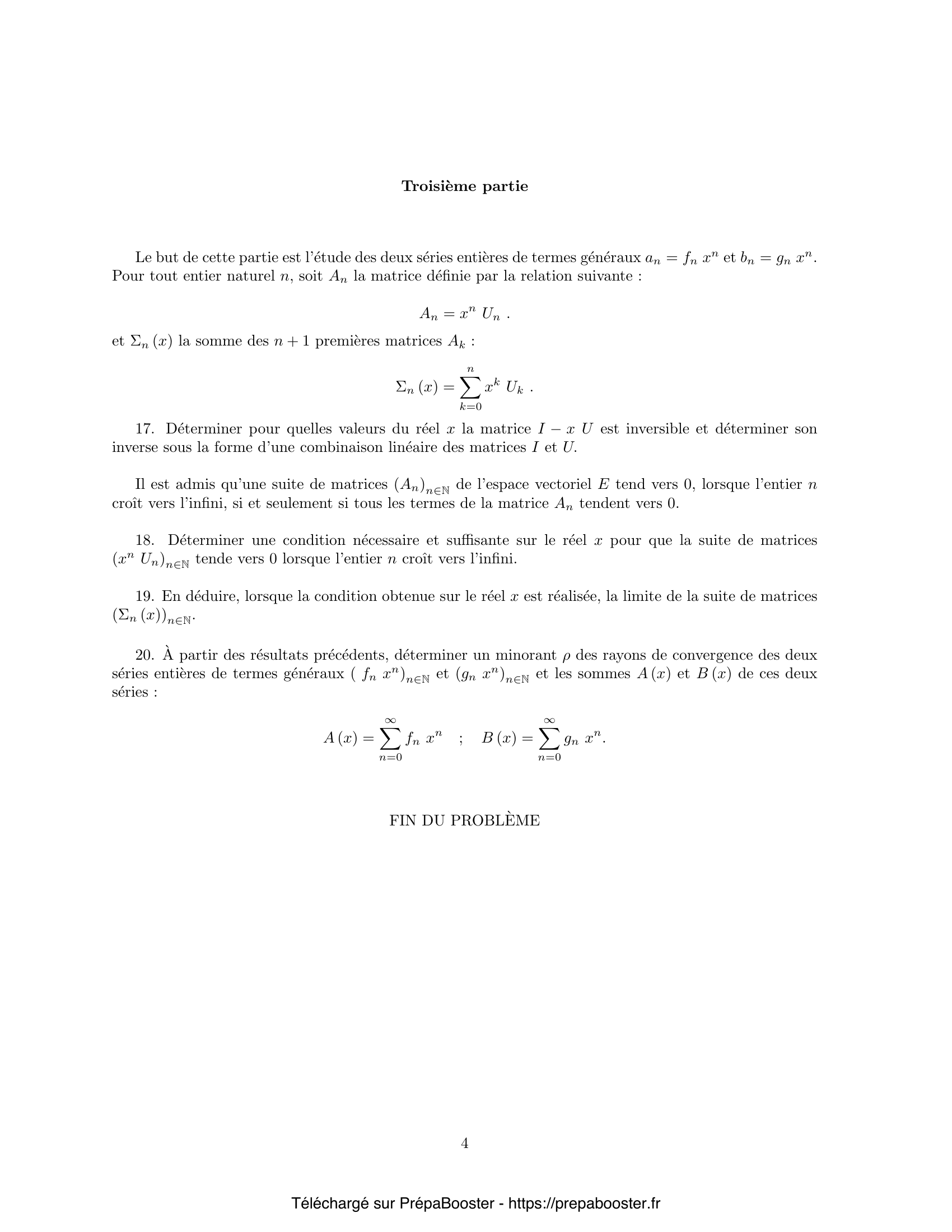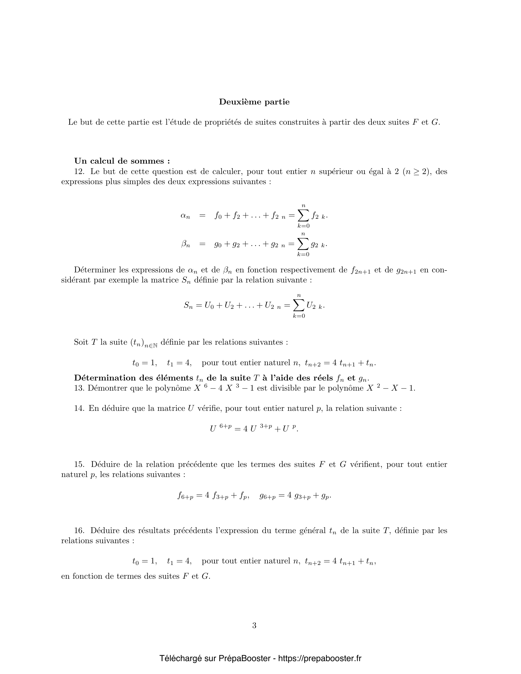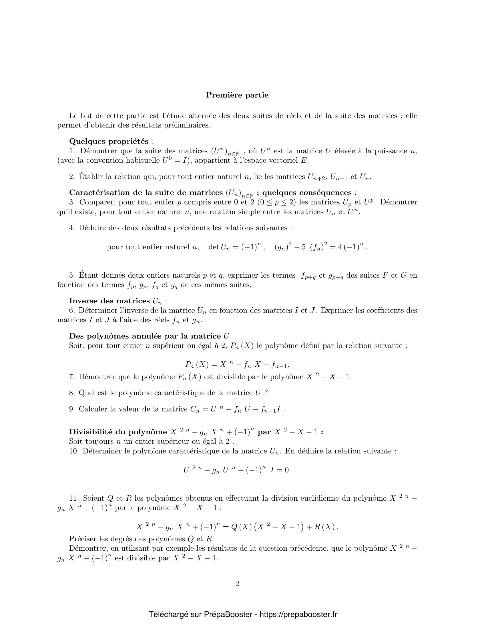 1. D\’emontrer que la suite des matrices $(U_n)_{n\in\mathbb N}$, o\`u $U_n$ est la matrice $U$ \’elev\’ee \`a la puissance $n$, (avec la convention habituelle $U_0 = I$), appartient \`a l’espace vectoriel $E$. 2. Etablir la relation qui, pour tout entier naturel $n$, lie les matrices $U_{n+2}$, $U_{n+1}$ et $U_n$. 3. Comparer, pour tout entier $p$ compris entre $0$ et $2$ ($0 \leq p \leq 2$) les matrices $U_p$ et $U^p$. D\’emontrer qu’il existe, pour tout entier naturel $n$, une relation simple entre les matrices $U_n$ et $U^n$. 4. D\’eduire des deux r\’esultats pr\’ec\’edents les relations suivantes : pour tout entier naturel $n$, $\det U_n = (-1)^n$, $(g_n)^2 – 5 (f_n)^2 = 4 (-1)^n$. 5. \’Etant donn\’es deux entiers naturels $p$ et $q$, exprimer les termes $f_{p+q}$ et $g_{p+q}$ des suites $F$ et $G$ en fonction des termes $f_p, g_p, f_q$ et $g_q$ de ces m\^emes suites.} 6. D\’eterminer l’inverse de la matrice $U_n$ en fonction des matrices $I$ et $J$. Exprimer les coefficients des matrices $I$ et $J$ \`a l’aide des r\’eels $f_n$ et $g_n$. 7. D\’emontrer que le polyn\^ome $P_n(X)$ est divisible par le polyn\^ome $X^2 – X – 1$, o\`u pour tout entier $n \geq 2$, $P_n(X) = X^n – f_n X – f_{n-1}$. 8. Quel est le polyn\^ome caract\’eristique de la matrice $U$ ? 9. Calculer la valeur de la matrice $C_n = U^n – f_n U – f_{n-1} I$. 10. D\’eterminer le polyn\^ome caract\’eristique de la matrice $U_n$. En d\’eduire la relation suivante : $U^{2n} – g_n U^n + (-1)^n I = 0$.} 11. Soient $Q$ et $R$ les polyn\^omes obtenus en effectuant la division euclidienne du polyn\^ome $X^{2n} – g_n X^n + (-1)^n$ par le polyn\^ome $X^2 – X – 1$ : \[X^{2n} – g_n X^n + (-1)^n = Q(X) (X^2 – X – 1) + R(X).\] Pr\’eciser les degr\’es des polyn\^omes $Q$ et $R$. D\’emontrer, en utilisant par exemple les r\’esultats de la question pr\’ec\’edente, que le polyn\^ome $X^{2n} – g_n X^n + (-1)^n$ est divisible par $X^2 – X – 1$. 12. Le but de cette question est de calculer, pour tout entier $n \geq 2$, des expressions plus simples des deux expressions suivantes : \\ $\alpha_n = f_0 + f_2 + \cdots + f_{2n} = \sum_{k=0}^n f_{2k}$ \\ $\beta_n = g_0 + g_2 + \cdots + g_{2n} = \sum_{k=0}^n g_{2k}$ \\ D\’eterminer les expressions de $\alpha_n$ et de $\beta_n$ en fonction respectivement de $f_{2n+1}$ et de $g_{2n+1}$ en consid\’erant par exemple la matrice $S_n$ d\’efinie par la relation suivante : $S_n = U_0 + U_2 + \cdots + U_{2n} = \sum_{k=0}^n U_{2k}$ 13. Soit $T$ la suite $(t_n)_{n \in \mathbb N}$ d\’efinie par les relations suivantes :\\ $t_0 = 1, \ t_1 = 4$, pour tout entier naturel $n$, $t_{n+2} = 4 t_{n+1} + t_n$.\\ D\’etermination des \’el\’ements $t_n$ de la suite $T$ \`a l’aide des r\’eels $f_n$ et $g_n$. 14. D\’emontrer que le polyn\^ome $X^6 – 4 X^3 – 1$ est divisible par le polyn\^ome $X^2 – X – 1$. 15. En d\’eduire que la matrice $U$ v\’erifie, pour tout entier naturel $p$, la relation suivante : $U^{6+p} = 4 U^{3+p} + U^p$.} 16. D\’eduire de la relation pr\’ec\’edente que les termes des suites $F$ et $G$ v\’erifient, pour tout entier naturel $p$, les relations suivantes : $f_{6+p} = 4 f_{3+p} + f_p$, $g_{6+p} = 4 g_{3+p} + g_p$. 17. D\’eduire des r\’esultats pr\’ec\’edents l’expression du terme g\’en\’eral $t_n$ de la suite $T$, d\’efinie par les relations suivantes : $t_0 = 1, \ t_1 = 4$, pour tout entier naturel $n$, $t_{n+2} = 4 t_{n+1} + t_n$, en fonction de termes des suites $F$ et $G$. 18. Pour tout entier naturel $n$, soit $A_n$ la matrice d\’efinie par la relation suivante : $A_n = x^n U_n$. Et $\Sigma_n(x)$ la somme des $n+1$ premi\`eres matrices $A_k$ : $\Sigma_n(x) = \sum_{k=0}^n x^k U_k$.\\ D\’eterminer pour quelles valeurs du r\’eel $x$ la matrice $I – x U$ est inversible et d\’eterminer son inverse sous la forme d’une combinaison lin\’eaire des matrices $I$ et $U$. 19. Il est admis qu’une suite de matrices $(A_n)_{n\in \mathbb N}$ de l’espace vectoriel $E$ tend vers $0$, lorsque l’entier $n$ cro\^it vers l’infini, si et seulement si tous les termes de la matrice $A_n$ tendent vers $0$.\\ D\’eterminer une condition n\’ecessaire et suffisante sur le r\’eel $x$ pour que la suite de matrices $(x^n U_n)_{n\in \mathbb N}$ tende vers $0$ lorsque l’entier $n$ cro\^it vers l’infini. 20. En d\’eduire, lorsque la condition obtenue sur le r\’eel $x$ est r\’ealis\’ee, la limite de la suite de matrices $(\Sigma_n(x))_{n\in \mathbb N}$.} 21. A partir des r\’esultats pr\’ec\’edents, d\’eterminer un minorant $\rho$ des rayons de convergence des deux s\’eries enti\`eres de termes g\’en\’eraux $(f_n x^n)_{n\in \mathbb N}$ et $(g_n x^n)_{n\in \mathbb N}$ et les sommes $A(x)$ et $B(x)$ de ces deux s\’eries :\\ $A(x) = \sum_{n=0}^{\infty} f_n x^n$ ; $B(x) = \sum_{n=0}^{\infty} g_n x^n$.}FAQ
